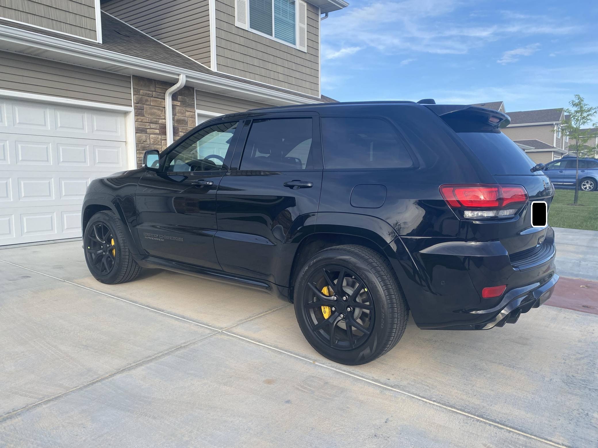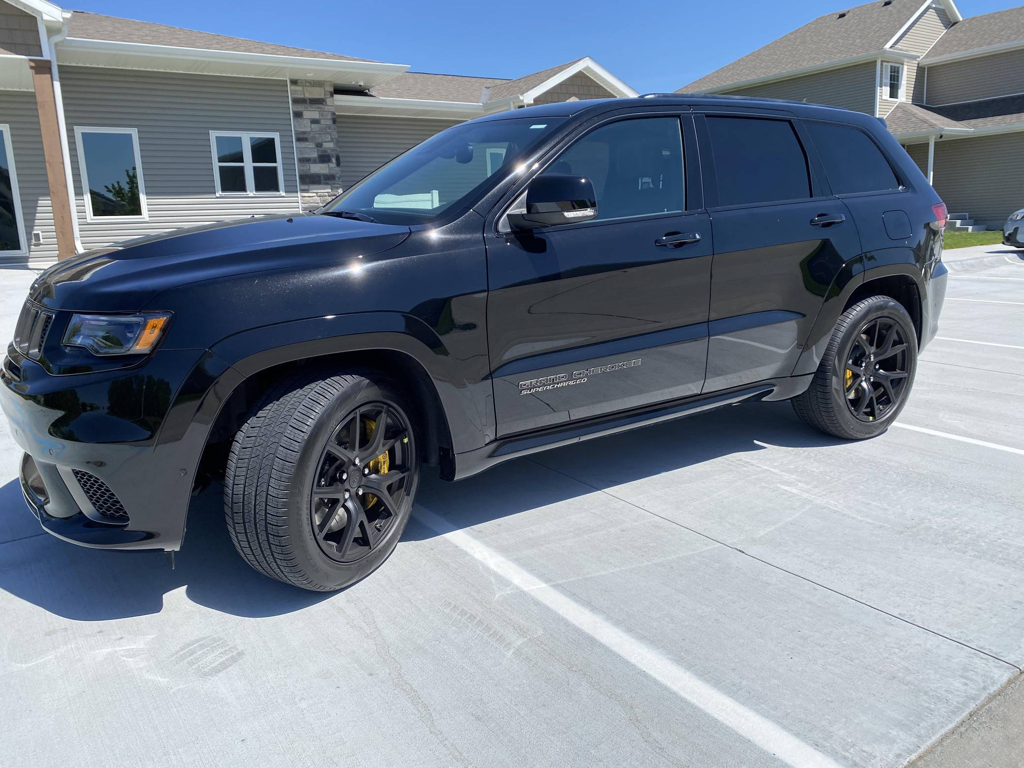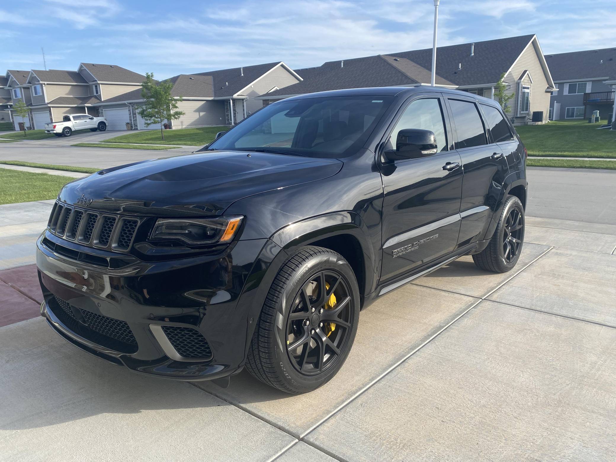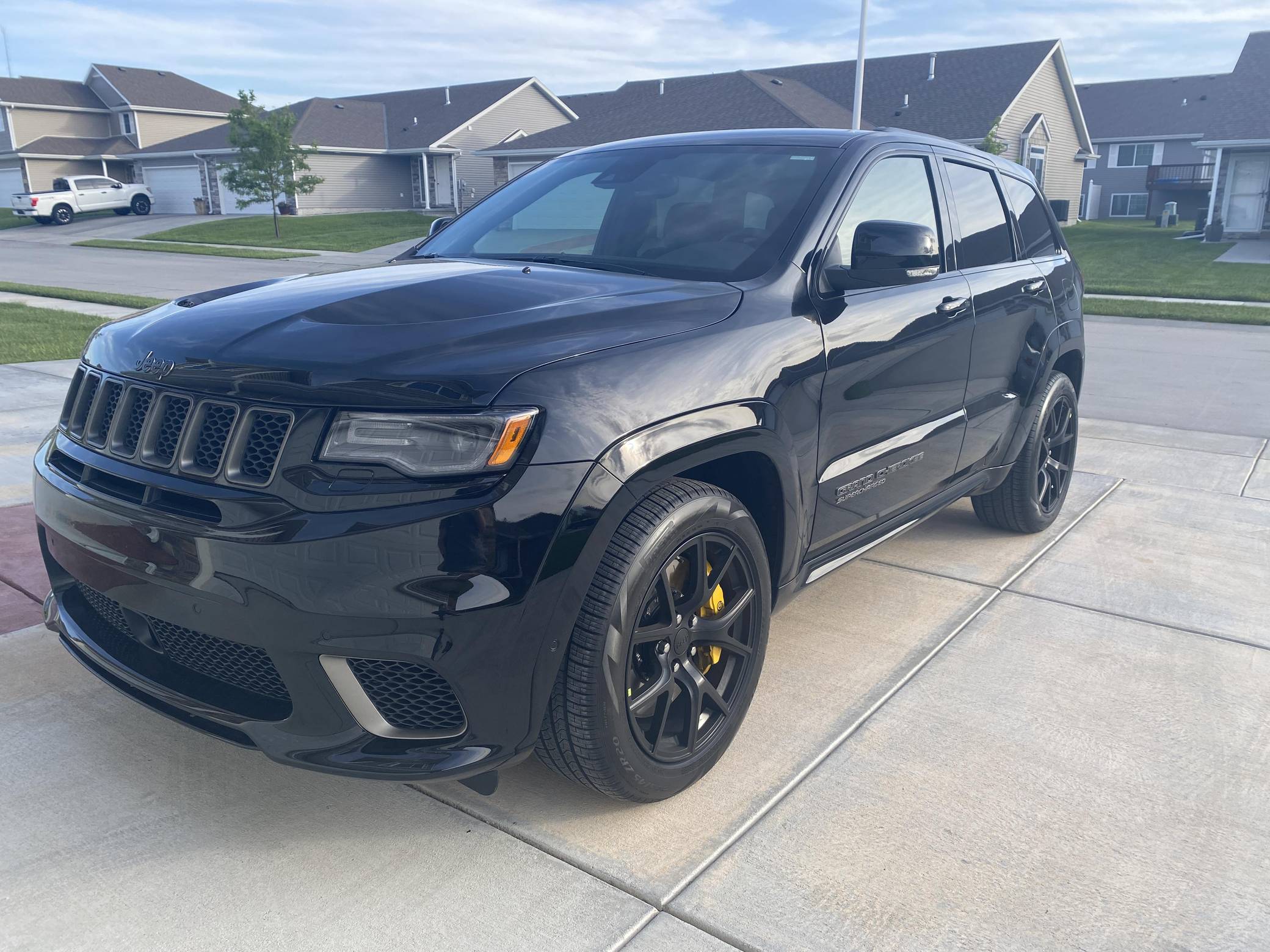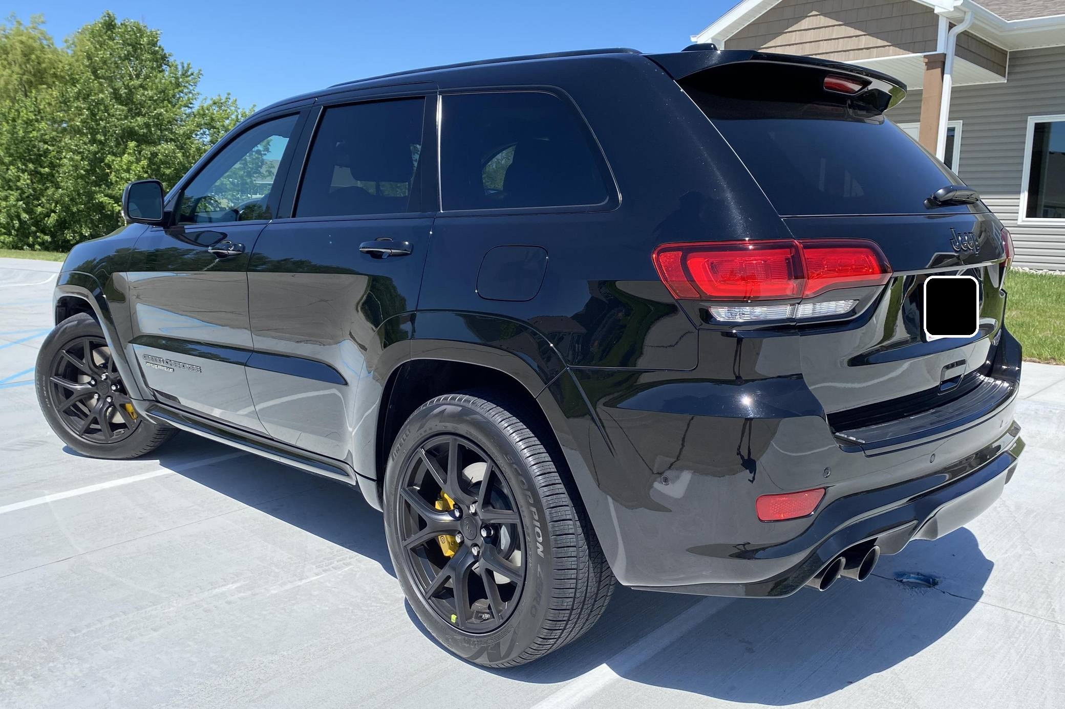 2021 Jeep Grand Cherokee Trackhawk, finished in Diamond Black Crystal Pearl-Coat with a black interior. The odometer currently displays 906 miles. The seller reports no modifications. Jeep became synonymous with high-performance SUVs when it released the original Grand Cherokee SRT8 over a decade ago. Based on the WK2-generation Grand Cherokee, the Hellcat-powered Trackhawk packs a 707-horsepower punch with looks, handling, and an exhaust note to match. Power comes from a supercharged 6. 2-liter V8, rated at 707 horsepower and 645 lb-ft of torque. Output is sent to all four wheels via an 8-speed automatic transmission.