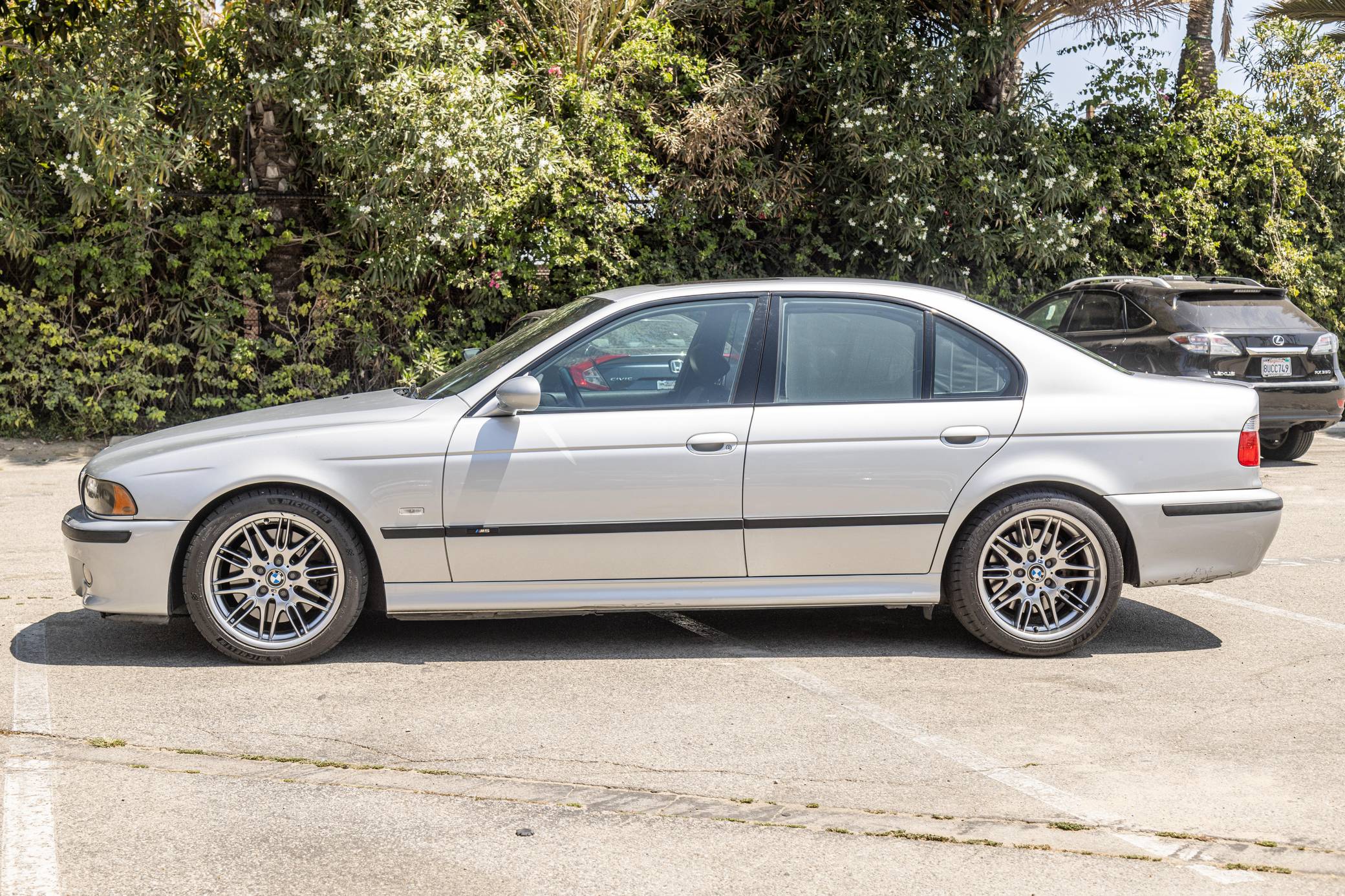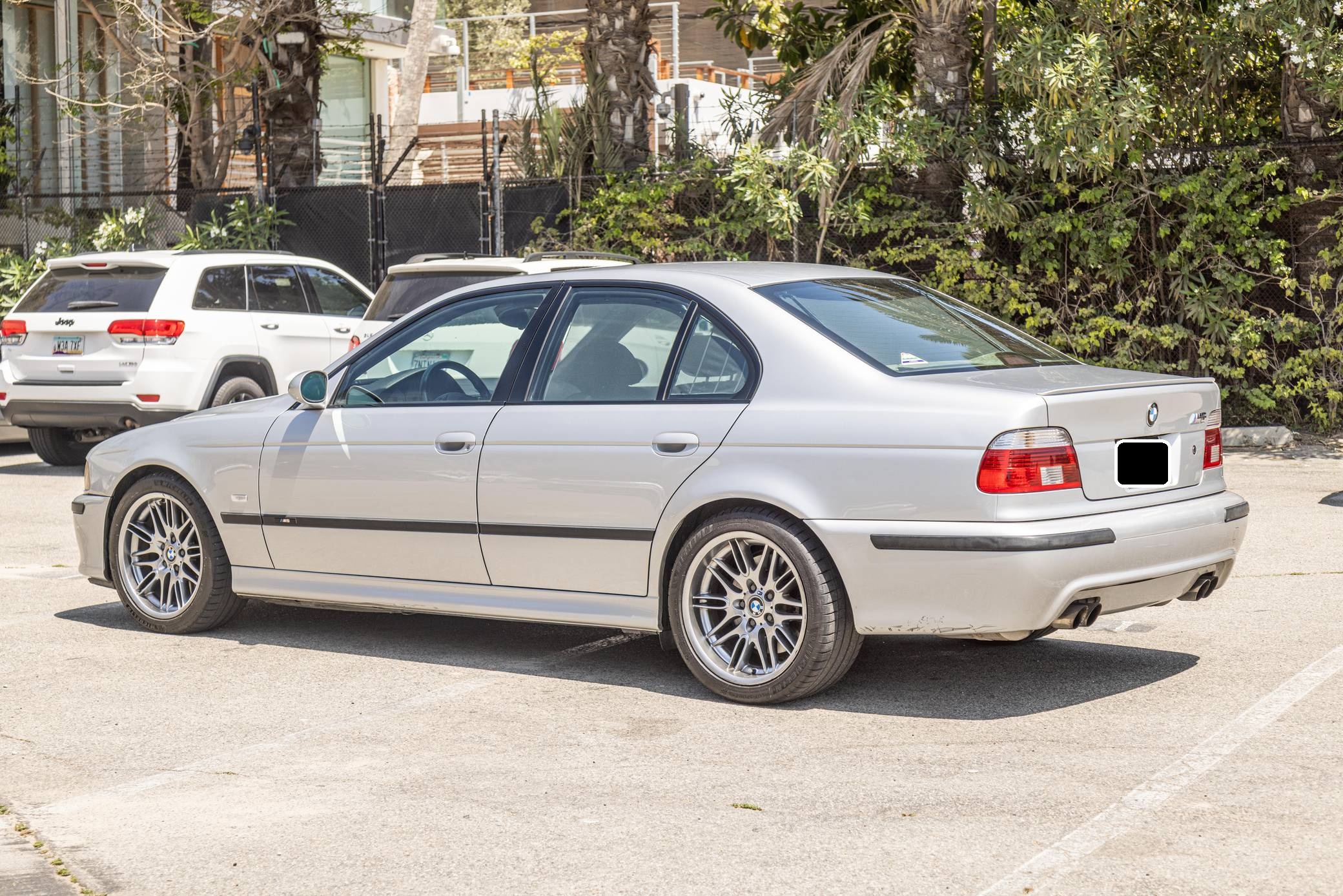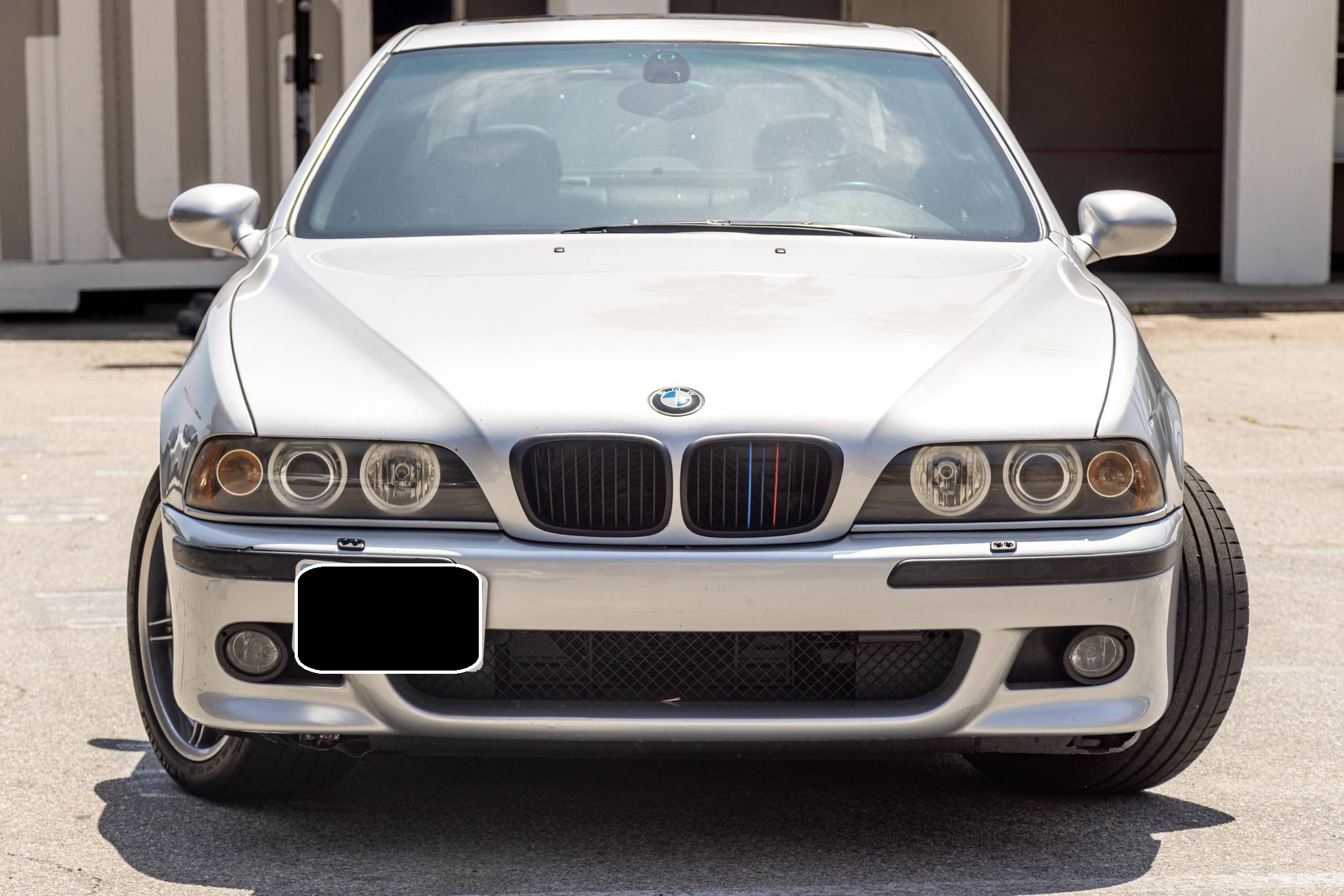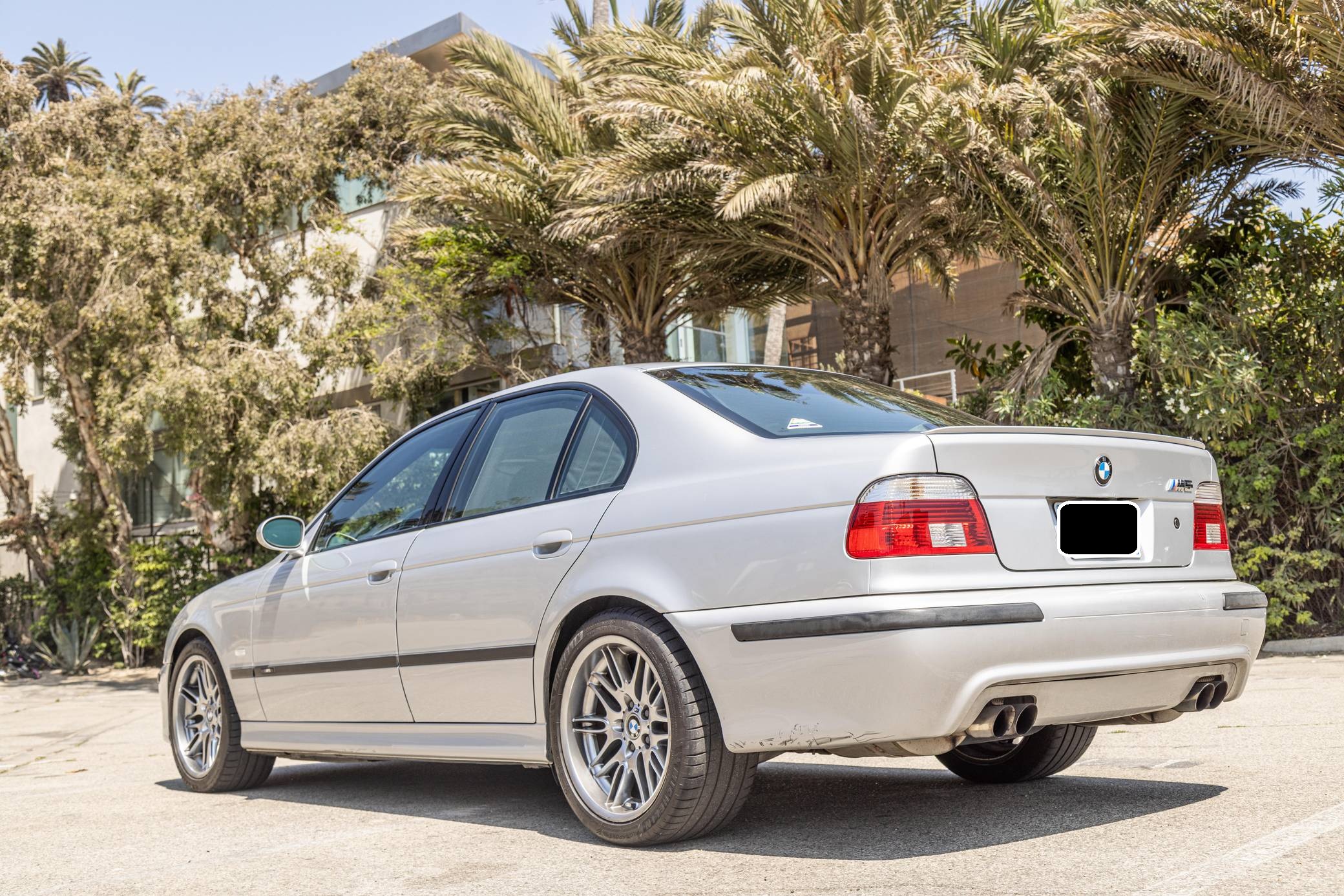 2002 BMW M5, finished in Titanium Silver Metallic with a black interior. According to the build sheet provided in the gallery, factory equipment includes 18-inch Style 65 wheels, xenon headlights, fog lights, a power-operated sunroof, leather upholstery, heated and power-adjustable front seats, and an Alcantara headliner. Modifications reported by the seller include a Corsa cat-back exhaust, Shark Injector performance software, a Dynavin head unit, Rockford Fosgate subwoofers, and more as detailed below. Heralded by marque enthusiasts as the best of its breed, the E39-generation M5 arrived in the U. S. for the 2000 model year. It would become the first of several M-cars with a V8, though among the many things that have given the M5 such lasting appeal is the exclusive 6-speed manual Getrag "420G" gearbox. BMW gave the M5 a facelift in 2001. It added the now-famous "Halo" headlights, Celis rear lights, redesigned fog lights, a new-look steering wheel, gray instrument gauges, and a 16:9 navigation display, among other features. Revised VANOS accumulators and piston rings were fitted starting in early 2000. This M5 benefits from all of the aforementioned updates. Power comes from an "S62" 4. 9-liter V8, rated at 394 horsepower and 369 lb-ft of torque. Due to the modifications performed to this M5, it may produce more power, but a dyno sheet was not provided to confirm. Output is sent to the rear wheels via a 6-speed manual transmission.