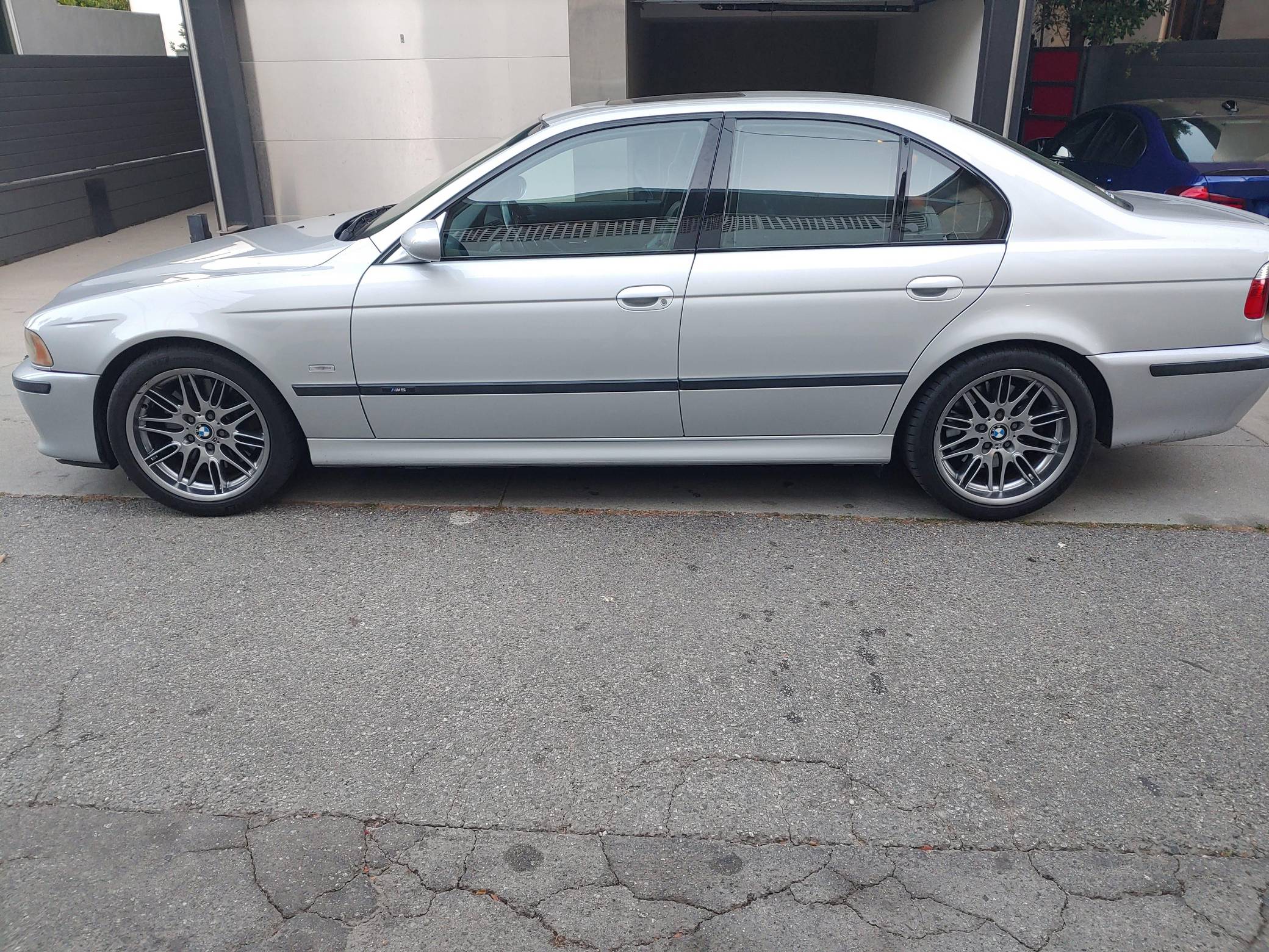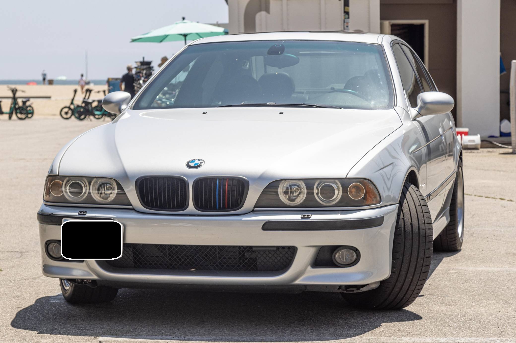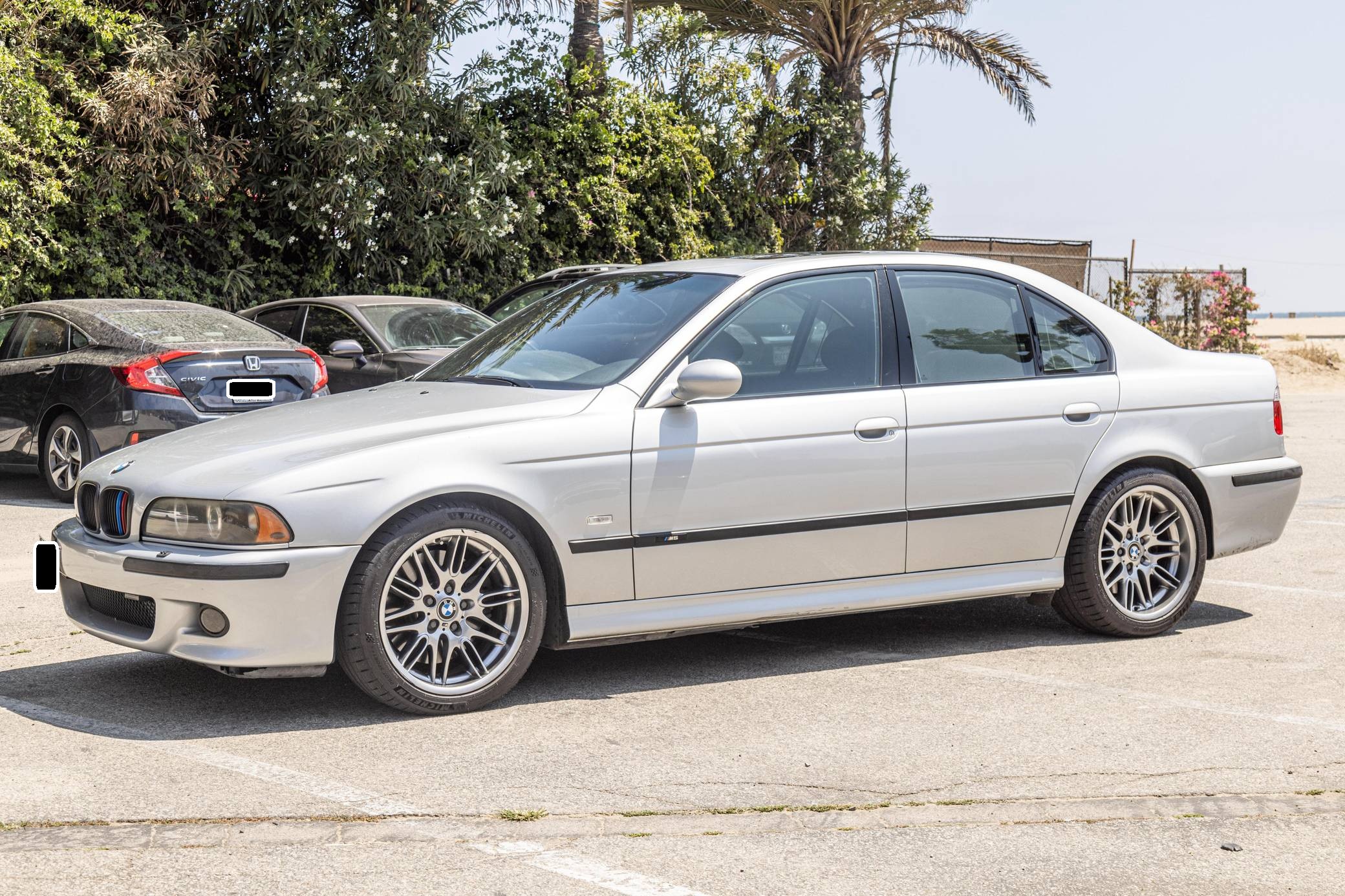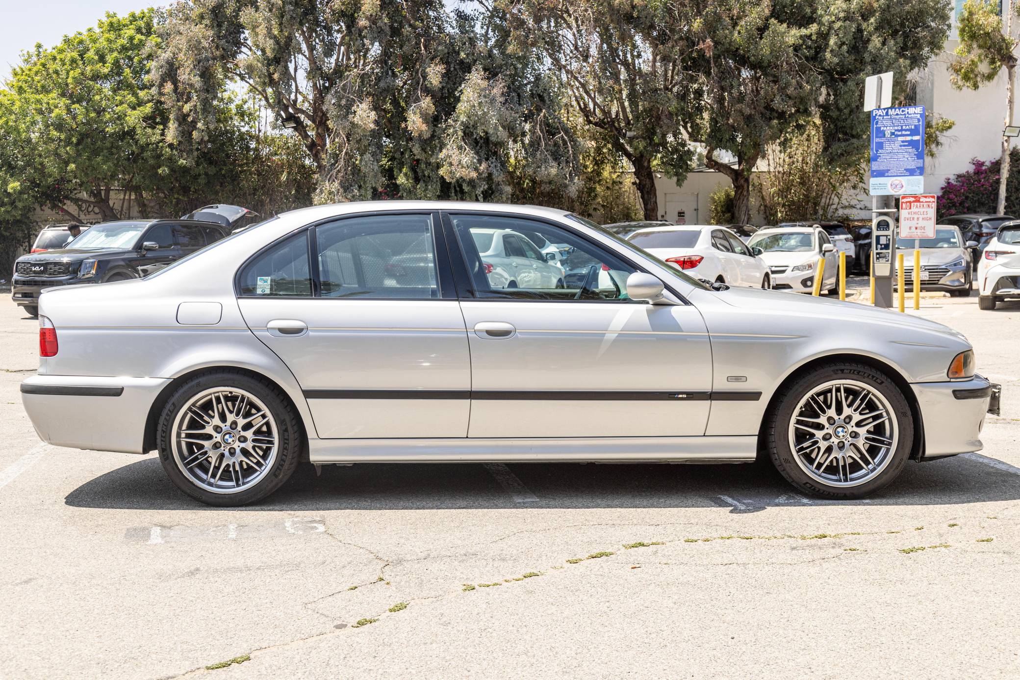 2002 BMW M5, finished in Titanium Silver Metallic with a black interior. According to the build sheet provided in the gallery, factory equipment includes 18-inch Style 65 wheels, xenon headlights, fog lights, a power-operated sunroof, leather upholstery, heated and power-adjustable front seats, and an Alcantara headliner. Modifications reported by the seller include a Corsa cat-back exhaust, Shark Injector performance software, a Dynavin head unit, Rockford Fosgate subwoofers, and more as detailed below. Heralded by marque enthusiasts as the best of its breed, the E39-generation M5 arrived in the U. S. for the 2000 model year. It would become the first of several M-cars with a V8, though among the many things that have given the M5 such lasting appeal is the exclusive 6-speed manual Getrag "420G" gearbox. BMW gave the M5 a facelift in 2001. It added the now-famous "Halo" headlights, Celis rear lights, redesigned fog lights, a new-look steering wheel, gray instrument gauges, and a 16:9 navigation display, among other features. Revised VANOS accumulators and piston rings were fitted starting in early 2000. This M5 benefits from all of the aforementioned updates. Power comes from an "S62" 4. 9-liter V8, rated at 394 horsepower and 369 lb-ft of torque. Due to the modifications performed to this M5, it may produce more power, but a dyno sheet was not provided to confirm. Output is sent to the rear wheels via a 6-speed manual transmission.