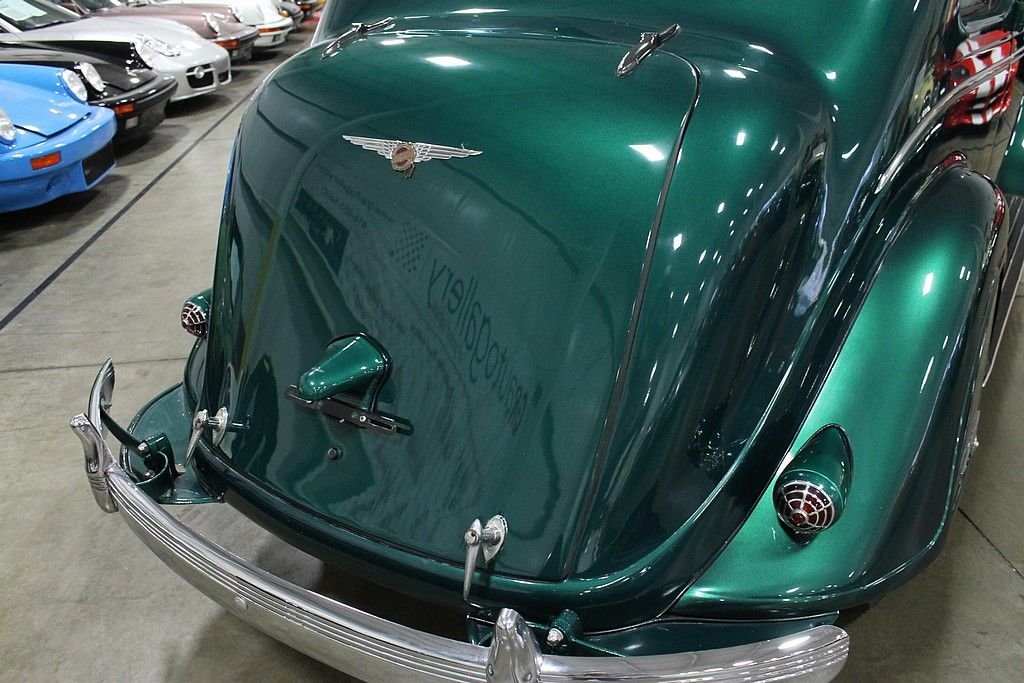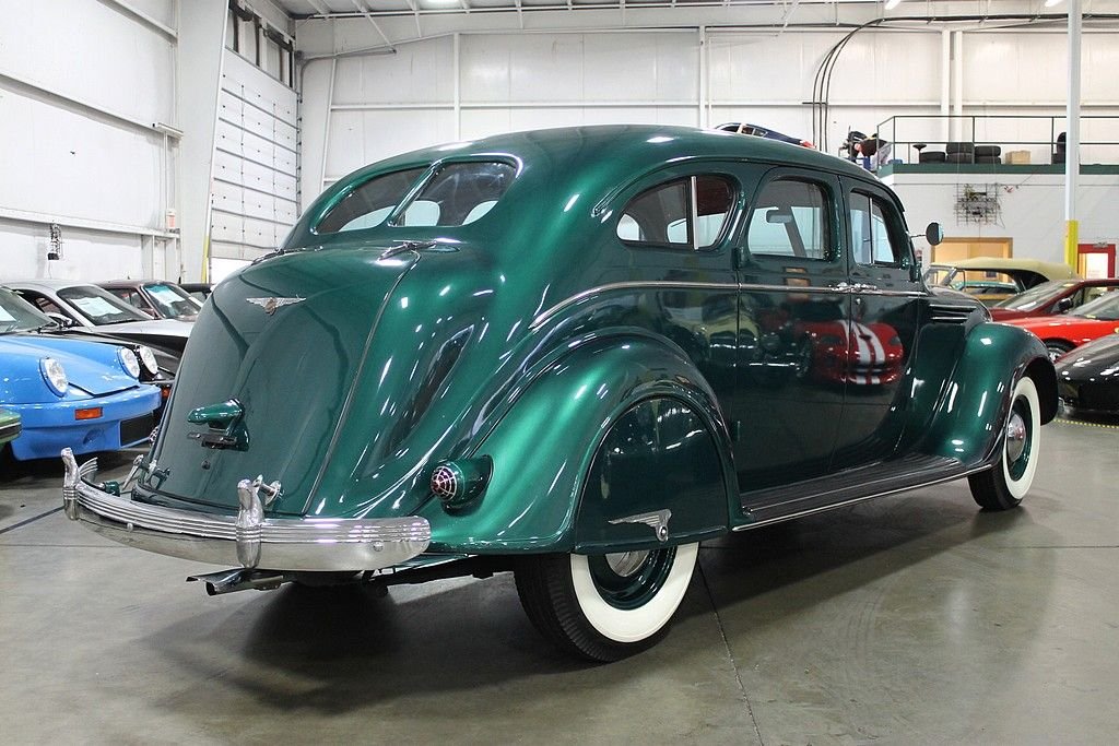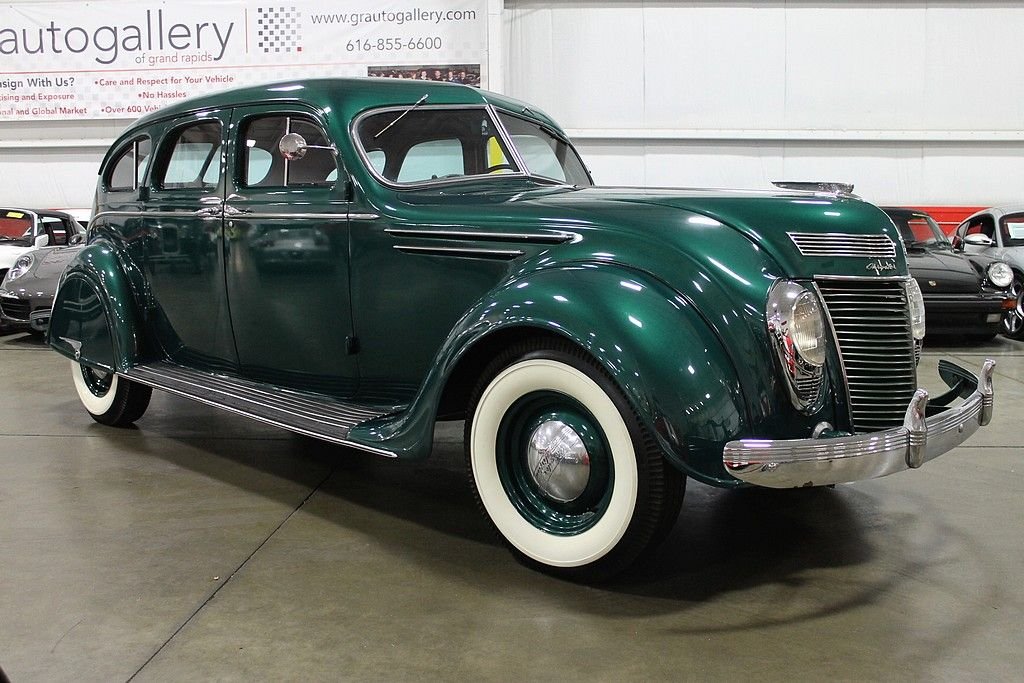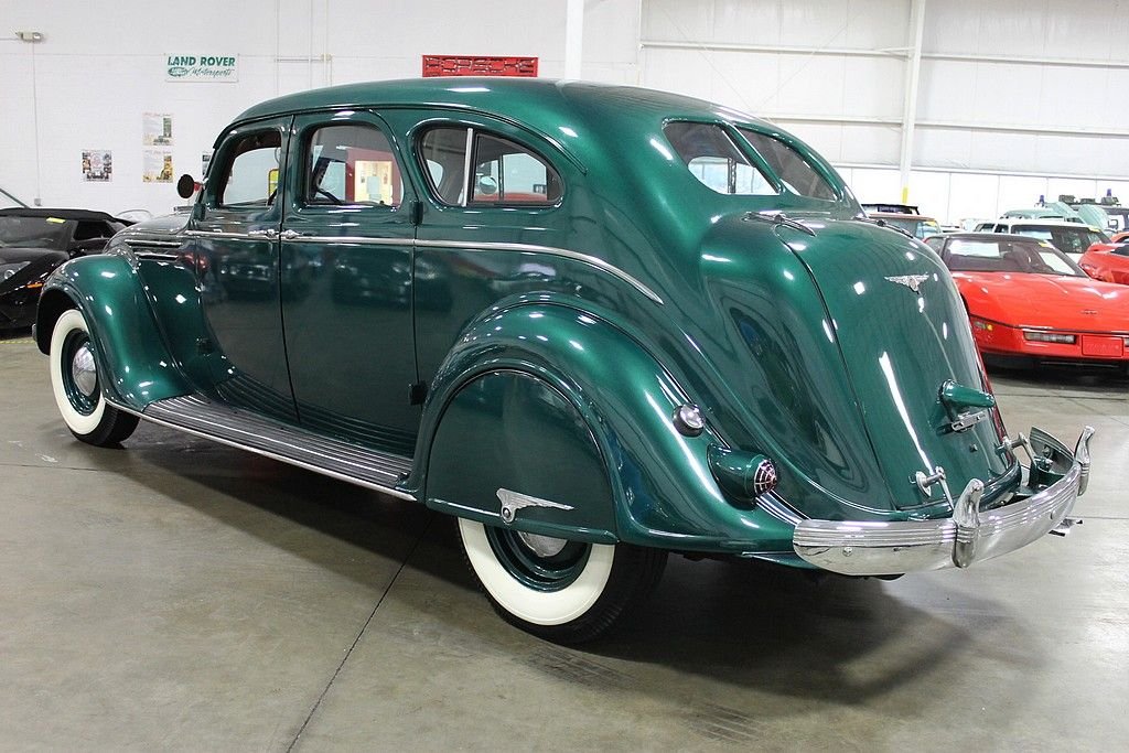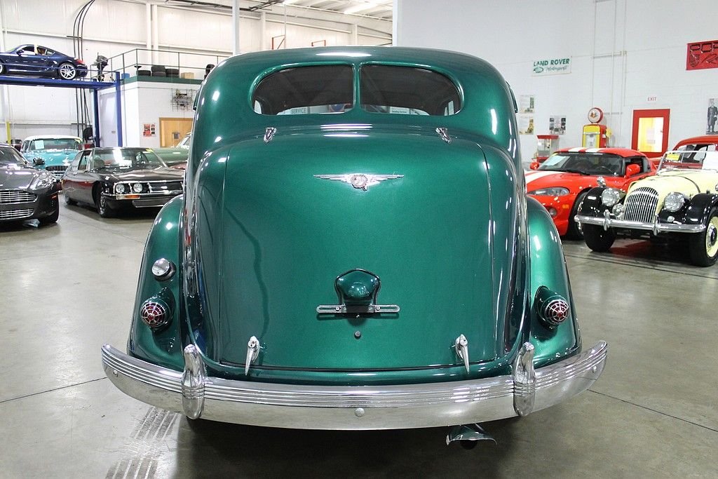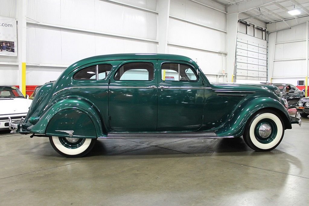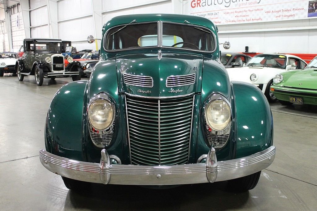 The Chrysler Airflow made its introduction in 1934 with much fanfare, pioneering the “Form Follow's Function” campaign, with its wind tunnel tuned design. The vehicle, engineered by veteran designer Carl Breer and featured a smooth innovative design and was built on a “truss bridge” chassis allowing both front and rear seats to fit entirely within the wheelbase allowing for a very roomy and comfortable passenger compartment. The 1937 Chrysler Airflow Sedan offered here is a handsome example that features and older restoration preserving original characteristics of the vehicle. It is presented in Green over and elegant light tan cloth interior. The car features the proven 323.5-cid straight-eight C17 series engine and a three speed with overdrive transmission. The overall structure of this Airflow is quite impressive with much originality in the trim, chrome, interior knobs and levers. The recessed headlights, fender skirts and running boards give the car its unique and streemlined look that it became famous for in the early 30's. Mechanically, this is a reliable and excellent driving vehicle that can be driven on many situations. Chryslers Airflow was a cutting-edge design and revolutionary creation that set a new standard for all to follow. With production hampered by the Great Depression, the Airflows are not plentiful vehicles, and quality examples such as this are in demand. This example with its fender skirts and wide white wall tires is sure to draw attention in any situation.