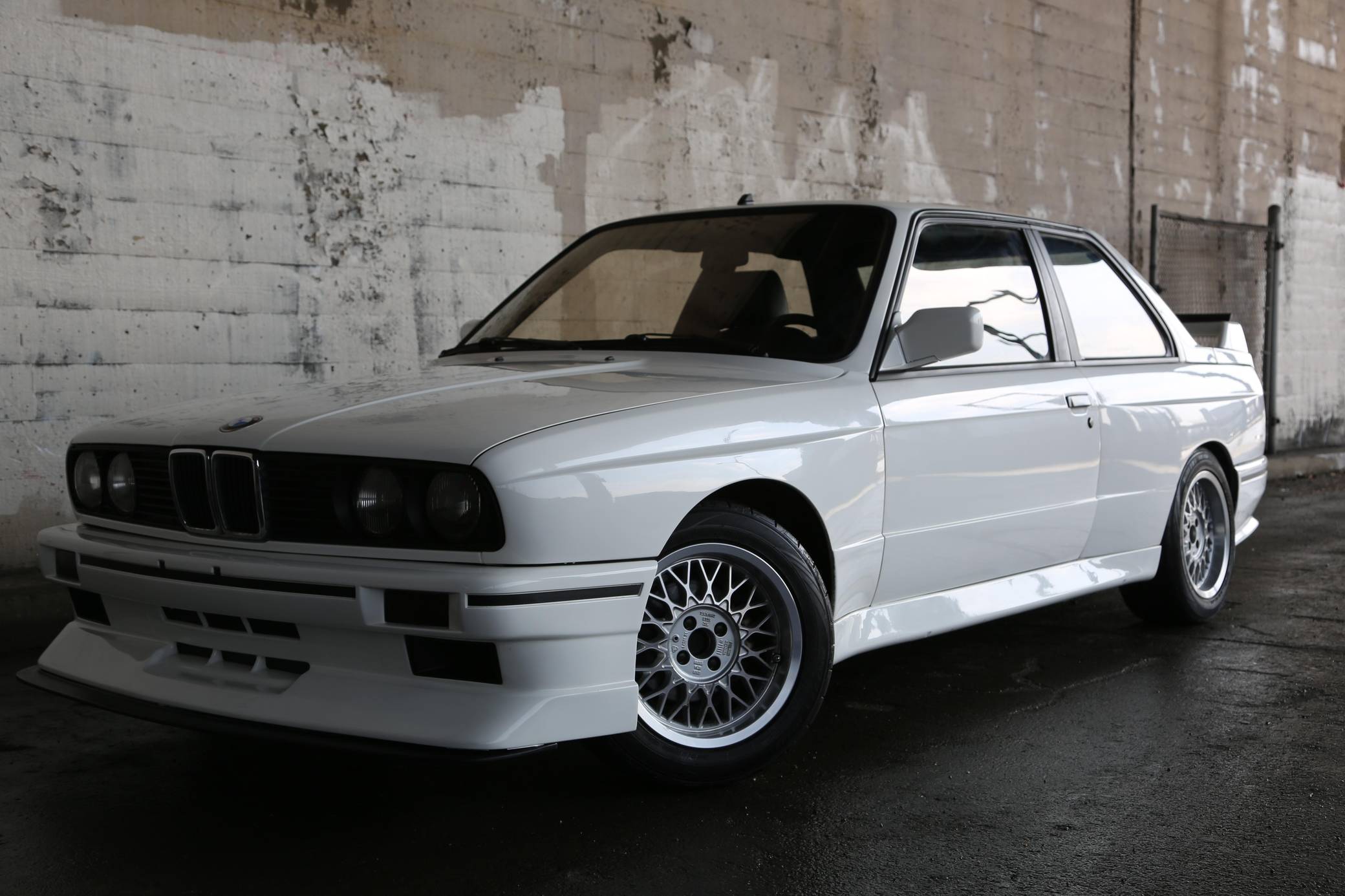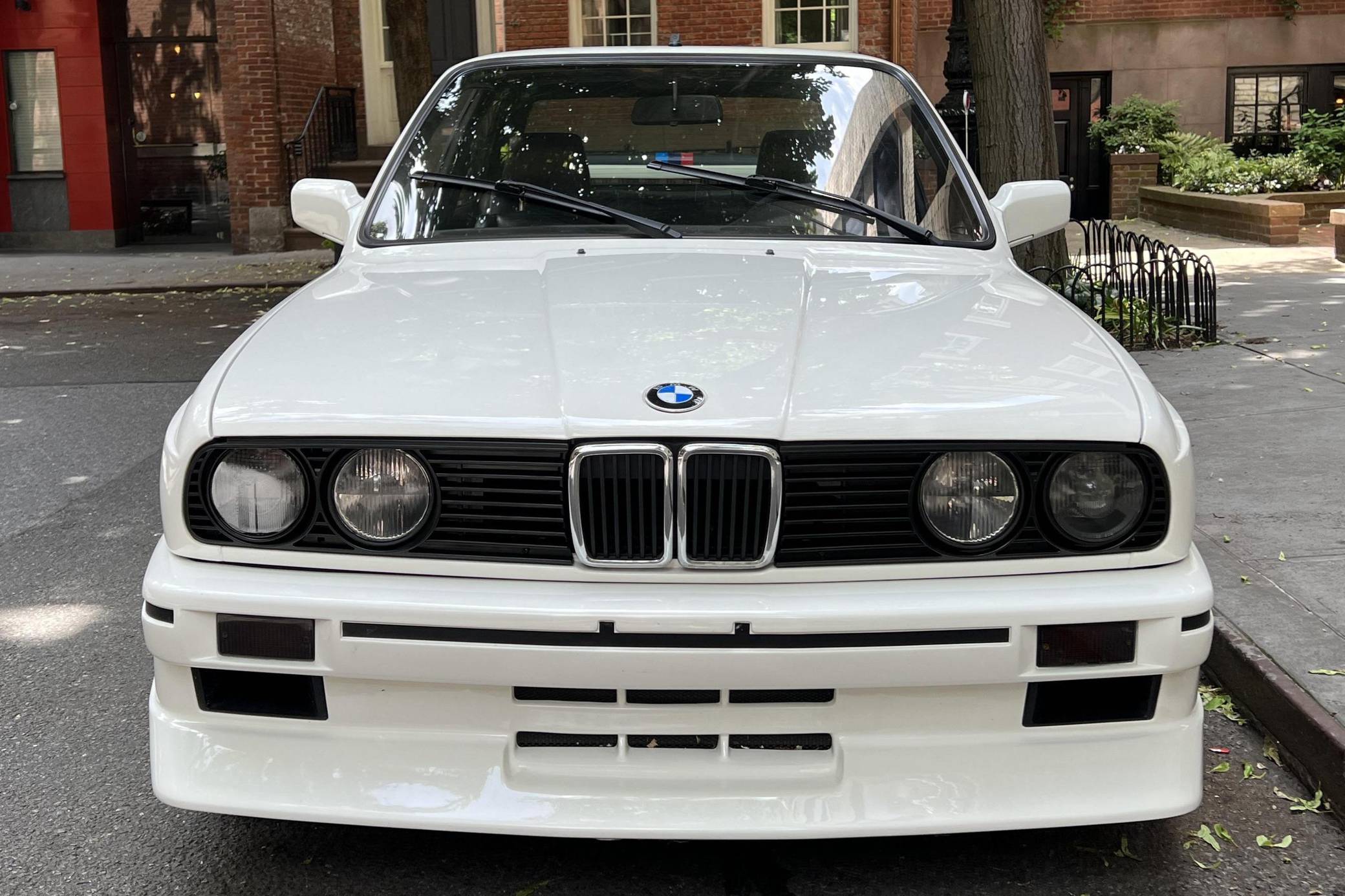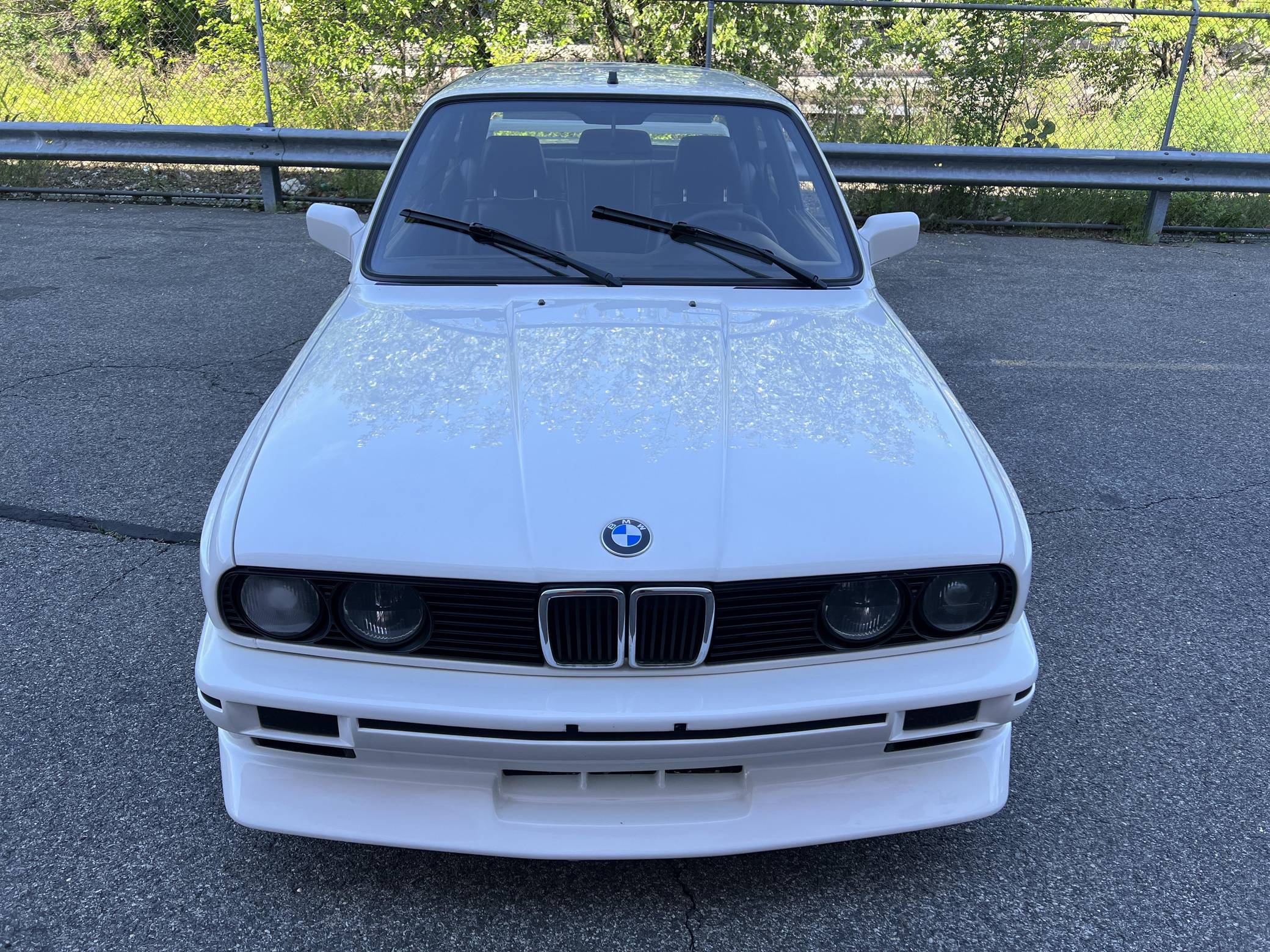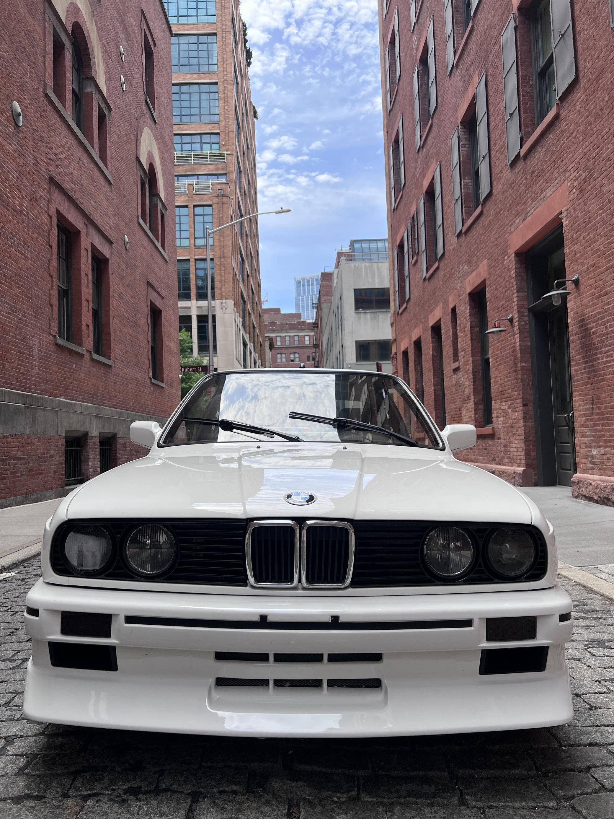1985 BMW 325e, finished in Alpine White with a black interior. This 325e has been modified with a fiberglass M3-style body kit. Other modifications reported by the seller include aftermarket parts in the exhaust system, 15-inch wheels, a front splitter, and a JVC CD player. More details about the modifications made to this car are provided below. BMW introduced the E30-generation 3 Series in the United States late in the 1983 model year. It was originally offered exclusively with a 4-cylinder engine, but 6-cylinder-powered models were quickly added to the range. The 325e notably joined the line-up for 1984 as the first 6-cylinder-powered E30 sold in the United States. BMW made several updates to the E30 and production ended after the 1991 model year. Power comes from a 2. 7-liter straight-6, rated at 122 horsepower and 169 lb-ft of torque. Part of the "M20" family of engines, it spins the rear wheels via a 5-speed manual transmission.