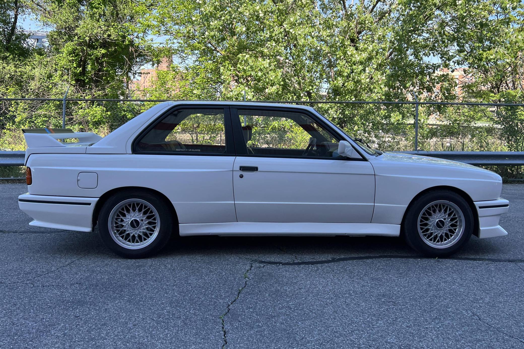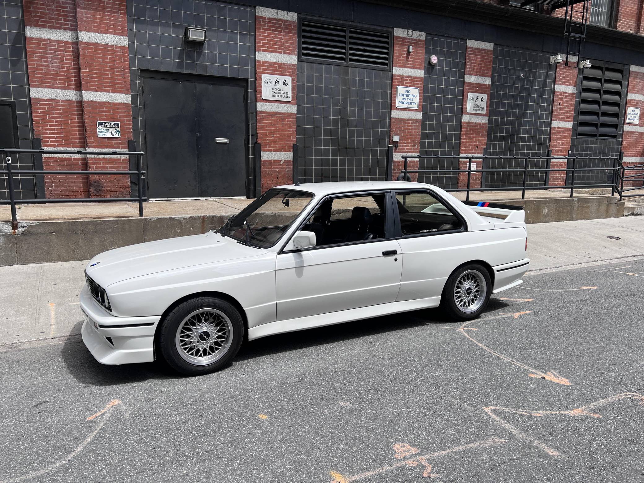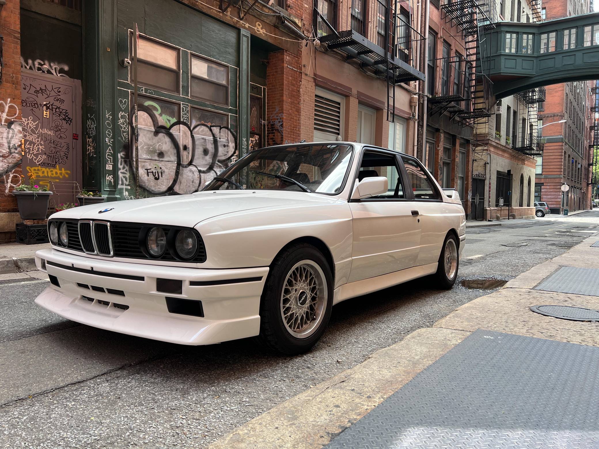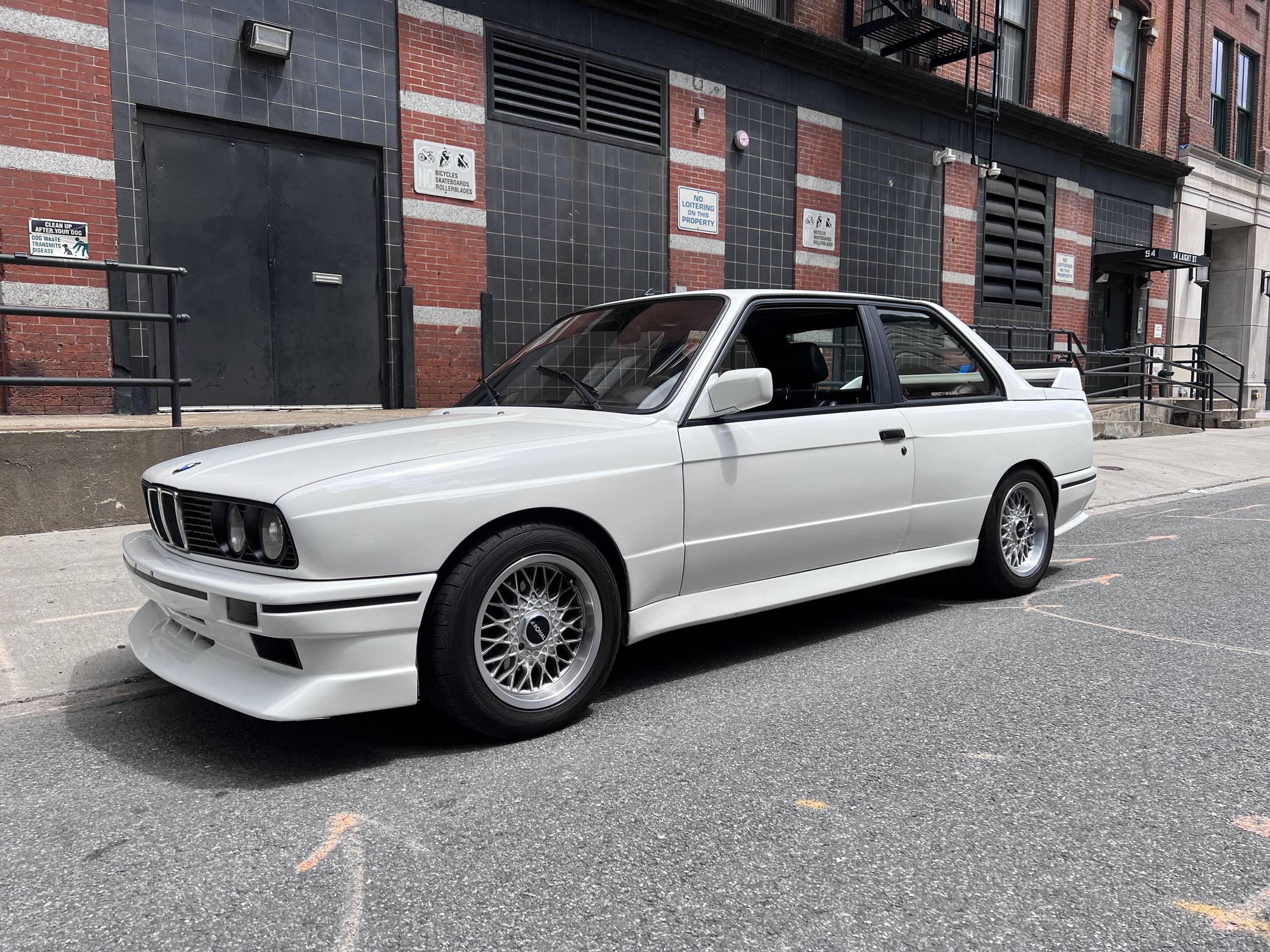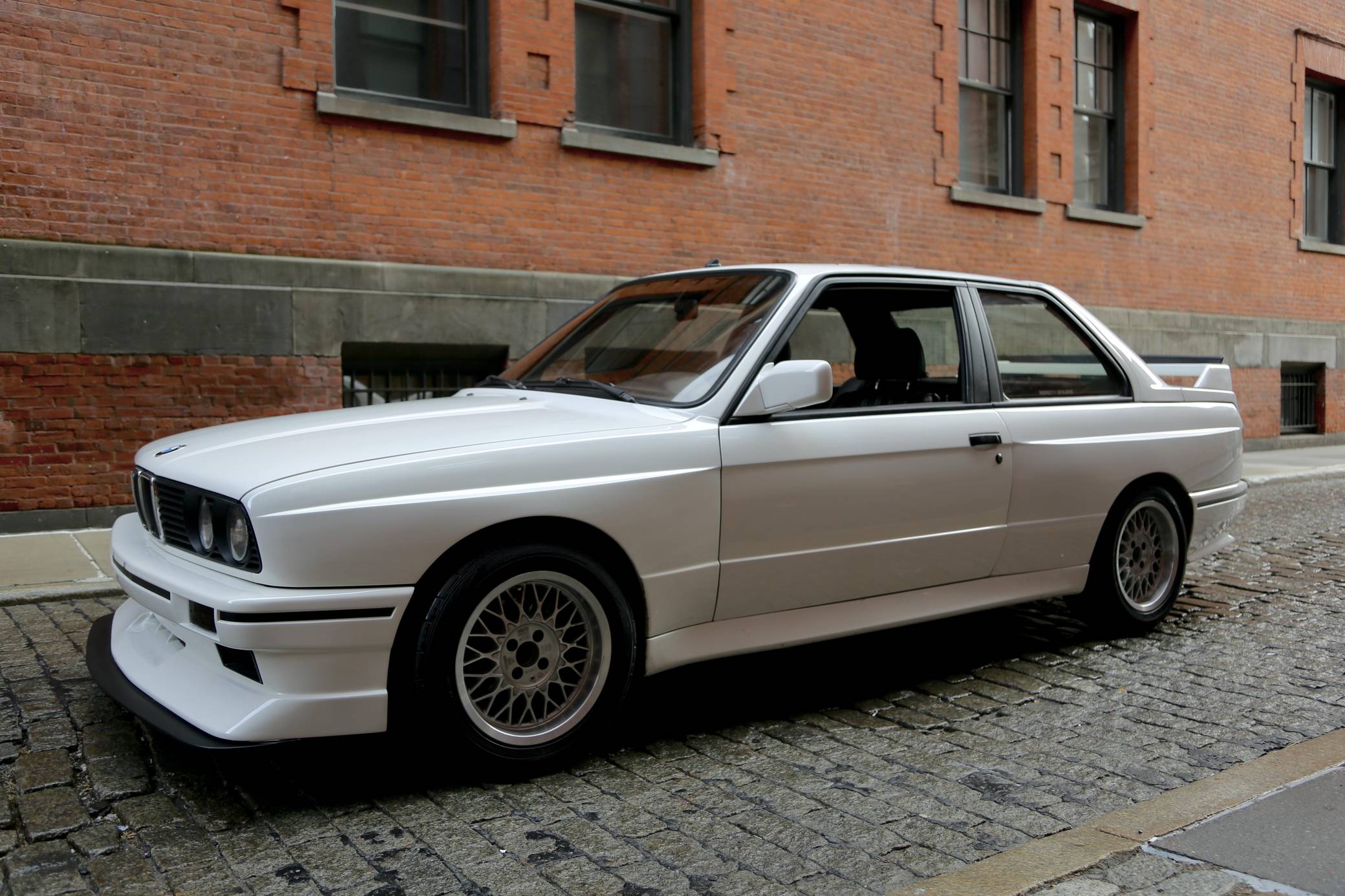 1985 BMW 325e, finished in Alpine White with a black interior. This 325e has been modified with a fiberglass M3-style body kit. Other modifications reported by the seller include aftermarket parts in the exhaust system, 15-inch wheels, a front splitter, and a JVC CD player. More details about the modifications made to this car are provided below. BMW introduced the E30-generation 3 Series in the United States late in the 1983 model year. It was originally offered exclusively with a 4-cylinder engine, but 6-cylinder-powered models were quickly added to the range. The 325e notably joined the line-up for 1984 as the first 6-cylinder-powered E30 sold in the United States. BMW made several updates to the E30 and production ended after the 1991 model year. Power comes from a 2. 7-liter straight-6, rated at 122 horsepower and 169 lb-ft of torque. Part of the "M20" family of engines, it spins the rear wheels via a 5-speed manual transmission.