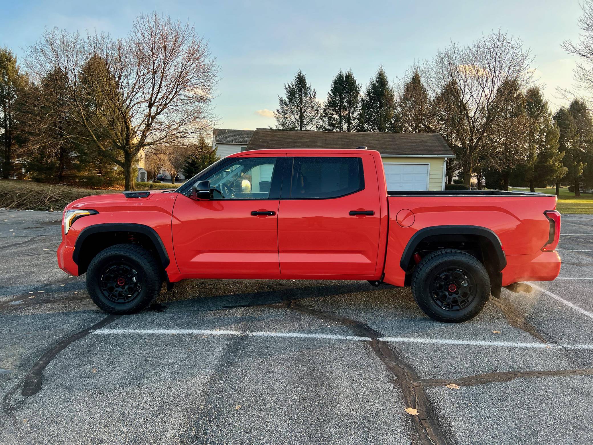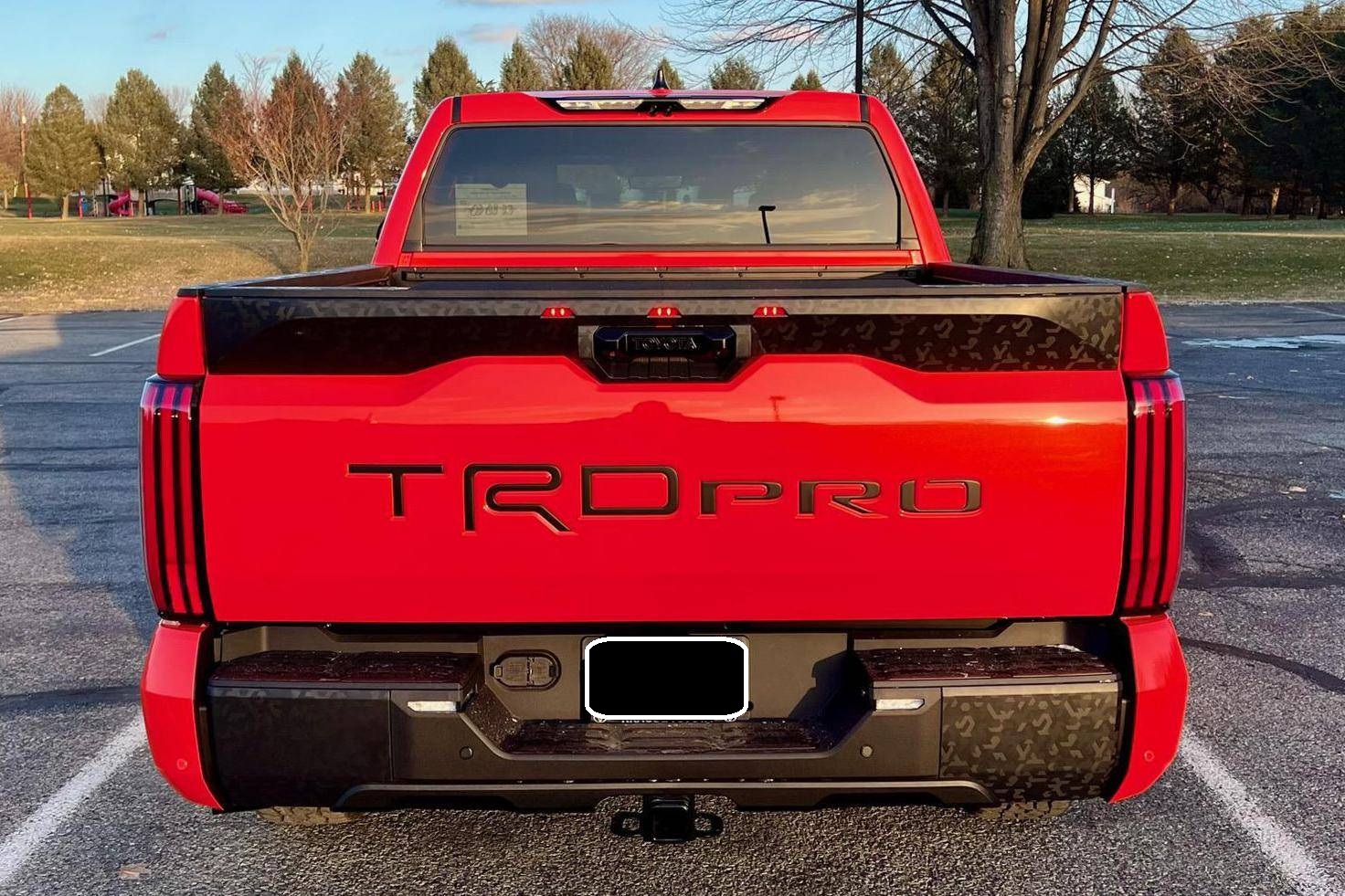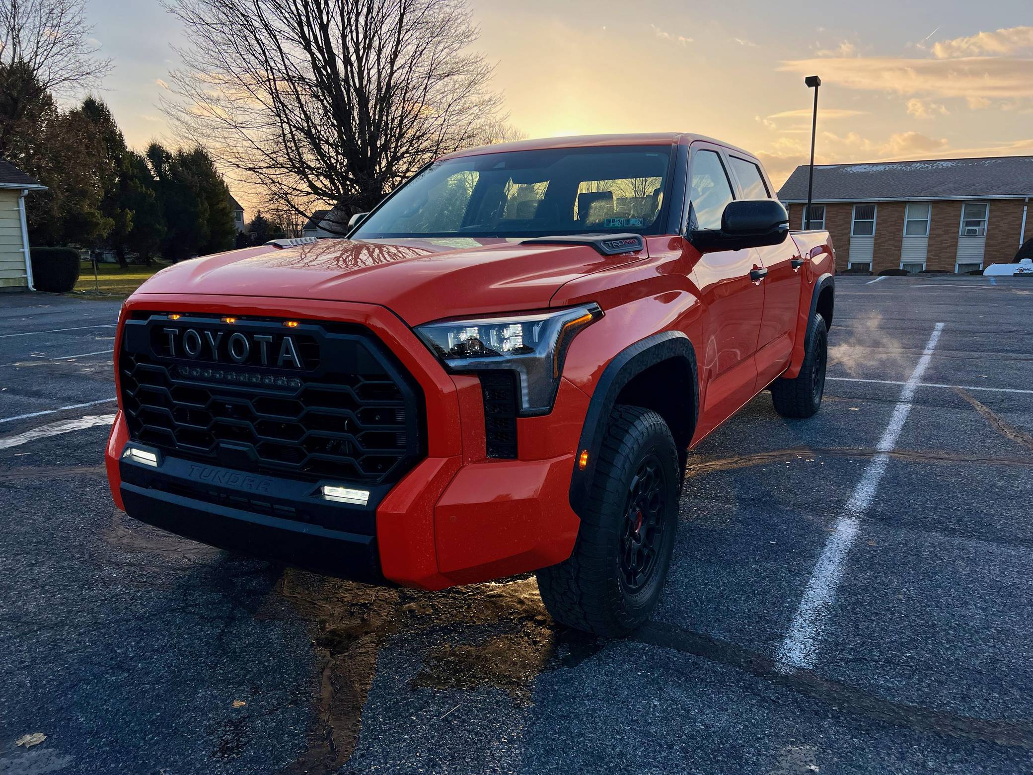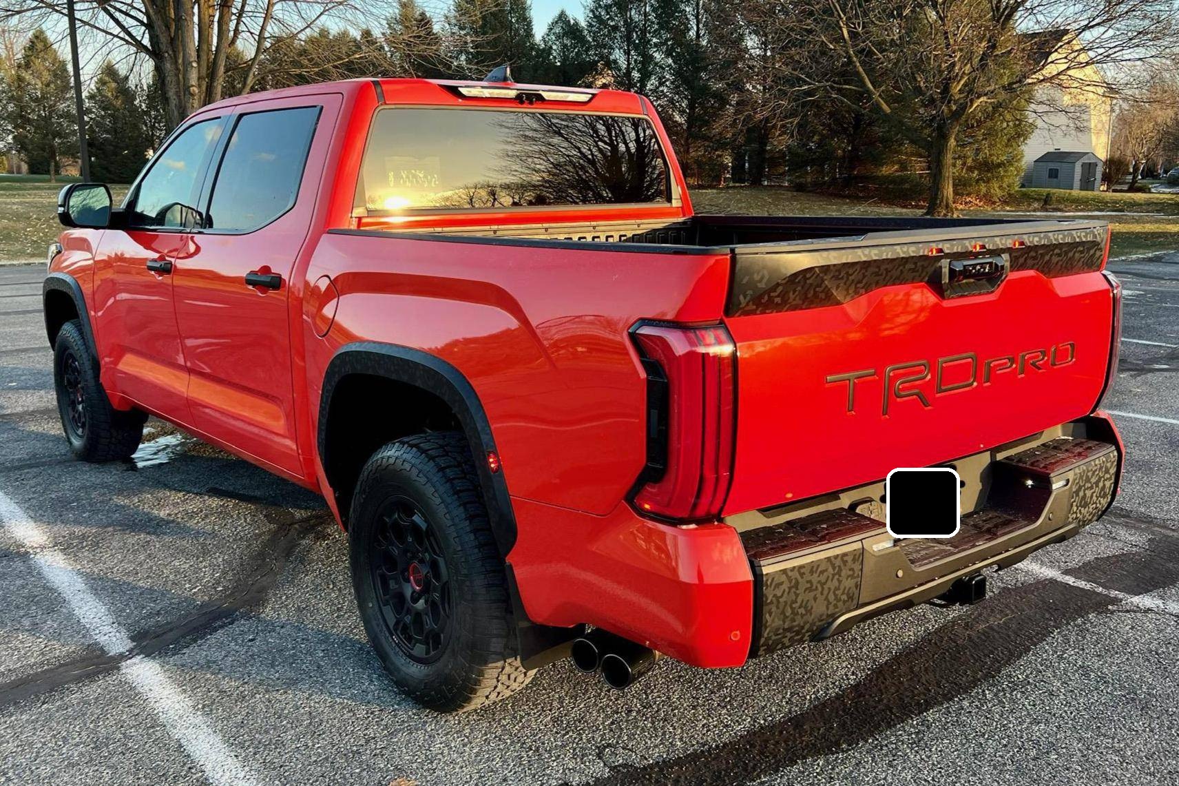 THIS… is a 2023 Toyota Tundra TRD Pro, finished in Solar Octane with a black interior. The odometer on this Tundra currently displays approximately 50 miles. 5. The seller reports no modifications. Called the "XK70" internally, the 3rd-generation Toyota Tundra debuted for the 2022 model year as the long-awaited follow-up to the 2nd-generation Tundra that cemented Toyota as a serious player in the full-size pickup segment. Gone is the V8, replaced by a turbocharged and (in some cases) electrified 6-cylinder options that not only helped increase fuel economy, but towing capacity and max payload as well. As before, an off-road-focused TRD Pro trim level is offered that combines muscular styling cues with genuine go-anywhere capabilities. Power comes from an "I-FORCE MAX" gasoline-electric hybrid powertrain, which consists of a 3. 5-liter twin-turbocharged V6 engine and an electric motor/generator. The system is rated at a combined 437 horsepower and 583 lb-ft of torque. Output is sent to the rear or all four wheels via a 10-speed automatic transmission and a 4WDemand part-time 4-wheel drive system with an electronically-controlled transfer case.