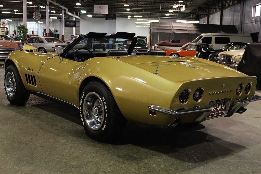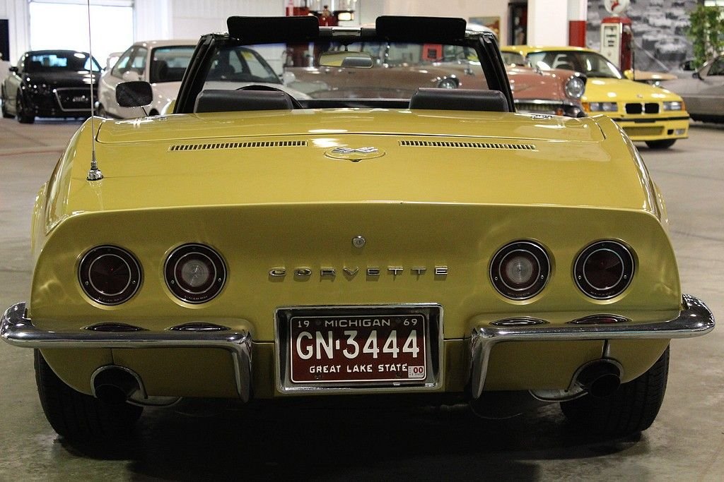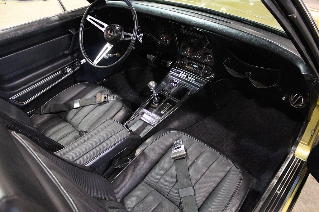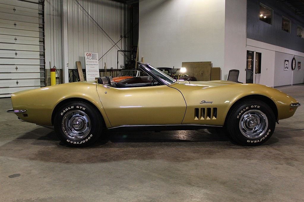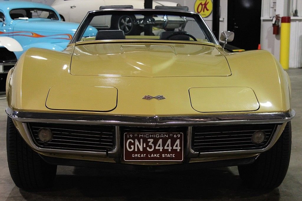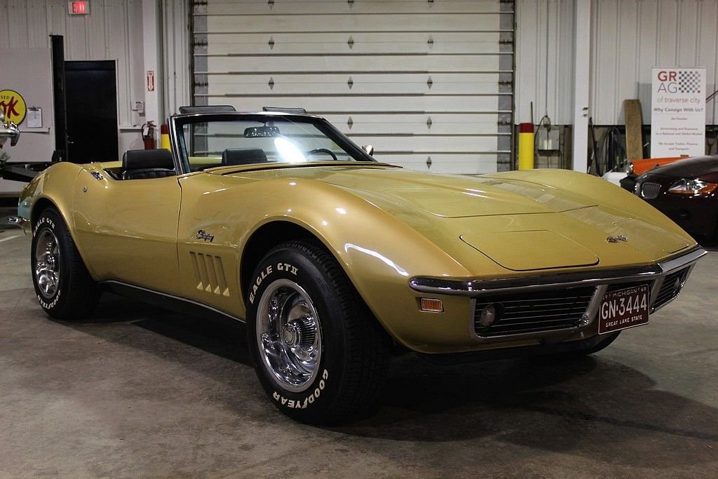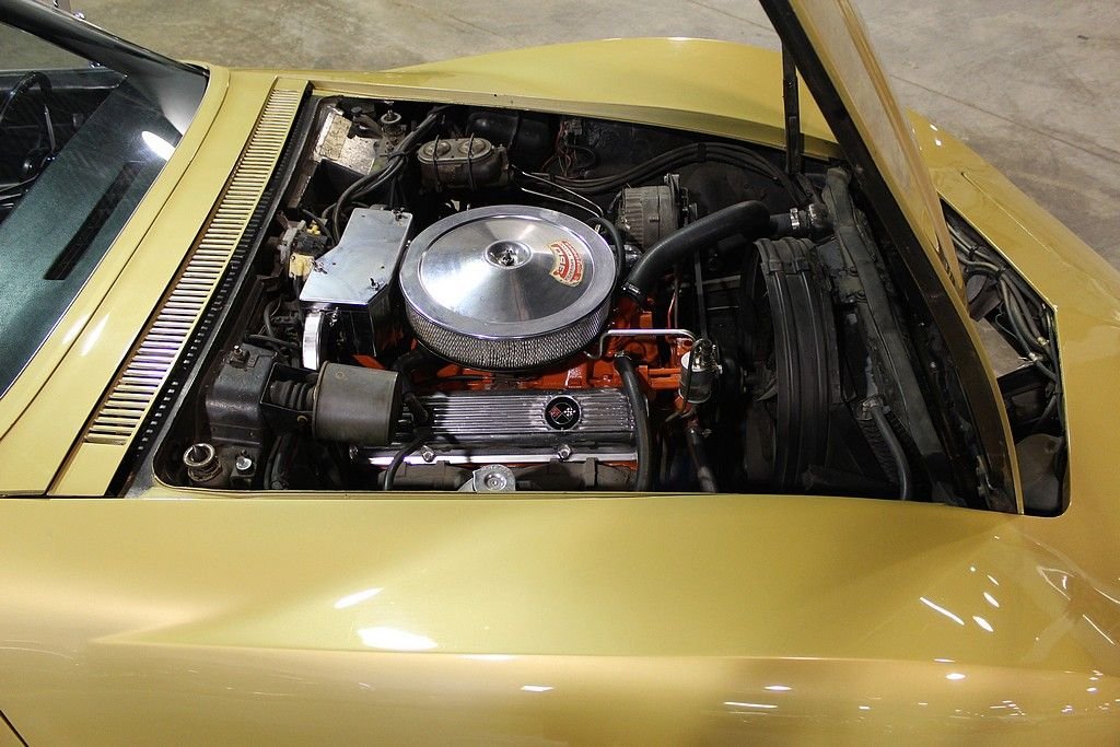 We all know that the Corvette name carries a special place in car world for so many and has been the model of cutting edge design for the automotive industry for decades. And arguably the C-3 design when it came out was truly was ahead of its time with its radically shaped fenders, front end and gill like front fenders that resembled a Mako Shark. Also new was the completely re-designed interior that featured a multiple guage cluster in the center and large round dials in front of the driver for the speedometer and matching tachometer. And another first was a fiber-optic system that monitored exterior lights. This spectacular car is a documented two owner from new automobile being purchased by the second owner in the Spring of 1989 and having just driven over 10,000 miles in the last 24 years. Not only has this car been lovingly cared for, it has also been carefully maintained to keep its originality. Based on the mountain of information and receipts dating back, the car did have a re-paint of its original Riverside Gold back on October of 1979 by a company called Fleetwood in the Detroit area. The paint is now 34 years old and still shines very nice with some blemishes. The car was purchased by the original owner 10/4/68 at Dexter Chevrolet and remained in Michigan its entire life. We not only have all the current owners purchase agreements and receipts. With the file is the original purchase agreement, original title and protection plan with plate. It also comes with original owners and service manuals. This car was ordered with few options, however one that is not often seen is the auxiliary vinyl covered hardtop that is original and comes with the car. This is a true numbers matching L46 350 cubic inch/350HP mated to a 4-speed close-ratio transmission and posi-trac rear end. Although the radio has been replaced with a better vintage looking radio by custom auto sound classics. The complete original radio comes with the sale as well as the original smog pump including bracket that was removed by the original owner. Also, please note that the third and fourth number on the title have been transposed and have been that way since the beginning, most definitely a clerical error from the dealer or the state. Not too often do we get to offer such a great original car but one that has never been neglected and comes with this much documentation. This wonderful car can surely not be duplicated. You will not want to miss this opportunity to own a piece of motoring history.