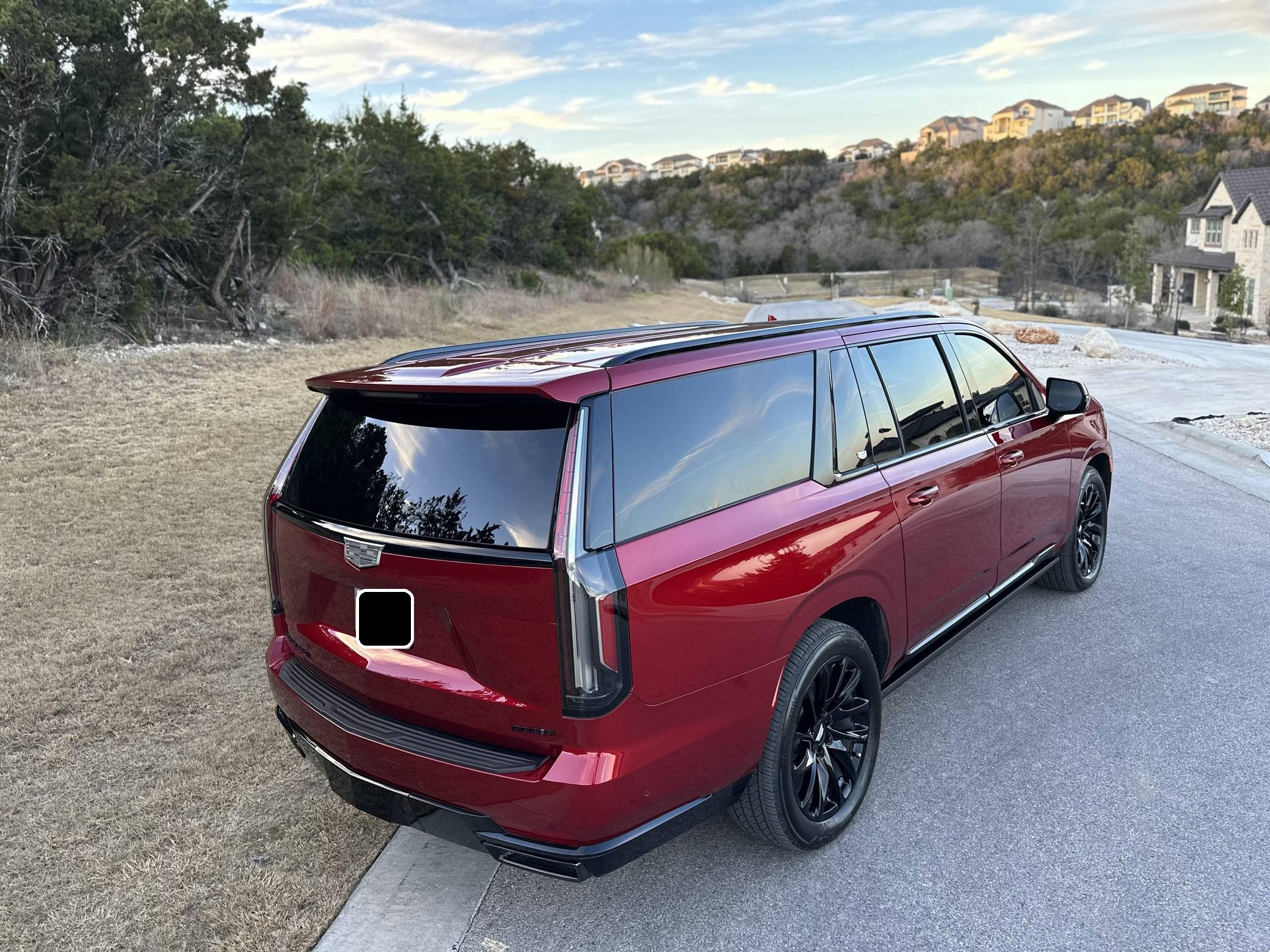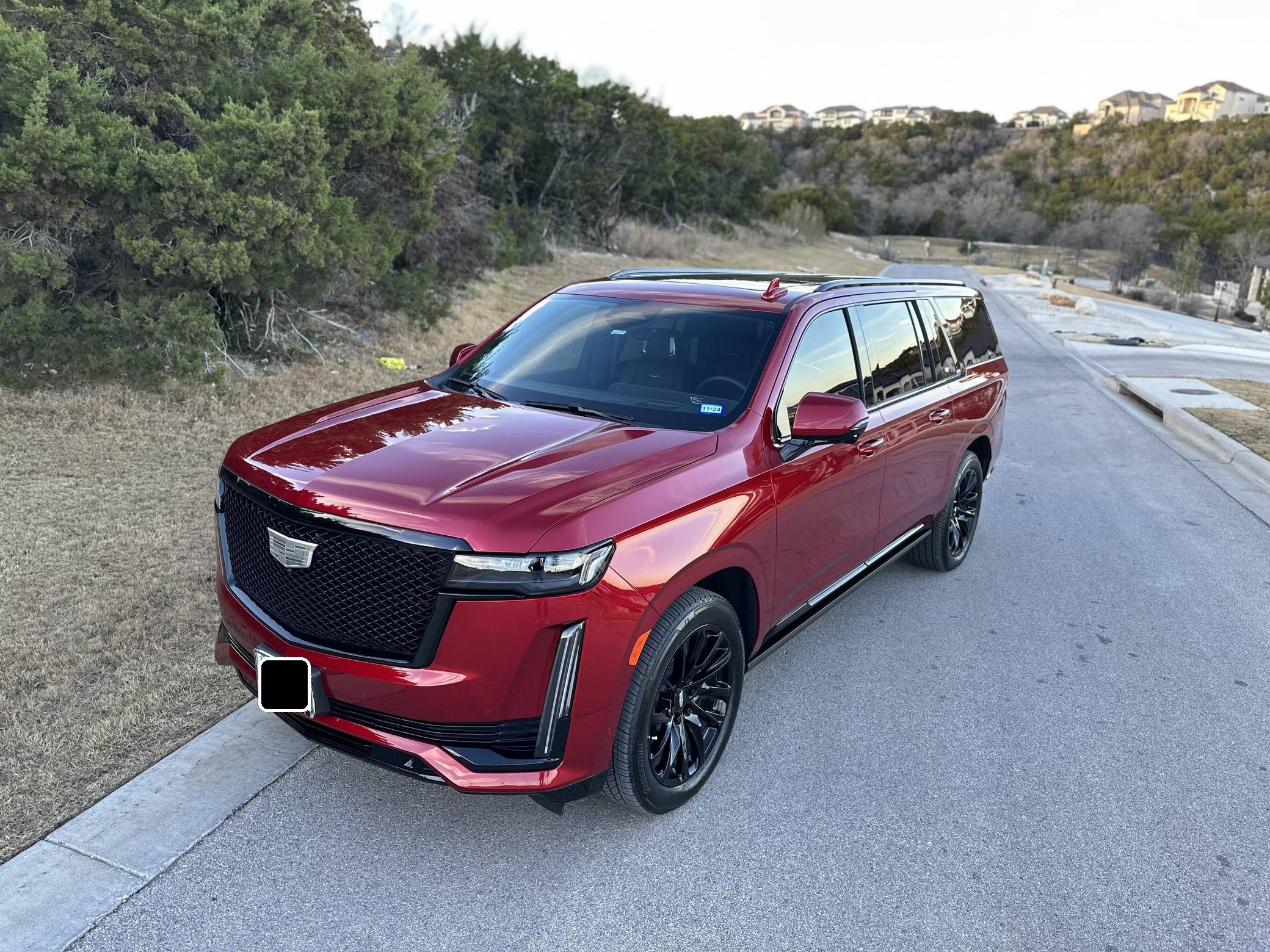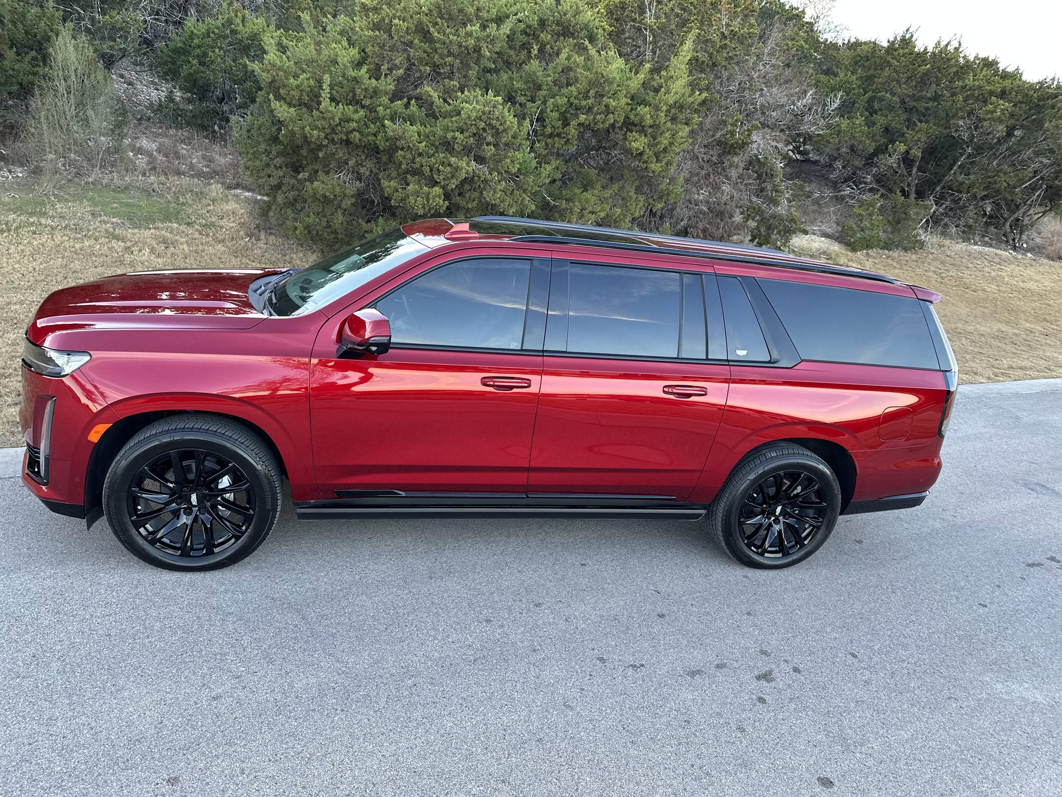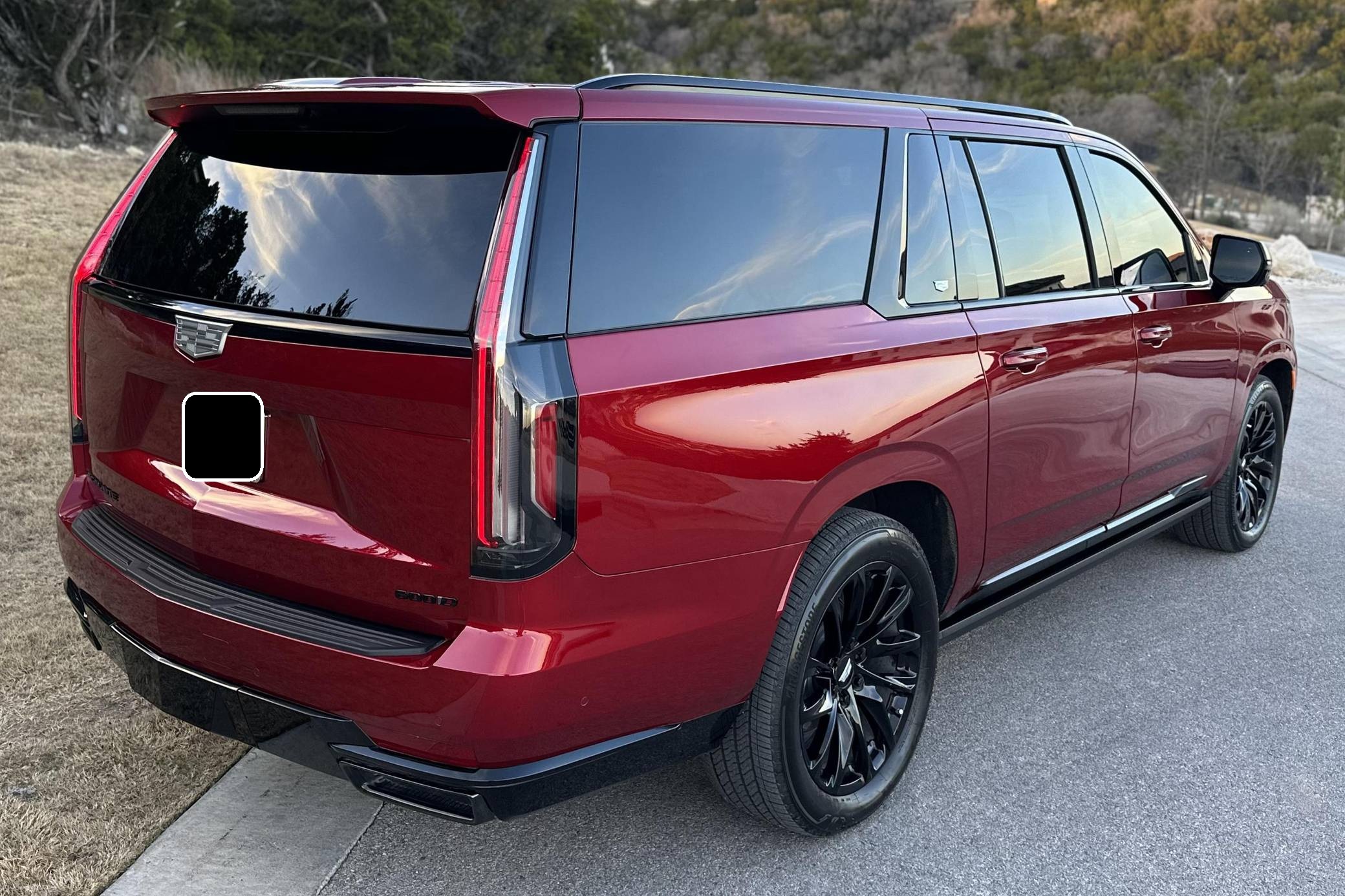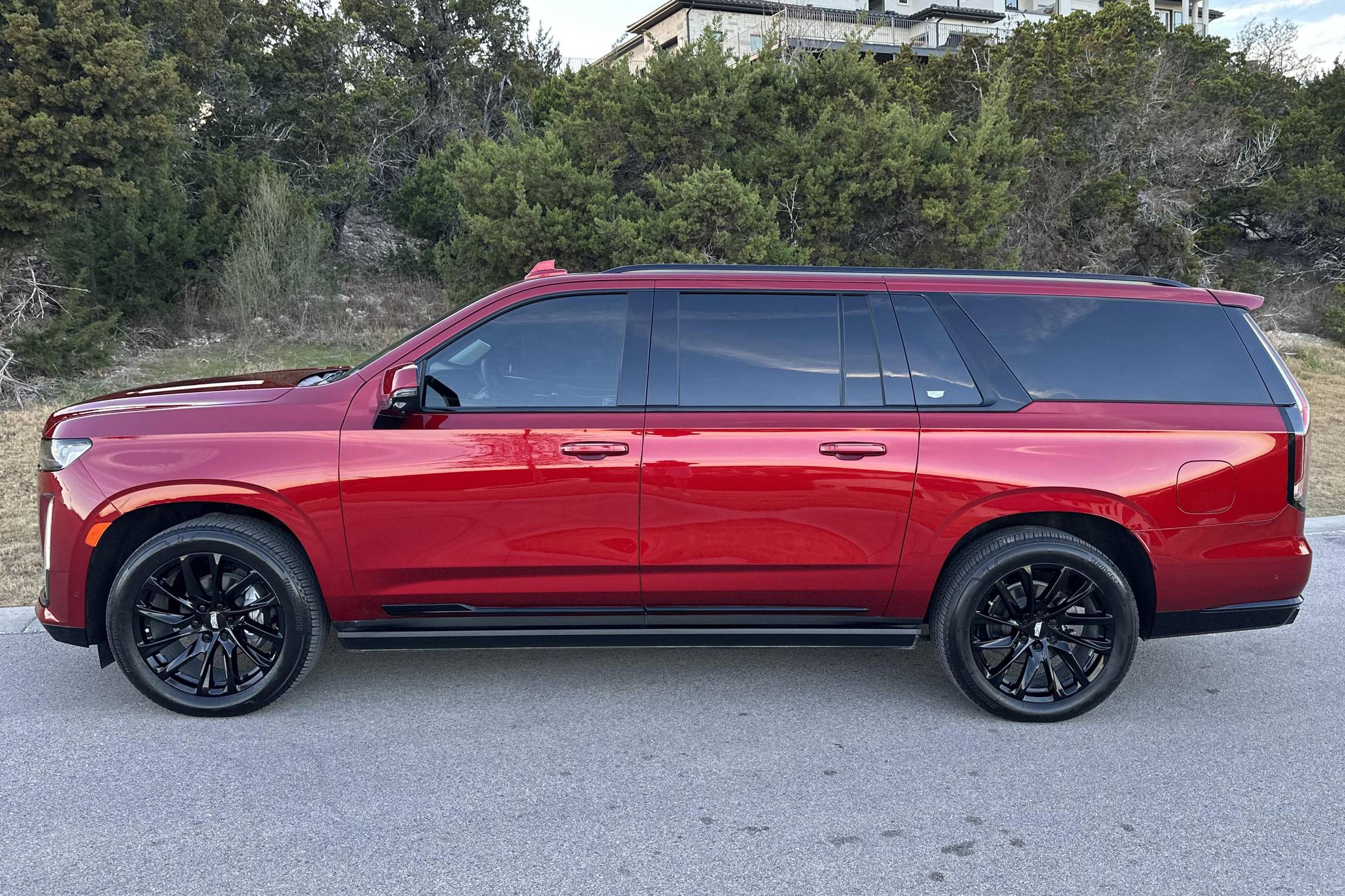 THIS. . . is a 2023 Cadillac Escalade ESV 4WD Sport Platinum, finished in Radiant Red Tintcoat with a Dark Auburn and black interior. A partial list of notable equipment includes the Onyx Package, an electronic limited-slip differential, air ride adaptive suspension, Magnetic Ride Control, power side steps, a panoramic sunroof, semi-aniline leather upholstery, heated and ventilated front seats, heated second-row captain's chairs, a rear entertainment system, wireless Android Auto and Apple CarPlay, an AKG 36-speaker audio system, a console refrigerator with freezer, and night vision. The seller reports no modifications. Cadillac launched the fifth and current generation Escalade for 2021, which brought significant improvements to interior space, particularly for the second- and third-row passengers, as well as the onboard technology features, refinement, and performance. Power comes from a Duramax "LM2" 3. 0-liter turbodiesel inline-6 engine, rated at 277 horsepower and 460 lb-ft of torque. Output is sent to the rear or all four wheels via a 10-speed automatic transmission.