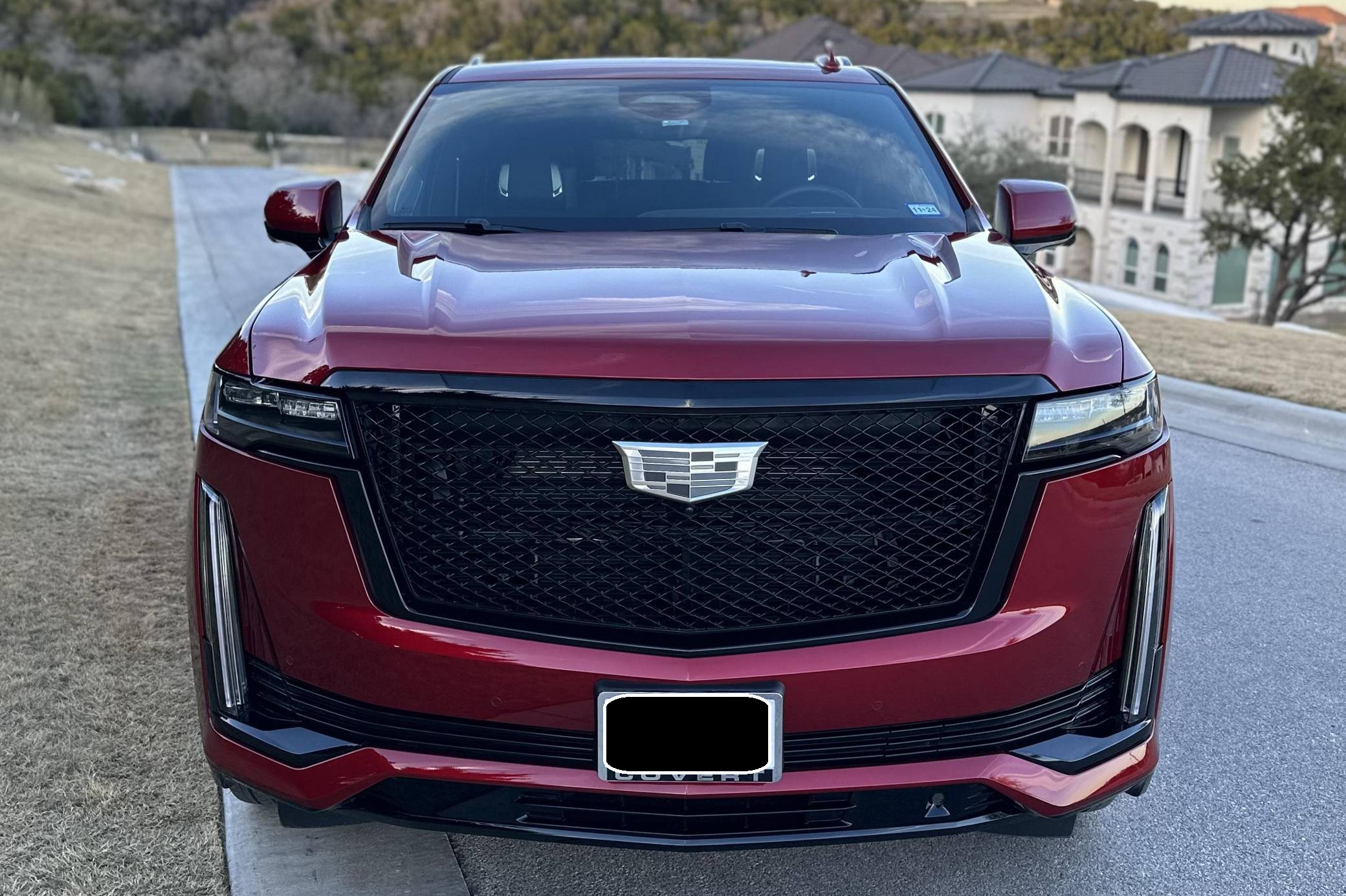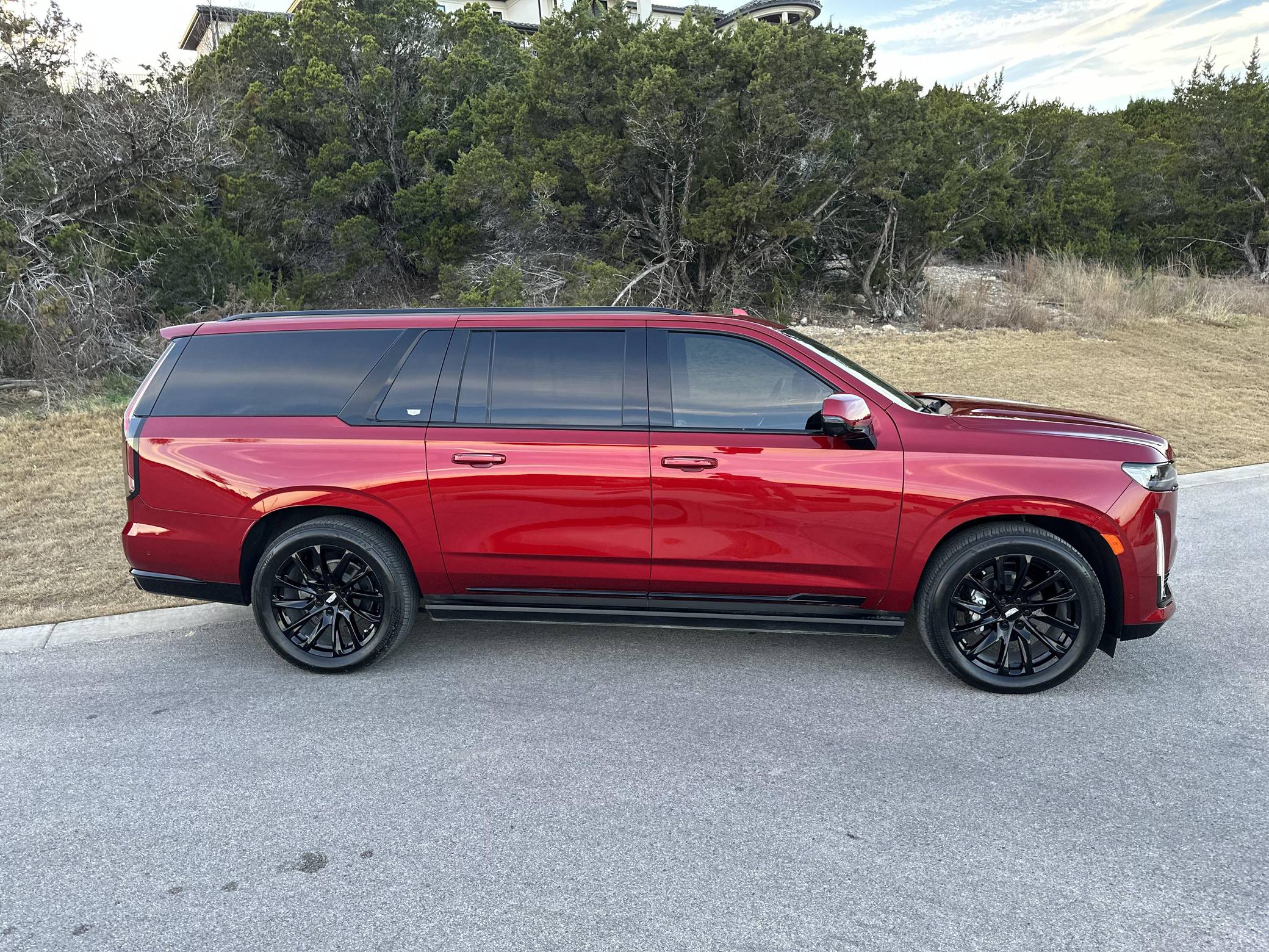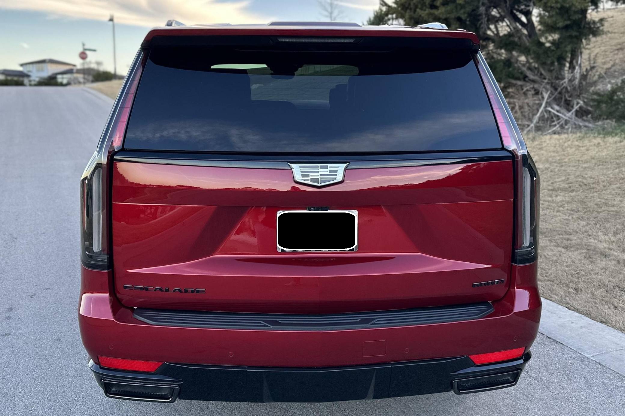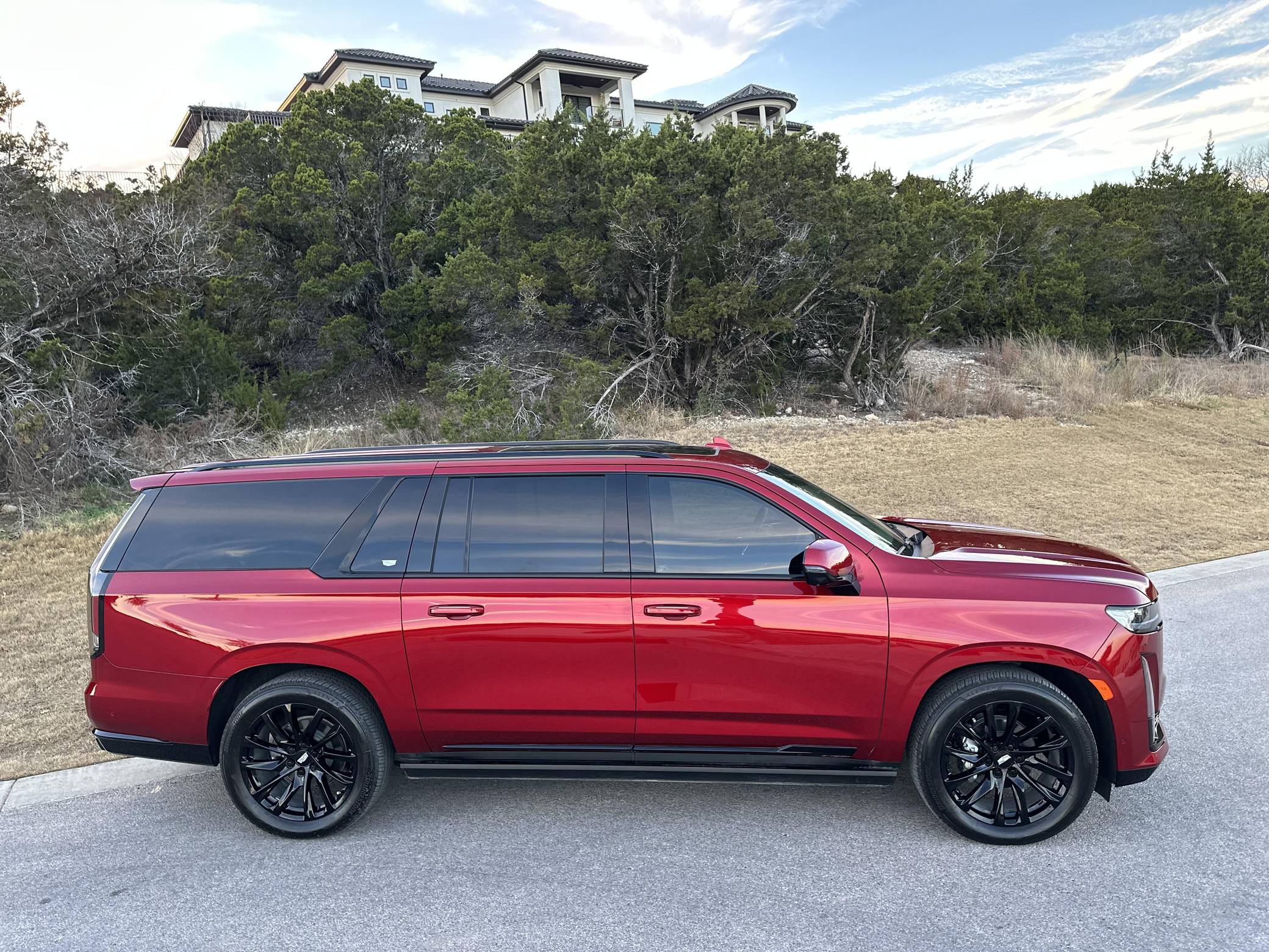 THIS. . . is a 2023 Cadillac Escalade ESV 4WD Sport Platinum, finished in Radiant Red Tintcoat with a Dark Auburn and black interior. A partial list of notable equipment includes the Onyx Package, an electronic limited-slip differential, air ride adaptive suspension, Magnetic Ride Control, power side steps, a panoramic sunroof, semi-aniline leather upholstery, heated and ventilated front seats, heated second-row captain's chairs, a rear entertainment system, wireless Android Auto and Apple CarPlay, an AKG 36-speaker audio system, a console refrigerator with freezer, and night vision. The seller reports no modifications. Cadillac launched the fifth and current generation Escalade for 2021, which brought significant improvements to interior space, particularly for the second- and third-row passengers, as well as the onboard technology features, refinement, and performance. Power comes from a Duramax "LM2" 3. 0-liter turbodiesel inline-6 engine, rated at 277 horsepower and 460 lb-ft of torque. Output is sent to the rear or all four wheels via a 10-speed automatic transmission.
