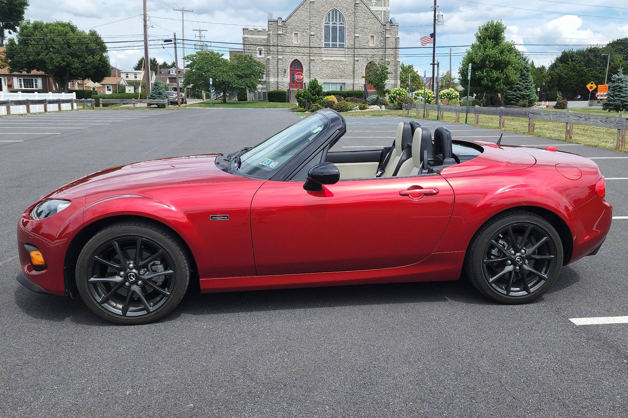 2015 Mazda MX-5 Miata 25th Anniversary Edition, finished in Soul Red Metallic with a black hard top and an Almond interior. This MX-5 is equipped with a 6-speed manual transmission, and its odometer currently displays about 14,500 miles. Mazda produced just 1,099 25th Anniversary Edition MX-5 models for 2015 – only 100 of which were destined for the U. S. – and all featured Soul Red paint, a black power-retractable hard top, Almond leather upholstery, 17-inch gunmetal alloy wheels, red interior stitching, alloy pedals, and hand-selected pistons and connecting rods. This MX-5 is number 715, as indicated by the badge on the driver-side fender; a 25th anniversary MX-5 Tourneau wristwatch is included with the sale. Factory equipment includes 17-inch alloy wheels, a sport-tuned suspension system with Bilstein shock absorbers, a limited-slip differential, xenon headlights, fog lights, leather upholstery, heated seats, a leather-wrapped steering wheel, a Bose audio system, and an Advanced Keyless Entry system. Modifications reported by the seller are limited to a stubby radio antenna, and the factory antenna is included in the sale. The NC third-generation Miata debuted for the 2006 model year to broad acclaim for maintaining the Miata's iconic handling and fun-to-drive demeanor while increasing comfort and livability. It shared a platform with the RX-8 but received heavily revised components to reduce weight but maintain rigidity, continuing the Miata's reputation of providing a well-balanced driving experience. Power comes from a 2. 0-liter inline-4, rated at 167 horsepower and 140 lb-ft of torque. Output is sent to the rear wheels via a 6-speed manual transmission.