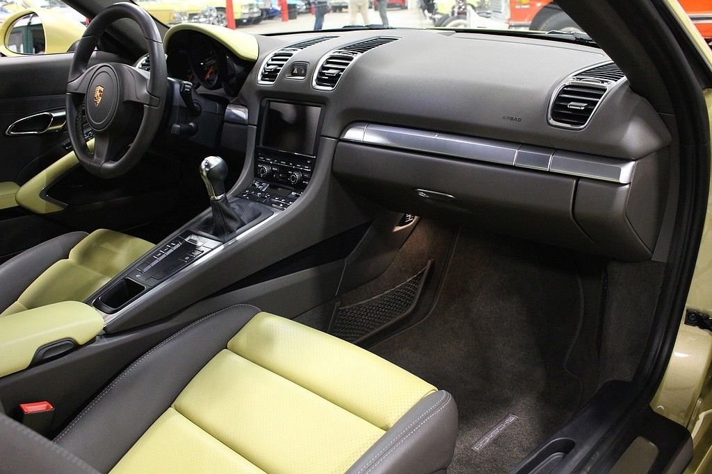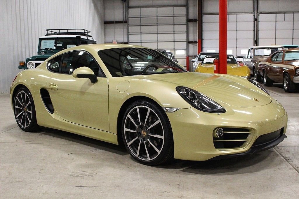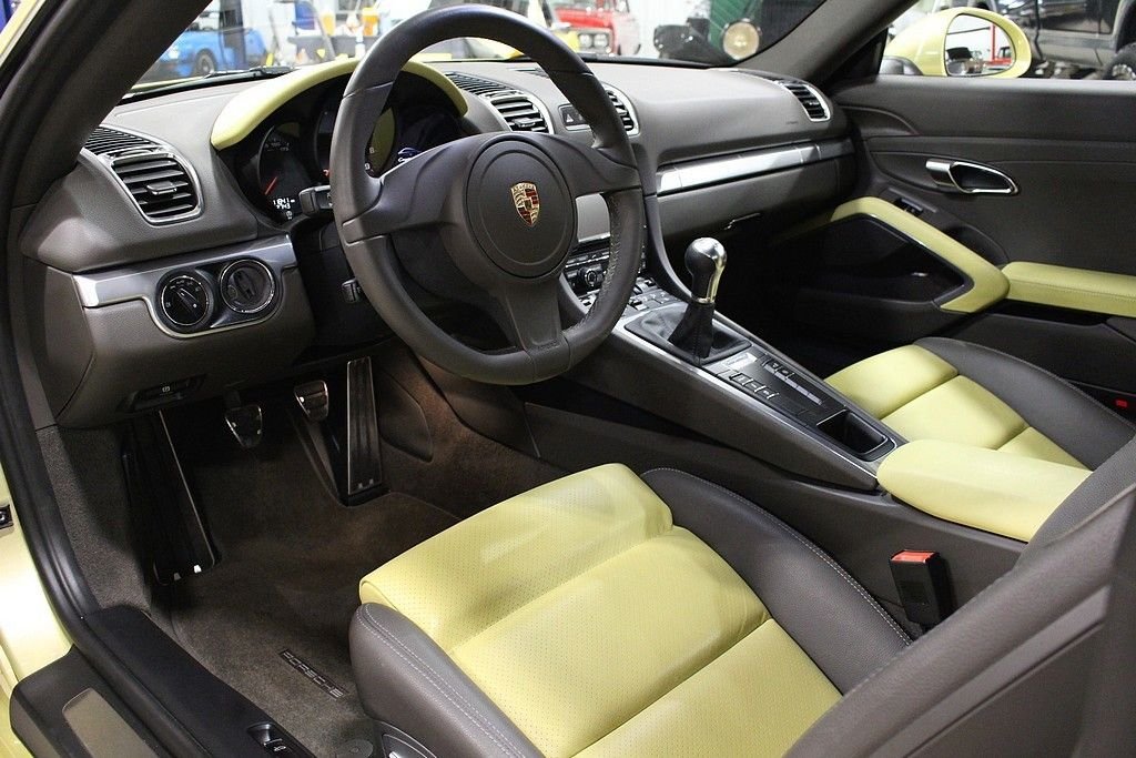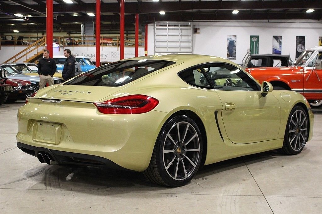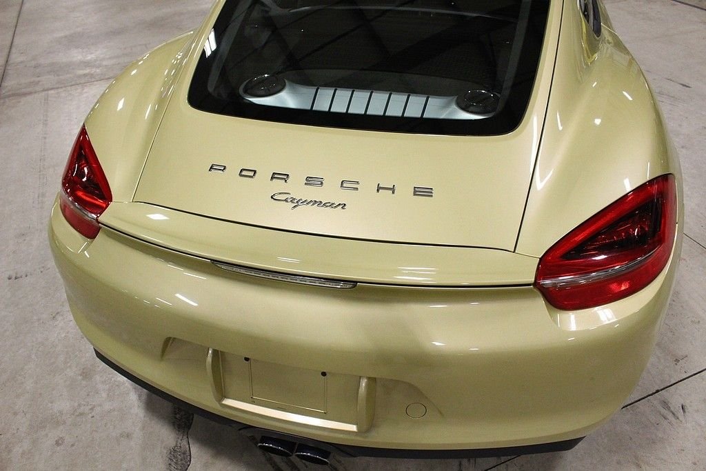 Porsche introduced its Cayman in 2005. The car was based on the popular mid-Boxster chassis and initially marketed as an entry level sports coupe for the brand. The Cayman quickly raised some eyebrows as it's mid engine configuration demonstrated handling capabilities that rivaled any class of sports car. Since, in typical Porsche fashion, the Cayman has been refined and for 2014, has evolved into one of the best overall sports cars on the market and winning over the likes of professional driver Walter Rohrl form its flagship 911 in overall driving experience. The 2014 Porsche Caymen offered here comes dressed in special order option Lime Gold Metallic exterior paint over two tone Agate Grey / Lime Gold leather interior. Options include: 6 speed manual transmission, 20 inch Carrera Classic II wheels, Wheel Centers with Color Crests, PASM , Bi-Xenon Headlamps with Dynamic Corner Lights, Interior Leather Package, Power Sport Seats with 14 Way Memory Package, Premium Package, Info Package, Bose Premium Surround Sound System, Dory Entry Guards SS, Sports Tailpipes, Porsche Crest Embossed headrests etc. Other highlights include Navigation, Heated Seats, Homelink, Bluetooth, Universal multimedia interface, Anti-Dazzle interior mirror, clear bra and a host of other goodies.
