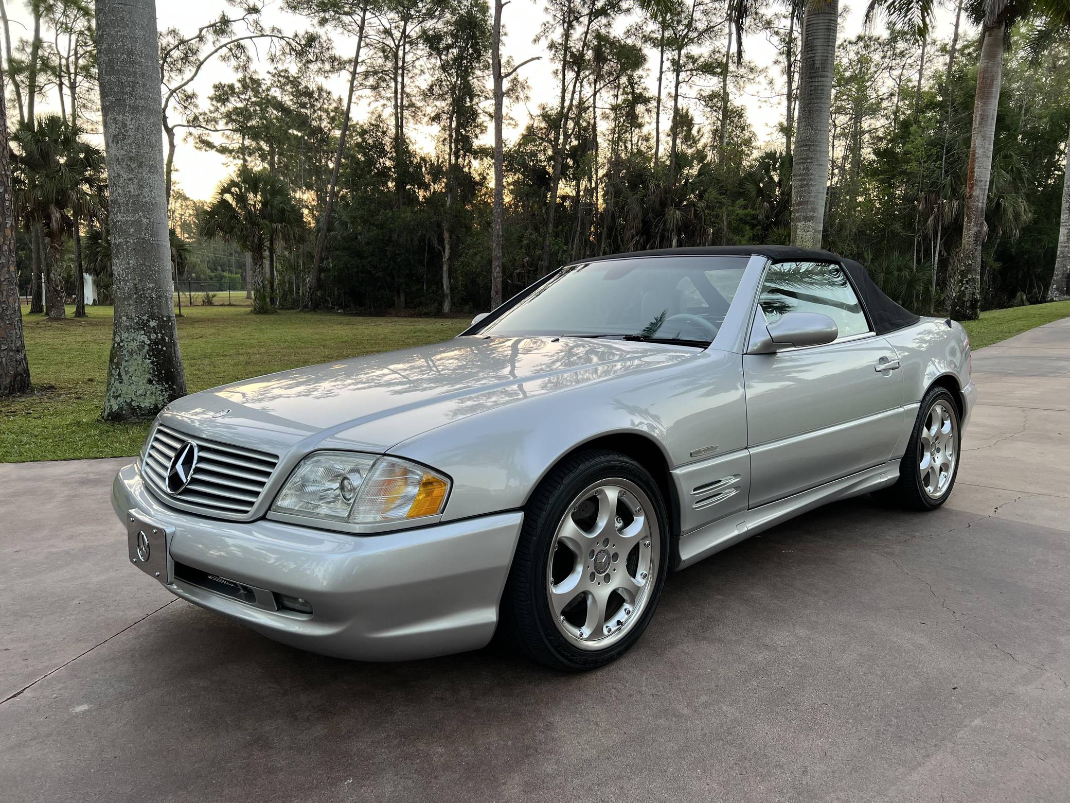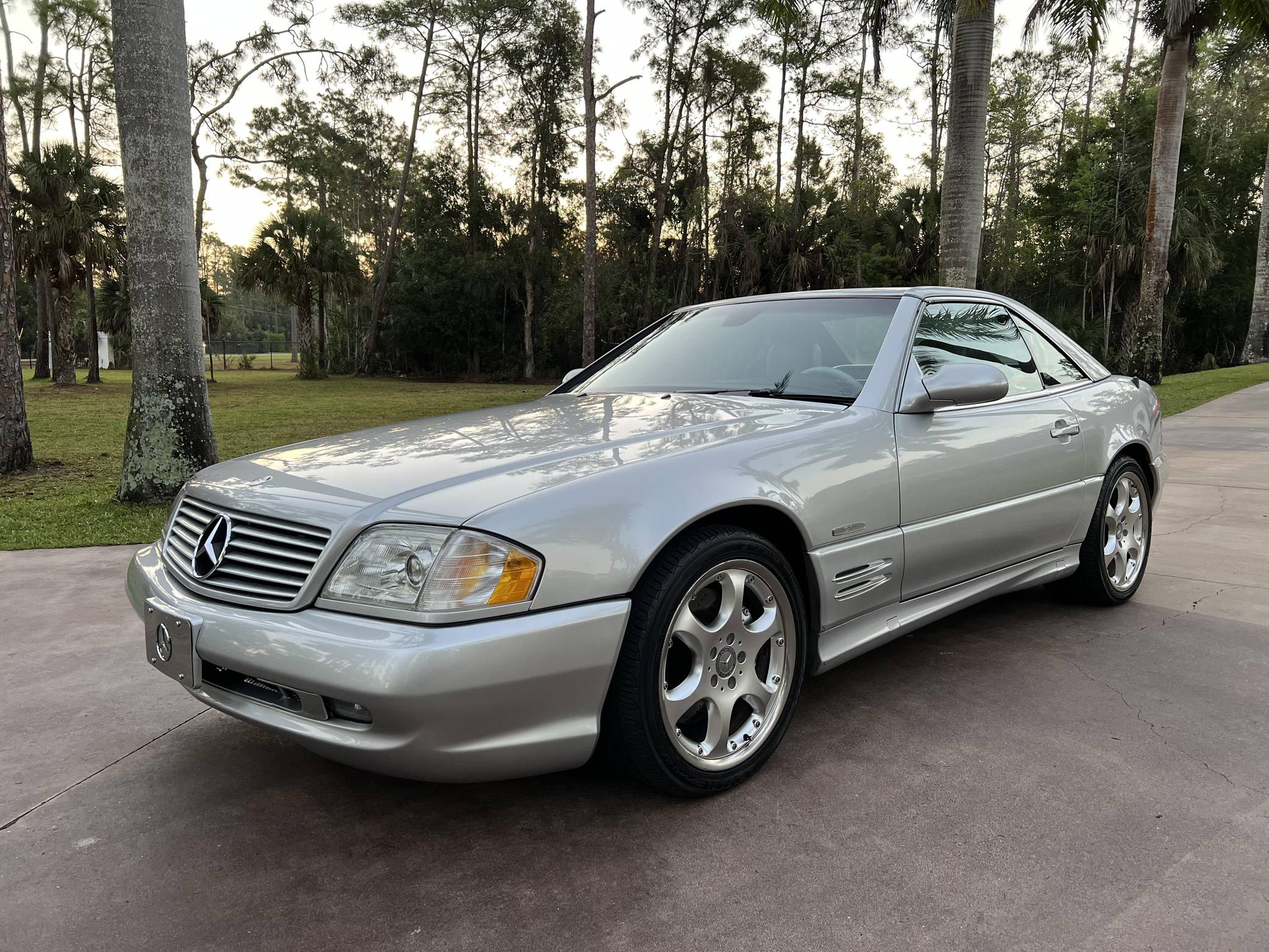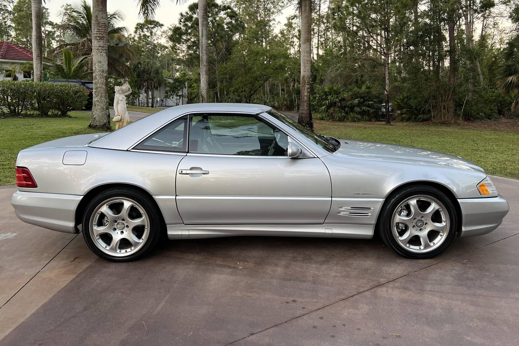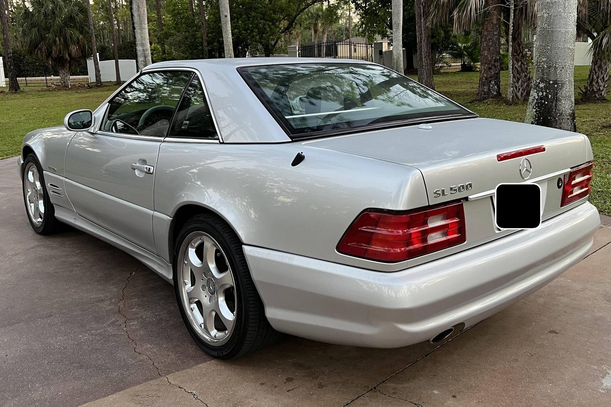 2002 Mercedes-Benz SL500, finished in Silver Arrow Metallic with a black soft top, a color-matched hardtop, and a black and grey interior. The odometer currently indicates approximately 68,100 miles. Factory equipment on this SL includes the AMG Styling Package, a power-retractable soft top, heated and power-adjustable front seats with memory function, a pop-up wind deflector, xenon headlights, cruise control, automatic climate control, and more as detailed below. The seller reports no modifications. Mercedes-Benz sold the "R129"-generation SL from 1990 to 2002. It was larger, quicker, and better-handling than its predecessor, the revered "R107" model. Several visual cues (like the shape of the vents behind the front wheels and the rear lights) identify this SL as one of the later models built, which boasted various upgrades to the model over its lifespan. The Silver Arrow Edition R129 was produced for the 2002 model year, and it was available on both the SL500 and SL600 models. Included in the special edition were various Silver Arrow interior and exterior badges, two-tone upholstery, the special Silver Arrow Metallic exterior color, and special dark wood trim, among other touches; 1,550 units were built for the U. S. market. Power comes from a 5. 0-liter V8, rated at 302 horsepower and 339 lb-ft of torque. Called "M113" internally, it turns the rear wheels via a 5-speed automatic transmission.