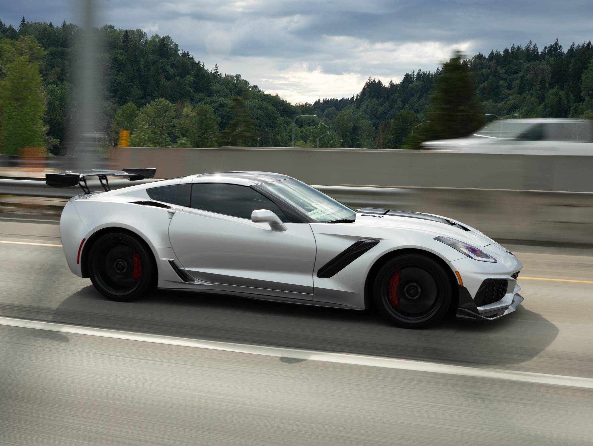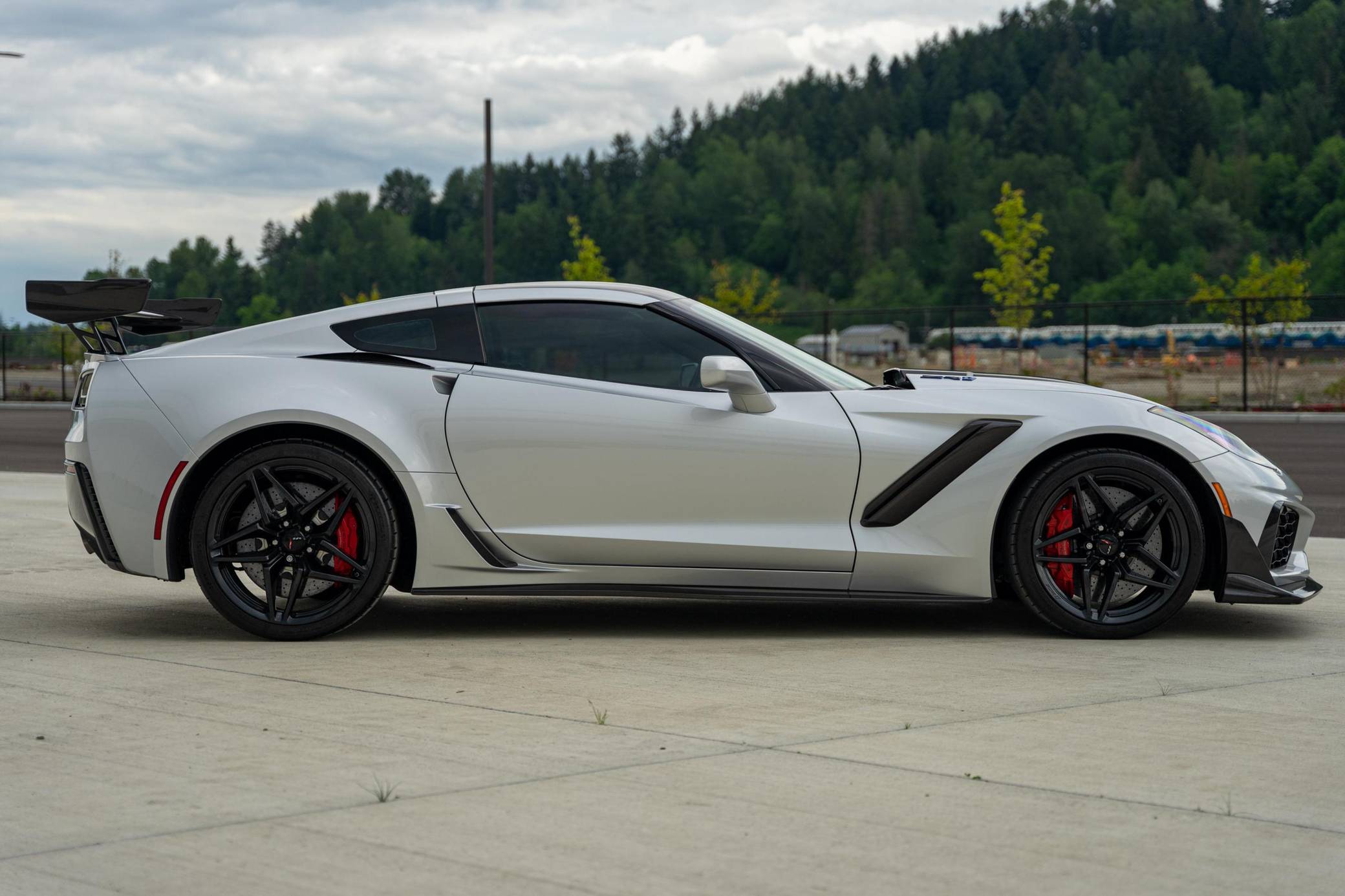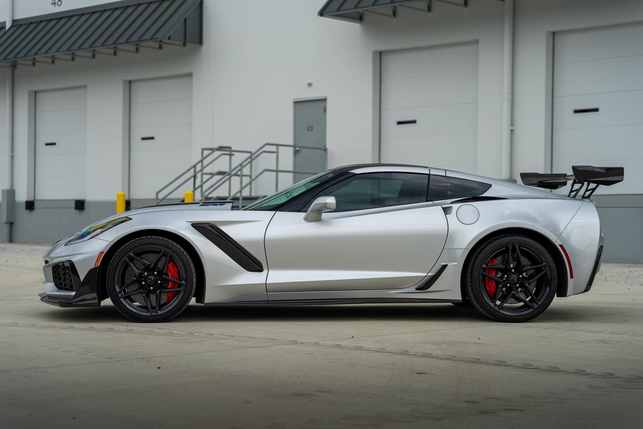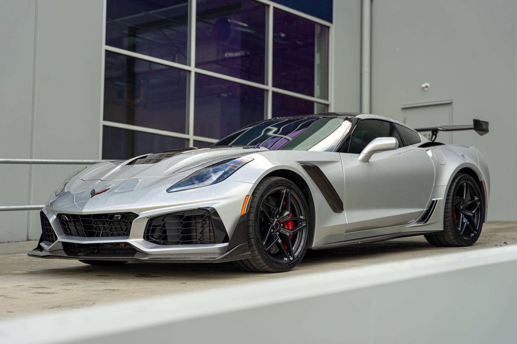 2019 Chevrolet Corvette ZR1 Coupe, finished in Blade Silver Metallic with a Jet Black interior. This ZR1 is equipped with a 7-speed manual transmission, and its odometer displays about 6,900 miles. Highly optioned, this ZR1 is equipped with the ZTK Performance and Carbon Fiber Dual Roof packages, 19-inch front and 20-inch rear wheels, a carbon ceramic high-performance braking system, a ZR1-specific body kit, carbon fiber interior trim, heated, ventilated, and power-adjustable seats, an 8-inch touchscreen for the infotainment system, a 10-speaker Bose Centerpoint surround sound system, and the Performance Data Recorder system, among other features. The seller reports no modifications. Chevrolet launched the seventh-generation Corvette (colloquially called "C7") for the 2014 model year. It offered a more user-friendly interior, a sharper-looking exterior design, and, significantly, the then-new "LT1" small-block V8. C7 production ended in 2019, and its replacement adopted a mid-mounted engine. Released for the 2019 model year, the ZR1 model pelted the Corvette nameplate into supercar territory with an Eaton supercharger, an aggressive aerodynamic package that generated 70% more downforce than the Z06's, and a race car-like suspension system. Chevrolet built 2,953 units of the ZR1, including 2,441 coupes, for the 2019 model year, according to the National Corvette Museum. Power comes from a 6. 2-liter supercharged V8, rated at 755 horsepower and 715 lb-ft of torque. Called "LT5" internally, it spins the rear wheels via a 7-speed manual transmission.