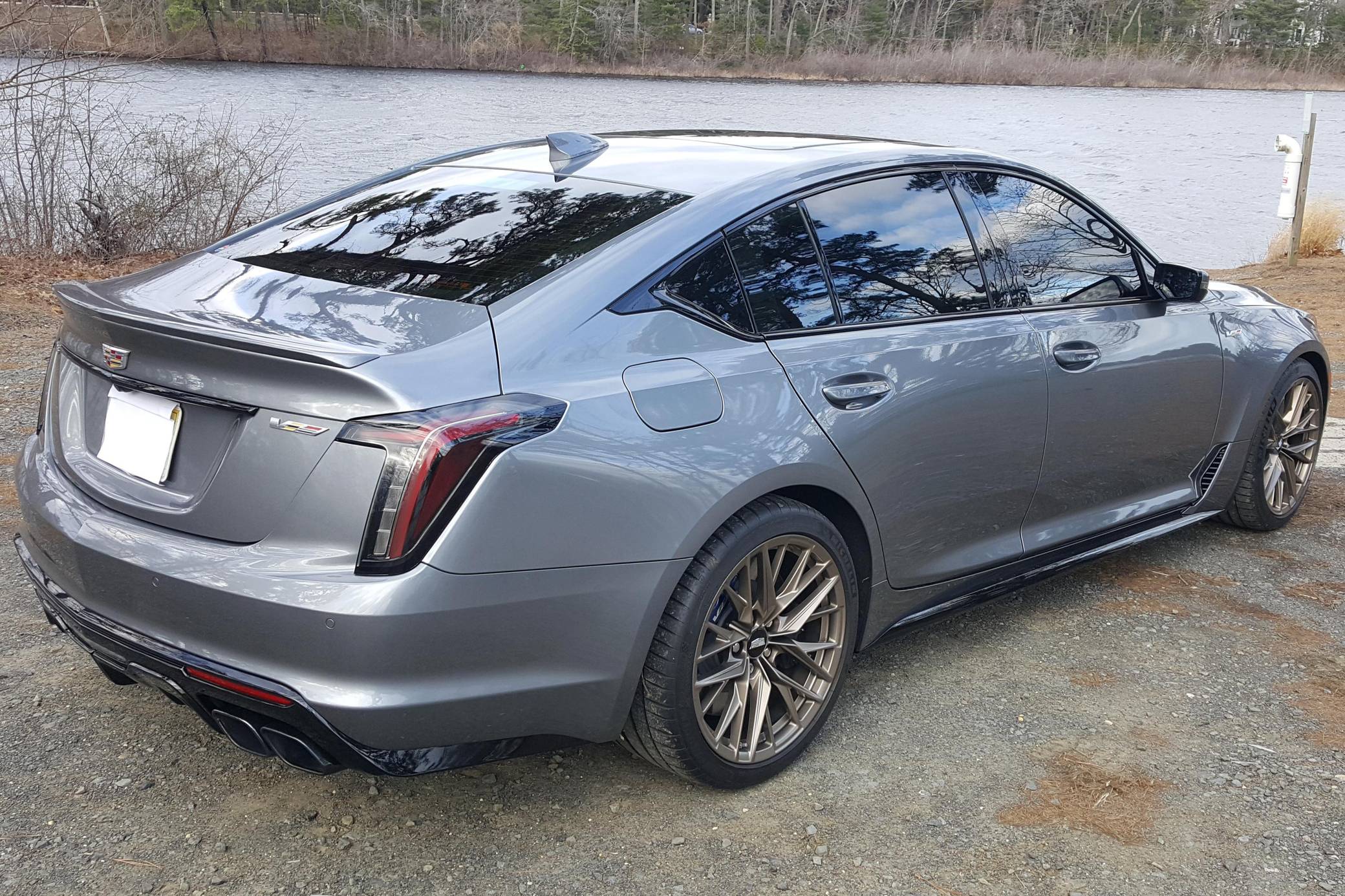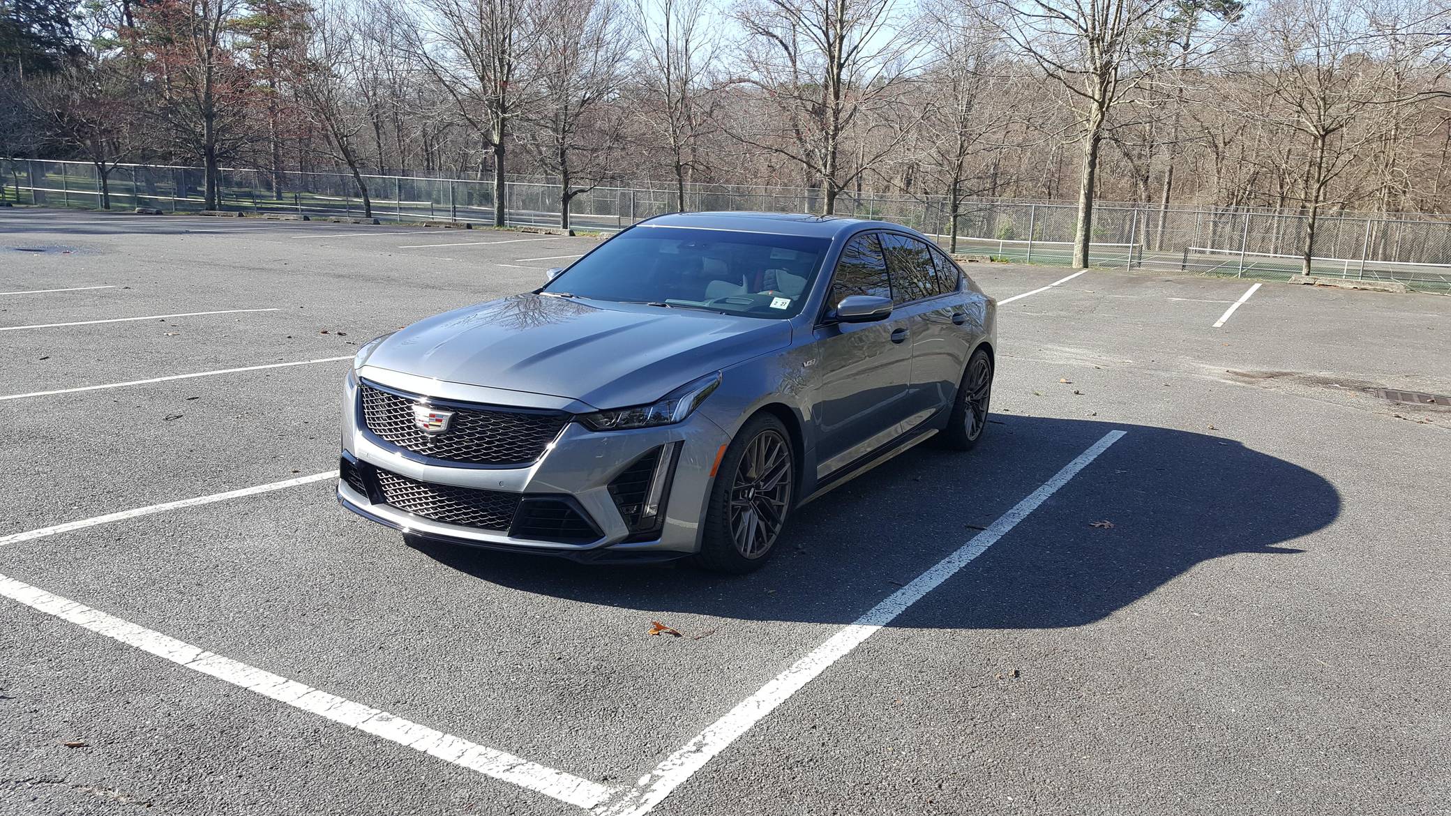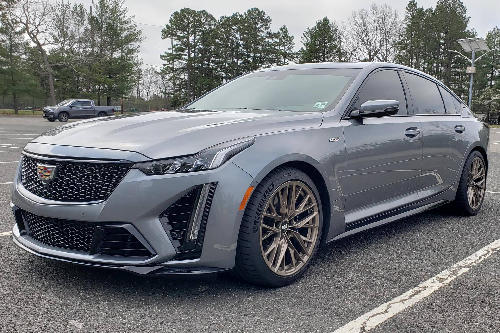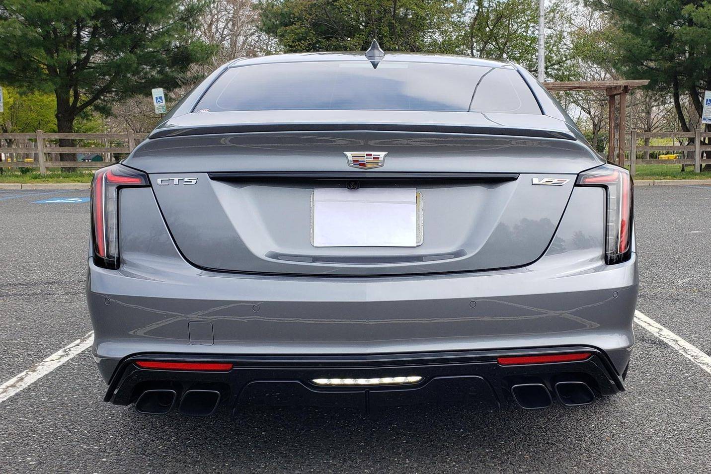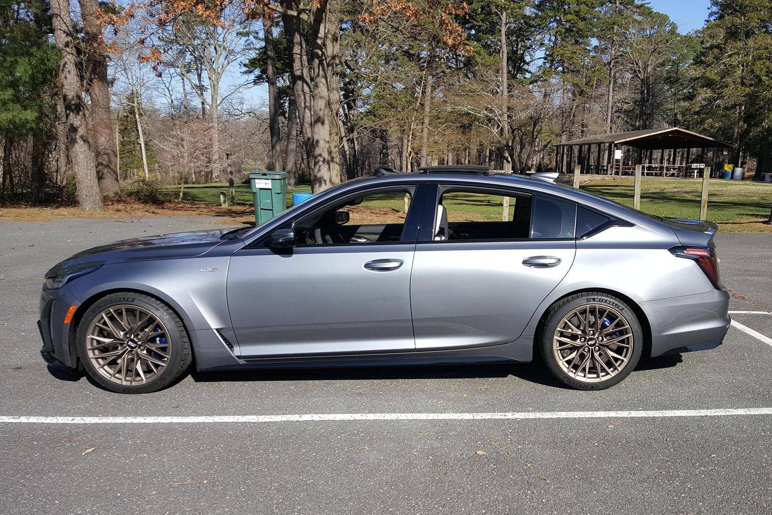 2022 Cadillac CT5-V Blackwing, finished in Satin Steel Metallic with a Sky Cool Gray interior. This Cadillac is equipped with a 6-speed manual transmission, and its odometer currently displays approximately 600 miles. Equipped with 19-inch alloy wheels, adaptive suspension with Magnetic Ride Control, an electronic limited-slip differential, Brembo brakes with blue calipers, an Ultraview sunroof, heated, ventilated, and massaging front seats, a heated steering wheel, a 10-inch infotainment system, and more as detailed below. The only modification reported by the seller is window tint. The Cadillac CT5-V Blackwing is the spiritual successor to the CTS-V, with a supercharged V8 shared with the Chevrolet Camaro ZL1 and the C7 Corvette Z06. As Cadillac prepares to go all-electric, the brand has announced that this car and the CT4-V Blackwing will be its final gas-powered V-Series models. Power comes from an "LT4" 6. 2-liter supercharged V8 engine, rated at 668 horsepower and 659 lb-ft of torque. Output is sent to the rear wheels through a 6-speed manual transmission and an electronic limited-slip differential.