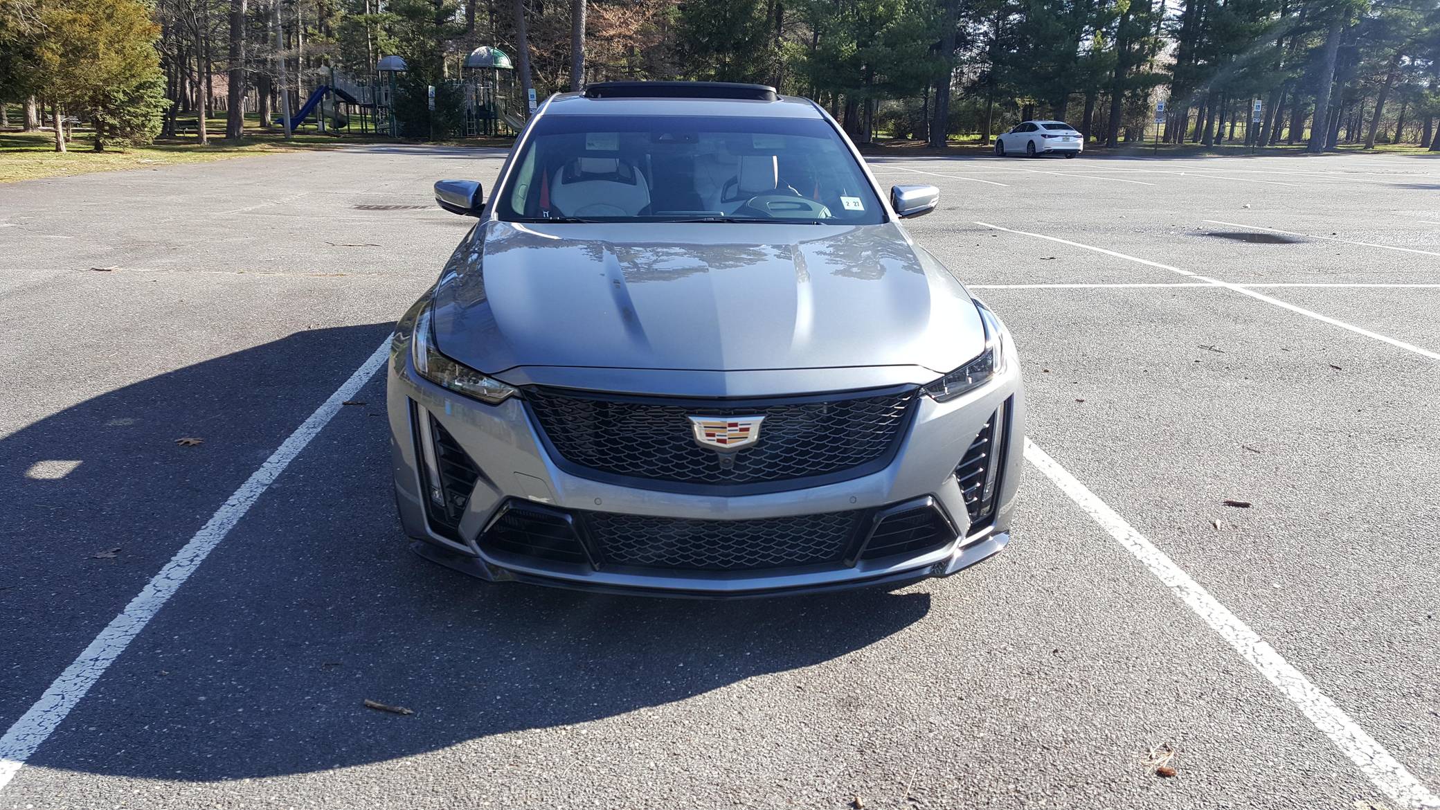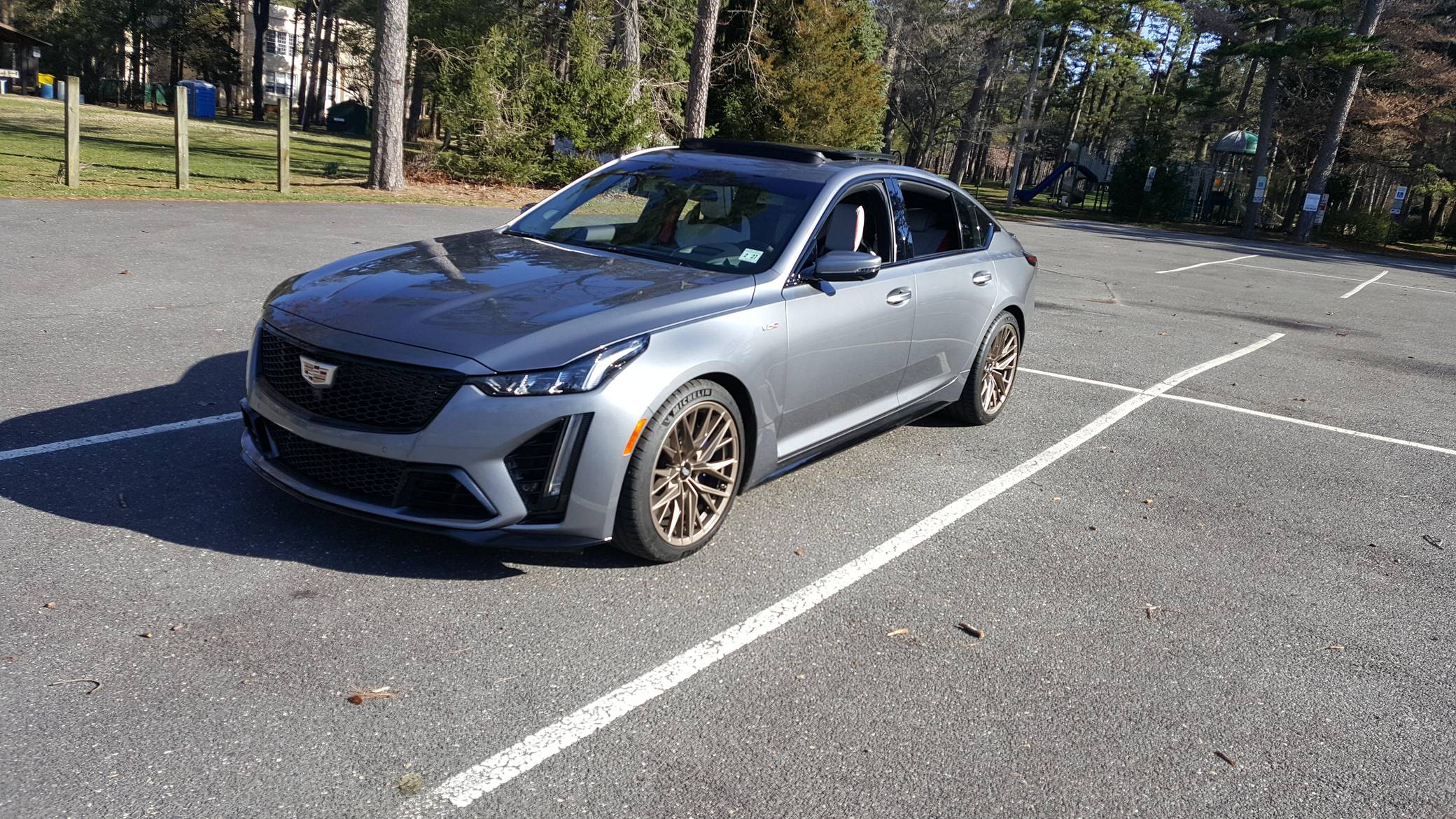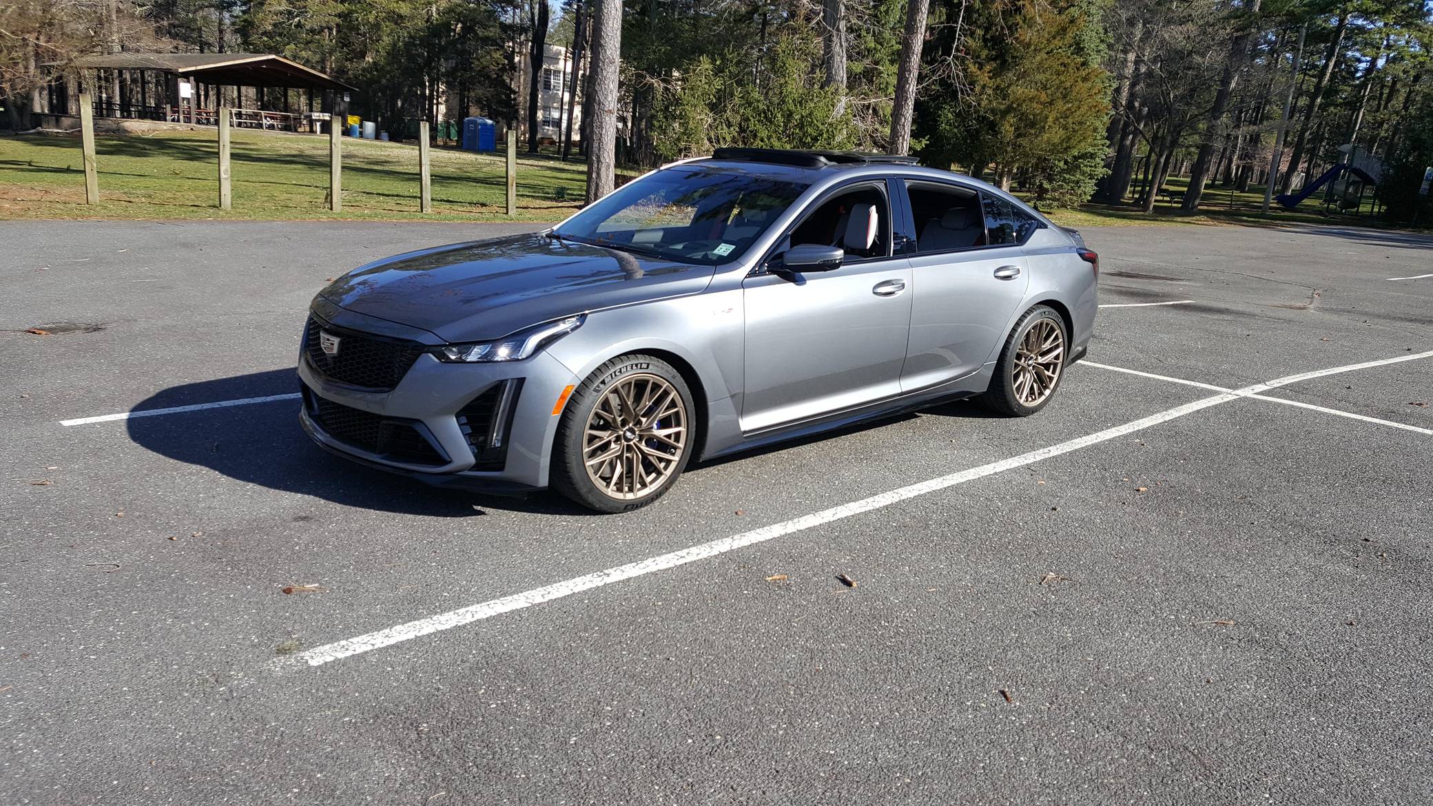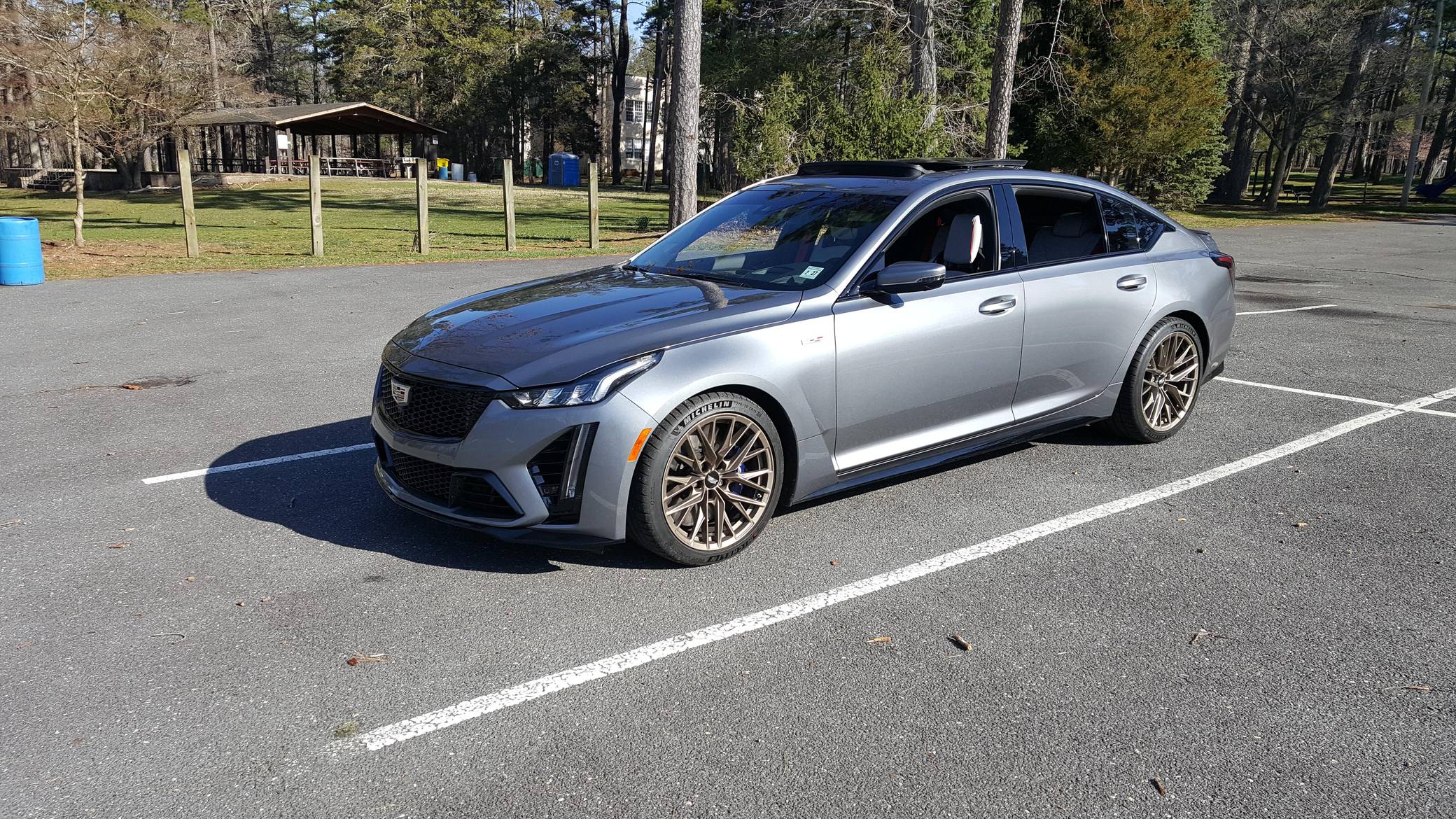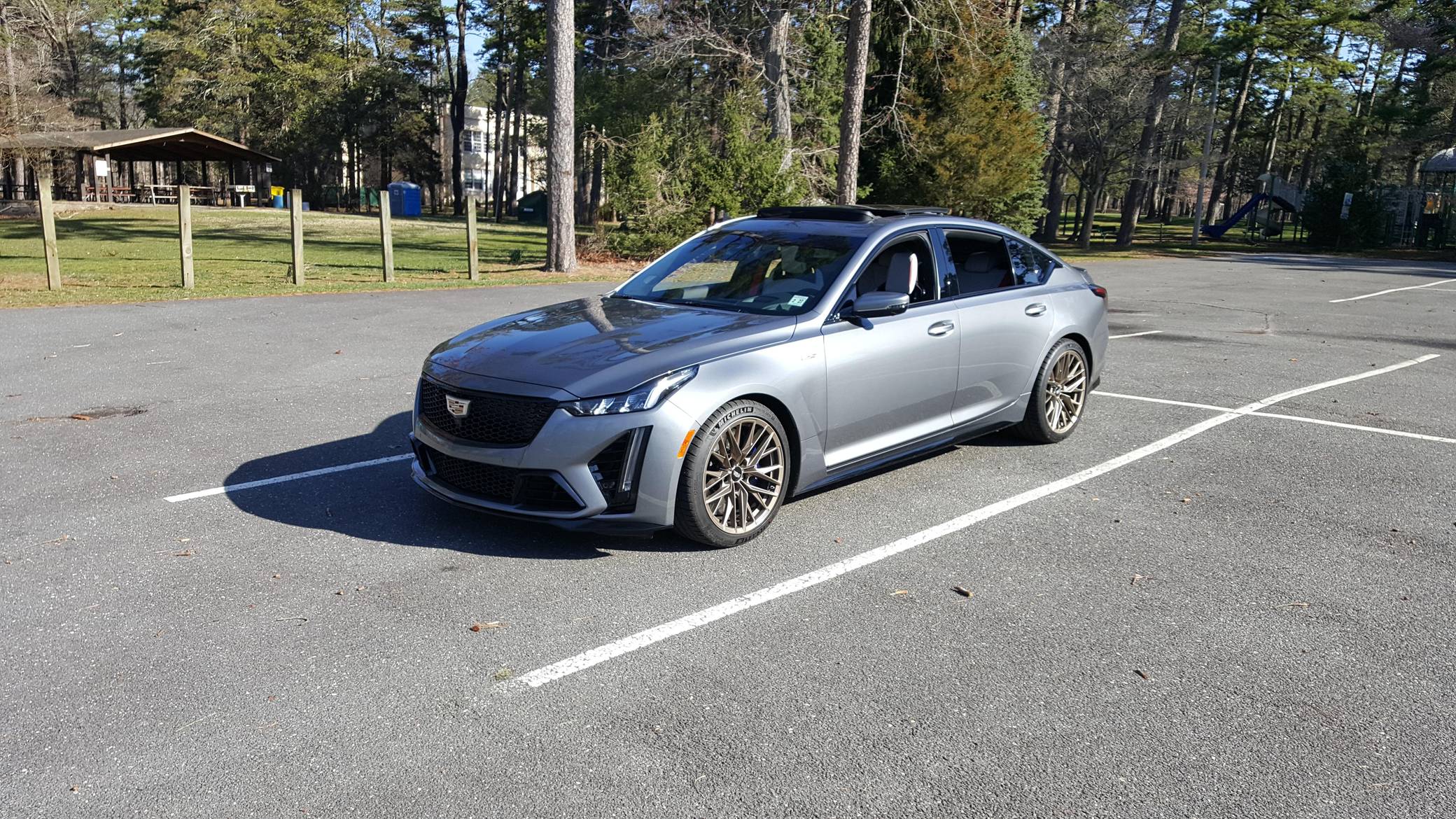 2022 Cadillac CT5-V Blackwing, finished in Satin Steel Metallic with a Sky Cool Gray interior. This Cadillac is equipped with a 6-speed manual transmission, and its odometer currently displays approximately 600 miles. Equipped with 19-inch alloy wheels, adaptive suspension with Magnetic Ride Control, an electronic limited-slip differential, Brembo brakes with blue calipers, an Ultraview sunroof, heated, ventilated, and massaging front seats, a heated steering wheel, a 10-inch infotainment system, and more as detailed below. The only modification reported by the seller is window tint. The Cadillac CT5-V Blackwing is the spiritual successor to the CTS-V, with a supercharged V8 shared with the Chevrolet Camaro ZL1 and the C7 Corvette Z06. As Cadillac prepares to go all-electric, the brand has announced that this car and the CT4-V Blackwing will be its final gas-powered V-Series models. Power comes from an "LT4" 6. 2-liter supercharged V8 engine, rated at 668 horsepower and 659 lb-ft of torque. Output is sent to the rear wheels through a 6-speed manual transmission and an electronic limited-slip differential.