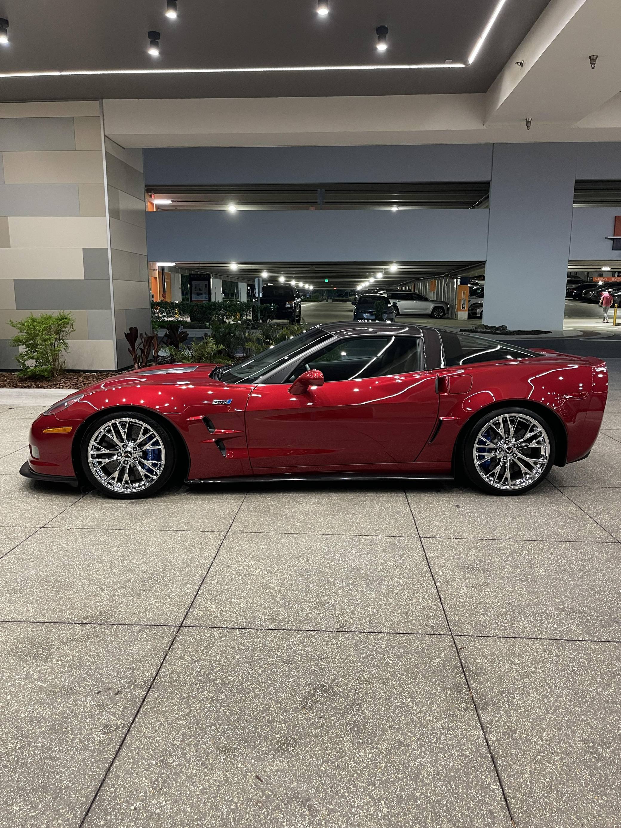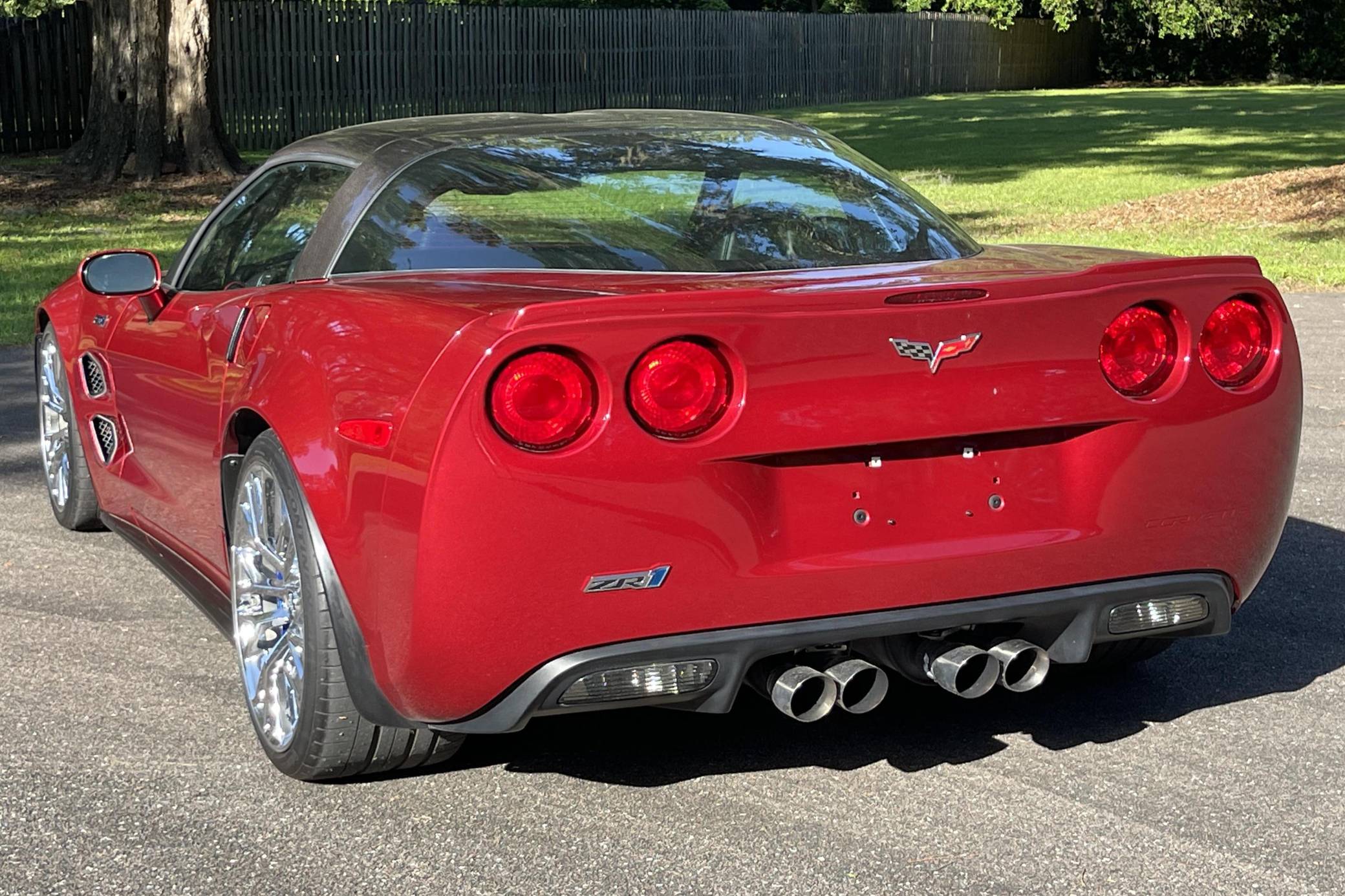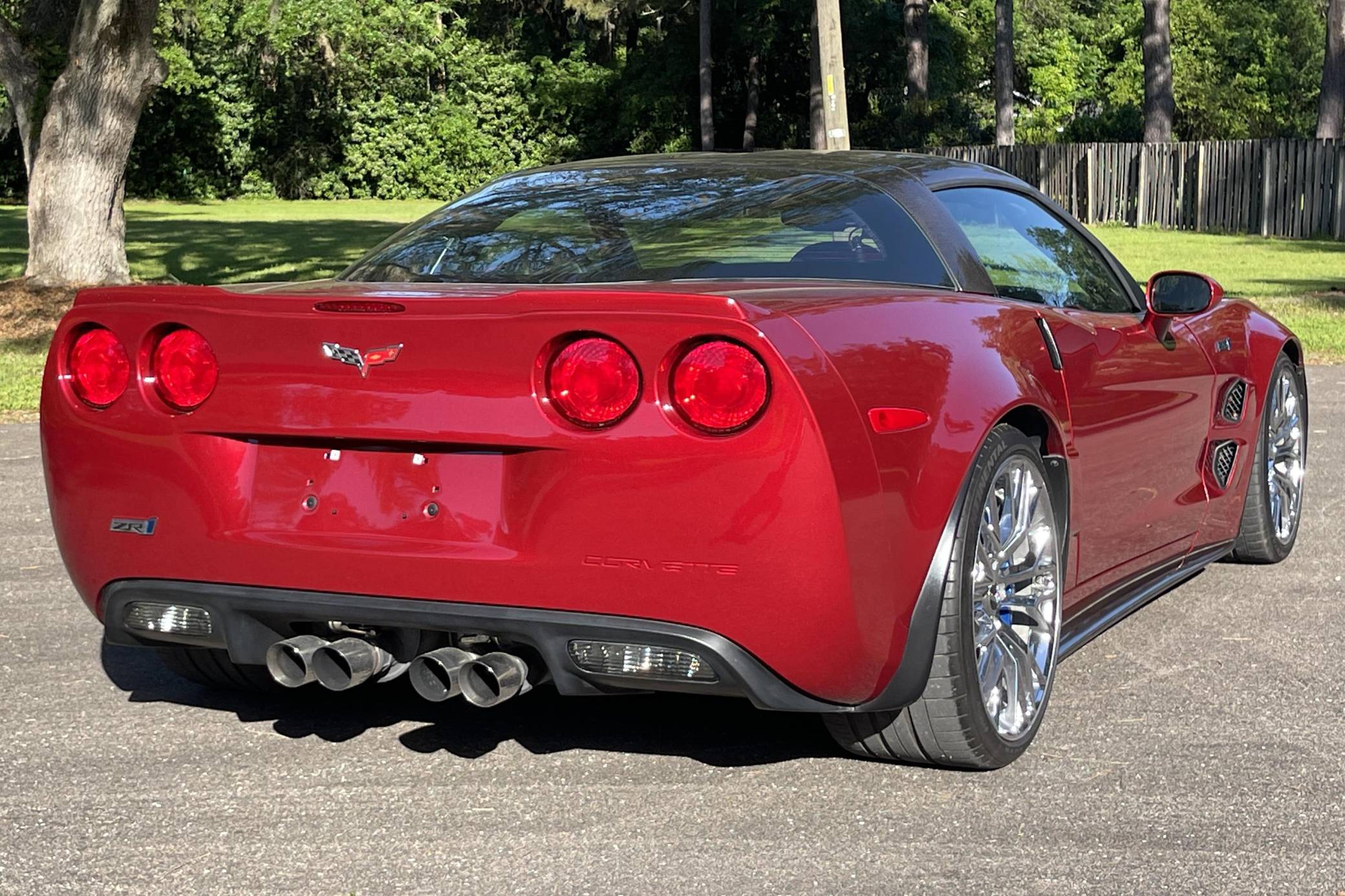 2010 Chevrolet Corvette ZR1, finished in Crystal Red Tintcoat with an Ebony interior. This coupe's odometer displays about 14,600 miles. Factory equipment includes the 3ZR Premium Equipment Group, the Magnetic Selective Ride Control suspension system, carbon fiber interior trim, and a head-up display. The only modification reported by the seller is a set of 19-inch front and 20-inch rear wheels from a C7-generation Corvette Z06. After years of rumors and speculation, Chevrolet dusted off the storied ZR1 nameplate and put it on a track-ready evolution of the sixth-generation Corvette. Carbon fiber components (like the fenders and the roof panel) kept weight in check, while a polycarbonate window in the hood let enthusiasts see the supercharged V8 in the engine bay. Several suspension modifications further set the ZR1 apart from other variants of the "C6" Corvette. Launched for 2009, the ZR1 was presented as the fastest and most powerful series-produced car ever released by General Motors. Production ended in 2013. Power comes from a 6. 2-liter supercharged V8, rated at 638 horsepower and 604 lb-ft of torque. Called “LS9” internally, it spins the rear wheels via a 6-speed manual transmission.