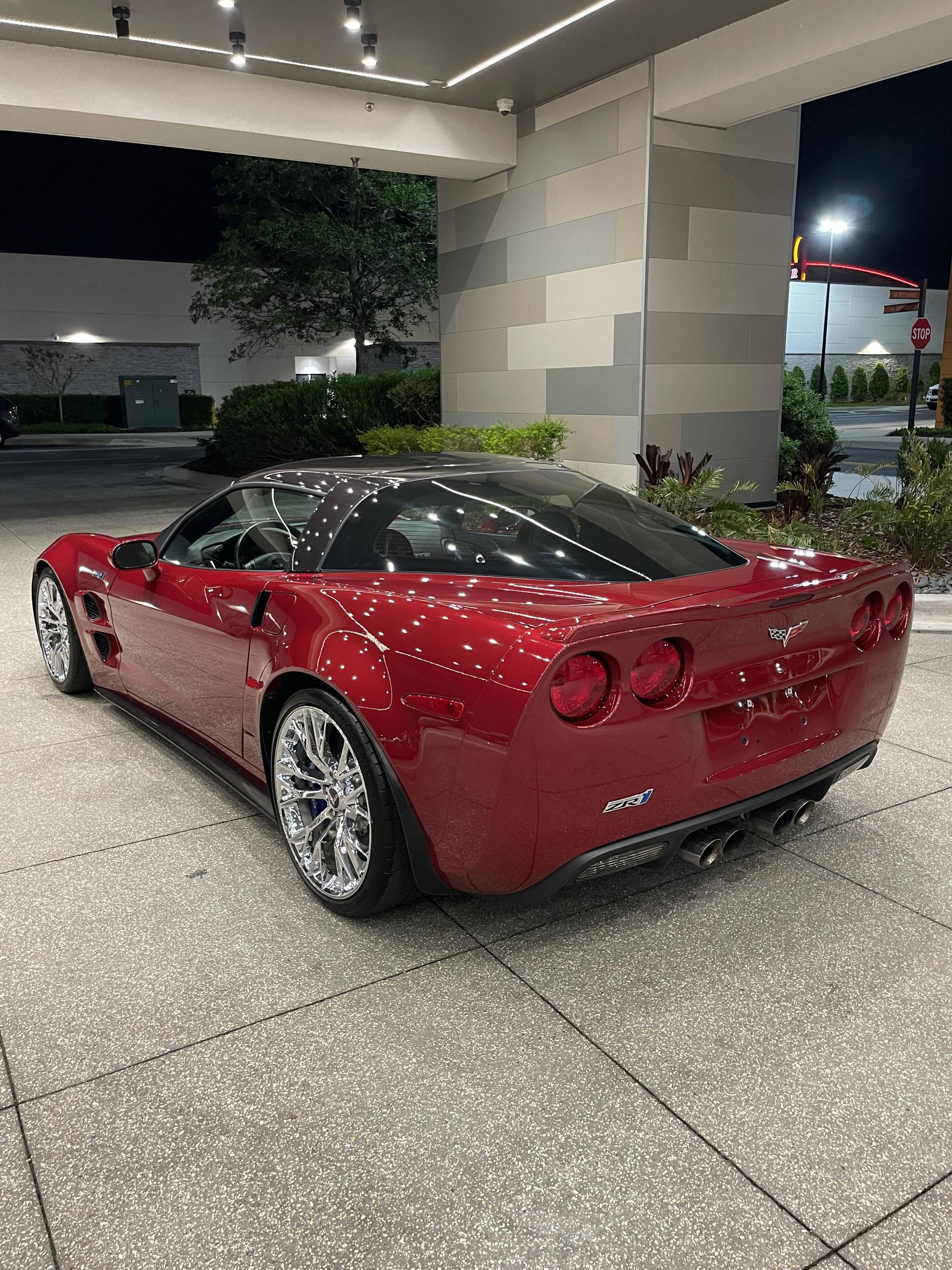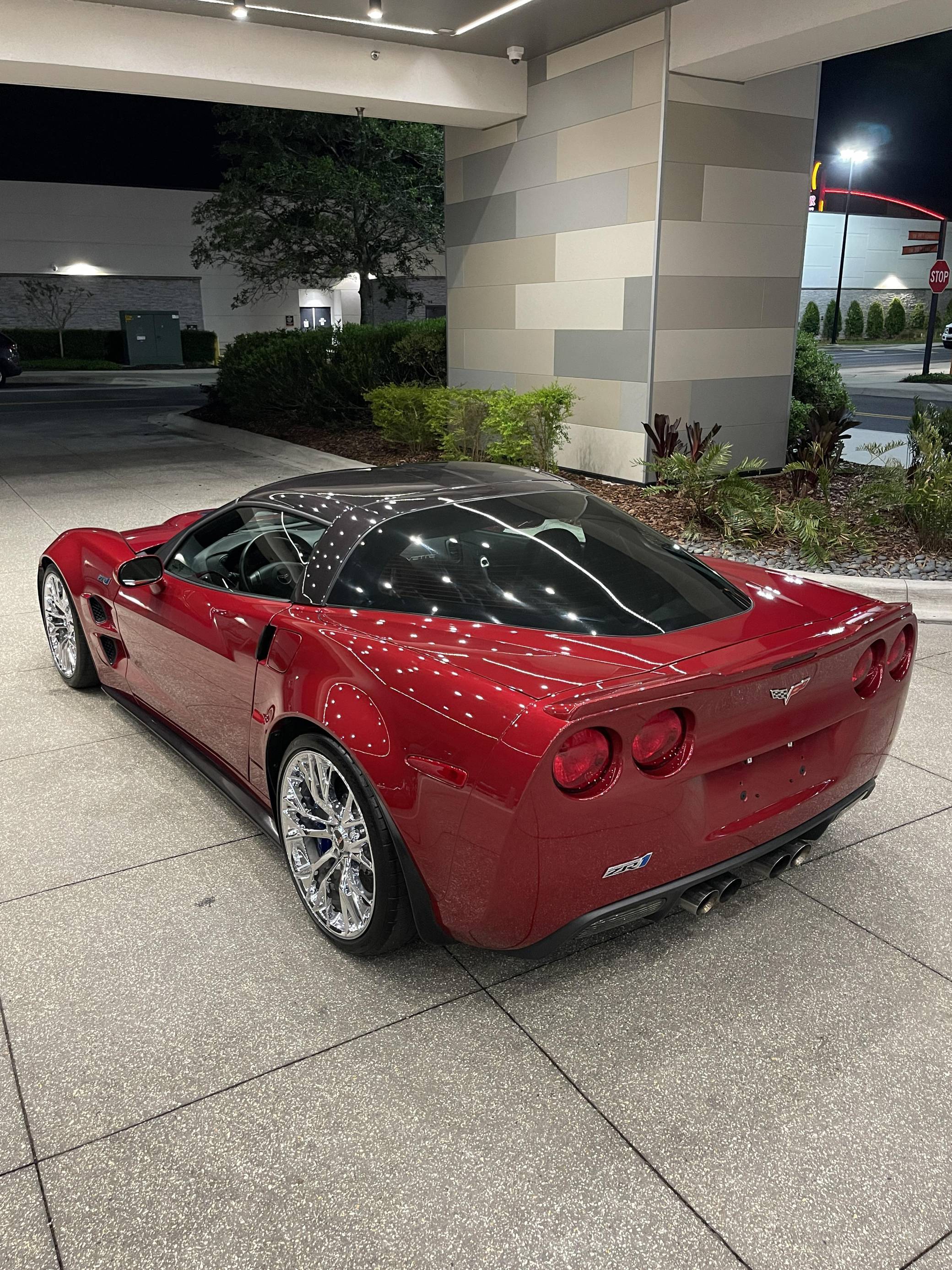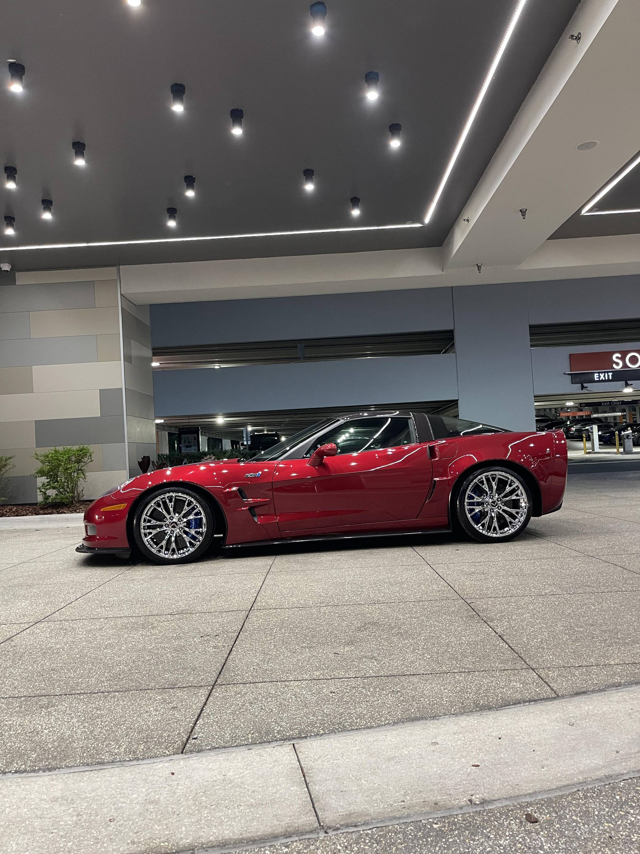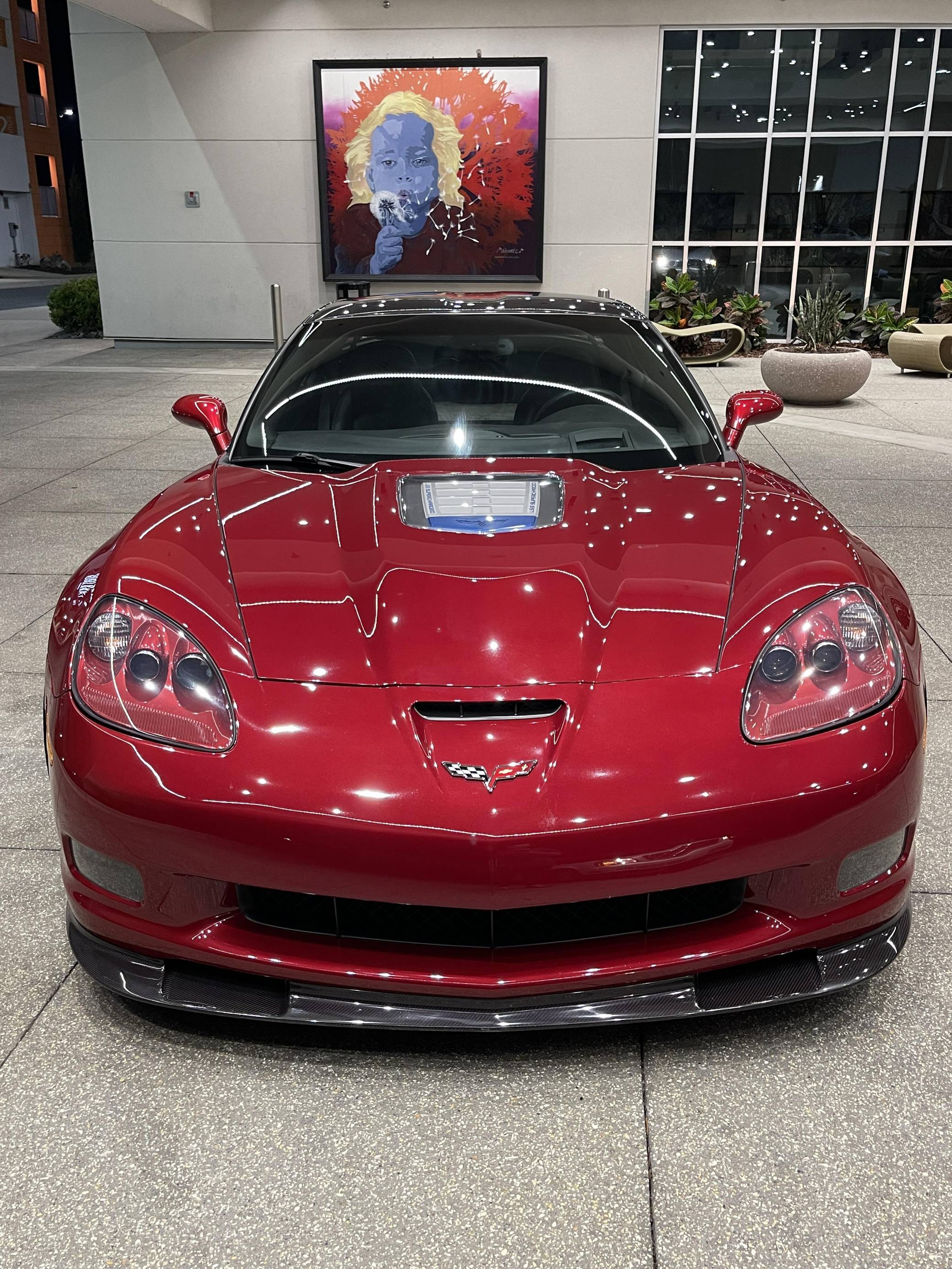 2010 Chevrolet Corvette ZR1, finished in Crystal Red Tintcoat with an Ebony interior. This coupe's odometer displays about 14,600 miles. Factory equipment includes the 3ZR Premium Equipment Group, the Magnetic Selective Ride Control suspension system, carbon fiber interior trim, and a head-up display. The only modification reported by the seller is a set of 19-inch front and 20-inch rear wheels from a C7-generation Corvette Z06. After years of rumors and speculation, Chevrolet dusted off the storied ZR1 nameplate and put it on a track-ready evolution of the sixth-generation Corvette. Carbon fiber components (like the fenders and the roof panel) kept weight in check, while a polycarbonate window in the hood let enthusiasts see the supercharged V8 in the engine bay. Several suspension modifications further set the ZR1 apart from other variants of the "C6" Corvette. Launched for 2009, the ZR1 was presented as the fastest and most powerful series-produced car ever released by General Motors. Production ended in 2013. Power comes from a 6. 2-liter supercharged V8, rated at 638 horsepower and 604 lb-ft of torque. Called “LS9” internally, it spins the rear wheels via a 6-speed manual transmission.