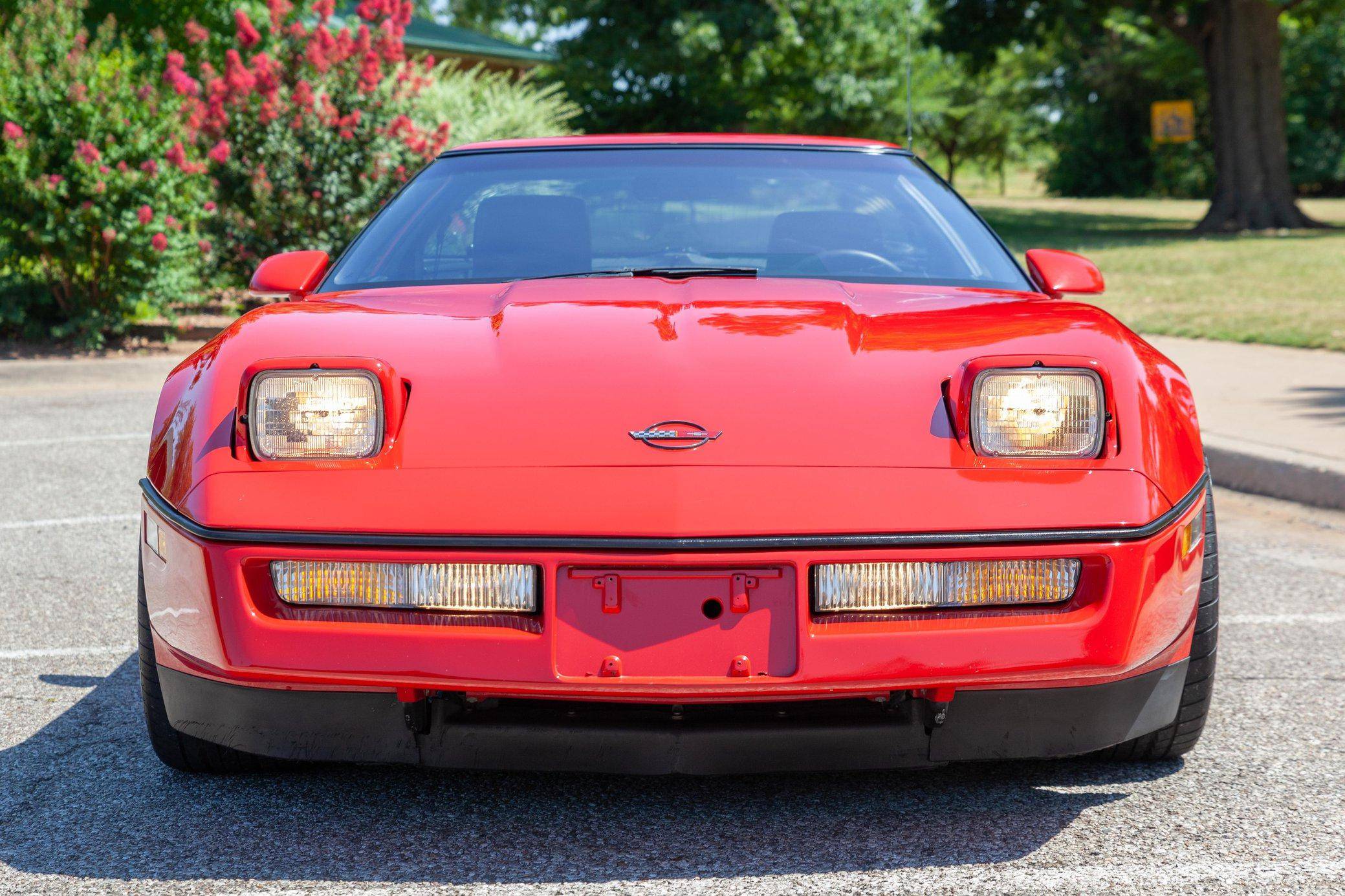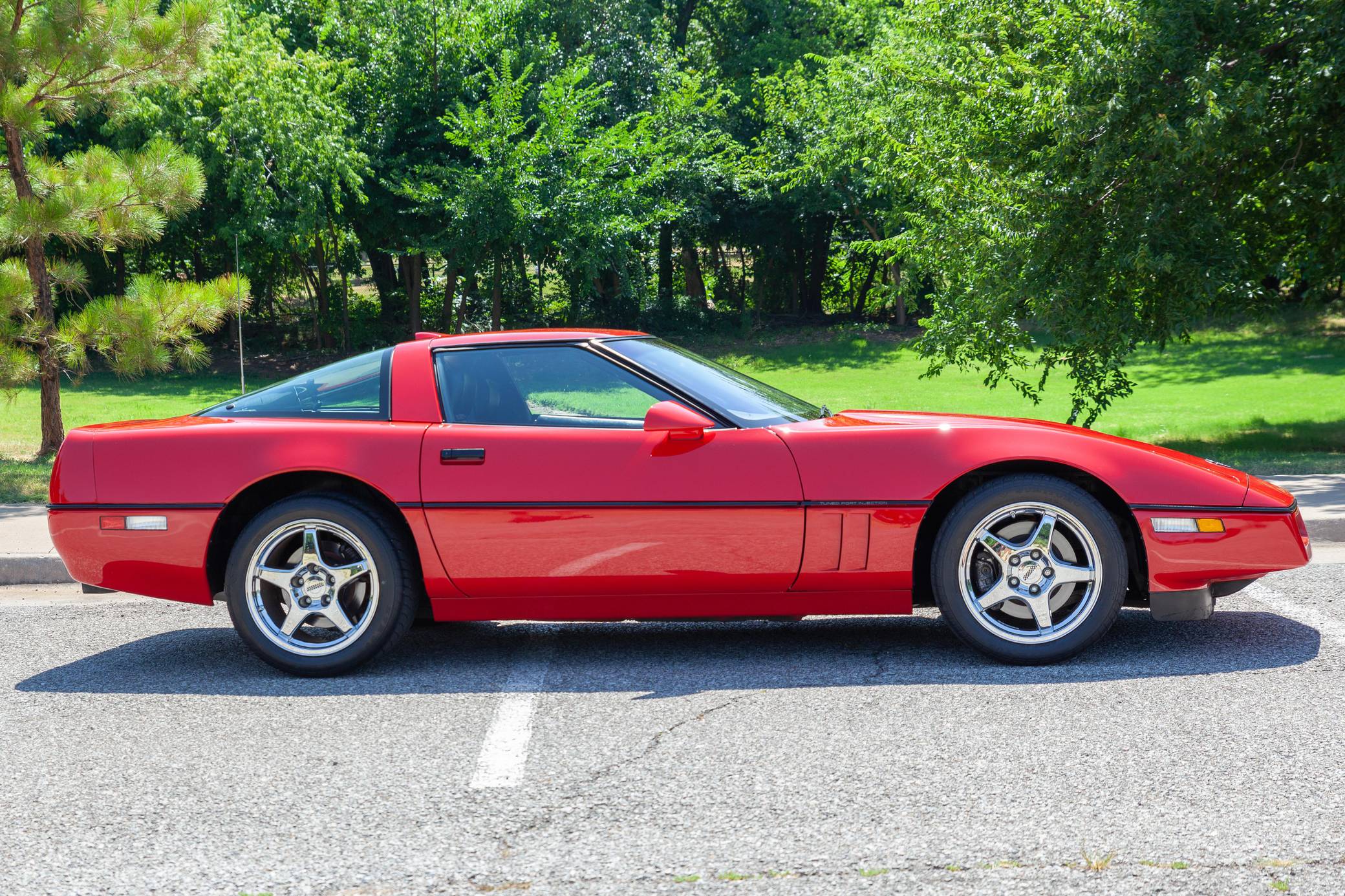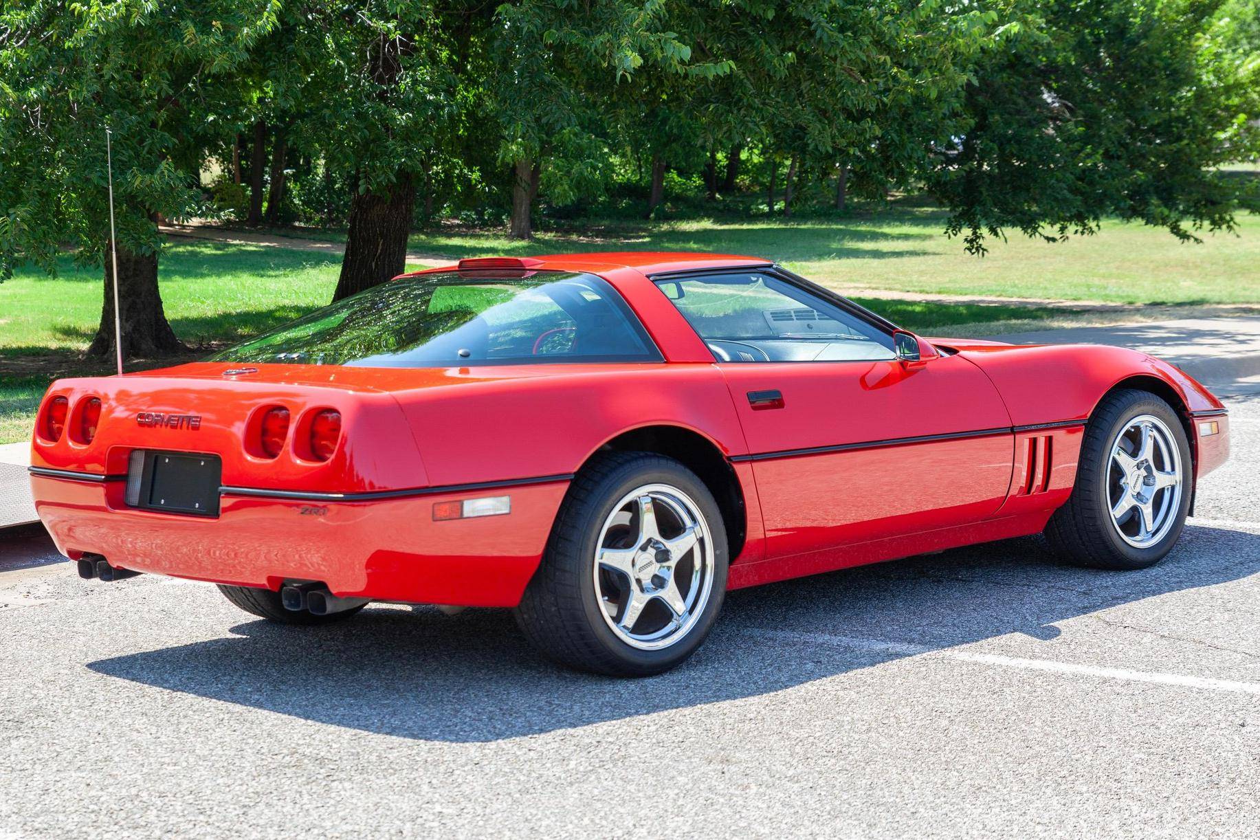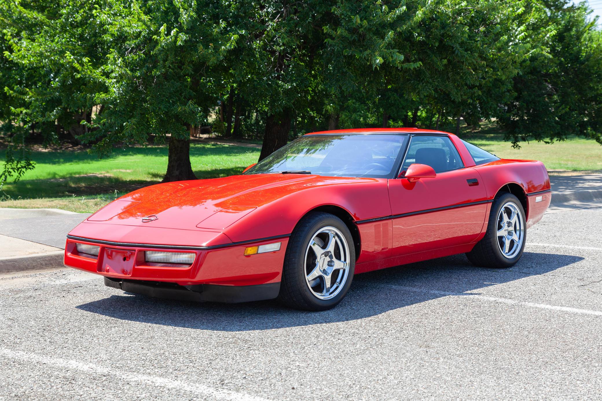 1990 Chevrolet Corvette ZR-1, finished in Torch Red with a black interior. This ZR-1 is equipped with a 6-speed manual transmission, and its odometer currently indicates approximately 12,200 miles. Equipment includes Selective Ride Control suspension system, a limited-slip differential, a ZR-1-specific body kit, pop-up headlights, glass and body-colored removable roof panels, leather upholstery, automatic climate control, and a Delco/Bose sound system. Modifications reported by the seller are limited to a set of 17-inch C4 Grand Sport wheels, a stitched leather steering wheel cover, and an R-134a A/C system conversion. The original Corvette ZR-1 based on the C4 was codenamed "King of the Hill" while it was in development. Developed with Lotus under GM's ownership, the ZR-1 was positioned to compete with more expensive supercars from the likes of Ferrari and Lamborghini. It was a successful experiment with unanimous praise from the automotive press of the period as one of the best American sports cars to date. Power comes from an "LT5" 5. 7-liter twin-cam V8, rated at 380 horsepower and 370 lb-ft of torque. Output is directed to the rear wheels through a 6-speed manual transmission.
