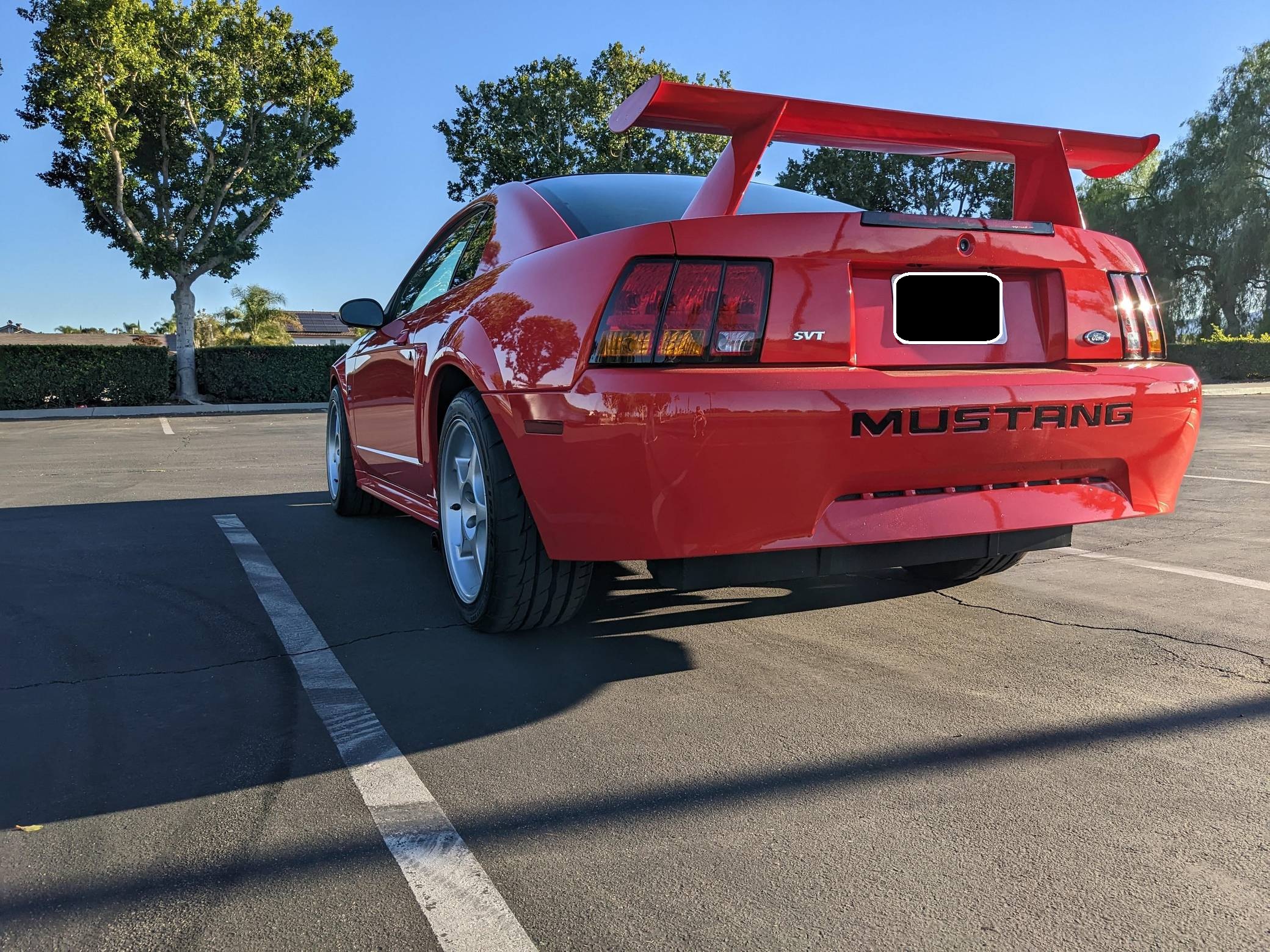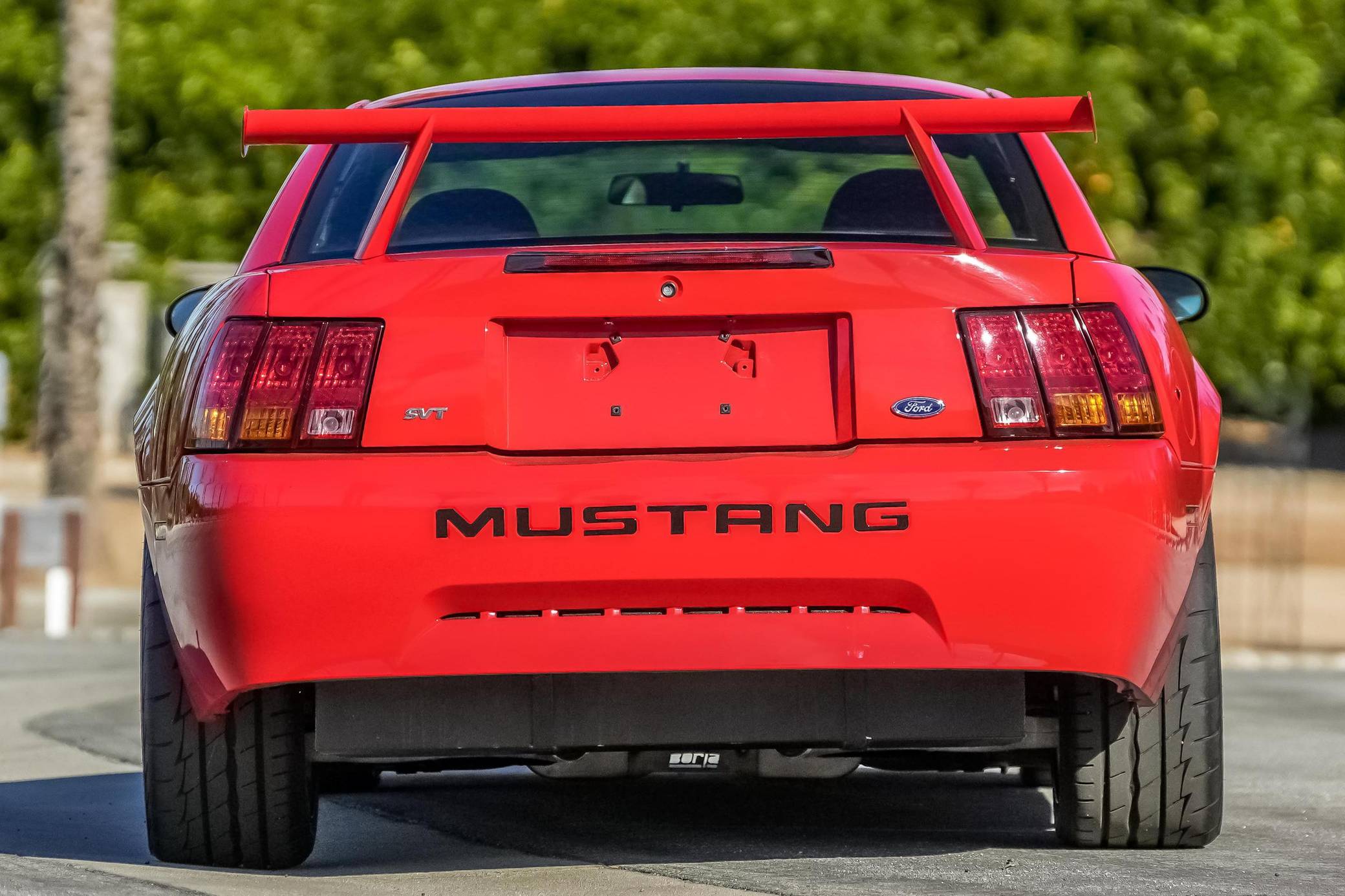 THIS… is a 2000 Ford Mustang SVT Cobra R, finished in Performance Red Clearcoat with a Dark Charcoal interior. This Mustang is #268 out of 300 SVT Cobra R models produced, and the odometer currently displays approximately 32,100 miles. Factory equipment includes an exclusive “Power Dome” hood, Eibach springs, Bilstein dampers, Brembo brakes, a Borla side-exit exhaust, 18-inch wheels, Recaro bucket seats, and more as detailed below. Modifications reported by the seller are limited to a Pioneer head unit, JBL speakers, a US Acoustics amplifier, and Simpson Racing harnesses. Introduced for 1994, the "SN95" generation of the Mustang replaced the long-running Fox-based model with a more modern design that incorporated a handful of styling cues borrowed from the original car. It offered enthusiasts better handling, a revised interior, plus a range of V6 and V8 engines. 1999 brought a comprehensive redesign nicknamed "New Edge" by enthusiasts, and production ended in 2004. Highly regarded as one of the most desirable Mustang models in Ford's history, the third-generation Cobra R offers an aggressive track-focused character thanks to a long list of hardcore upgrades. The highlight of course was ditching the then-trademark live rear axle for an independent setup, but things like a towering rear wing, a stripped interior, a hand-built naturally aspirated V8 with cool side-exit exhausts, and the incredibly limited production run further helped the Cobra R in becoming an icon. Power comes from a 5. 4-liter V8, rated at 385 horsepower and 385 lb-ft of torque. Output is sent to the rear wheels via a Tremec 6-speed manual transmission.