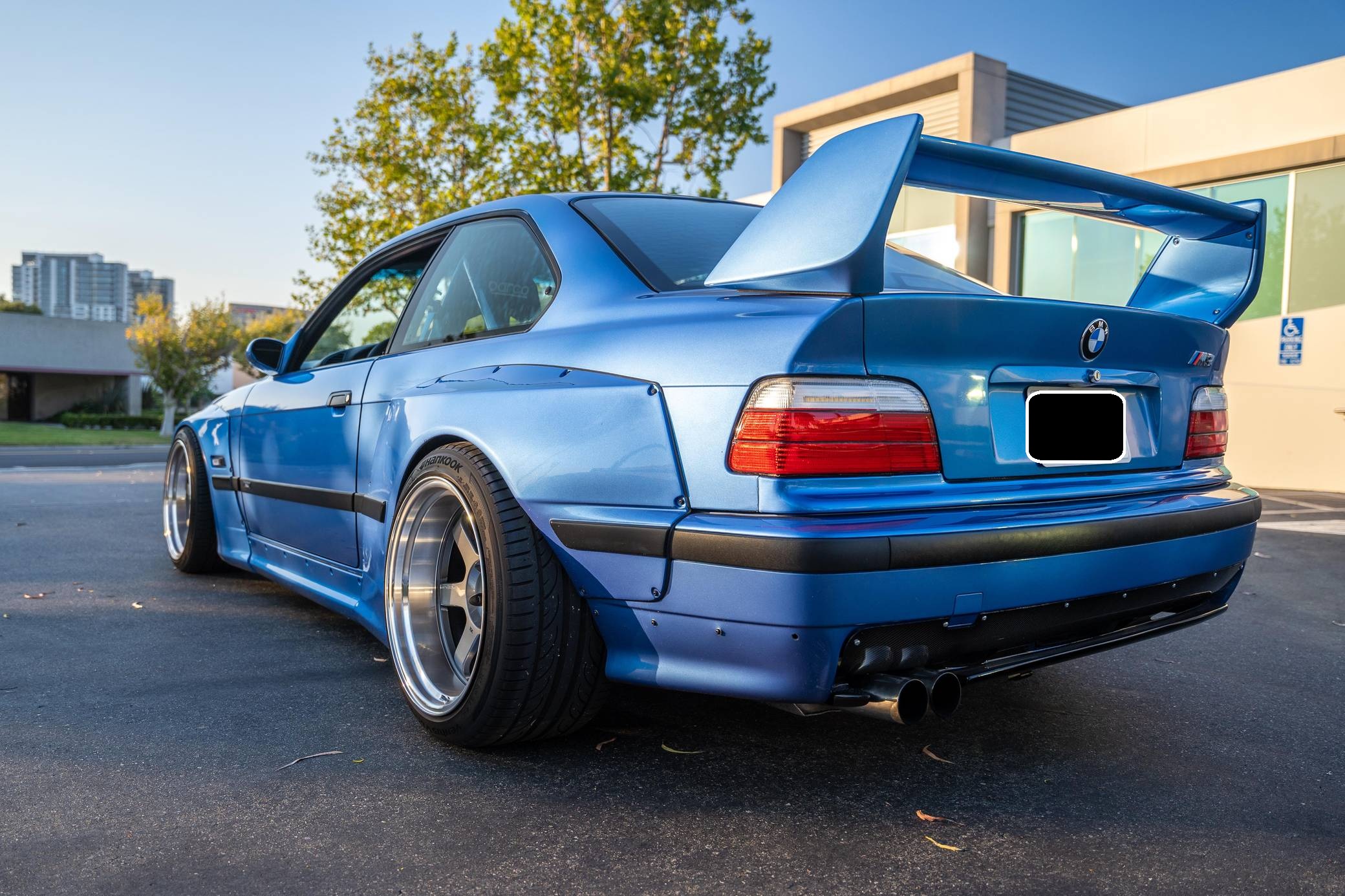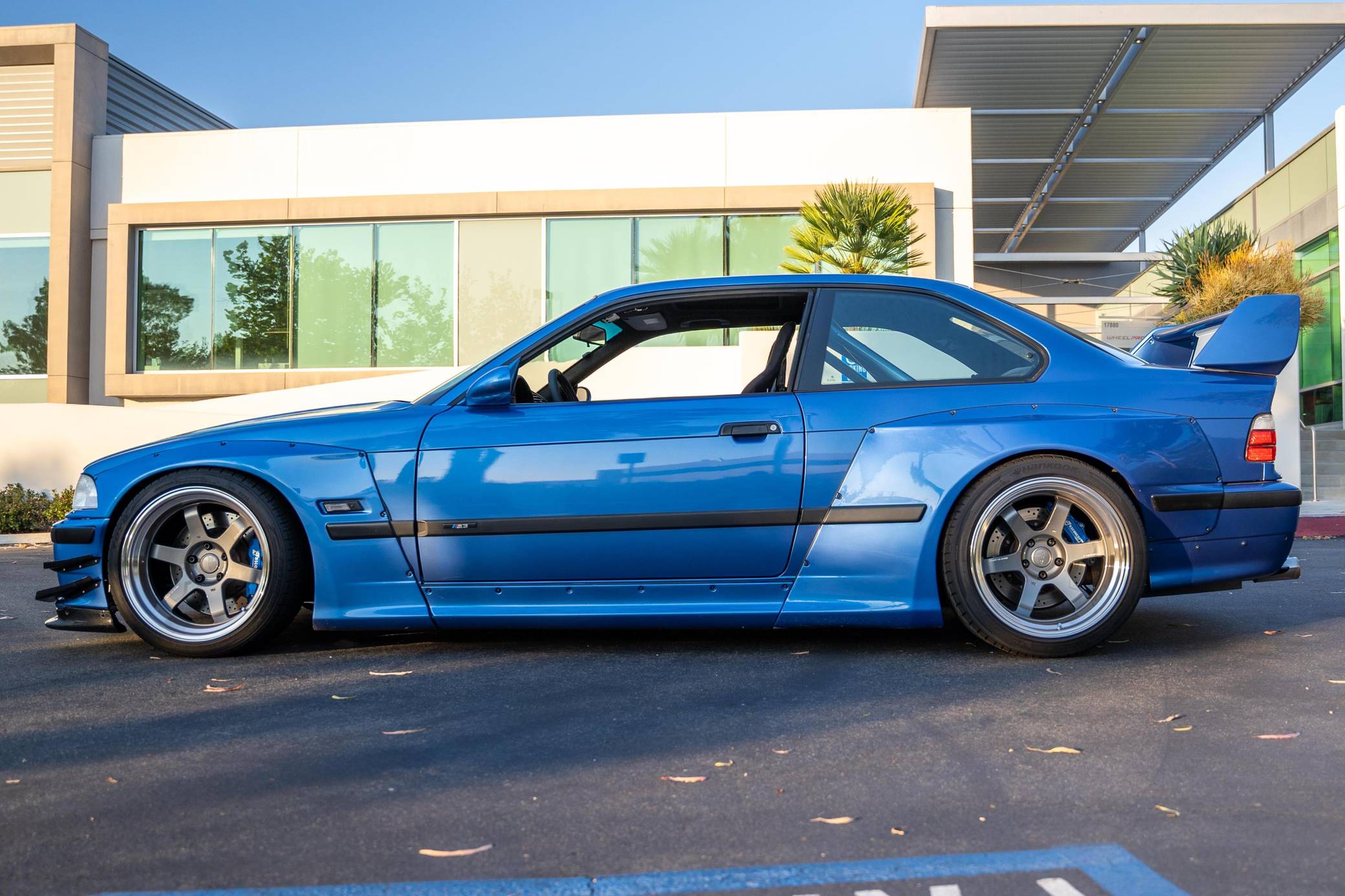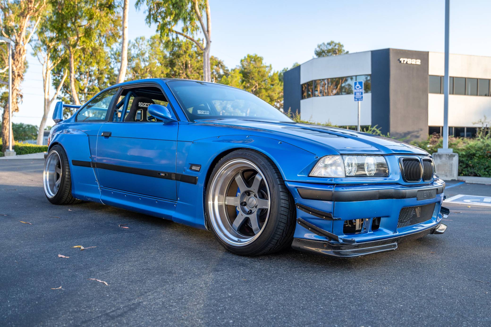 1997 BMW M3, finished in Estoril Blue Metallic with a black interior. This coupe is equipped with the desirable 5-speed manual transmission. Reportedly built for the 2016 SEMA show, this M3 is fitted with a VF Engineering supercharger kit, an Active Autowerke exhaust system after the catalytic converters, 18-inch Volk Racing TE37 wheels, an Air Lift Company 3P air suspension system, a Pandem USA wide-body kit, several DTM Fiberwerkz parts, and Sparco EVO QRT large racing front seats, among other aftermarket parts. More details about the modifications performed to this M3 are provided below, and some of the removed factory parts are shown in the gallery and included in the sale. BMW introduced the E36-generation M3 to the U. S. market as a coupe for the 1995 model year, and it expanded the range with a sedan and a convertible in 1997 and 1998, respectively. The second-generation M3 was bigger than its predecessor, the E30-based model, but it offered 6-cylinder power while retaining the engaging handling synonymous with the M3 nameplate. Power comes from a 3. 2-liter supercharged straight-6, rated at 240 horsepower and 236 lb-ft of torque when left stock. VF Engineering states that the modifications increase horsepower to about 330 at the wheels but a dyno sheet is not available. Called "S52" internally, the engine spins the rear wheels via a 5-speed manual transmission and a limited-slip differential.
