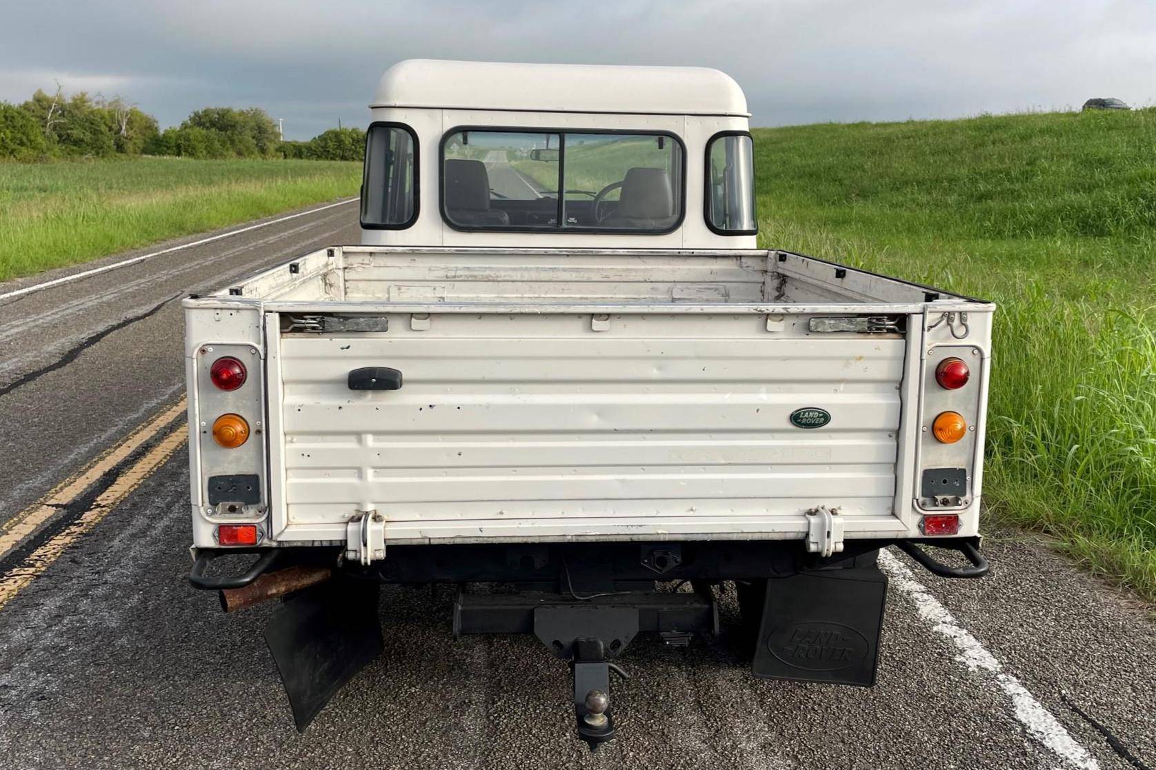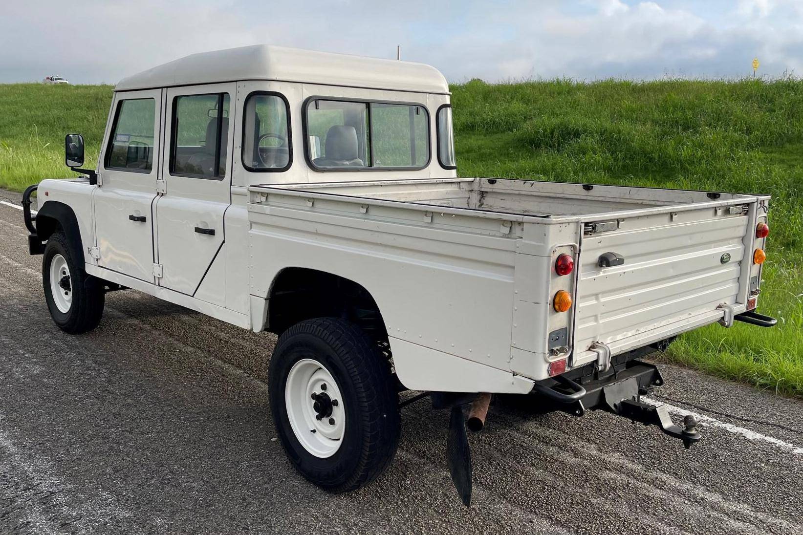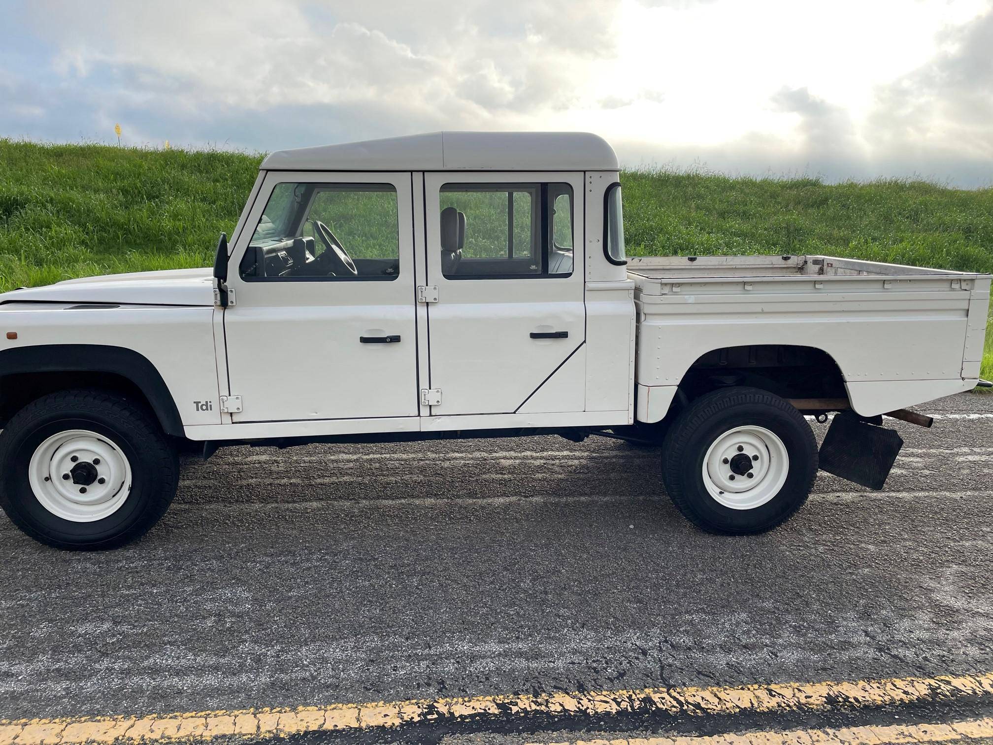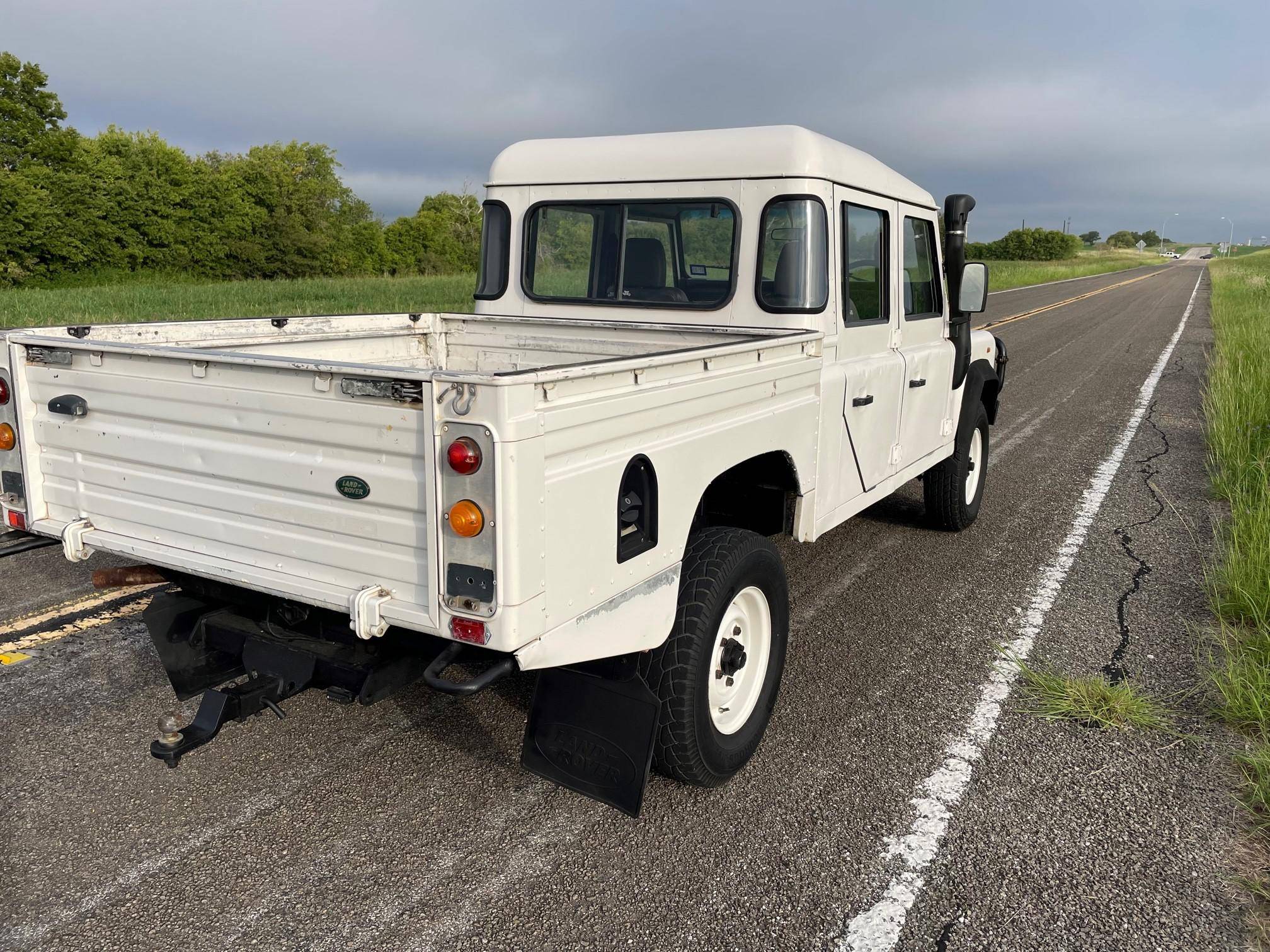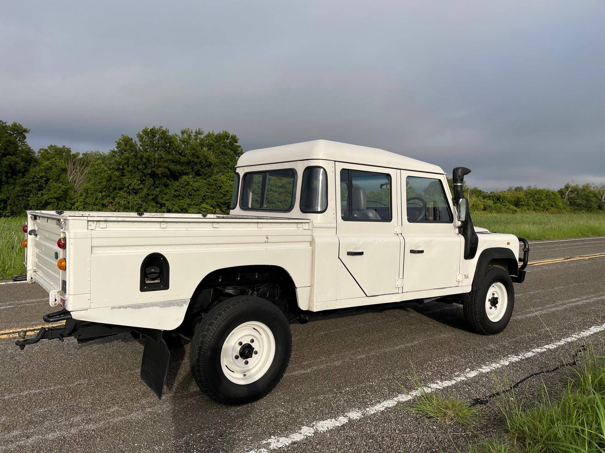 THIS. . . is a 1997 Land Rover Defender 130, finished in white with a gray interior. Reportedly imported from Australia in 2022, it's equipped with a metric instrument cluster, and its odometer currently shows about 196,000 kilometers, which represents approximately 121,800 miles. Factory equipment includes 16-inch wheels, a dual-range transfer case, a locking differential, vinyl upholstery, and manual windows, among others listed below. Modifications reported by the seller include an aftermarket front brush guard, an Airtec snorkel, Kilmat sound deadening material, and a Kenwood head unit. The Land Rover Defender is a legendary SUV for its adventurous off-road capabilities, decades-long production run, and iconic boxy styling. Although the short-wheelbase, two-door "90" model is perhaps more iconic, "130" models like this one have greater utility with more doors and more space to carry passengers and equipment. Power comes from a 2. 5-liter "300TDi" turbodiesel 4-cylinder engine, rated at approximately 111 horsepower and 195 lb-ft of torque. It spins the four wheels via a 5-speed manual transmission and a 2-speed transfer case.