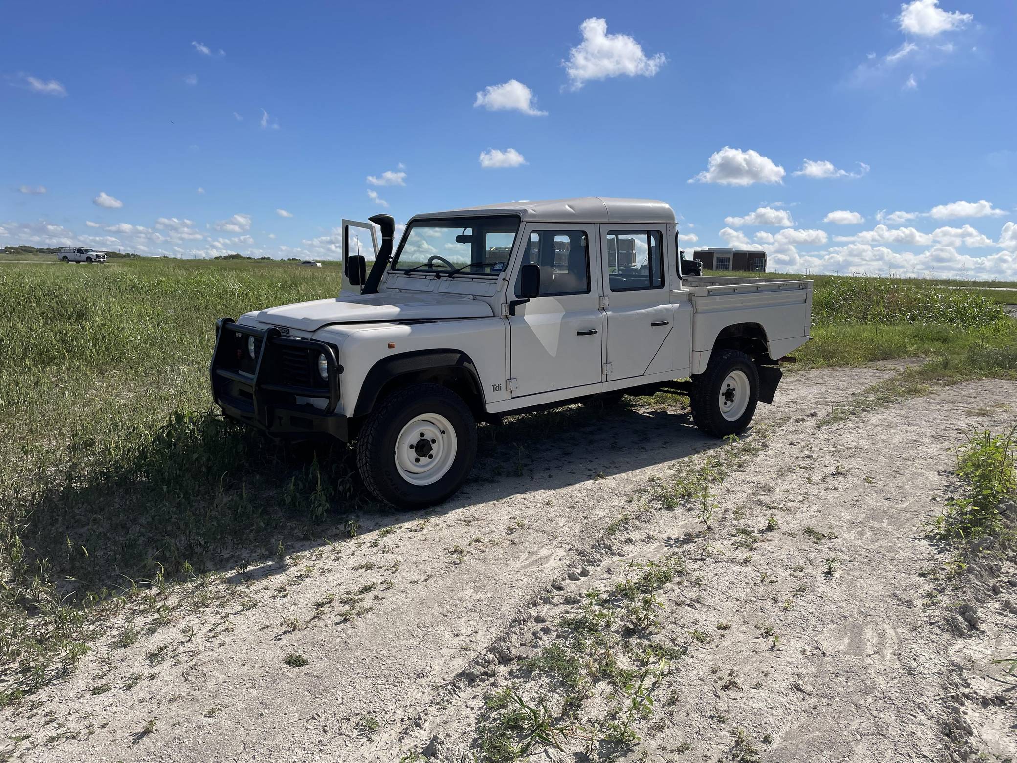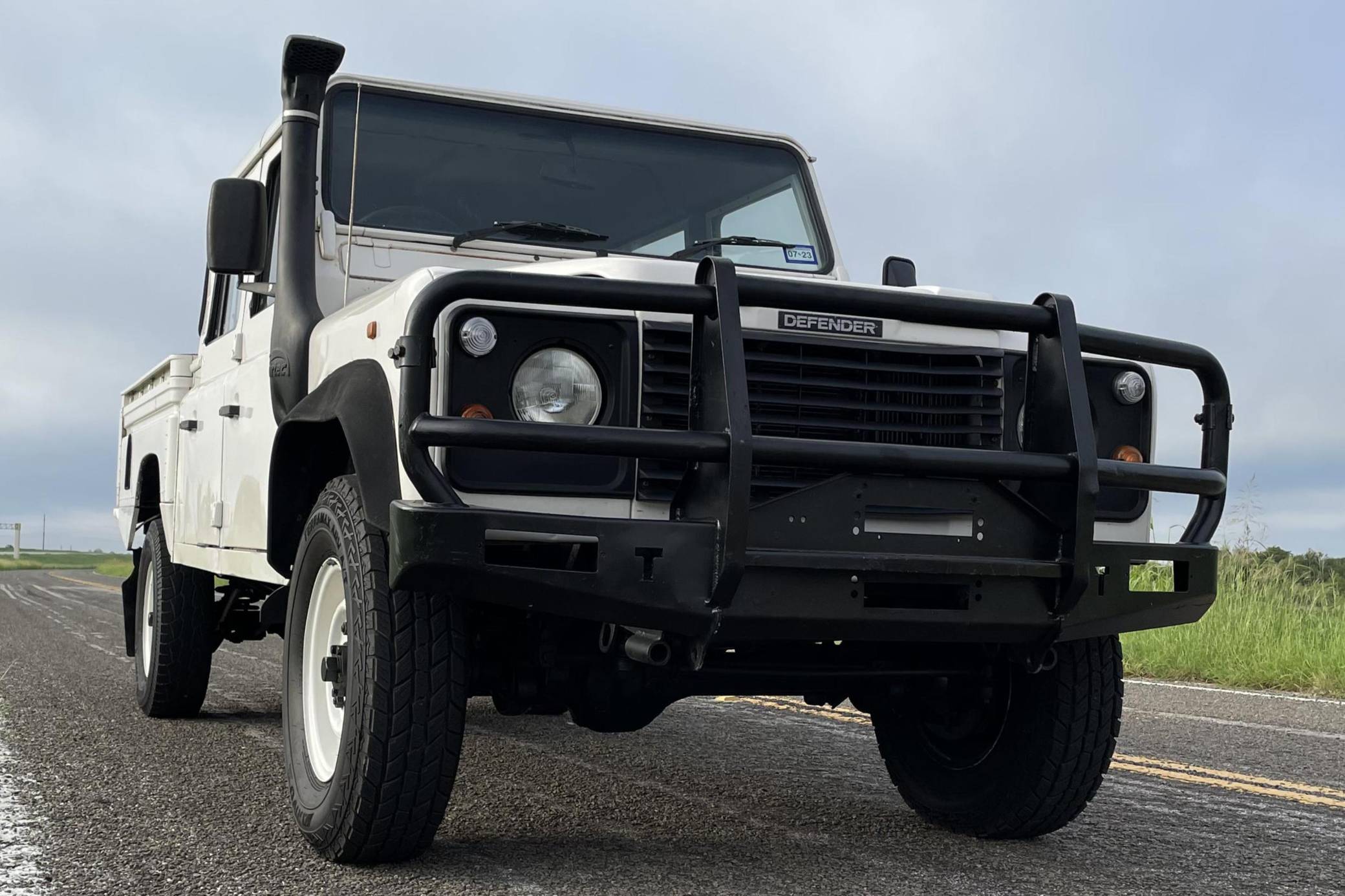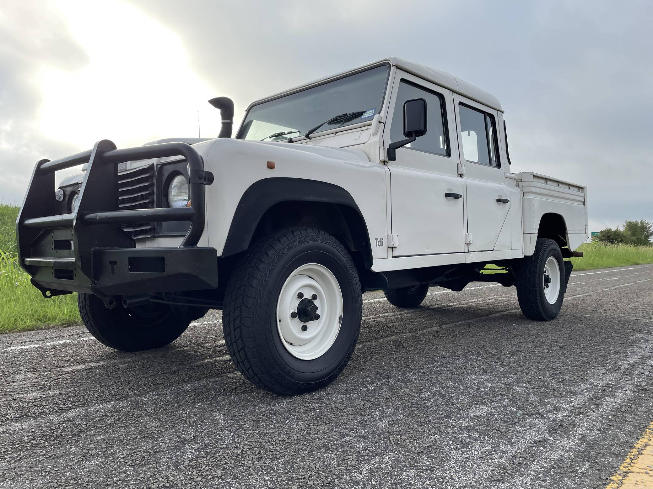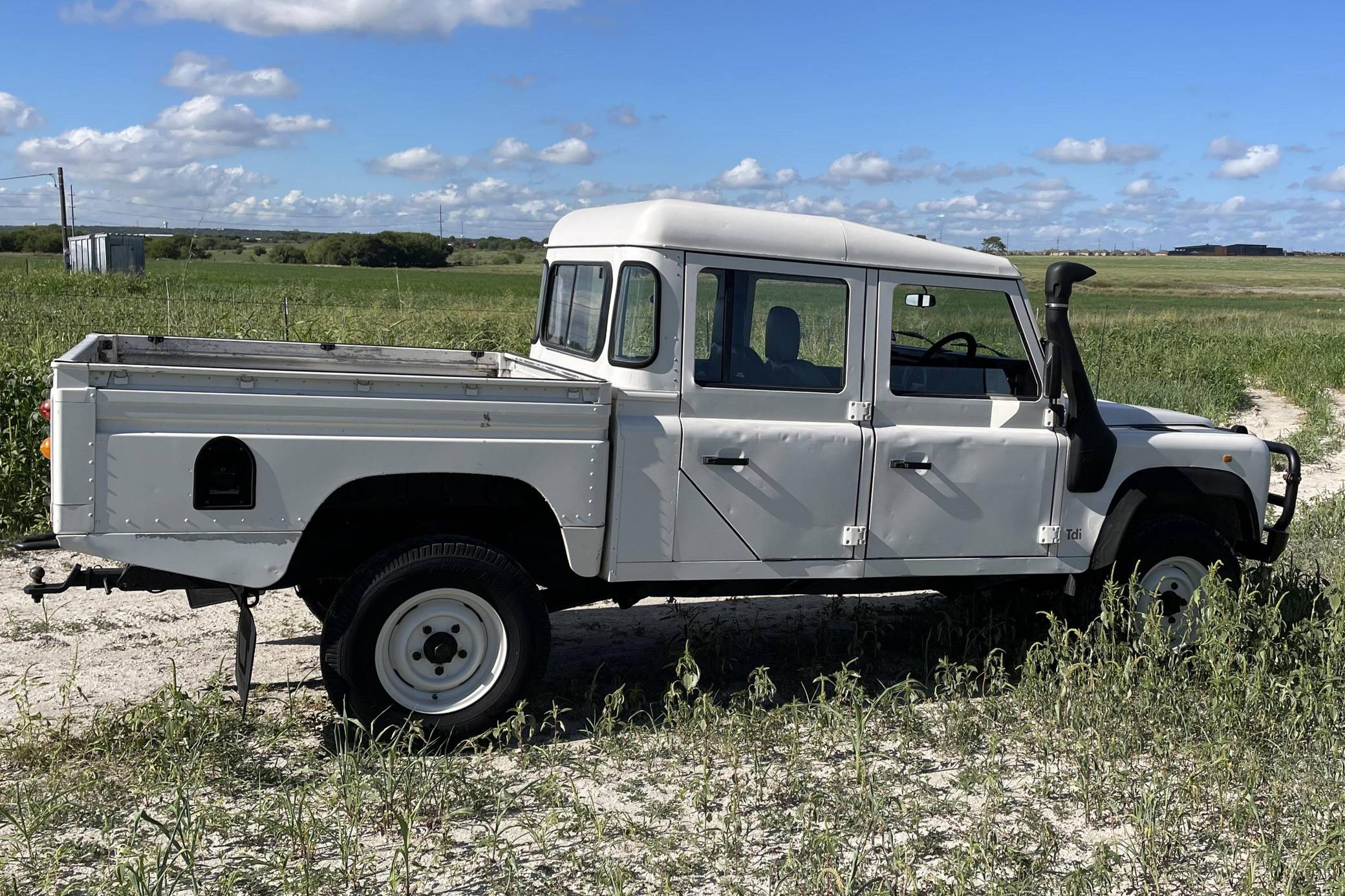 THIS. . . is a 1997 Land Rover Defender 130, finished in white with a gray interior. Reportedly imported from Australia in 2022, it's equipped with a metric instrument cluster, and its odometer currently shows about 196,000 kilometers, which represents approximately 121,800 miles. Factory equipment includes 16-inch wheels, a dual-range transfer case, a locking differential, vinyl upholstery, and manual windows, among others listed below. Modifications reported by the seller include an aftermarket front brush guard, an Airtec snorkel, Kilmat sound deadening material, and a Kenwood head unit. The Land Rover Defender is a legendary SUV for its adventurous off-road capabilities, decades-long production run, and iconic boxy styling. Although the short-wheelbase, two-door "90" model is perhaps more iconic, "130" models like this one have greater utility with more doors and more space to carry passengers and equipment. Power comes from a 2. 5-liter "300TDi" turbodiesel 4-cylinder engine, rated at approximately 111 horsepower and 195 lb-ft of torque. It spins the four wheels via a 5-speed manual transmission and a 2-speed transfer case.