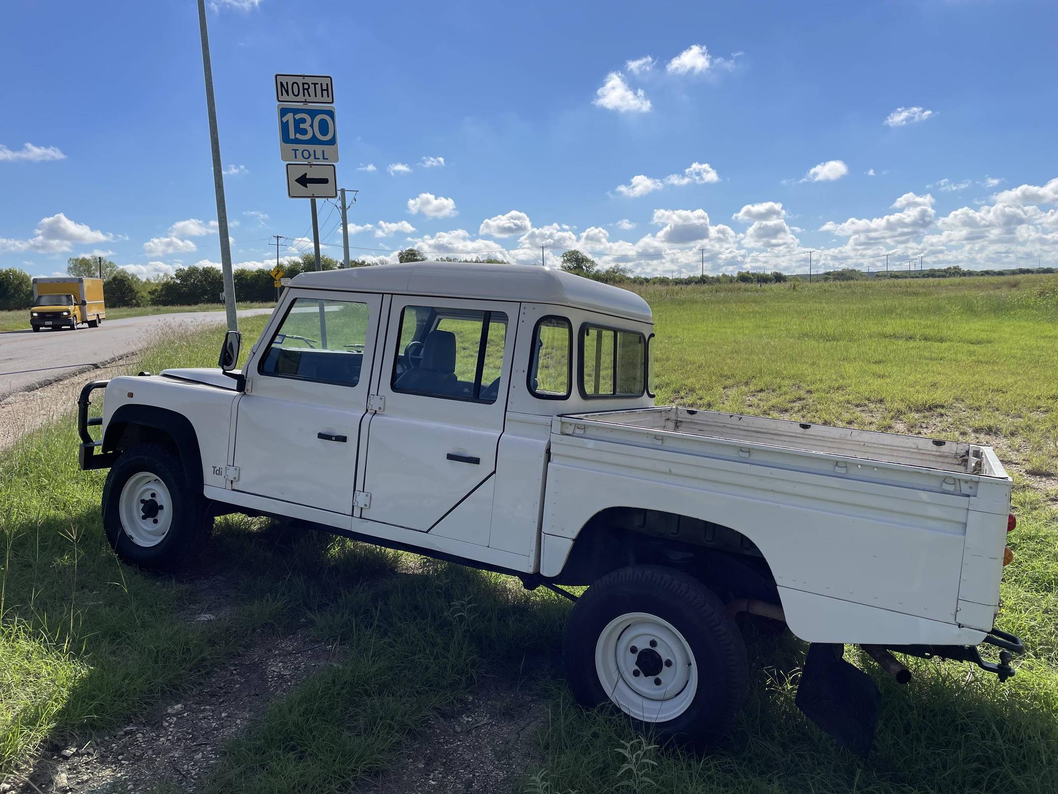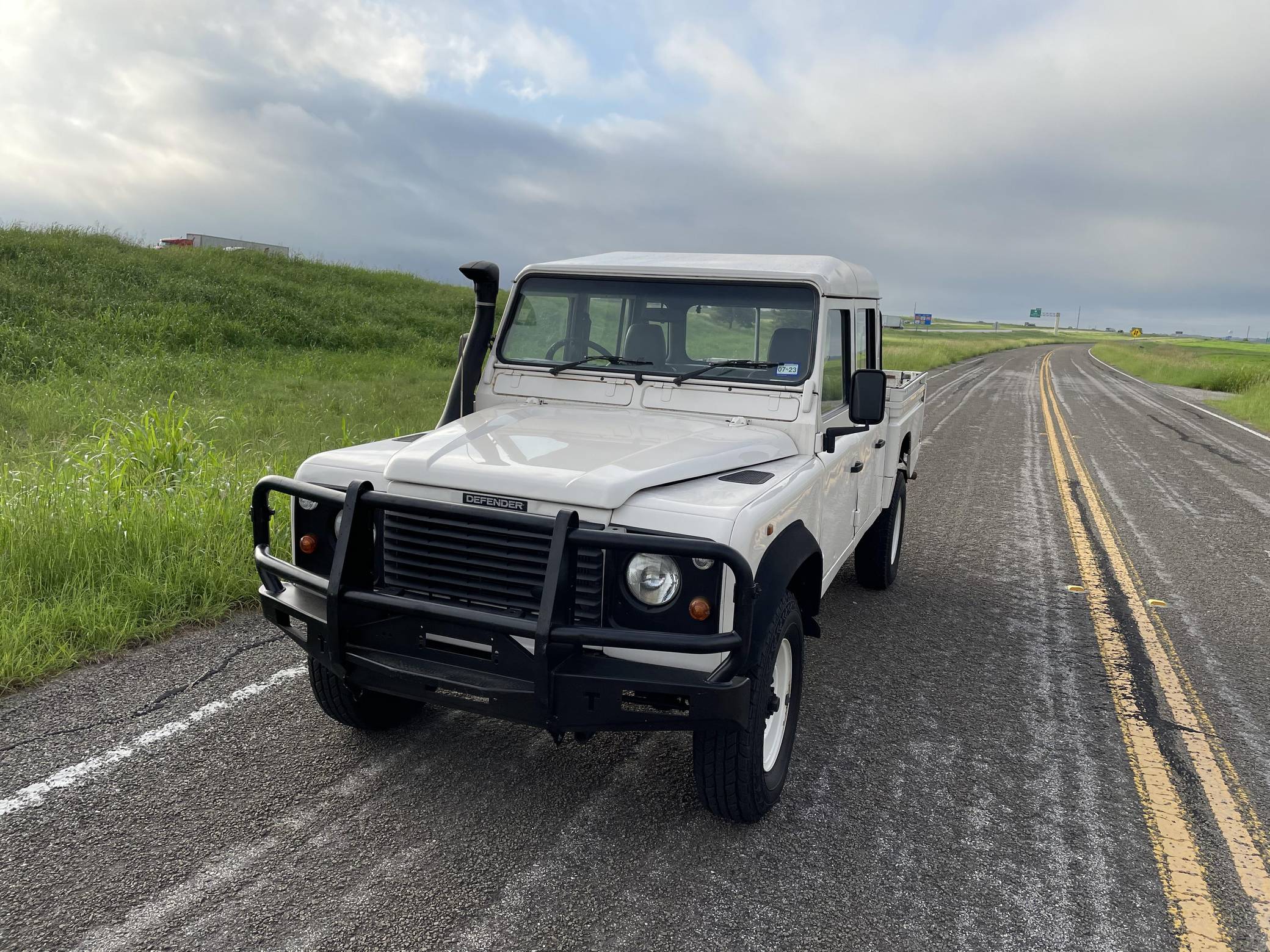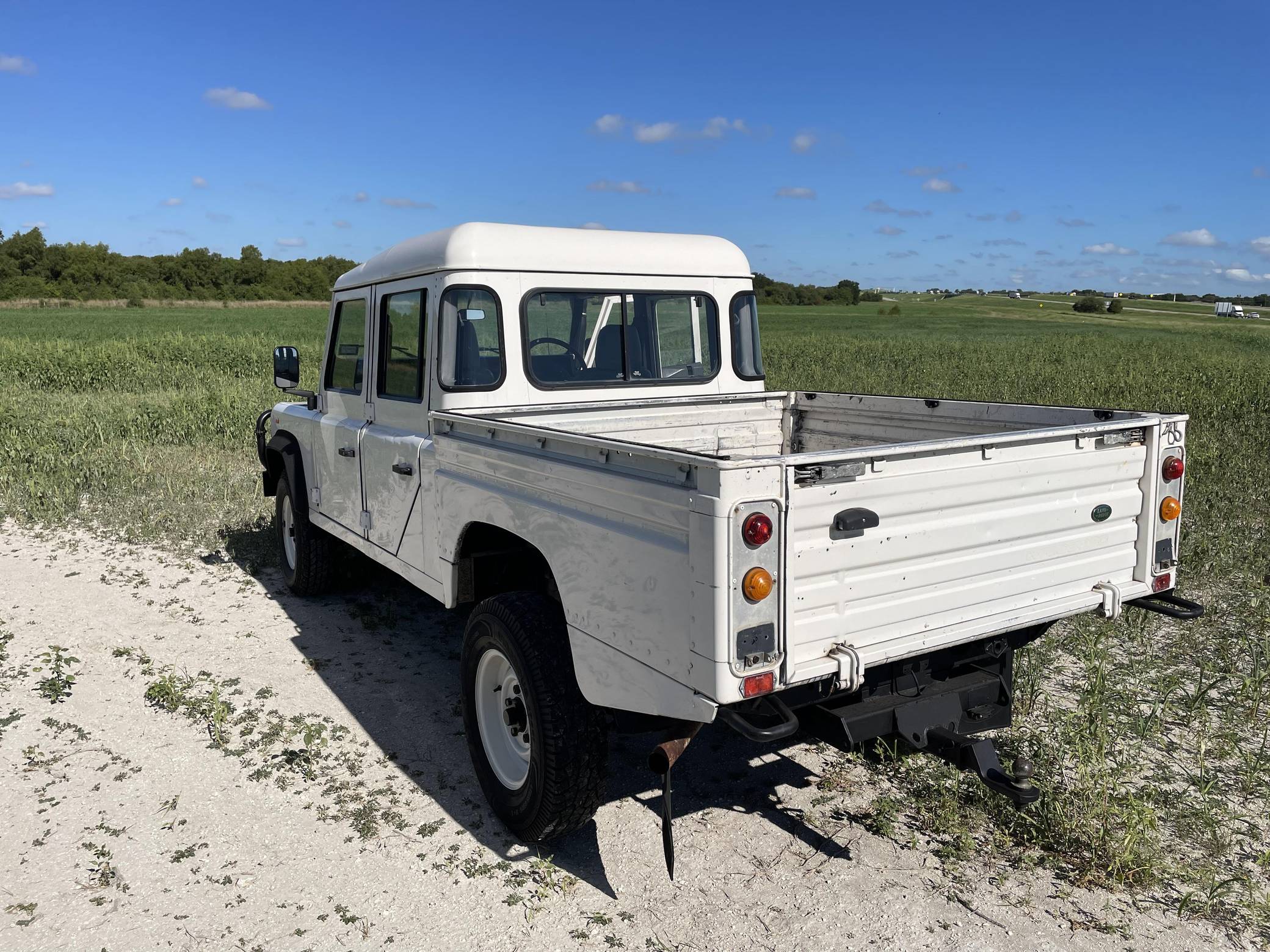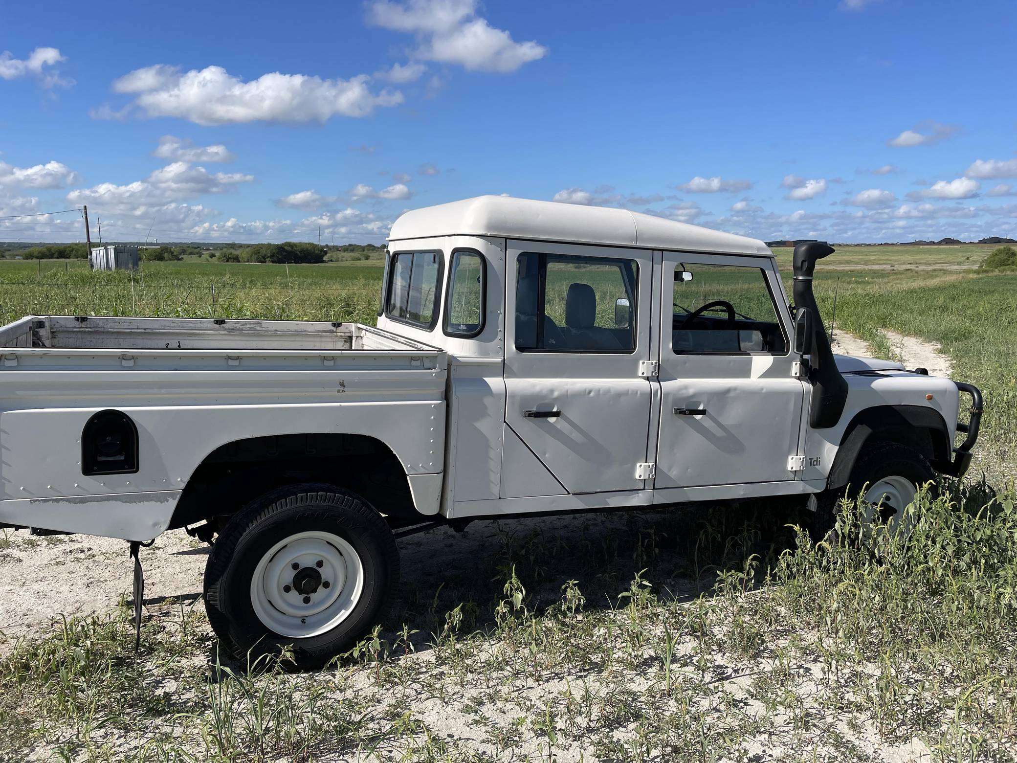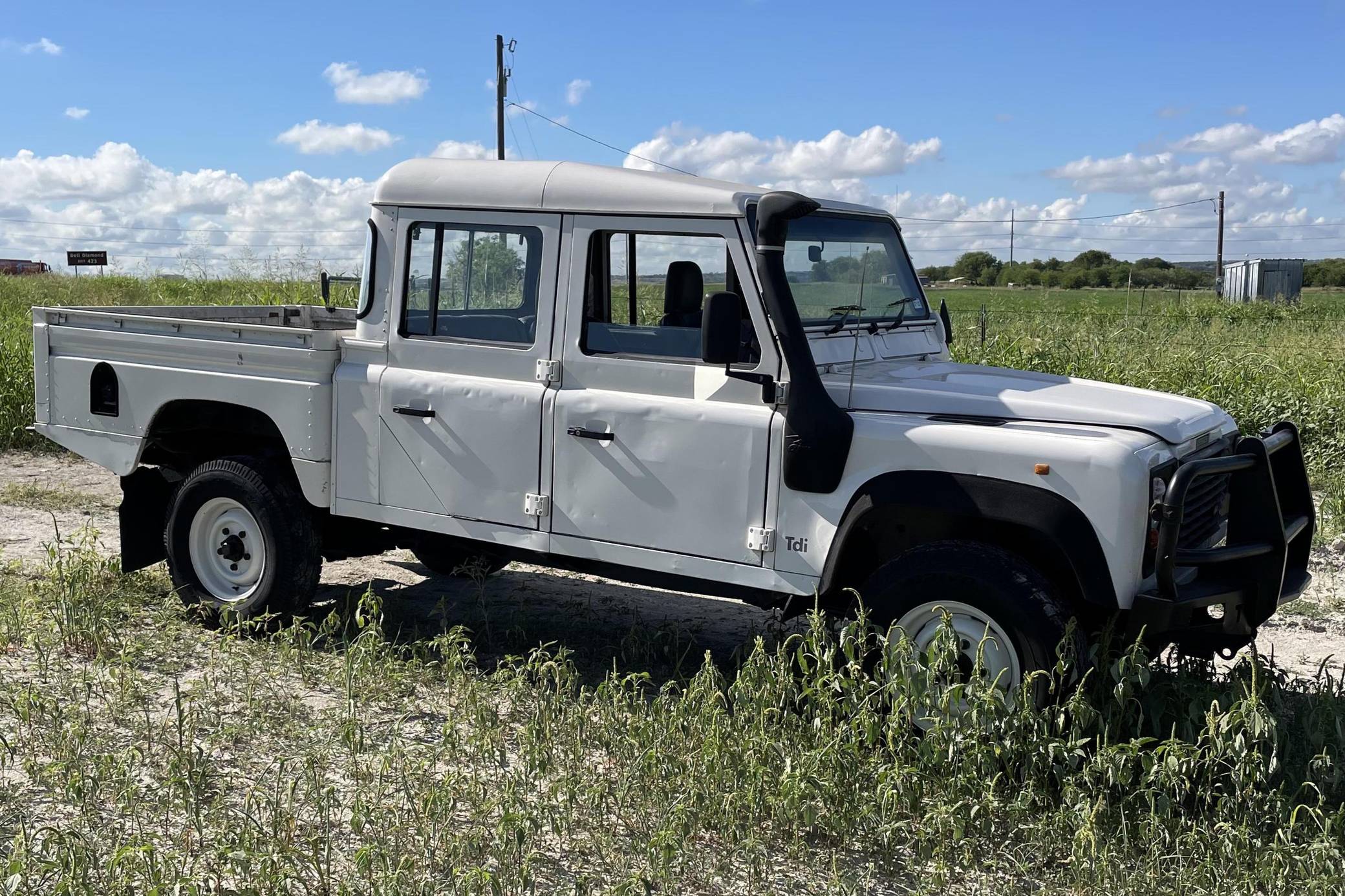 THIS. . . is a 1997 Land Rover Defender 130, finished in white with a gray interior. Reportedly imported from Australia in 2022, it's equipped with a metric instrument cluster, and its odometer currently shows about 196,000 kilometers, which represents approximately 121,800 miles. Factory equipment includes 16-inch wheels, a dual-range transfer case, a locking differential, vinyl upholstery, and manual windows, among others listed below. Modifications reported by the seller include an aftermarket front brush guard, an Airtec snorkel, Kilmat sound deadening material, and a Kenwood head unit. The Land Rover Defender is a legendary SUV for its adventurous off-road capabilities, decades-long production run, and iconic boxy styling. Although the short-wheelbase, two-door "90" model is perhaps more iconic, "130" models like this one have greater utility with more doors and more space to carry passengers and equipment. Power comes from a 2. 5-liter "300TDi" turbodiesel 4-cylinder engine, rated at approximately 111 horsepower and 195 lb-ft of torque. It spins the four wheels via a 5-speed manual transmission and a 2-speed transfer case.