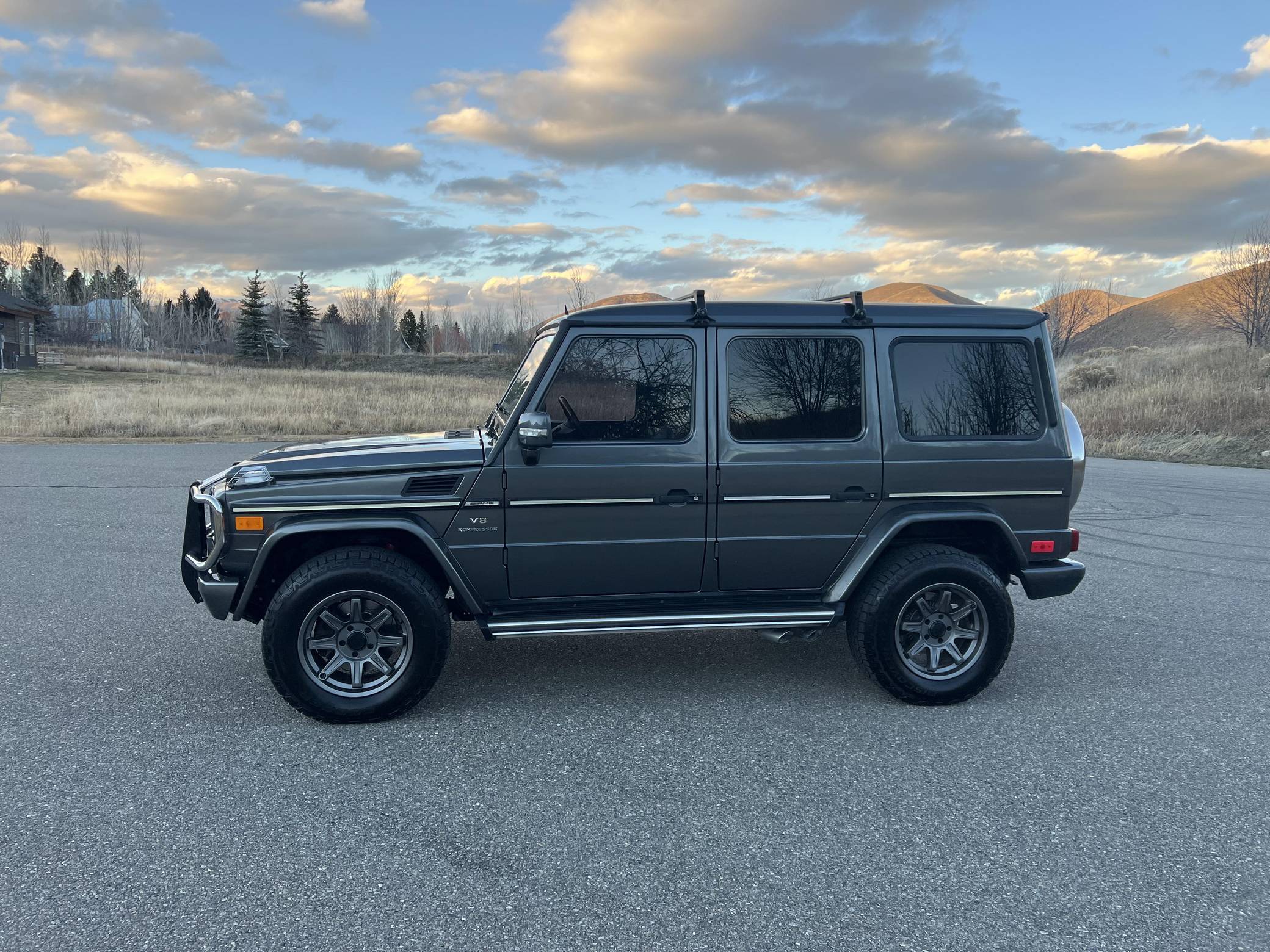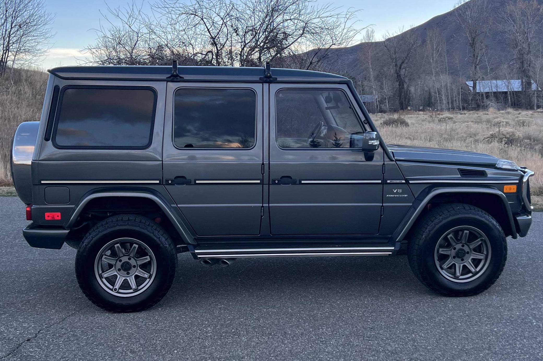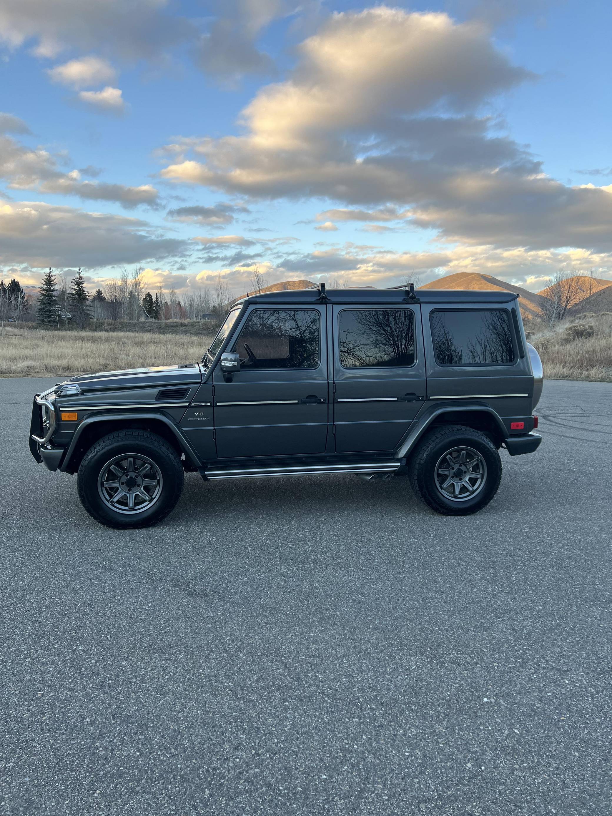 2005 Mercedes-Benz G55 AMG, finished in Designo Graphite Metallic with a black interior. Factory equipment includes fog lights, tinted windows, a sunroof, wood interior trim, heated front and rear seats, and rear parking sensors. This G55's build sheet is pictured in the gallery. Modifications reported by the seller include 18-inch ALPHAequipt Command wheels, a 2-inch suspension lift, tinted windows, a folding third-row seat installed in the trunk. Invoices pictured in the gallery detail some of the repairs and maintenance performed on this G55 in 2021. The list of parts replaced includes the valve cover gaskets and the rear brake pads and rotors. Mercedes-Benz joined forces with Steyr-Daimler-Puch to create the original G-Class (W460). It was released in 1979 and aimed largely at farmers, soldiers, and adventurers; Beverly Hills wasn't on the company's radar yet. The G's upmarket ascent started when the extensively updated W463 arrived in 1990. It looked a lot like the original G, so it embodied a function-over-form approach to design, but it gained a longer list of features and a permanent 4-wheel-drive system. Civilian production ended in 2018. Power comes from a 5. 4-liter supercharged V8, rated at 469 horsepower and 516 lb-ft of torque. Called "M113K", it spins the four wheels via a 5-speed automatic transmission and triple locking differentials.