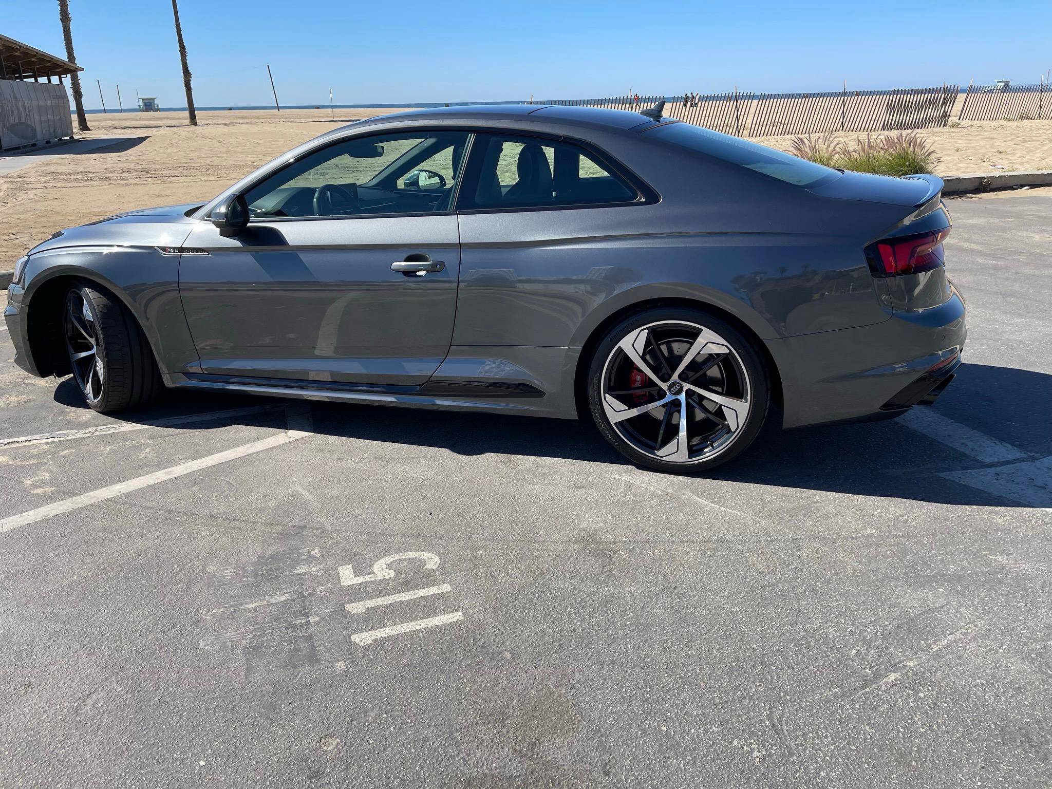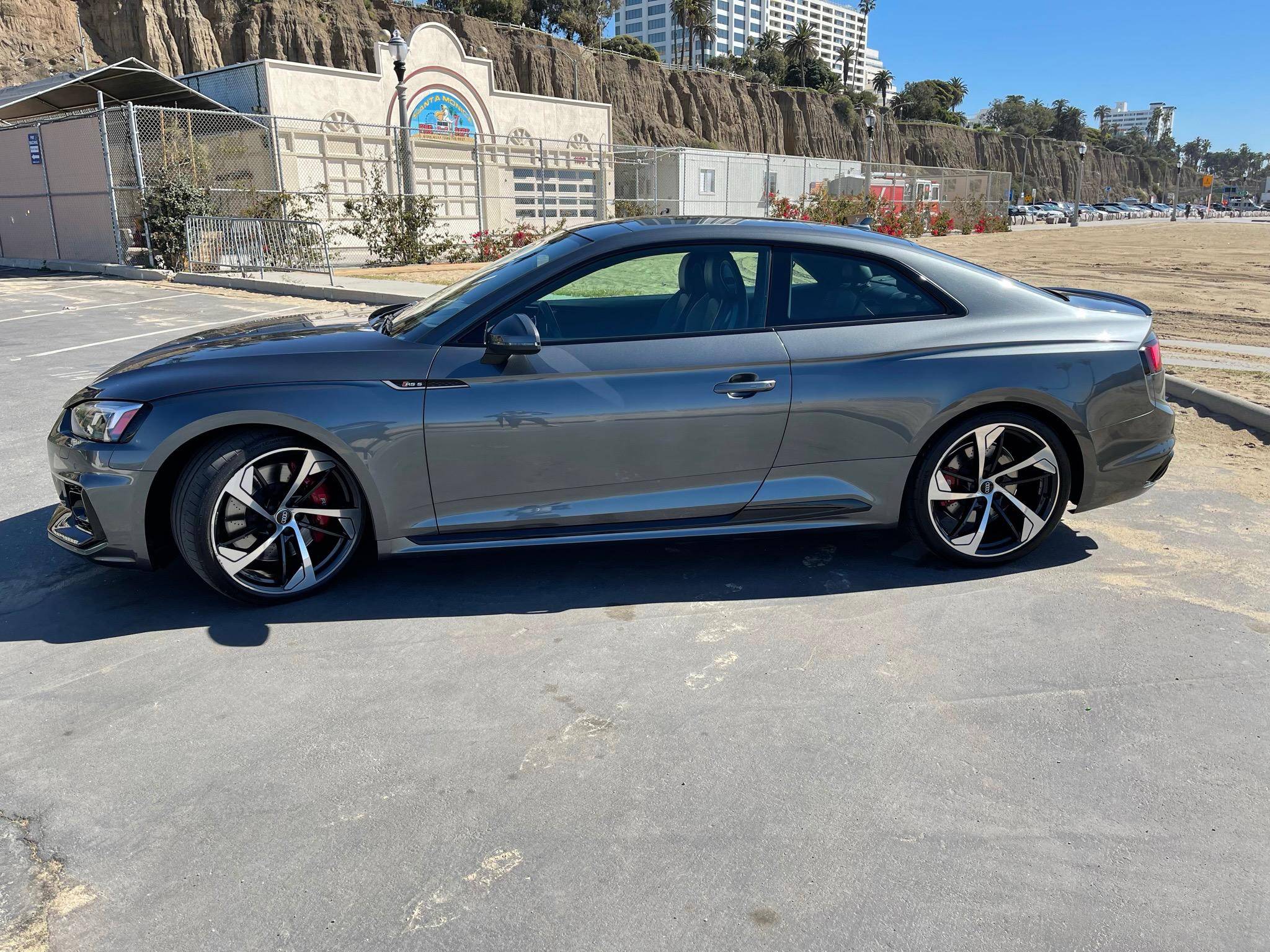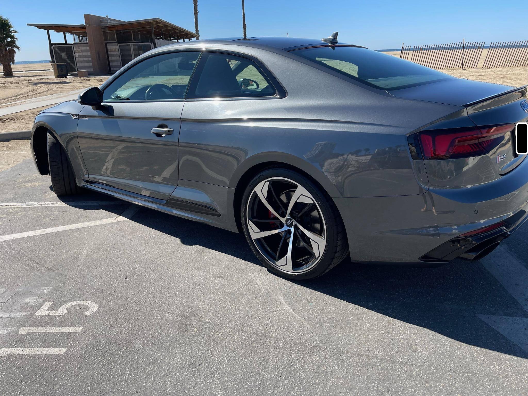 2018 Audi RS5 coupe, finished in Daytona Gray Pearl Effect with a black interior. Factory equipment includes 20-inch wheels, an RS-specific body kit, LED exterior lighting, a power sunroof, leather upholstery, heated and power-adjustable front sport seats, carbon fiber interior trim, and a Bang & Olufsen sound system, among others listed below. The seller reports no modifications. Audi released the second-generation RS5 for 2018 as the ultimate evolution of the A5. Offered as a coupe and as a fastback called Sportback, it swapped its predecessor's V8 for a twin-turbocharged V6 but it gained torque in the trade. Huge brakes and a model-specific suspension system helped drivers make the most of the drivetrain, while a more muscular-looking exterior design allowed the RS5 to easily stand out from the S5. It remains available as Audi of America's answer to the BMW M4 in 2022. Power comes from a twin-turbocharged 2. 9-liter "TFSI" V6 engine, rated at 444 horsepower and 443 lb-ft of torque. It spins the 4 wheels via an 8-speed automatic transmission linked to a pair of shift paddles and Audi's permanent Quattro all-wheel-drive system.