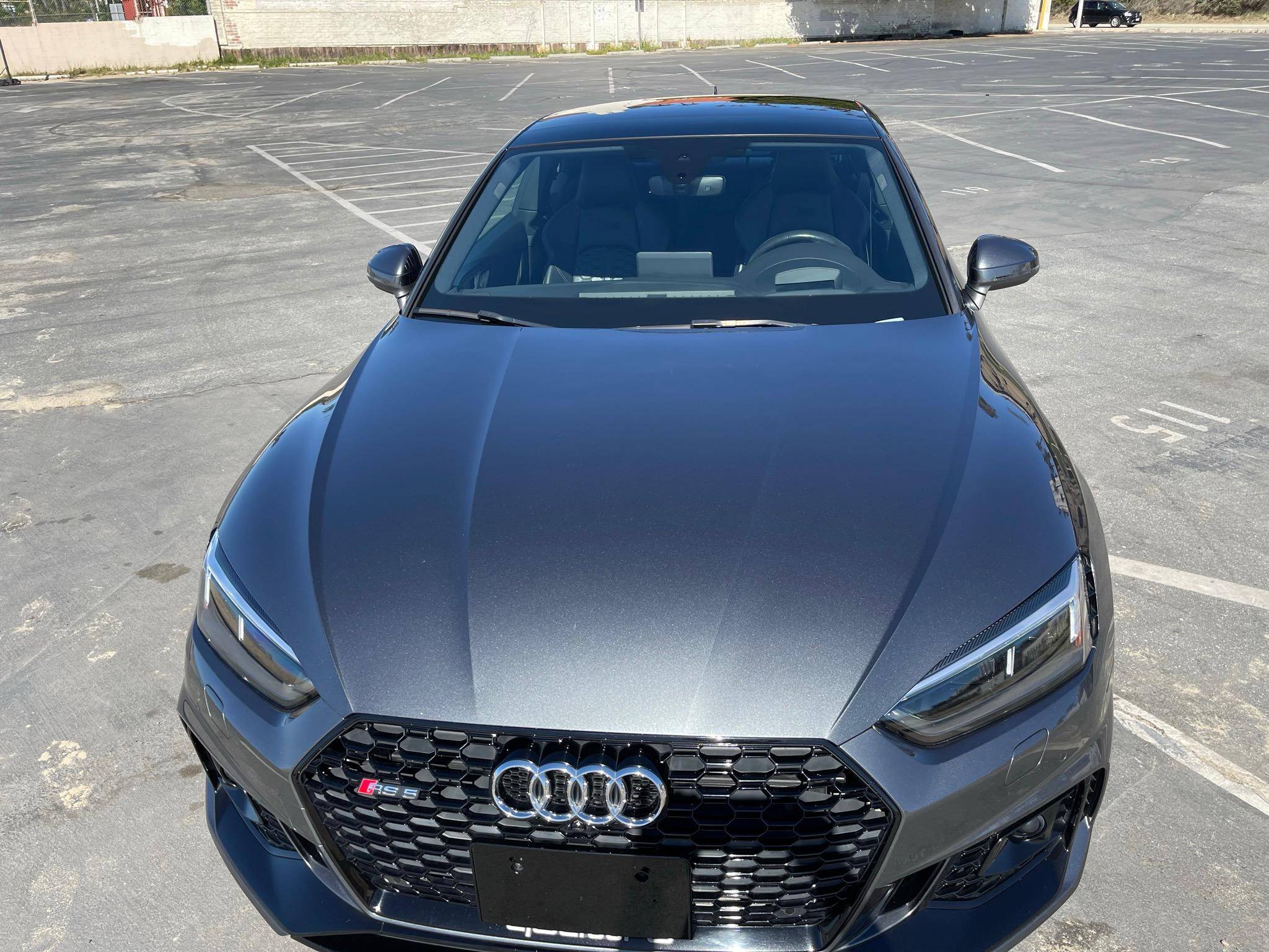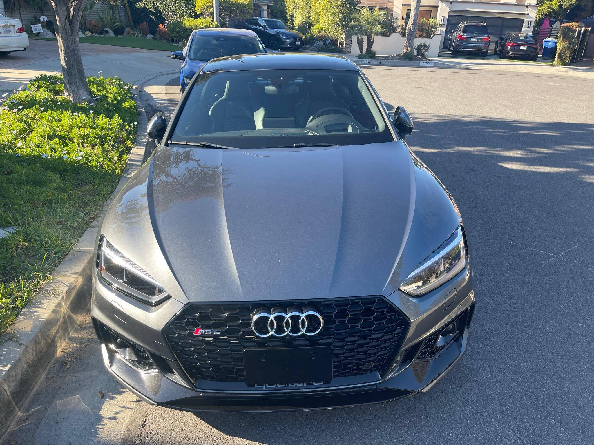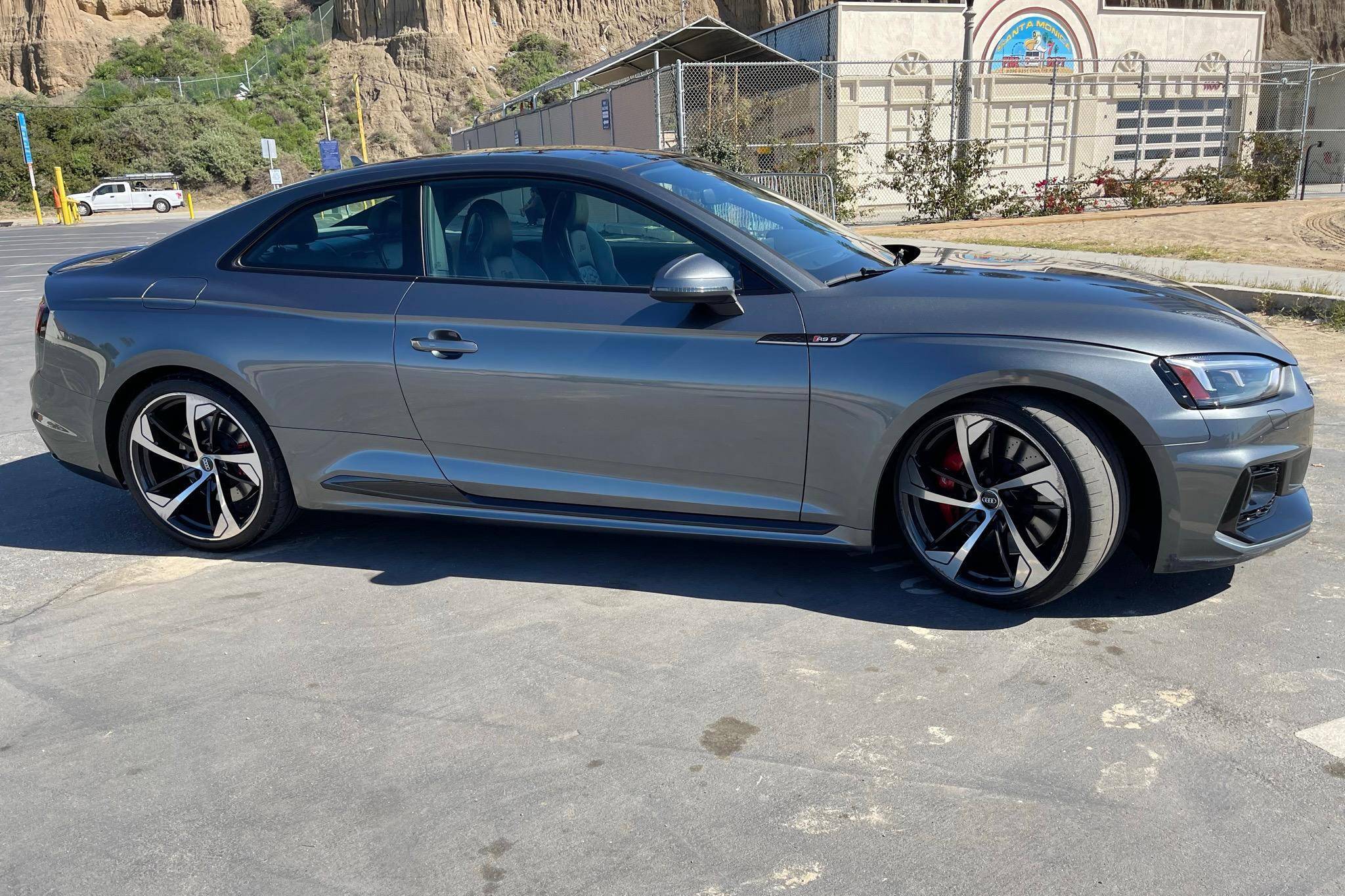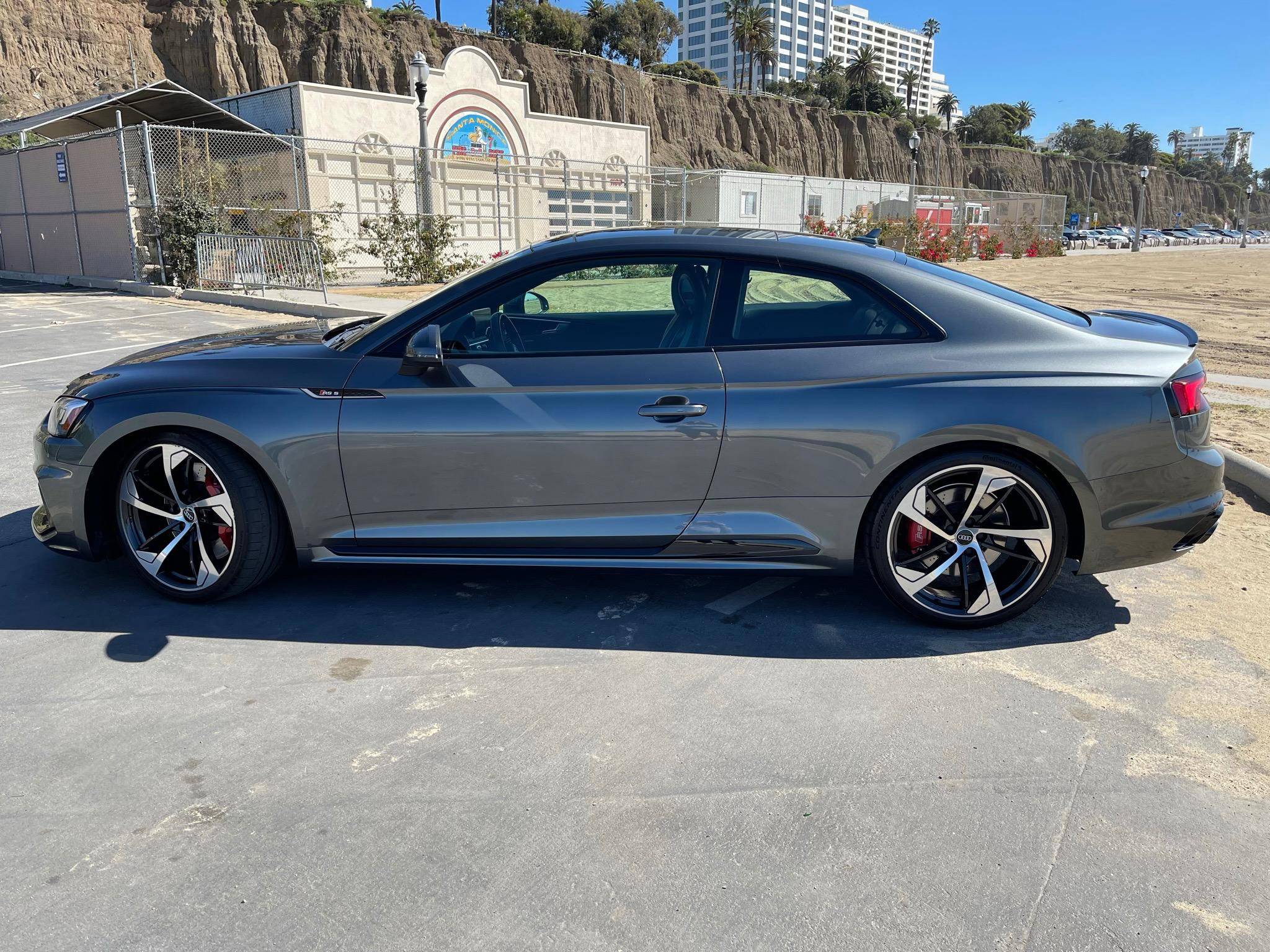 2018 Audi RS5 coupe, finished in Daytona Gray Pearl Effect with a black interior. Factory equipment includes 20-inch wheels, an RS-specific body kit, LED exterior lighting, a power sunroof, leather upholstery, heated and power-adjustable front sport seats, carbon fiber interior trim, and a Bang & Olufsen sound system, among others listed below. The seller reports no modifications. Audi released the second-generation RS5 for 2018 as the ultimate evolution of the A5. Offered as a coupe and as a fastback called Sportback, it swapped its predecessor's V8 for a twin-turbocharged V6 but it gained torque in the trade. Huge brakes and a model-specific suspension system helped drivers make the most of the drivetrain, while a more muscular-looking exterior design allowed the RS5 to easily stand out from the S5. It remains available as Audi of America's answer to the BMW M4 in 2022. Power comes from a twin-turbocharged 2. 9-liter "TFSI" V6 engine, rated at 444 horsepower and 443 lb-ft of torque. It spins the 4 wheels via an 8-speed automatic transmission linked to a pair of shift paddles and Audi's permanent Quattro all-wheel-drive system.