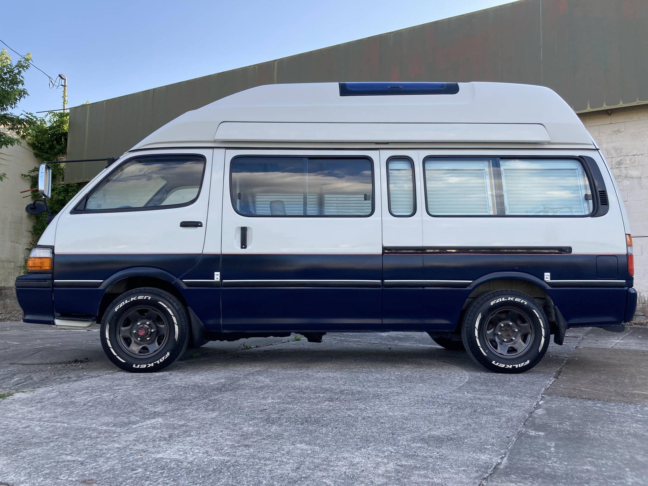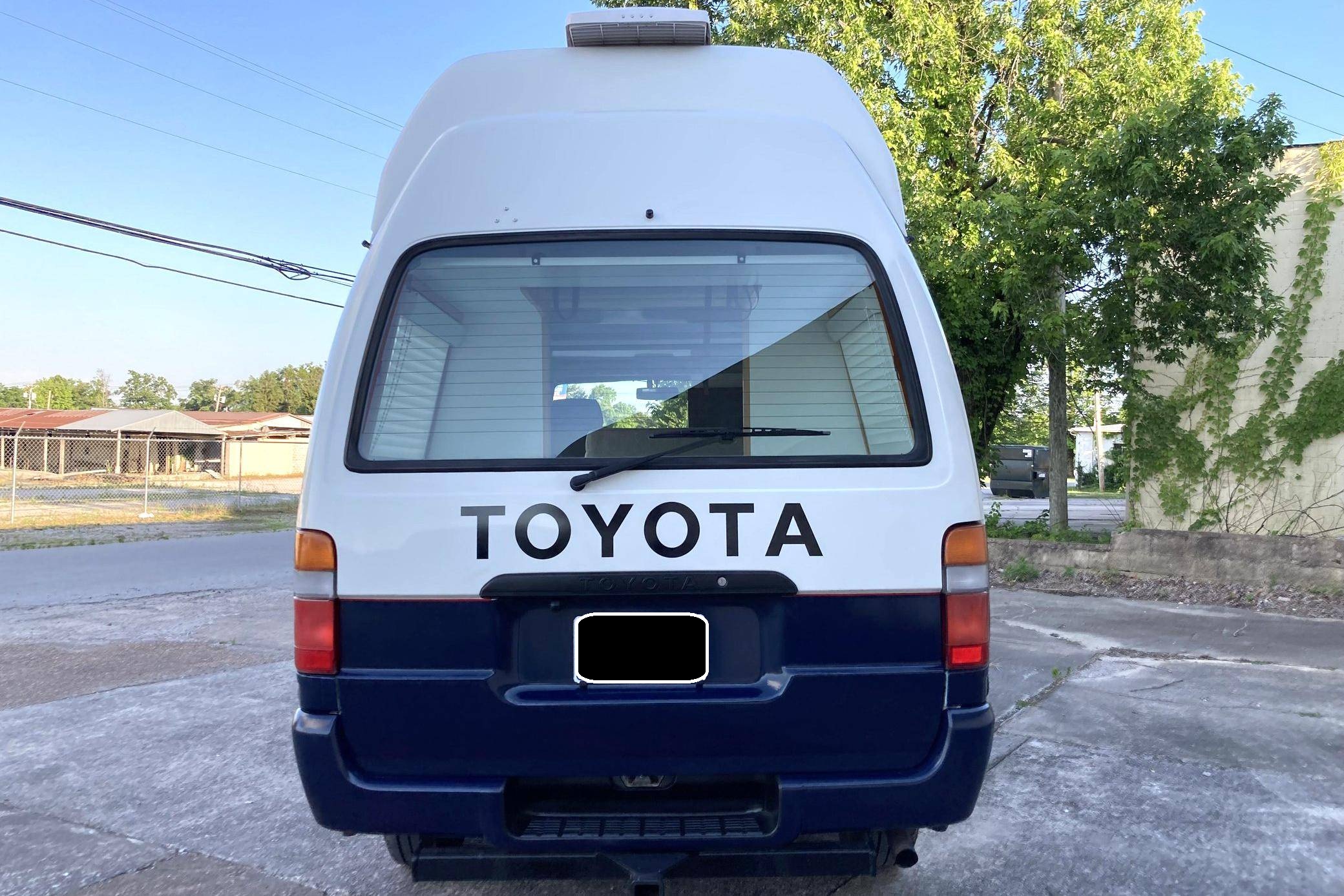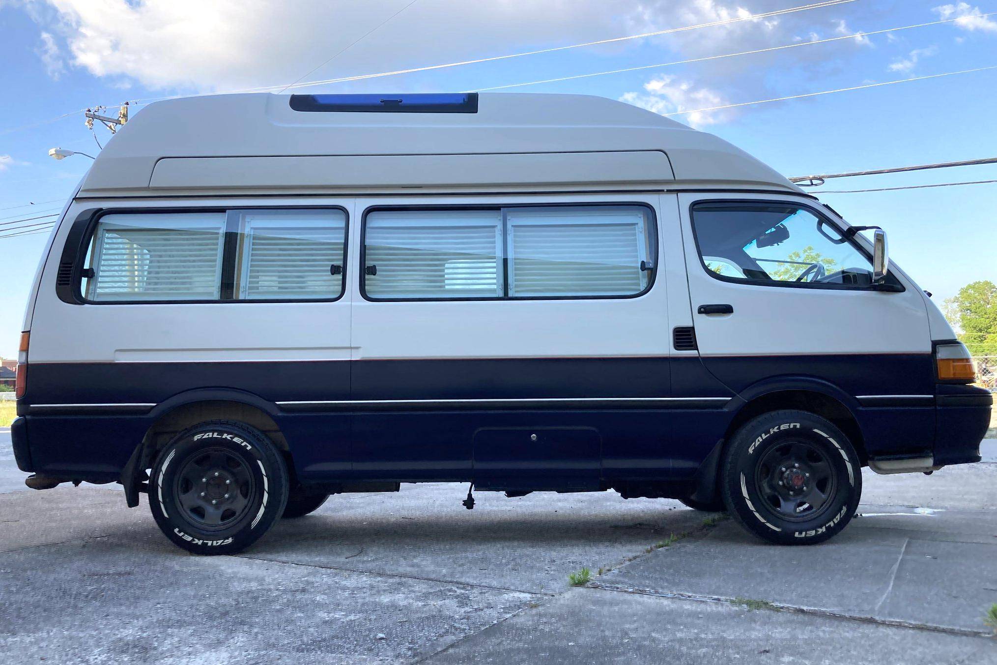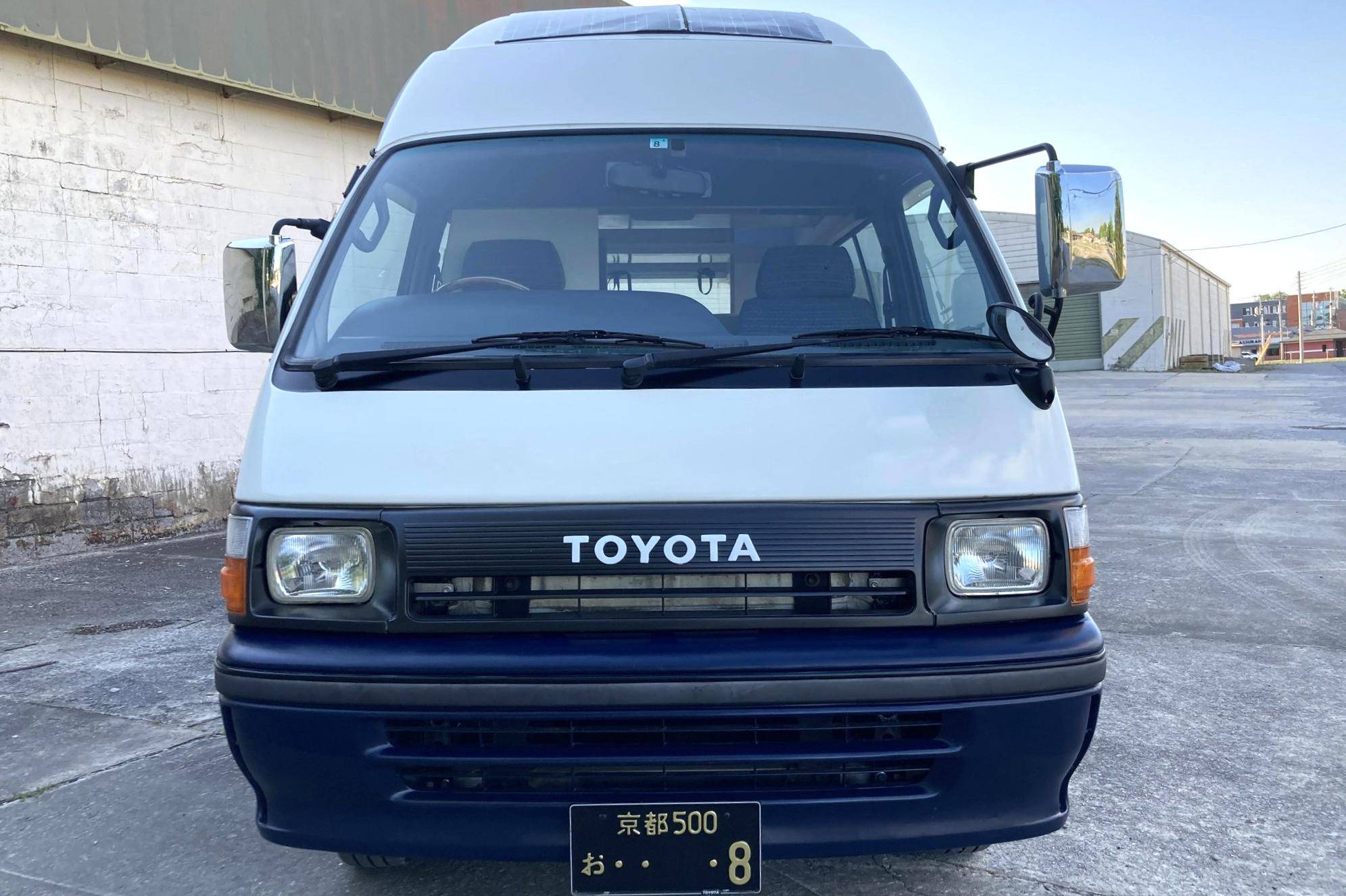 THIS. . . is a 1995 Toyota HiAce Cruising Cabin 4x4, finished in white and blue with a custom interior. Said to be imported from Japan in April 2022, it's equipped with a metric instrument cluster, and the odometer shows about 142,200 kilometers, which represents approximately 88,400 miles. Equipment includes a high-roof, manually-locking front hubs, an external locking storage compartment, cloth upholstery, sliding side windows, air conditioning, and more as detailed below. A partial list of modifications reported by the seller includes 15-inch wheels, custom paint and rear decal, early-model front fascia and headlights, roof-mounted solar panels, pop-up skylights, rear air conditioning, a diesel-powered parking heater, a flat-screen TV with remote, and window curtains. Toyota introduced the fourth-generation HiAce (called "H100" internally) in 1989 and it sold the model in numerous global markets, though the United States wasn't one of them. Spacious and relatively compact thanks in part to its cab-over design, it was offered in people- and cargo-carrying variants until 2004. Power comes from a 2. 8-liter diesel inline-4, rated at approximately 90 horsepower and 139 lb-ft of torque. Output is sent to the rear or all four wheels through a 4-speed automatic transmission and a 2-speed transfer case.