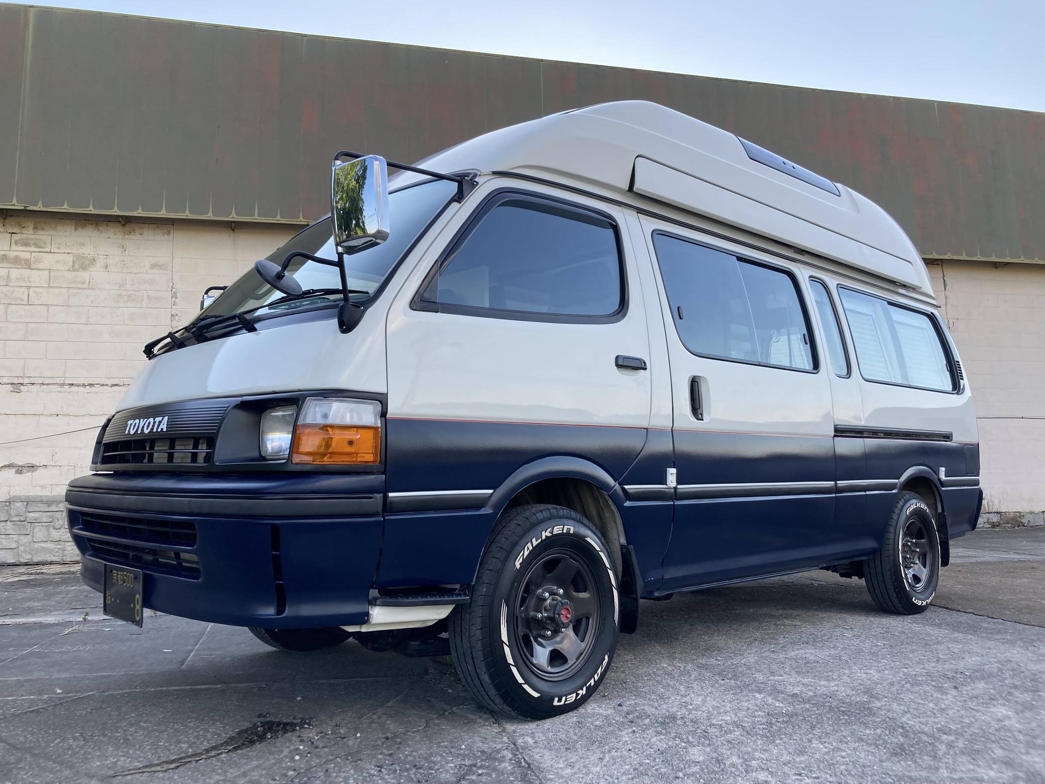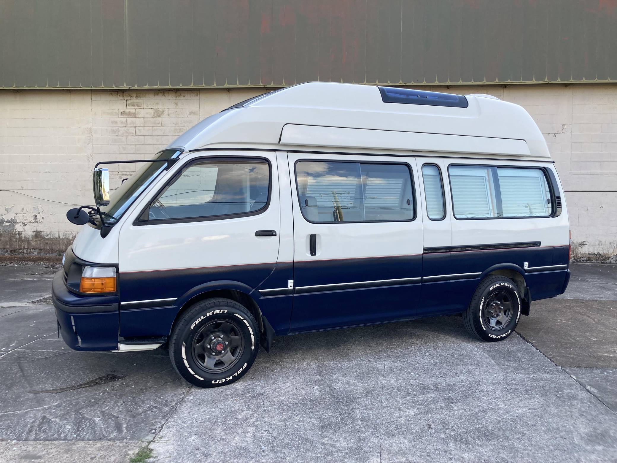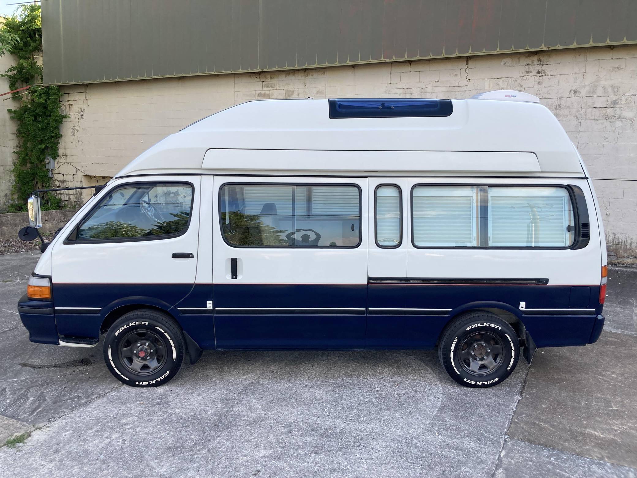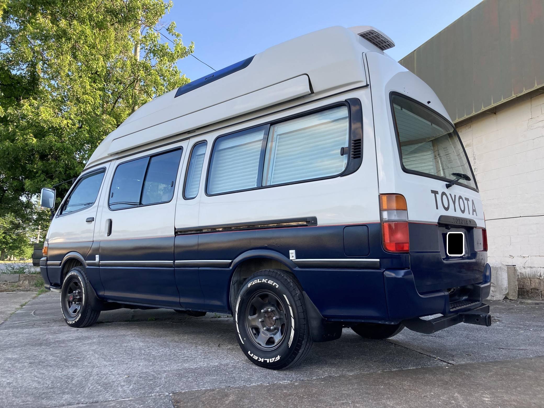 THIS. . . is a 1995 Toyota HiAce Cruising Cabin 4x4, finished in white and blue with a custom interior. Said to be imported from Japan in April 2022, it's equipped with a metric instrument cluster, and the odometer shows about 142,200 kilometers, which represents approximately 88,400 miles. Equipment includes a high-roof, manually-locking front hubs, an external locking storage compartment, cloth upholstery, sliding side windows, air conditioning, and more as detailed below. A partial list of modifications reported by the seller includes 15-inch wheels, custom paint and rear decal, early-model front fascia and headlights, roof-mounted solar panels, pop-up skylights, rear air conditioning, a diesel-powered parking heater, a flat-screen TV with remote, and window curtains. Toyota introduced the fourth-generation HiAce (called "H100" internally) in 1989 and it sold the model in numerous global markets, though the United States wasn't one of them. Spacious and relatively compact thanks in part to its cab-over design, it was offered in people- and cargo-carrying variants until 2004. Power comes from a 2. 8-liter diesel inline-4, rated at approximately 90 horsepower and 139 lb-ft of torque. Output is sent to the rear or all four wheels through a 4-speed automatic transmission and a 2-speed transfer case.