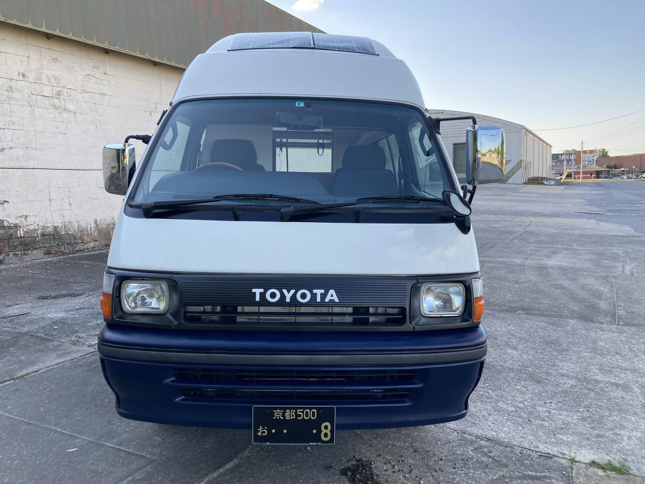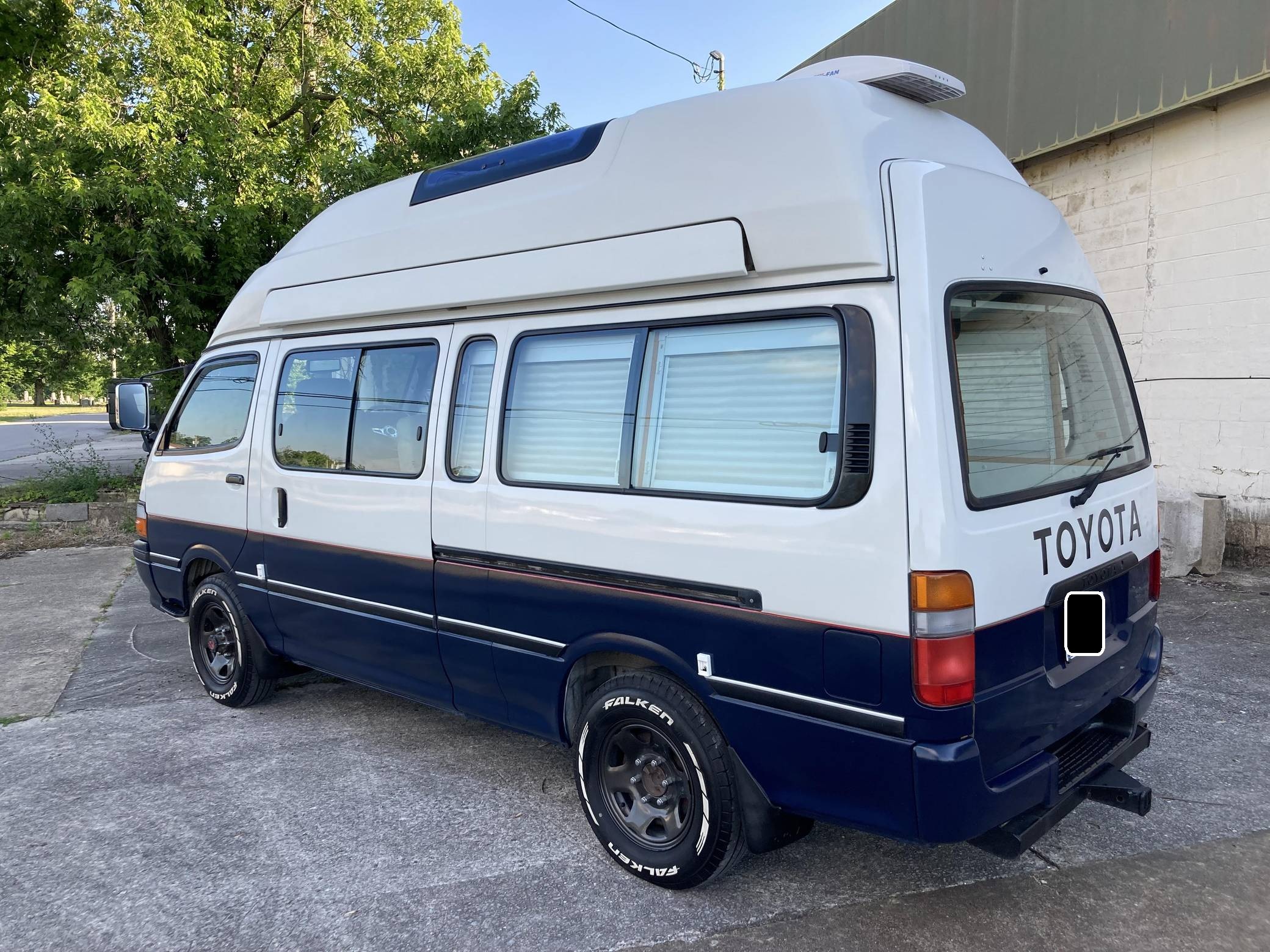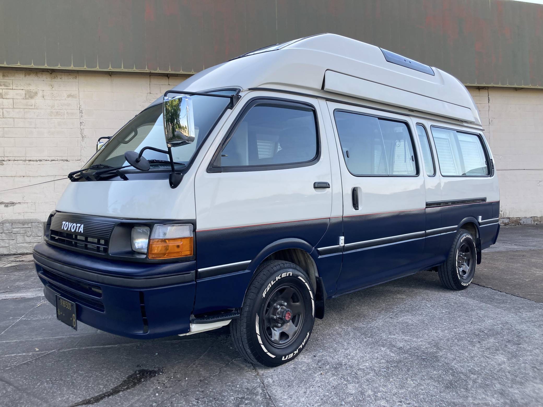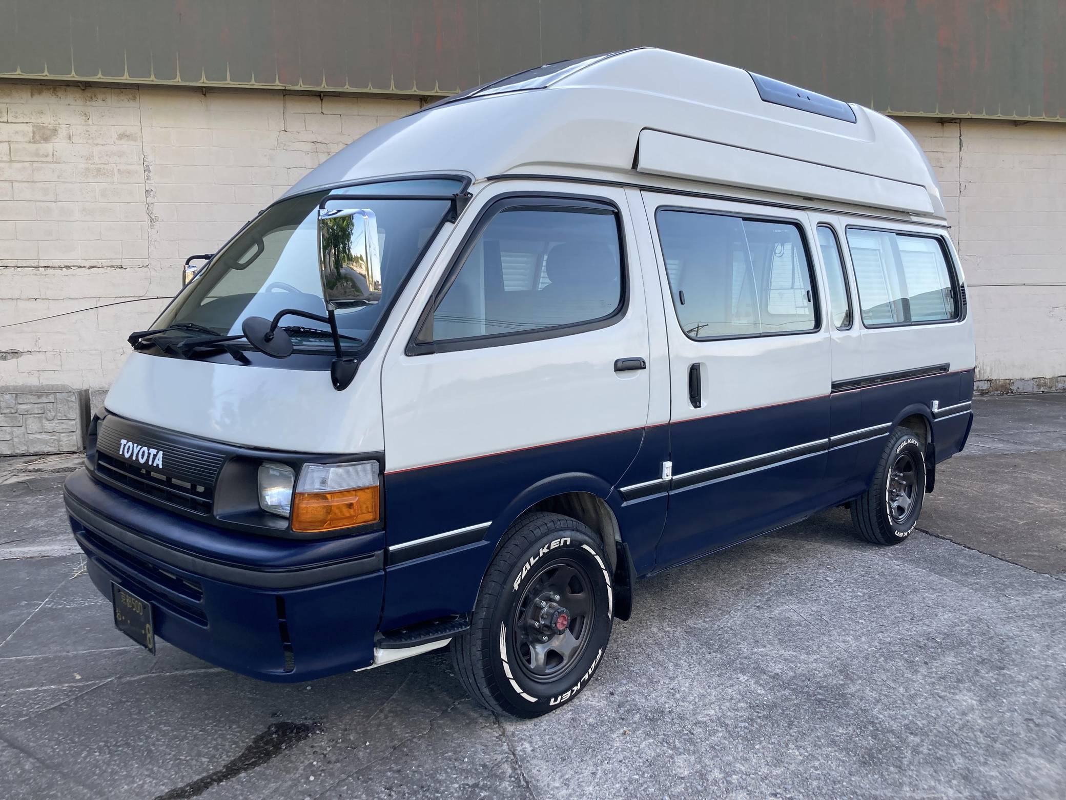 THIS. . . is a 1995 Toyota HiAce Cruising Cabin 4x4, finished in white and blue with a custom interior. Said to be imported from Japan in April 2022, it's equipped with a metric instrument cluster, and the odometer shows about 142,200 kilometers, which represents approximately 88,400 miles. Equipment includes a high-roof, manually-locking front hubs, an external locking storage compartment, cloth upholstery, sliding side windows, air conditioning, and more as detailed below. A partial list of modifications reported by the seller includes 15-inch wheels, custom paint and rear decal, early-model front fascia and headlights, roof-mounted solar panels, pop-up skylights, rear air conditioning, a diesel-powered parking heater, a flat-screen TV with remote, and window curtains. Toyota introduced the fourth-generation HiAce (called "H100" internally) in 1989 and it sold the model in numerous global markets, though the United States wasn't one of them. Spacious and relatively compact thanks in part to its cab-over design, it was offered in people- and cargo-carrying variants until 2004. Power comes from a 2. 8-liter diesel inline-4, rated at approximately 90 horsepower and 139 lb-ft of torque. Output is sent to the rear or all four wheels through a 4-speed automatic transmission and a 2-speed transfer case.