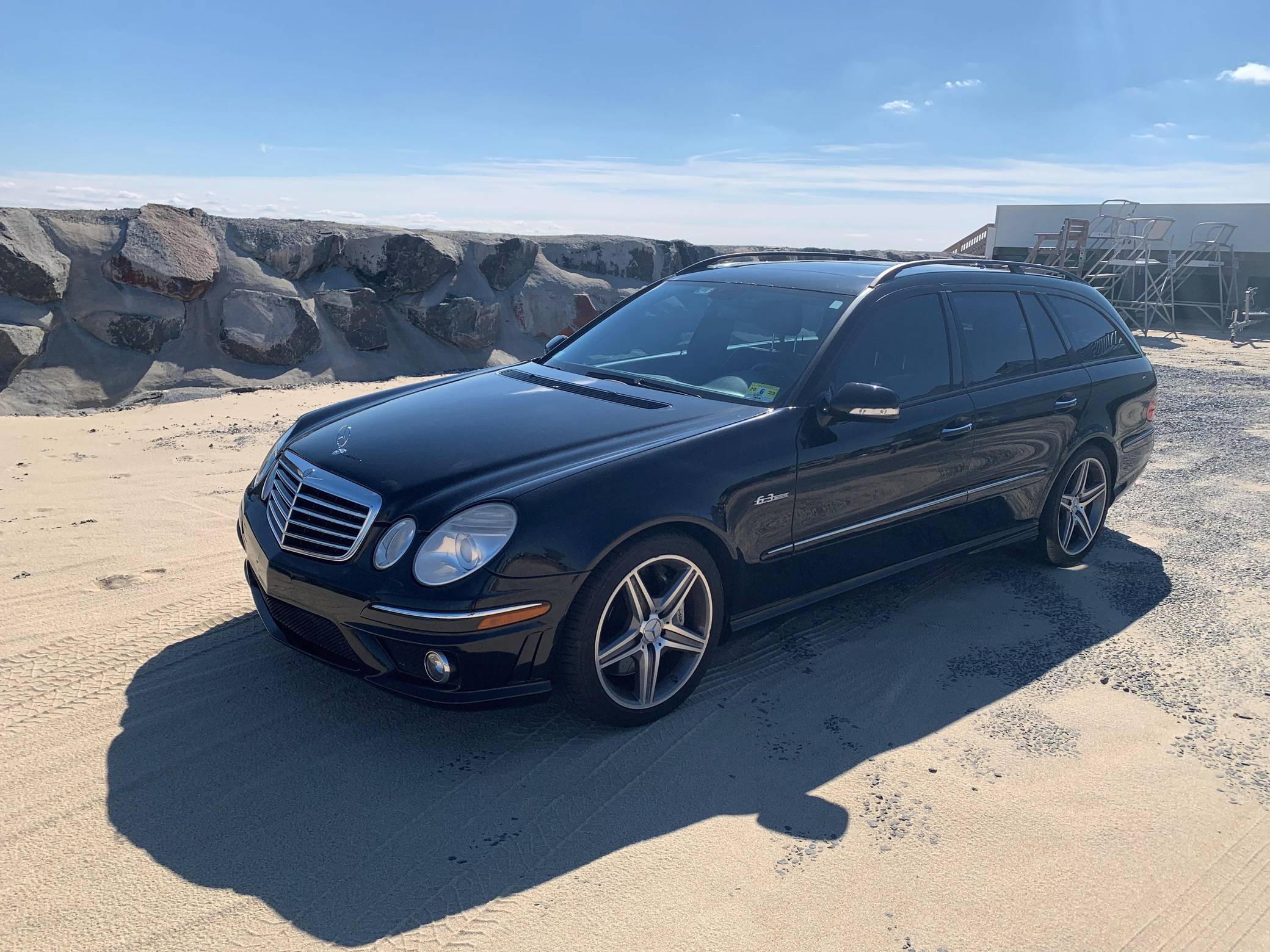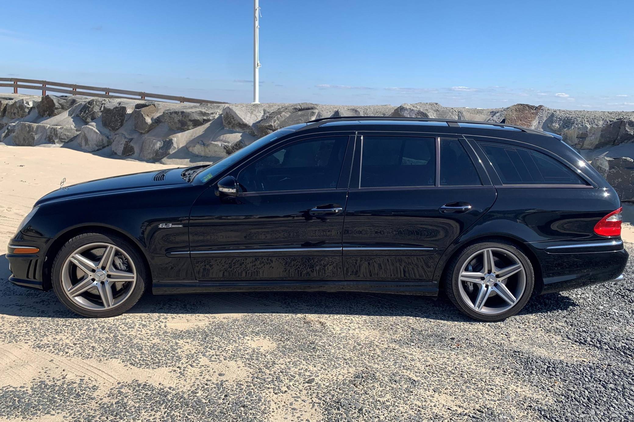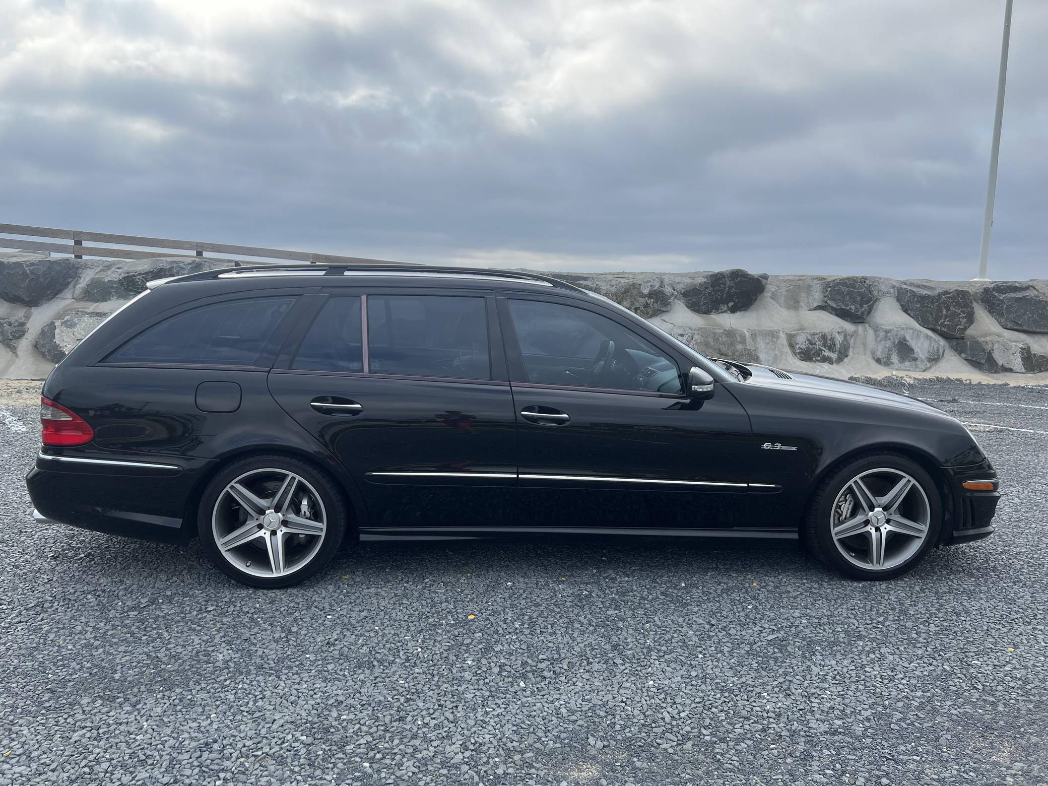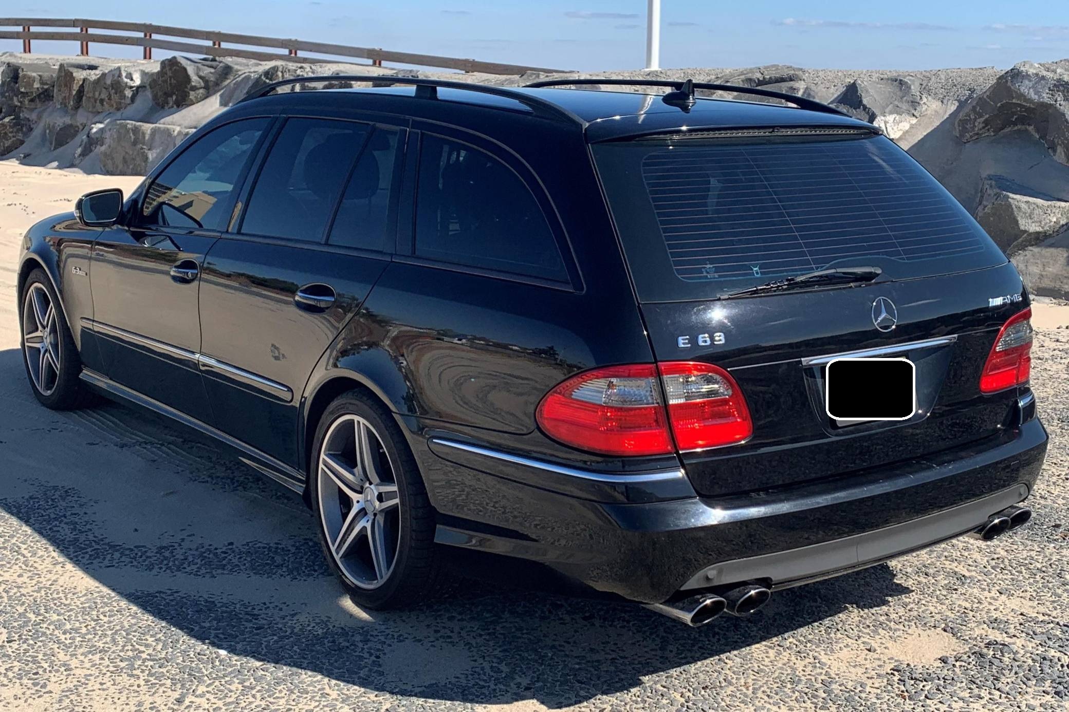 2009 Mercedes-Benz E63 AMG Wagon, finished in black with a black interior. Factory equipment includes the 18-inch wheels, Airmatic air suspension, the AMG Styling Package, a power sunroof, leather upholstery, heated, cooled, and power-adjustable multi-contour front seats, a rear-facing third-row seat, rear door sunshades, and a power tailgate. Modifications reported by the seller are limited to a Stargard GPS tracking system and tinted windows. According to the seller, the head bolts have been replaced on this E63 under previous ownership. Service documentation in the gallery shows that a shop checked the head bolts in December 2020 and performed additional maintenance including a B-Service. A Vehicle Master Inquiry (VMI) report is also included in the photo gallery. In the United States, the "S211" E63 AMG wagon was a special-order model that Mercedes-Benz didn't list in its factory literature; MBUSA didn't even display the model on its official website. Only 153 units were sold in the US between the 2007 and 2009 model years, according to the company. Power comes from an "M156" 6. 2-liter V8, rated at 507 horsepower and 465 lb-ft of torque. Output is sent to the rear wheels through a 7-speed automatic transmission.