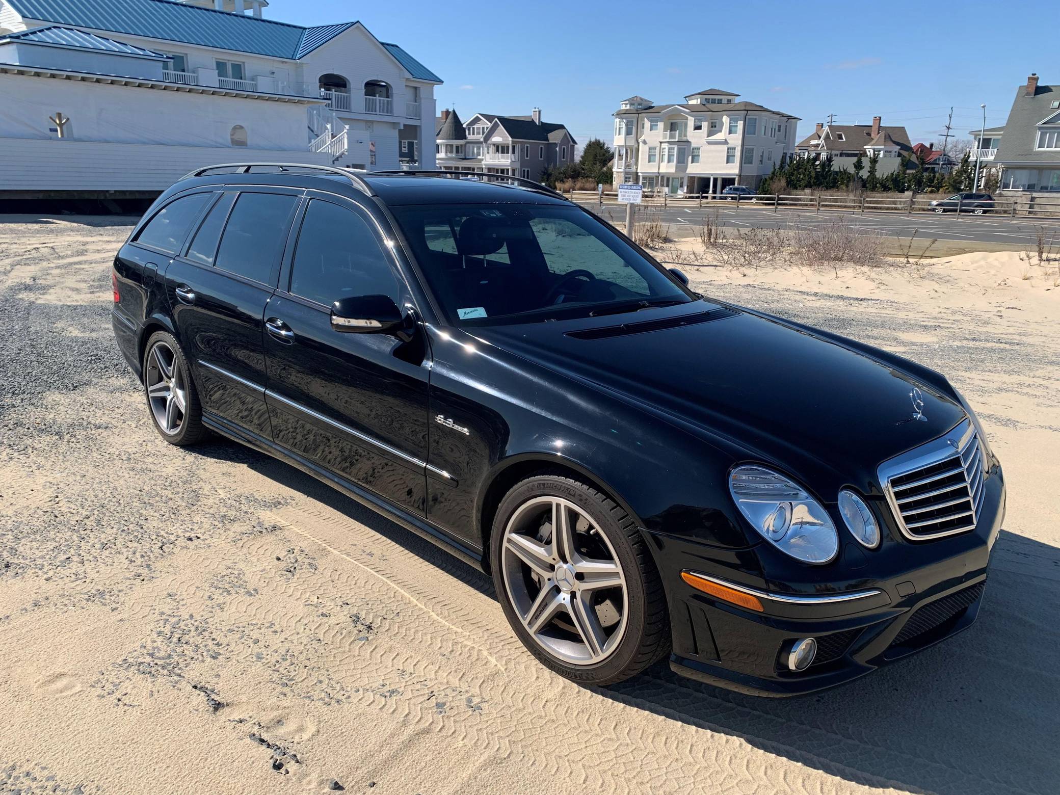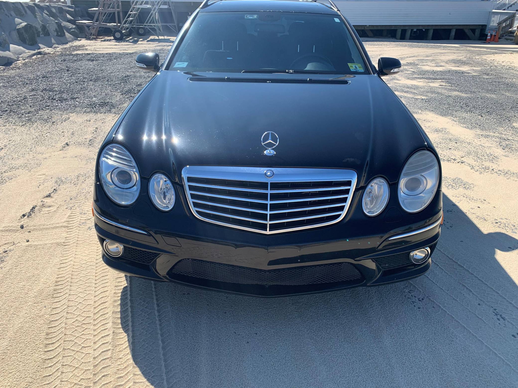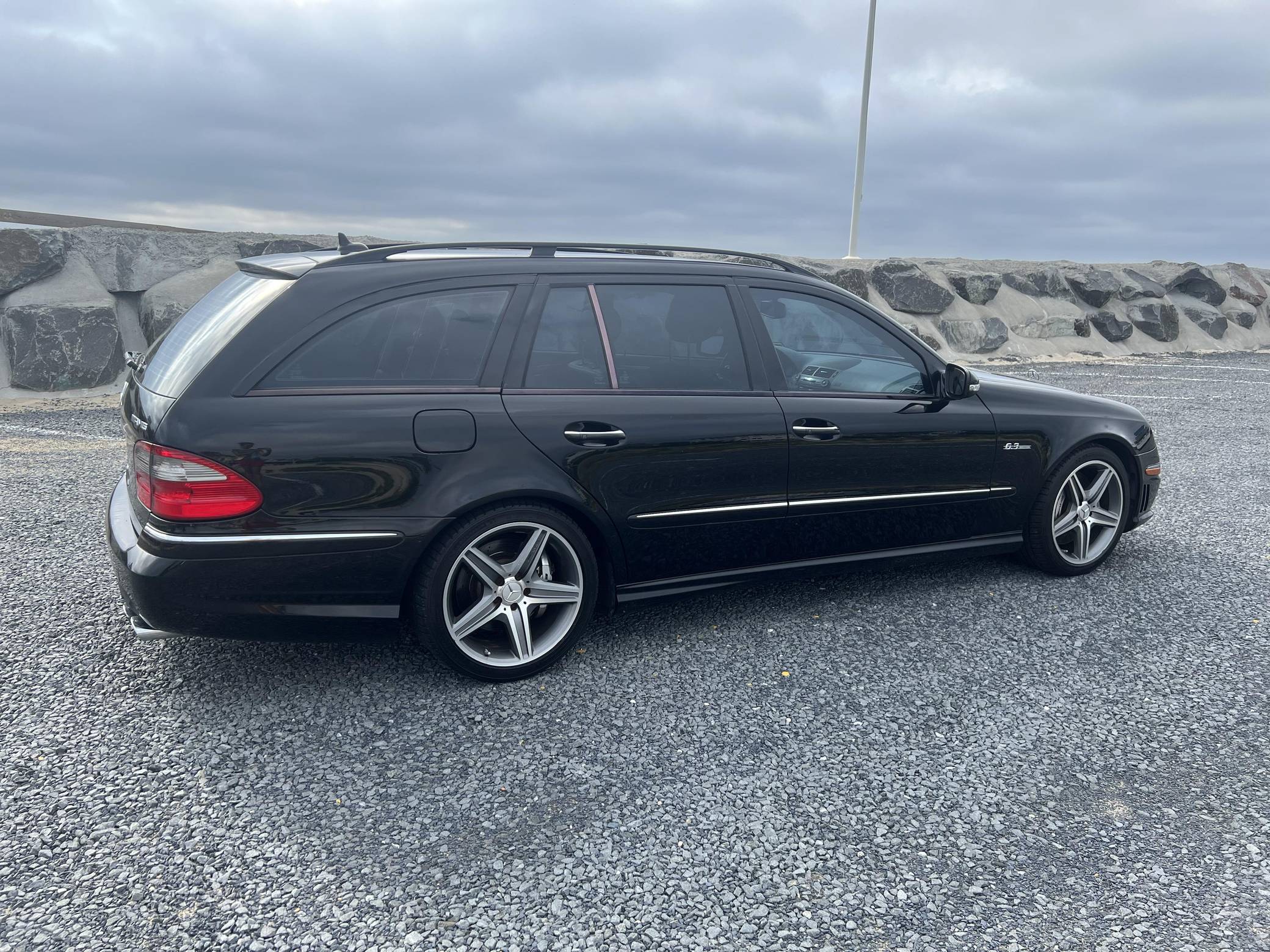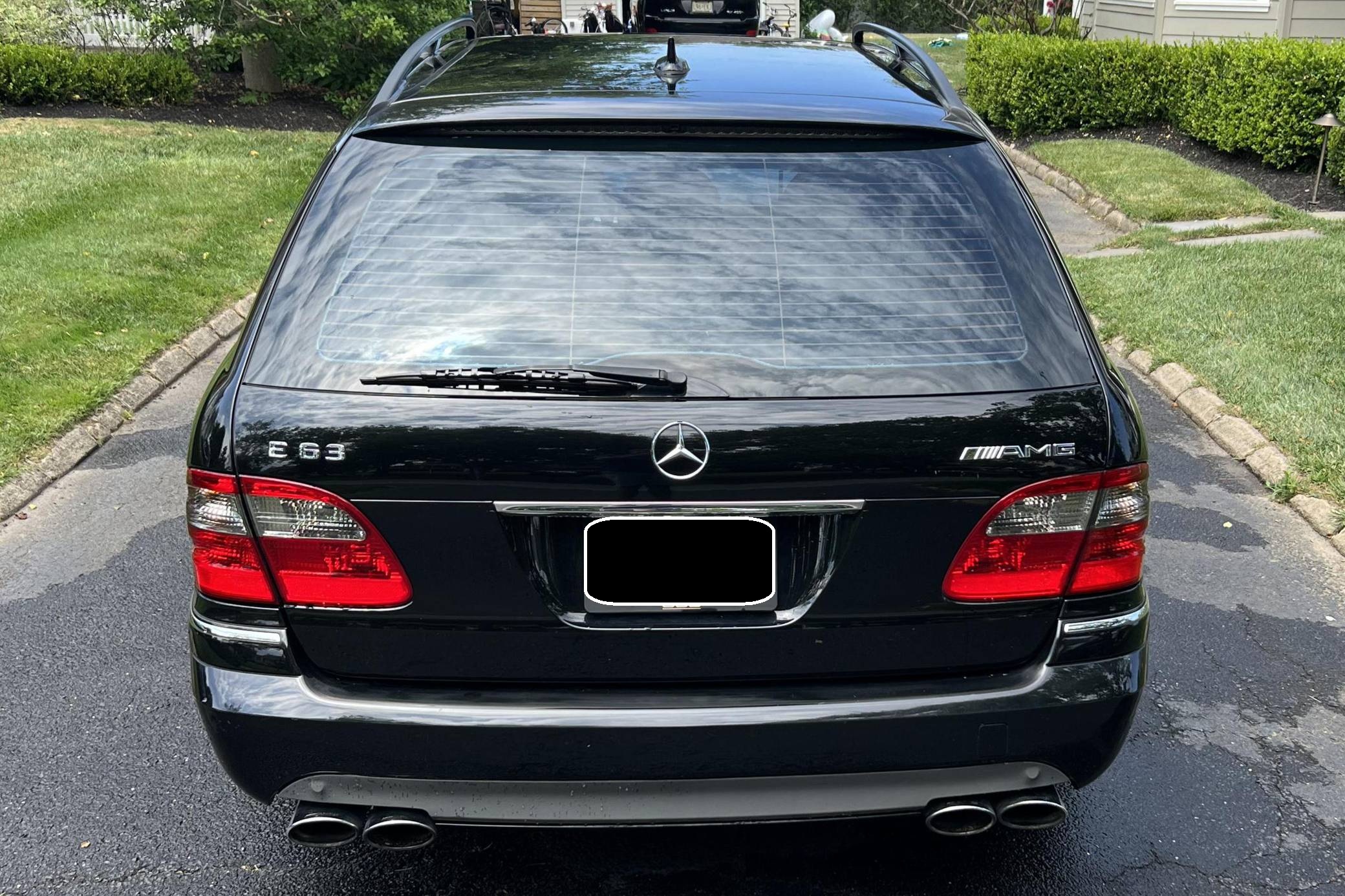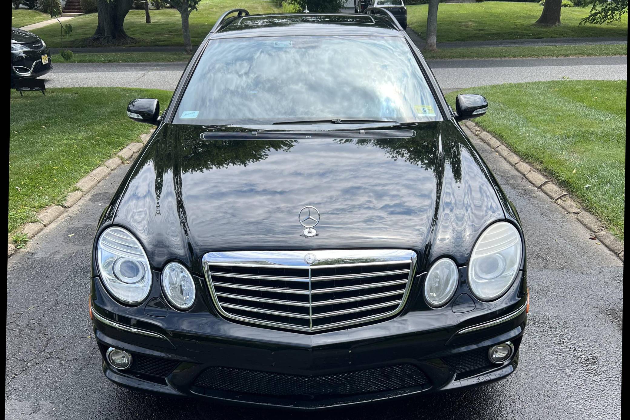 2009 Mercedes-Benz E63 AMG Wagon, finished in black with a black interior. Factory equipment includes the 18-inch wheels, Airmatic air suspension, the AMG Styling Package, a power sunroof, leather upholstery, heated, cooled, and power-adjustable multi-contour front seats, a rear-facing third-row seat, rear door sunshades, and a power tailgate. Modifications reported by the seller are limited to a Stargard GPS tracking system and tinted windows. According to the seller, the head bolts have been replaced on this E63 under previous ownership. Service documentation in the gallery shows that a shop checked the head bolts in December 2020 and performed additional maintenance including a B-Service. A Vehicle Master Inquiry (VMI) report is also included in the photo gallery. In the United States, the "S211" E63 AMG wagon was a special-order model that Mercedes-Benz didn't list in its factory literature; MBUSA didn't even display the model on its official website. Only 153 units were sold in the US between the 2007 and 2009 model years, according to the company. Power comes from an "M156" 6. 2-liter V8, rated at 507 horsepower and 465 lb-ft of torque. Output is sent to the rear wheels through a 7-speed automatic transmission.