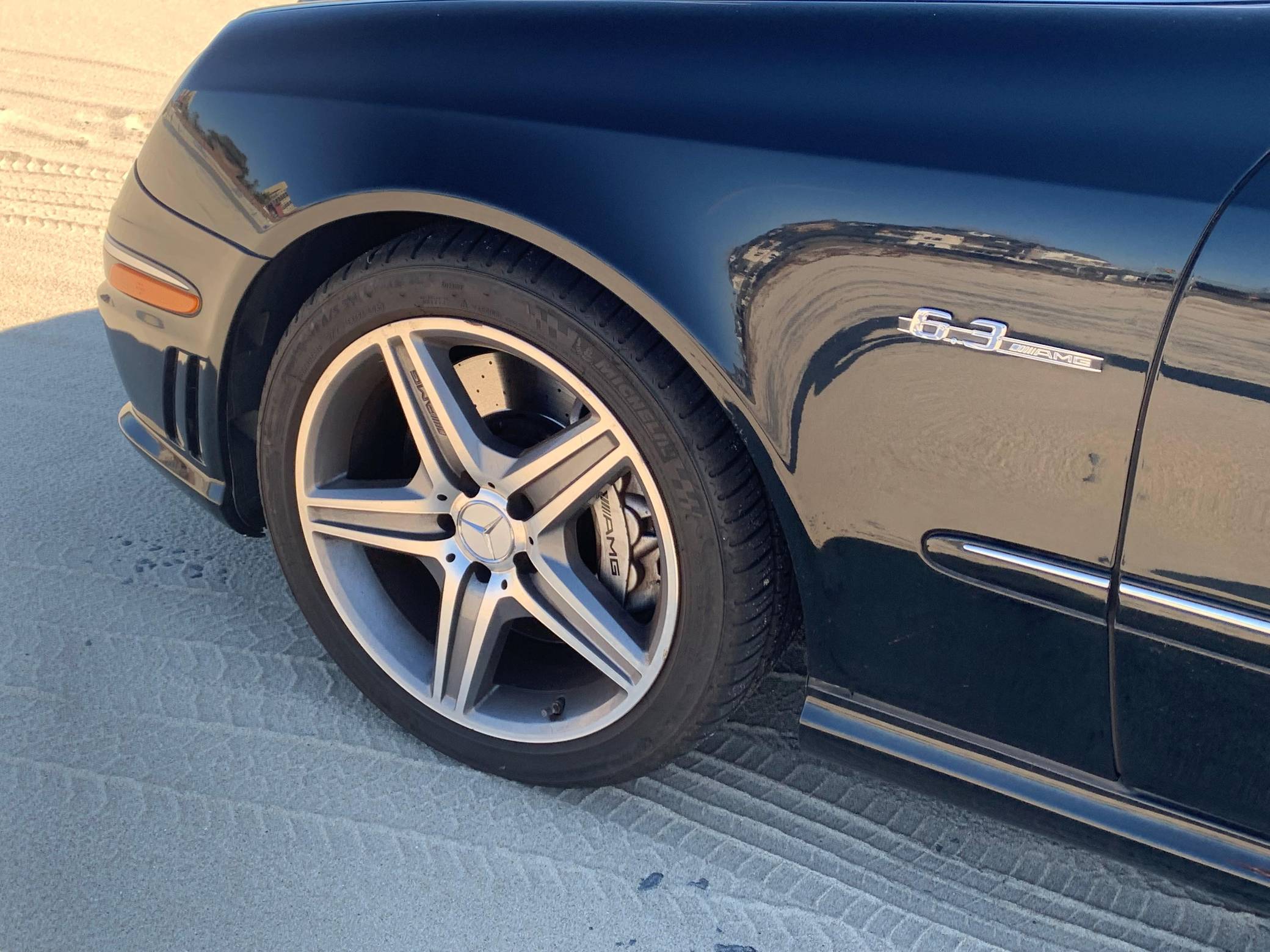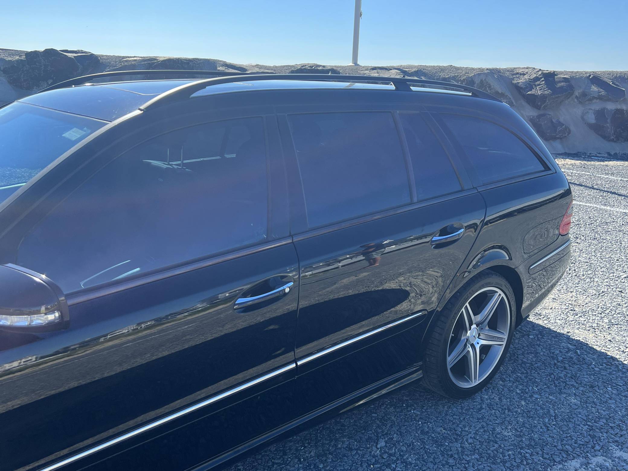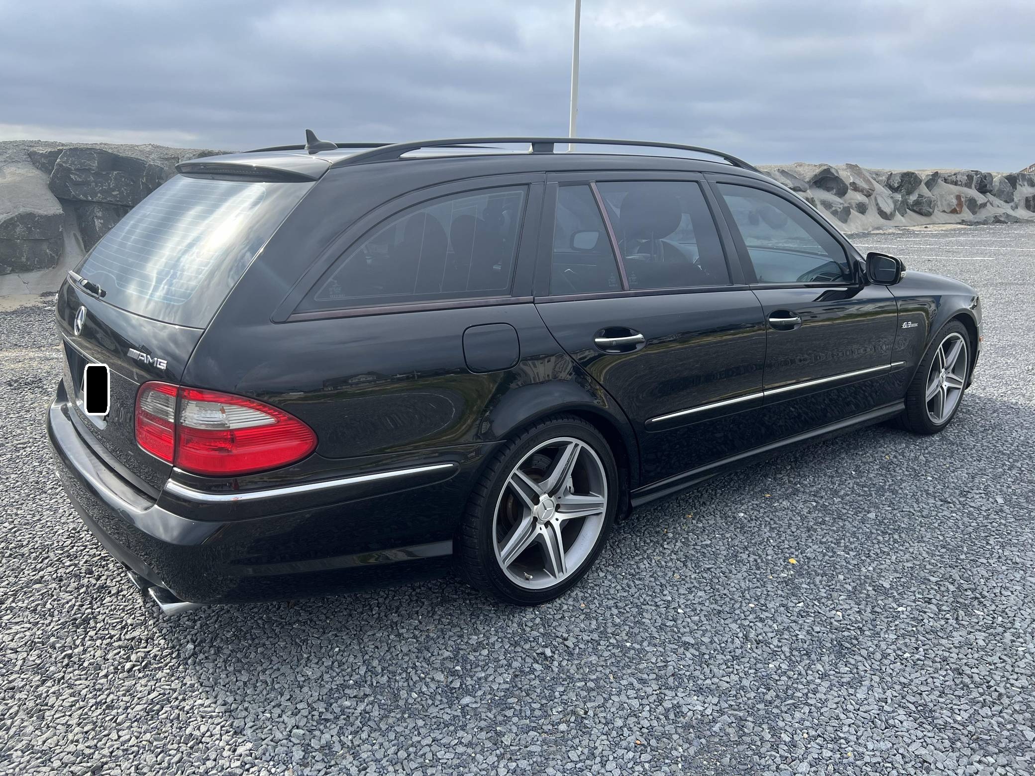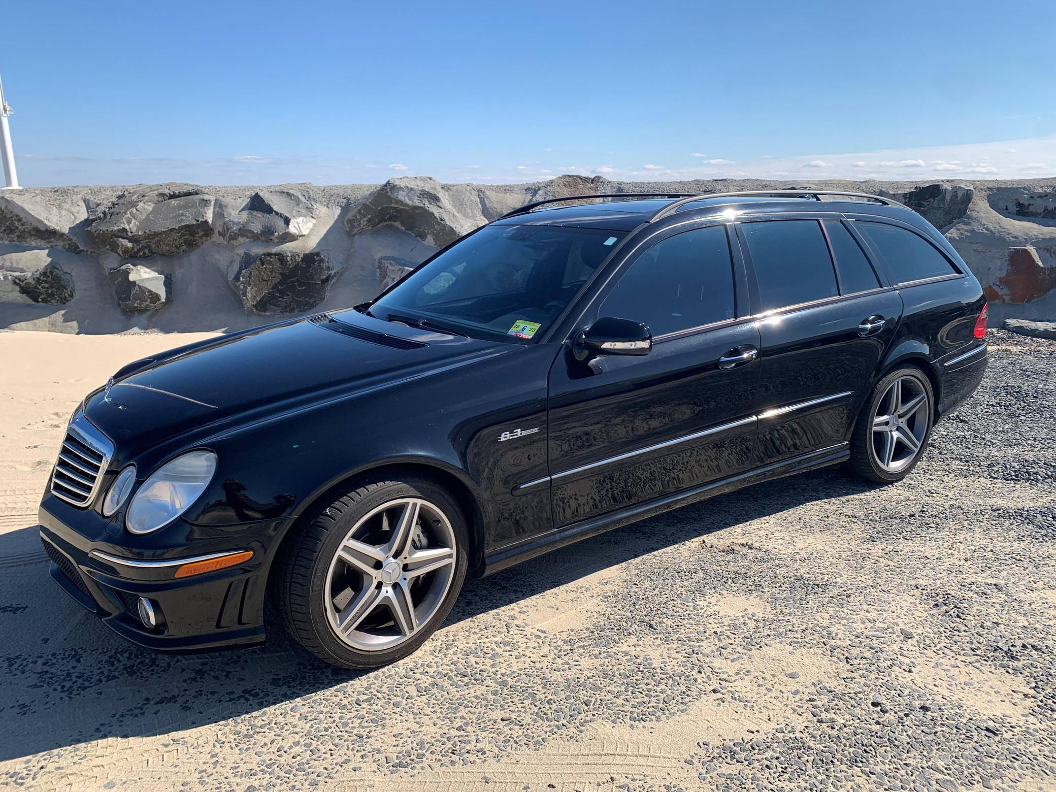 2009 Mercedes-Benz E63 AMG Wagon, finished in black with a black interior. Factory equipment includes the 18-inch wheels, Airmatic air suspension, the AMG Styling Package, a power sunroof, leather upholstery, heated, cooled, and power-adjustable multi-contour front seats, a rear-facing third-row seat, rear door sunshades, and a power tailgate. Modifications reported by the seller are limited to a Stargard GPS tracking system and tinted windows. According to the seller, the head bolts have been replaced on this E63 under previous ownership. Service documentation in the gallery shows that a shop checked the head bolts in December 2020 and performed additional maintenance including a B-Service. A Vehicle Master Inquiry (VMI) report is also included in the photo gallery. In the United States, the "S211" E63 AMG wagon was a special-order model that Mercedes-Benz didn't list in its factory literature; MBUSA didn't even display the model on its official website. Only 153 units were sold in the US between the 2007 and 2009 model years, according to the company. Power comes from an "M156" 6. 2-liter V8, rated at 507 horsepower and 465 lb-ft of torque. Output is sent to the rear wheels through a 7-speed automatic transmission.