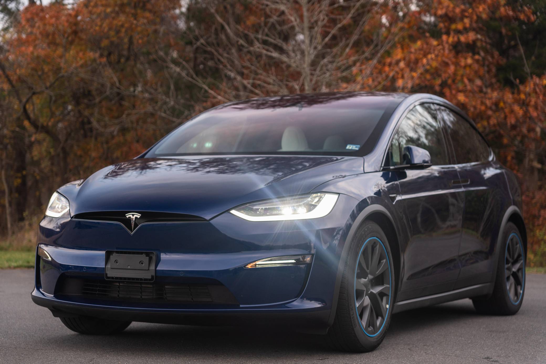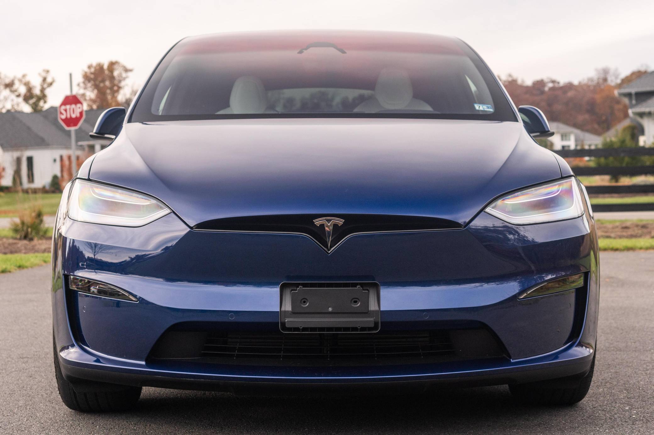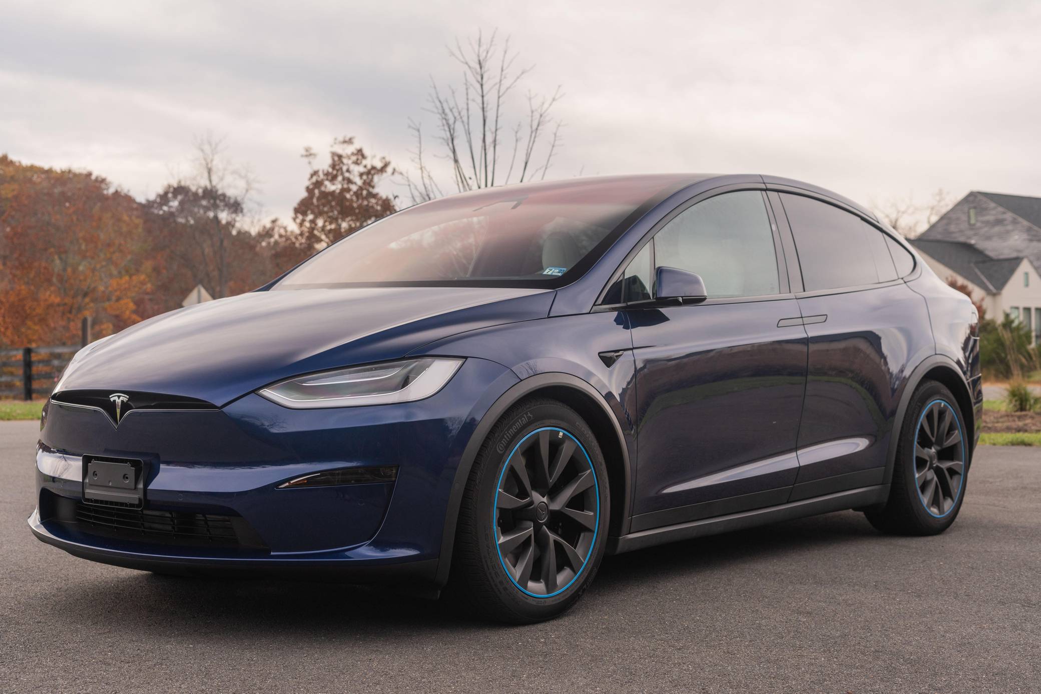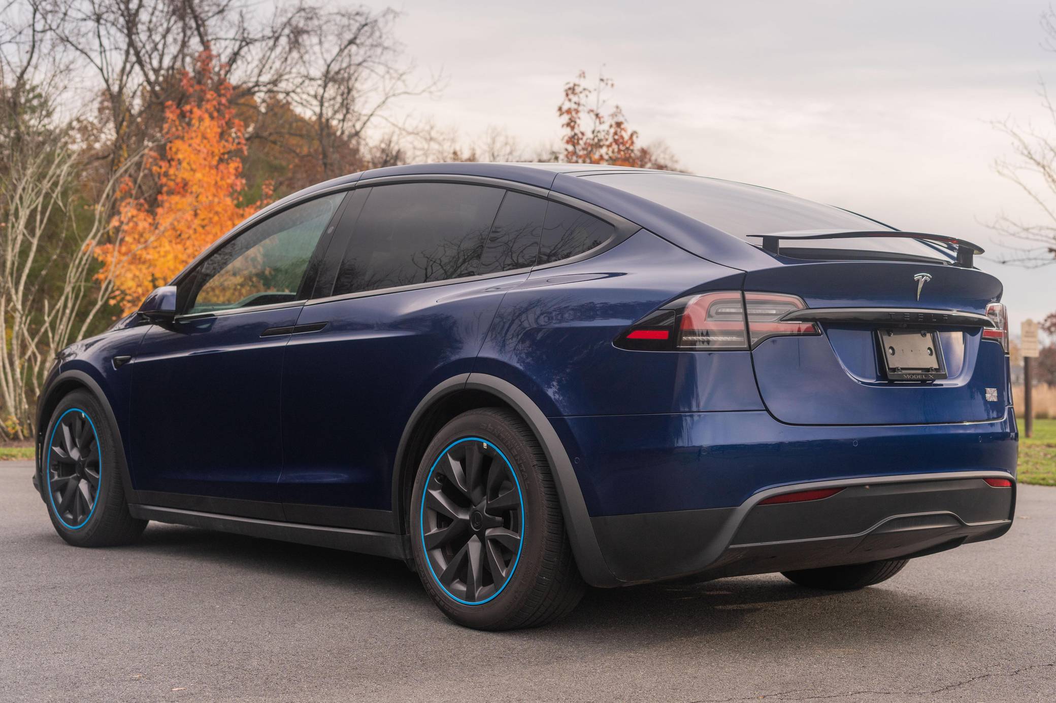 THIS. . . is a 2022 Tesla Model X Plaid, finished in Deep Blue Metallic with a black and white interior. Factory equipment includes 20-inch "Cyberstream" wheels, a rear spoiler, carbon fiber interior trim, heated, ventilated, and power-adjustable front seats, heated second-row seats, heated and folding third-row seats, a Yoke steering wheel, a panoramic windshield, a 17-inch touchscreen for the infotainment system, and a 22-speaker sound system. Modifications reported by the seller are limited to Rimsavers on the wheels. Tesla introduced the Model X for the 2016 model year as a taller, more spacious alternative to the Model S. It stood out from other crossovers with unusual double-hinged falcon rear doors. It has gone through several powertrain and interior evolutions since its launch, and it's still available new today. Power comes from three electric motors, which draw electricity from a 100-kilowatt-hour lithium-ion battery pack to zap the four wheels with 1,020 horsepower. Fitted with 20-inch wheels, the Model X Plaid earned a maximum driving range rating of 333 miles from the EPA.