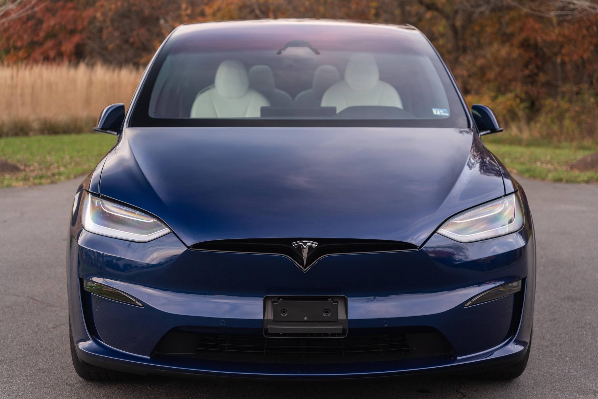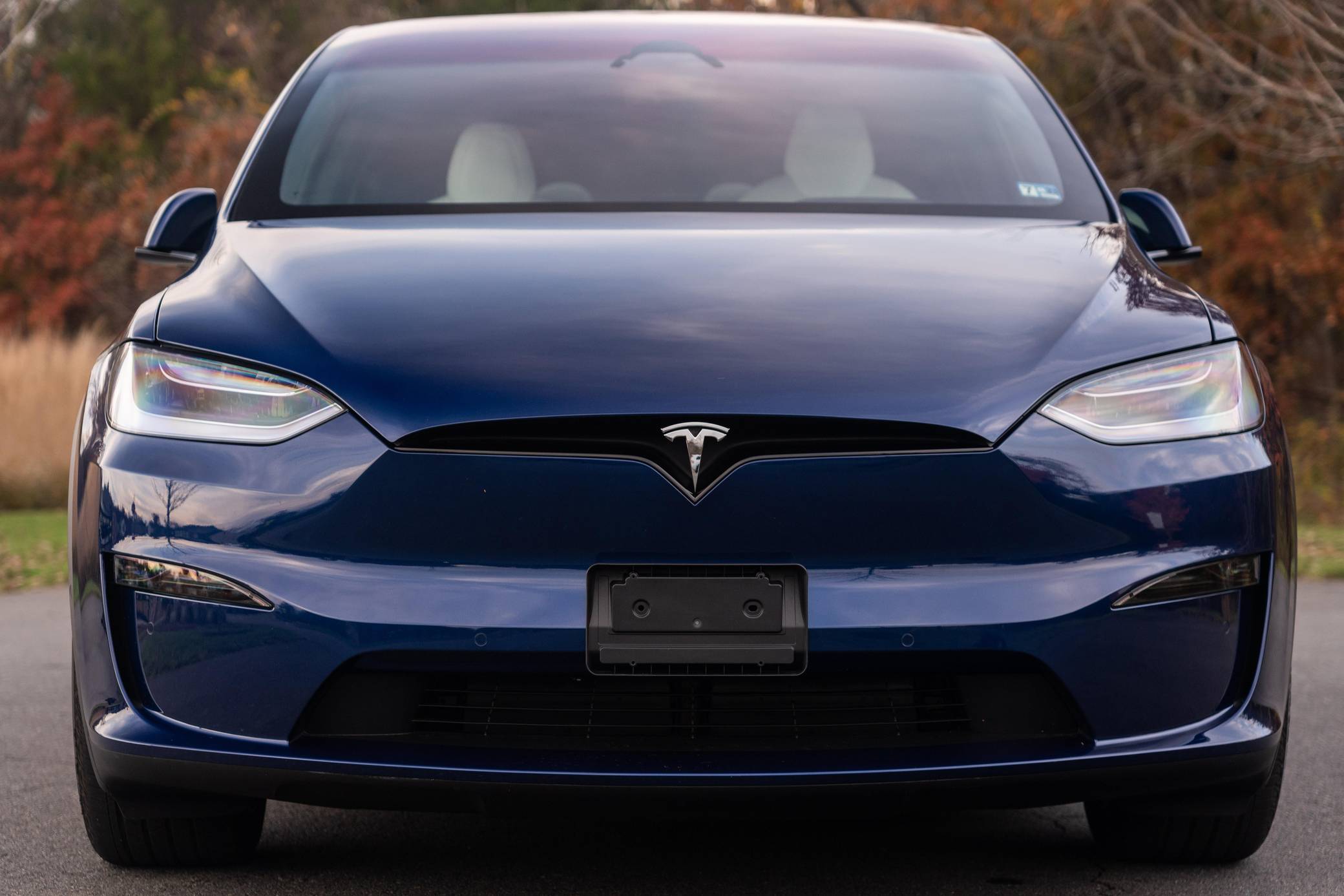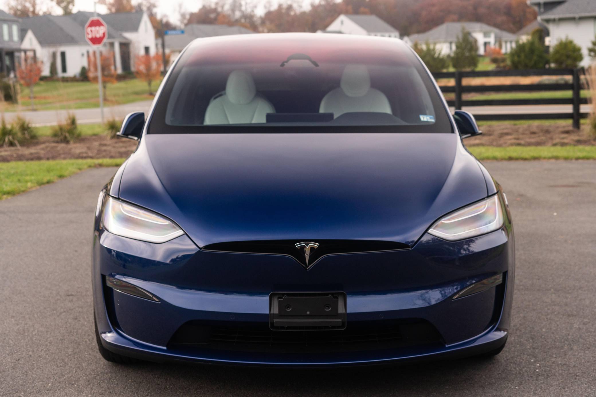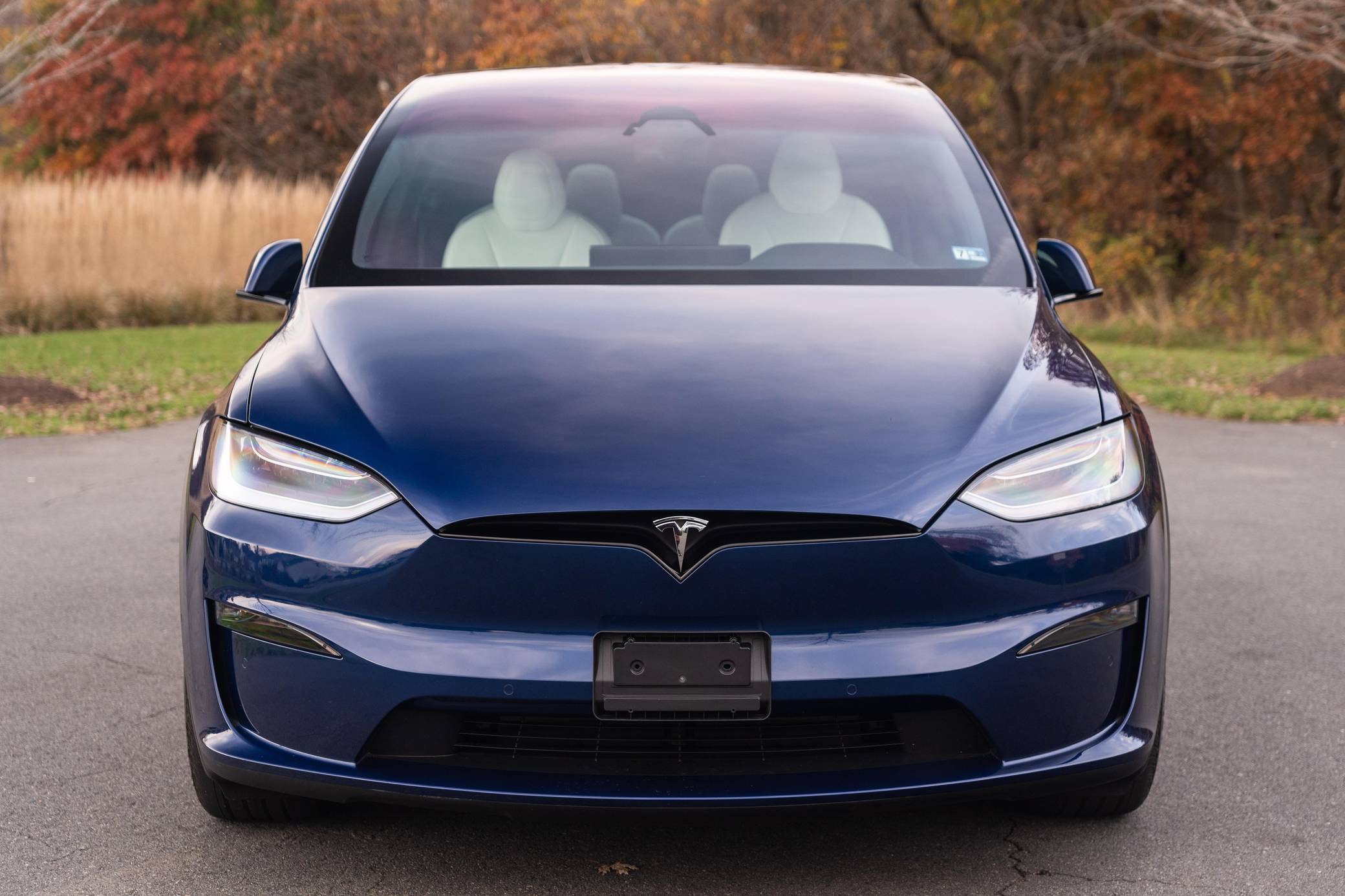 THIS. . . is a 2022 Tesla Model X Plaid, finished in Deep Blue Metallic with a black and white interior. Factory equipment includes 20-inch "Cyberstream" wheels, a rear spoiler, carbon fiber interior trim, heated, ventilated, and power-adjustable front seats, heated second-row seats, heated and folding third-row seats, a Yoke steering wheel, a panoramic windshield, a 17-inch touchscreen for the infotainment system, and a 22-speaker sound system. Modifications reported by the seller are limited to Rimsavers on the wheels. Tesla introduced the Model X for the 2016 model year as a taller, more spacious alternative to the Model S. It stood out from other crossovers with unusual double-hinged falcon rear doors. It has gone through several powertrain and interior evolutions since its launch, and it's still available new today. Power comes from three electric motors, which draw electricity from a 100-kilowatt-hour lithium-ion battery pack to zap the four wheels with 1,020 horsepower. Fitted with 20-inch wheels, the Model X Plaid earned a maximum driving range rating of 333 miles from the EPA.