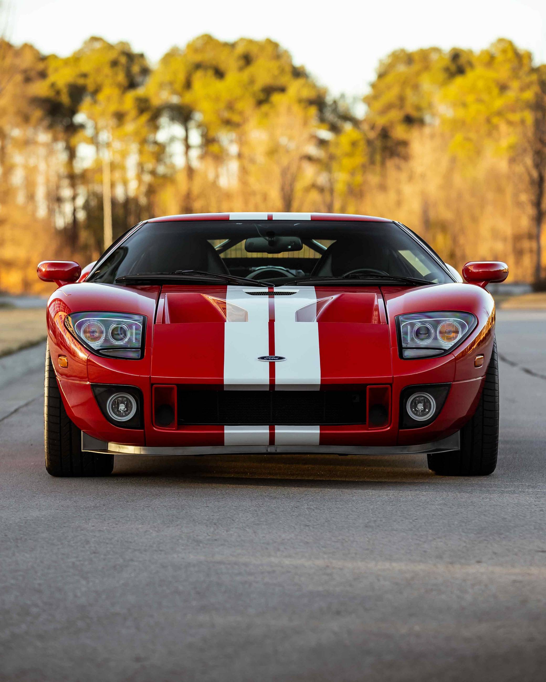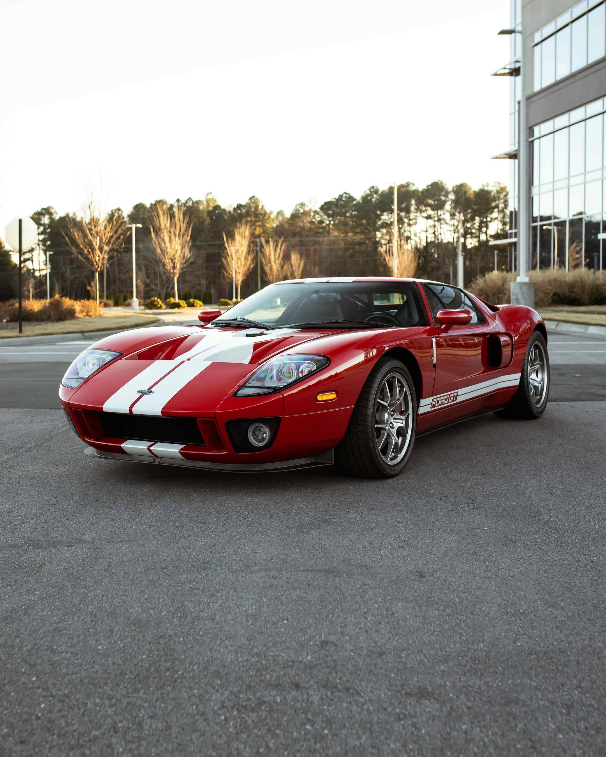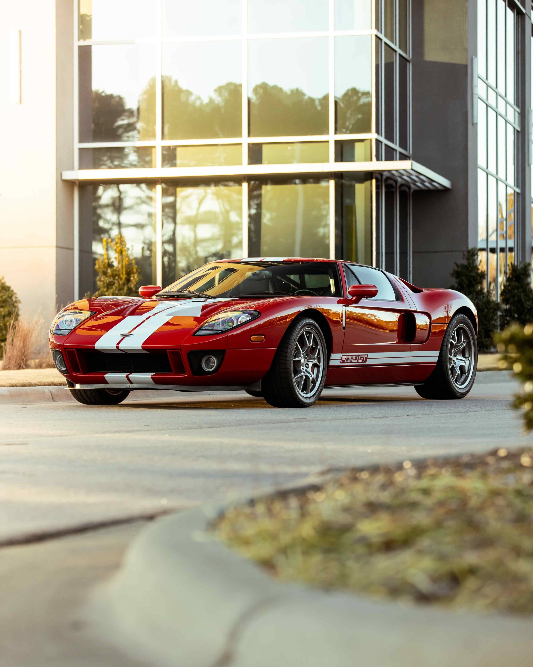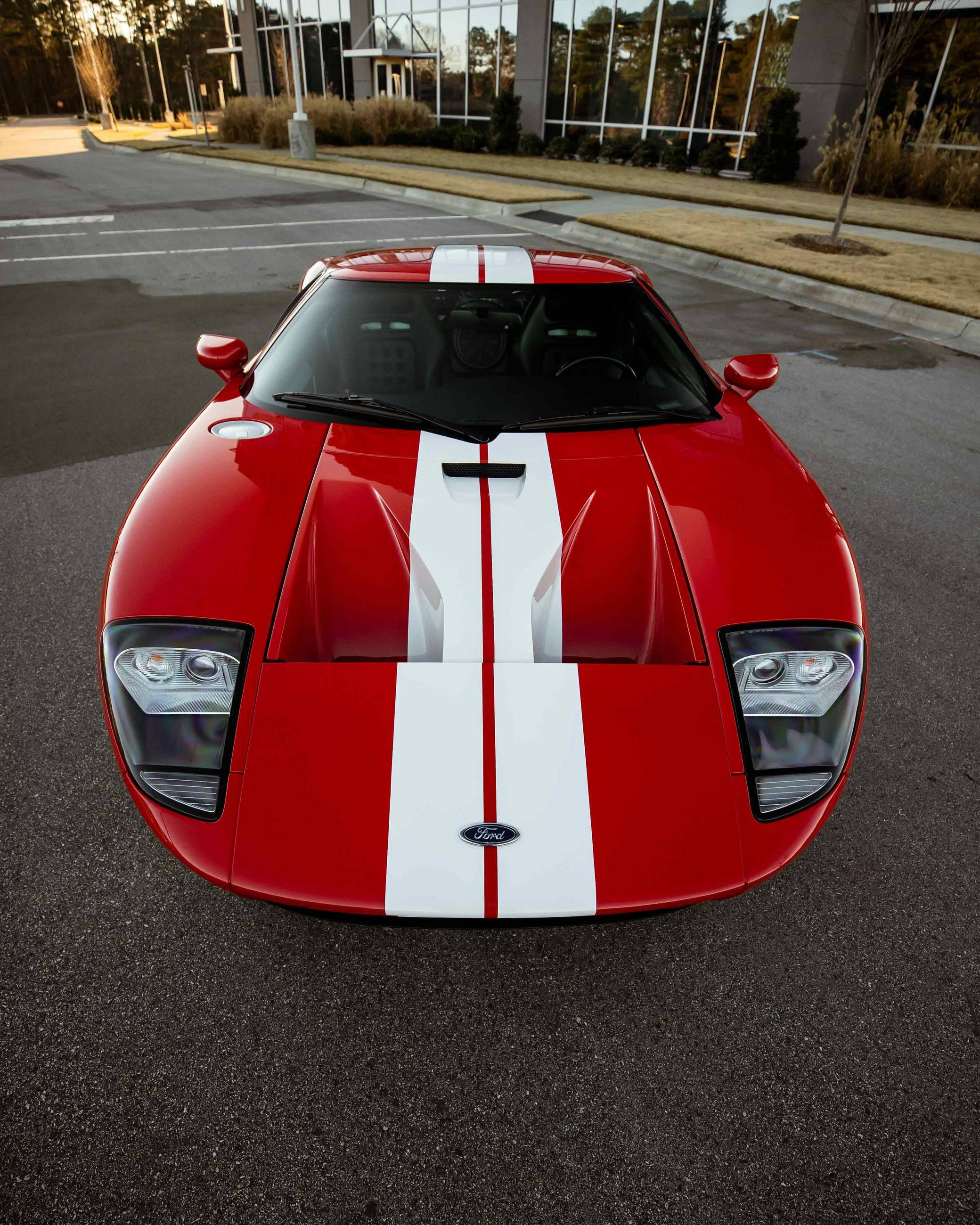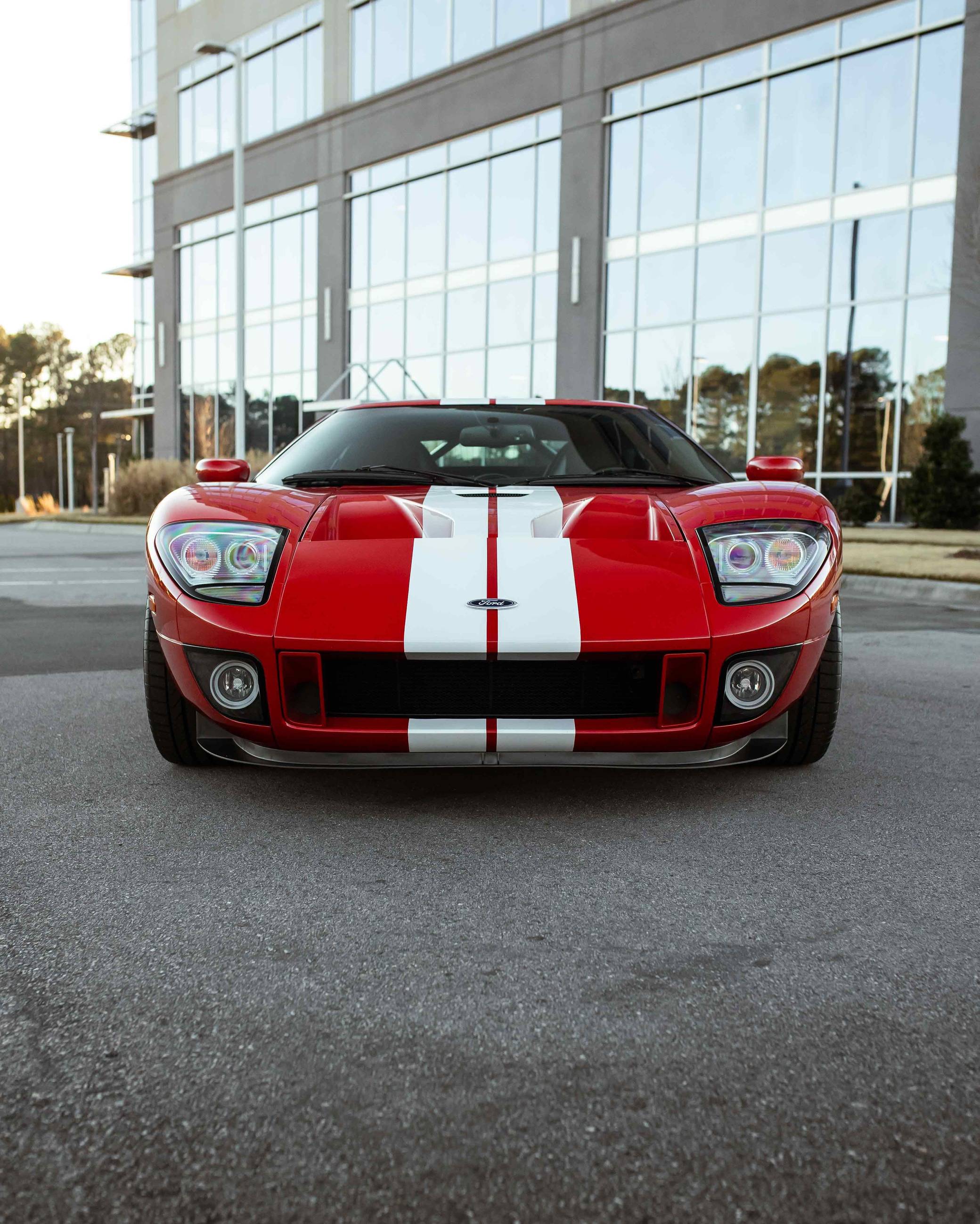 2005 Ford GT, finished in Mark IV Red with an Ebony interior. It's a four-option car equipped with 18-inch front and 19-inch rear lightweight forged aluminum wheels, red brake calipers, painted racing stripes, HID headlights, leather upholstery, and a McIntosh CD player, among other features. Modifications reported by the seller include a smaller supercharger pulley and a Ford Racing exhaust system. This GT's rear bumper has been removed as well. An invoice pictured in the gallery shows that Rich Brooks performed a major service on this GT in September 2021. The fluids, spark plugs, and tires were notably changed. This GT also received a $16,623 detailing service in June 2022. Ford rekindled its rivalry with Ferrari when it rebooted the GT for 2005. Inspired by the Le Mans-winning GT40, the limited-production coupe represented America in the supercar segment with a heritage-laced design, a driver-focused interior, and a mid-mounted supercharged V8 engine. Around 4,000 units were built, and Ford retired the GT nameplate until it launched the second-generation model for 2017. Power comes from a 5. 4-liter supercharged V8, rated at 550 horsepower and 500 lb-ft of torque when left stock. The modifications could increase those figures but a dyno sheet is not available. The engine spins the rear wheels via a 6-speed manual transaxle.