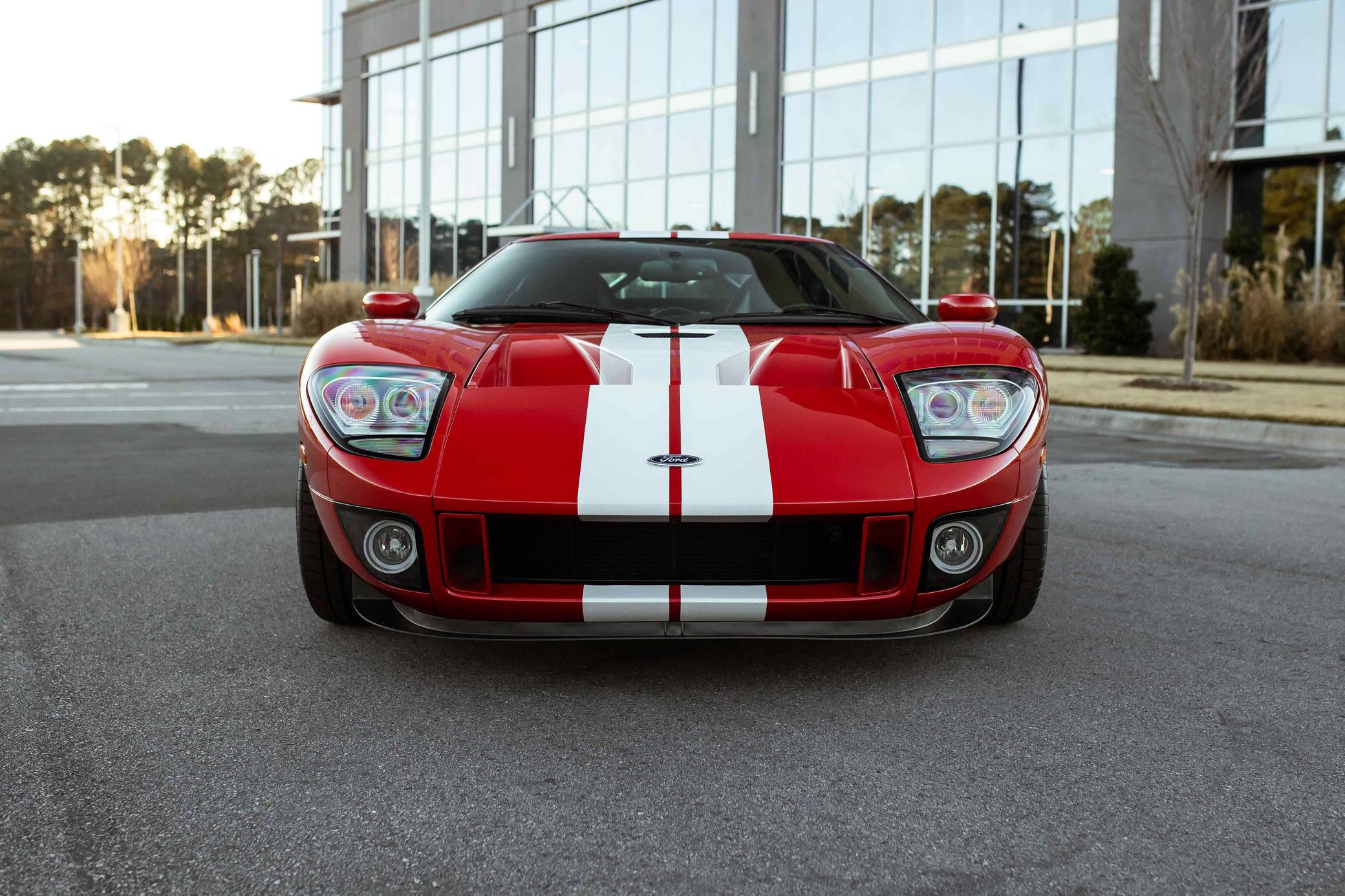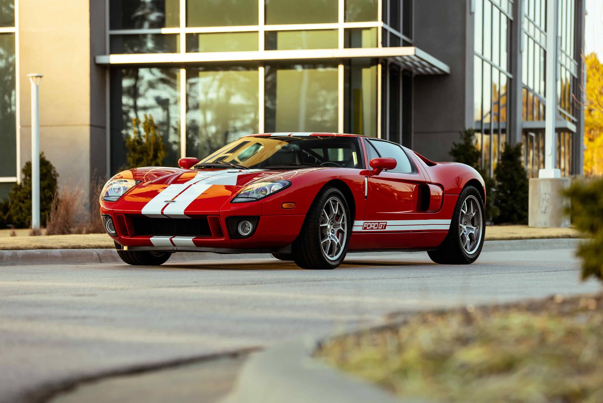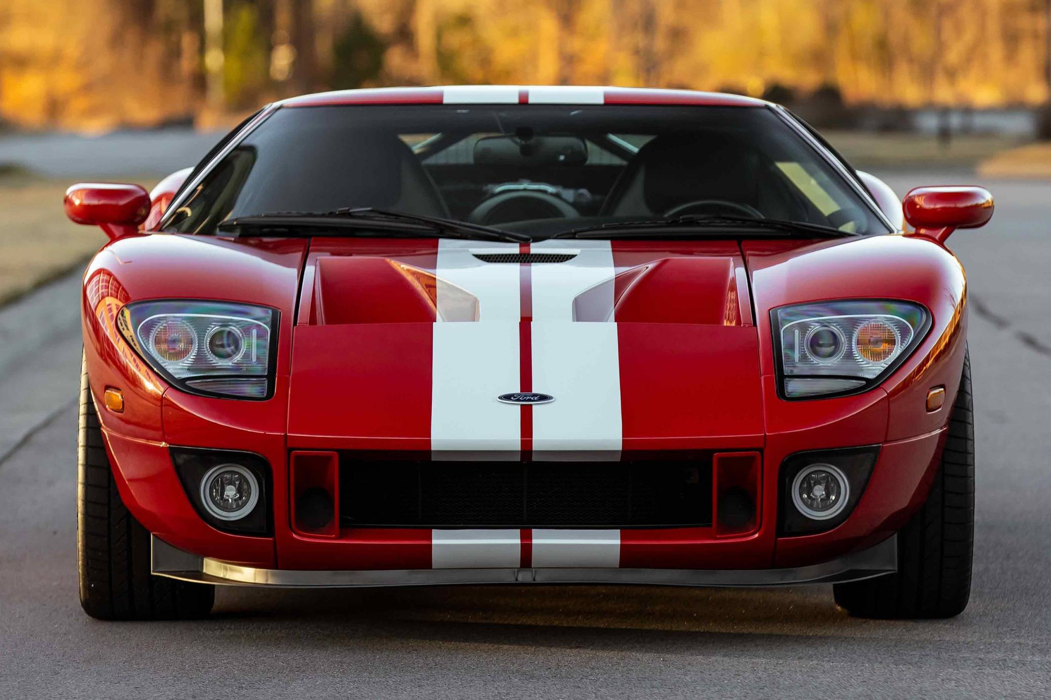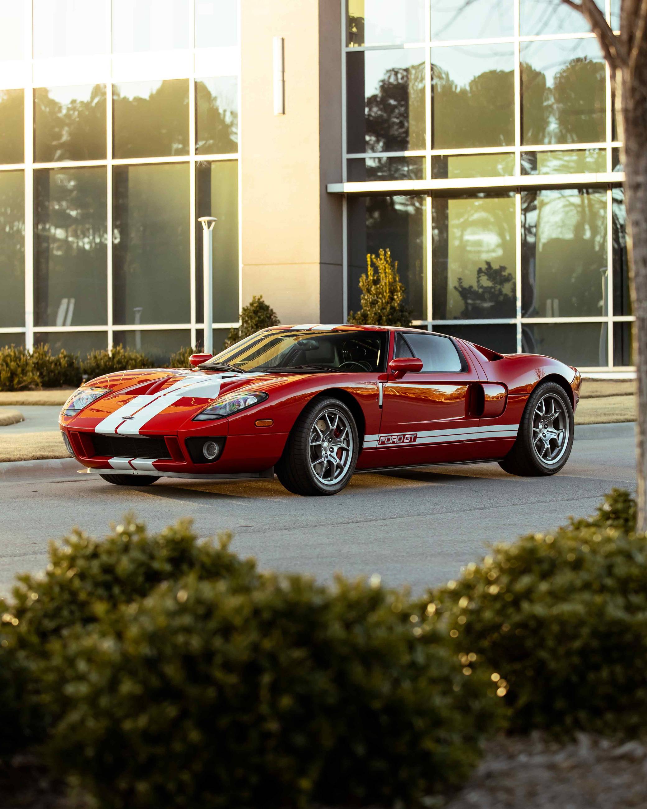2005 Ford GT, finished in Mark IV Red with an Ebony interior. It's a four-option car equipped with 18-inch front and 19-inch rear lightweight forged aluminum wheels, red brake calipers, painted racing stripes, HID headlights, leather upholstery, and a McIntosh CD player, among other features. Modifications reported by the seller include a smaller supercharger pulley and a Ford Racing exhaust system. This GT's rear bumper has been removed as well. An invoice pictured in the gallery shows that Rich Brooks performed a major service on this GT in September 2021. The fluids, spark plugs, and tires were notably changed. This GT also received a $16,623 detailing service in June 2022. Ford rekindled its rivalry with Ferrari when it rebooted the GT for 2005. Inspired by the Le Mans-winning GT40, the limited-production coupe represented America in the supercar segment with a heritage-laced design, a driver-focused interior, and a mid-mounted supercharged V8 engine. Around 4,000 units were built, and Ford retired the GT nameplate until it launched the second-generation model for 2017. Power comes from a 5. 4-liter supercharged V8, rated at 550 horsepower and 500 lb-ft of torque when left stock. The modifications could increase those figures but a dyno sheet is not available. The engine spins the rear wheels via a 6-speed manual transaxle.