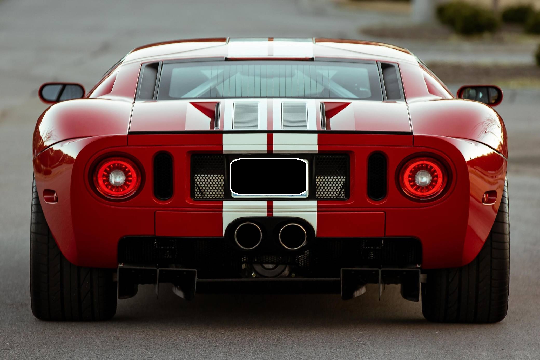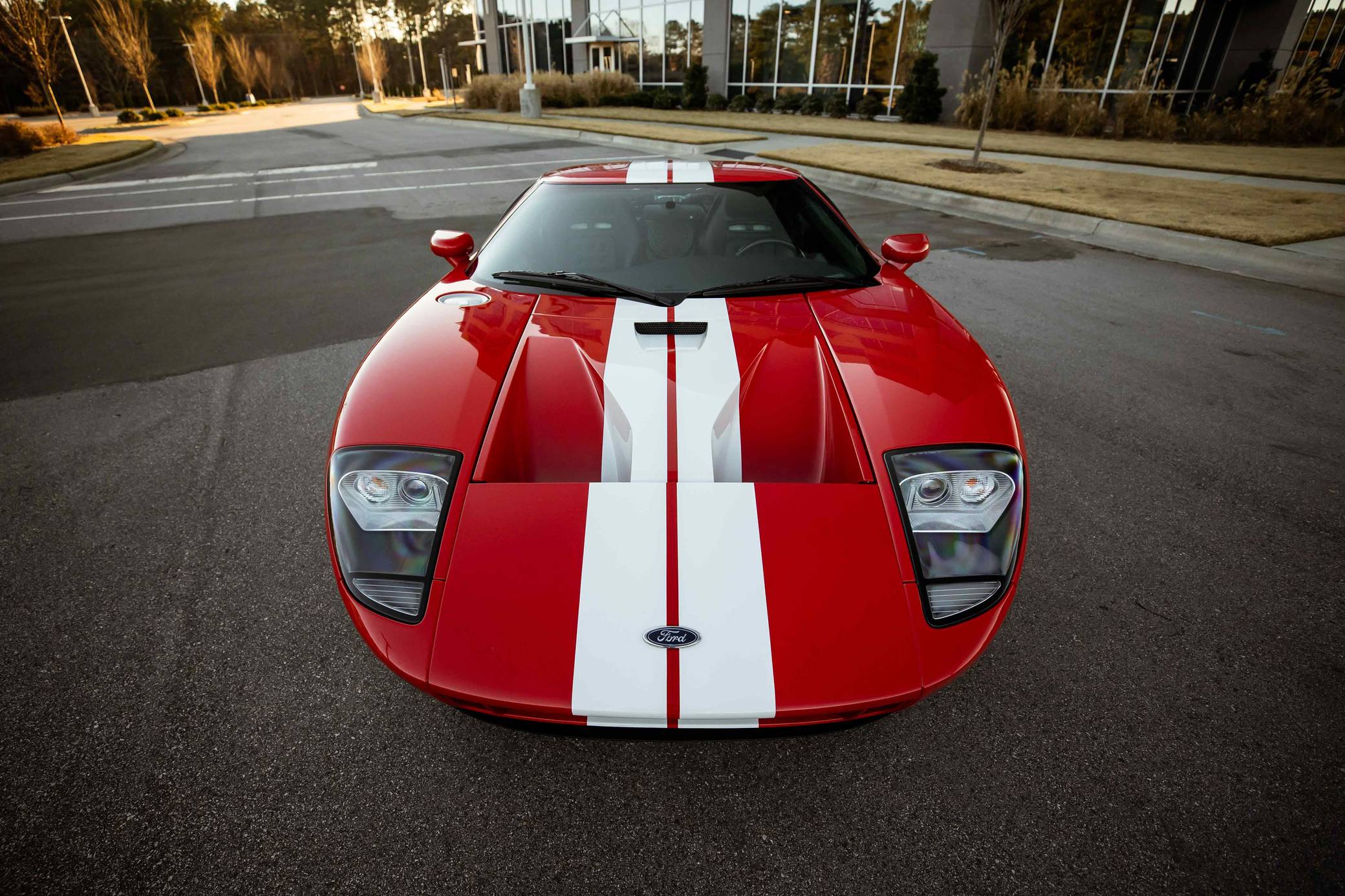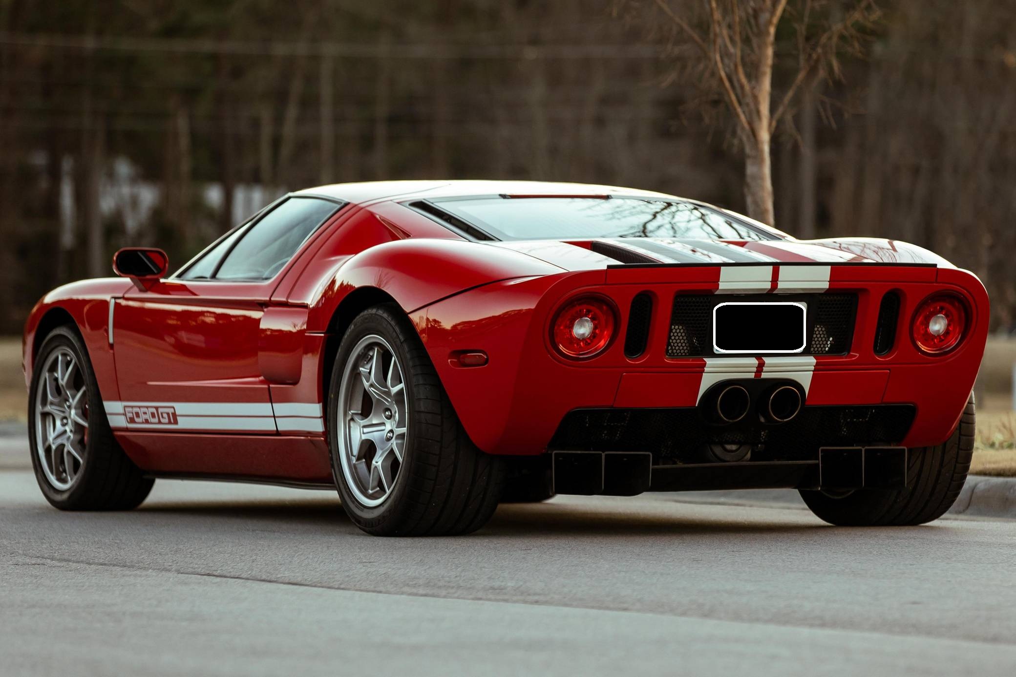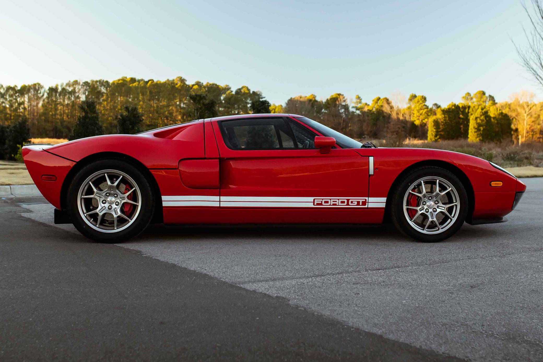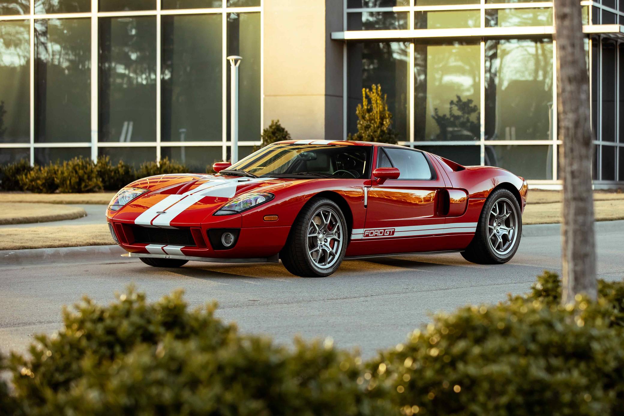2005 Ford GT, finished in Mark IV Red with an Ebony interior. It's a four-option car equipped with 18-inch front and 19-inch rear lightweight forged aluminum wheels, red brake calipers, painted racing stripes, HID headlights, leather upholstery, and a McIntosh CD player, among other features. Modifications reported by the seller include a smaller supercharger pulley and a Ford Racing exhaust system. This GT's rear bumper has been removed as well. An invoice pictured in the gallery shows that Rich Brooks performed a major service on this GT in September 2021. The fluids, spark plugs, and tires were notably changed. This GT also received a $16,623 detailing service in June 2022. Ford rekindled its rivalry with Ferrari when it rebooted the GT for 2005. Inspired by the Le Mans-winning GT40, the limited-production coupe represented America in the supercar segment with a heritage-laced design, a driver-focused interior, and a mid-mounted supercharged V8 engine. Around 4,000 units were built, and Ford retired the GT nameplate until it launched the second-generation model for 2017. Power comes from a 5. 4-liter supercharged V8, rated at 550 horsepower and 500 lb-ft of torque when left stock. The modifications could increase those figures but a dyno sheet is not available. The engine spins the rear wheels via a 6-speed manual transaxle.