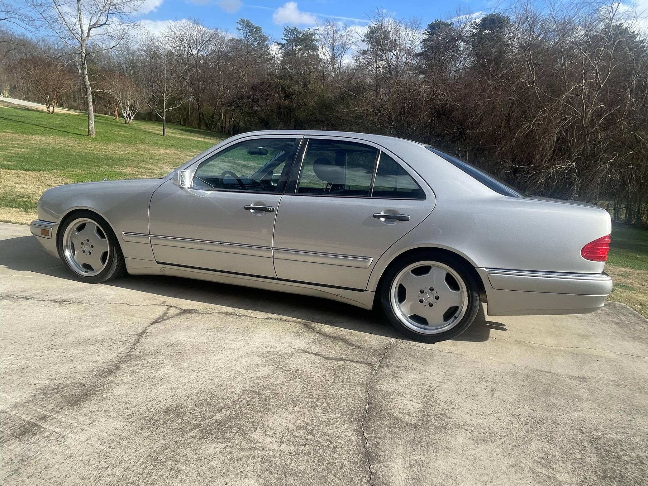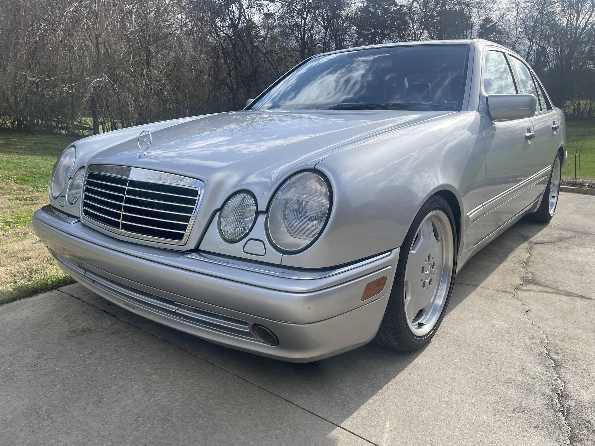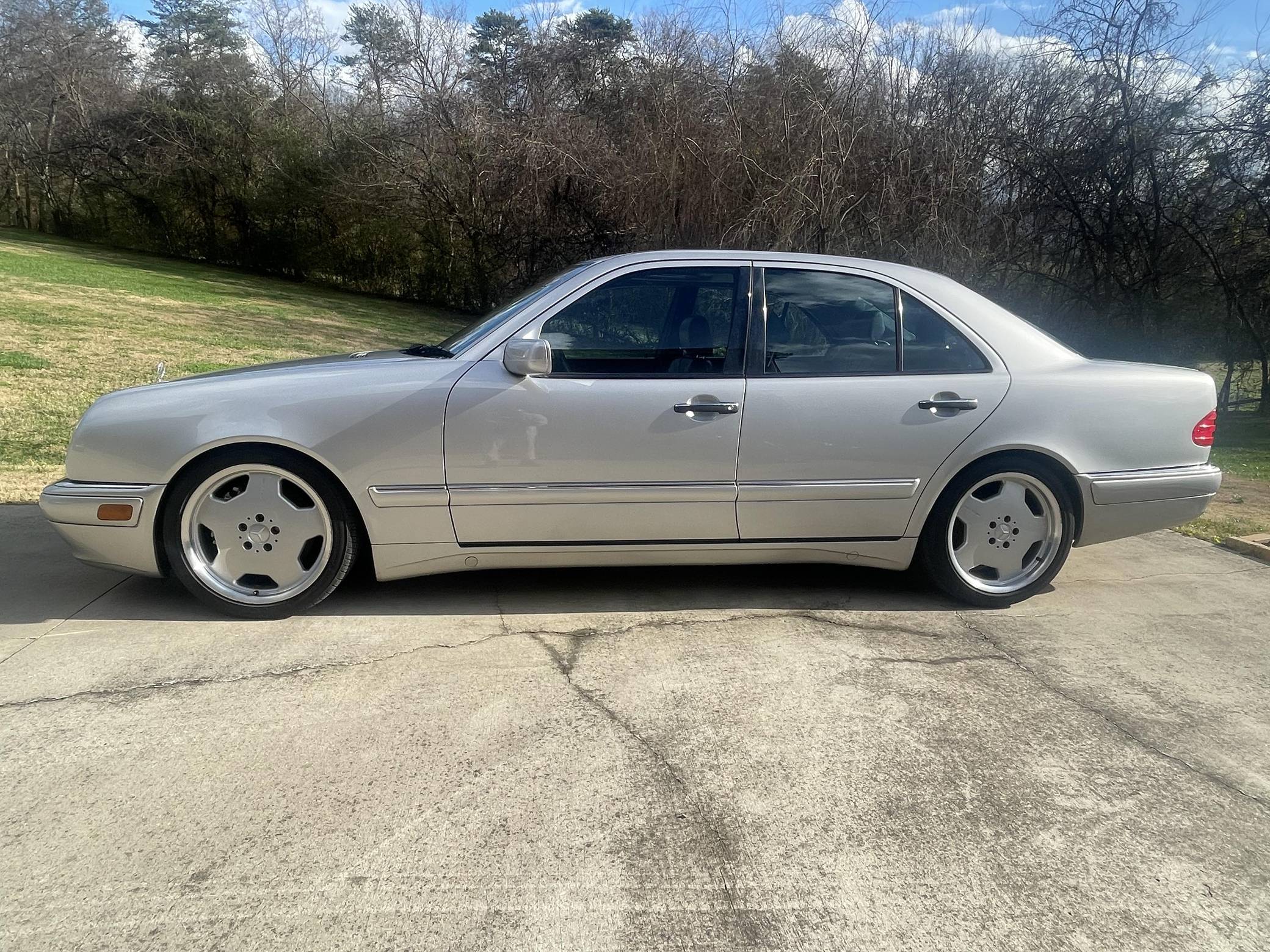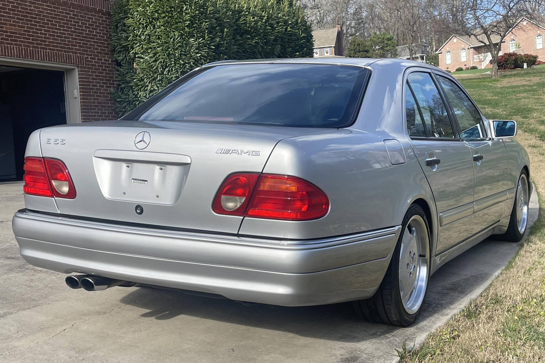 1999 Mercedes-Benz E55 AMG, finished in Brilliant Silver Metallic with a Blueberry interior. The odometer on this E55 currently indicates approximately 52,200 miles. Factory equipment includes 18-inch AMG monoblock wheels, xenon headlights, blue-tinted glass, Exclusive leather upholstery, a power sunroof, a Bose sound system, and more. The seller reports no modifications. The “W210” generation E-Class was introduced for the 1996 model year and was a major stylistic departure from the decade-old “W124”-generation E-Class that preceded it. Instead of the boxy lines and rectangular headlights of its predecessor, the W210 gained a curvier front end with four elliptical headlamps. The high-performance E55 AMG was available for the 1999 to 2002 model years and featured an AMG body kit, sportier suspension, and increased performance over its non-AMG counterparts. Power comes from an AMG-tuned "M113" 5. 4-liter V8, rated at 349 horsepower and 391 lb-ft of torque. Output is sent to the rear wheels via a 5-speed automatic transmission.