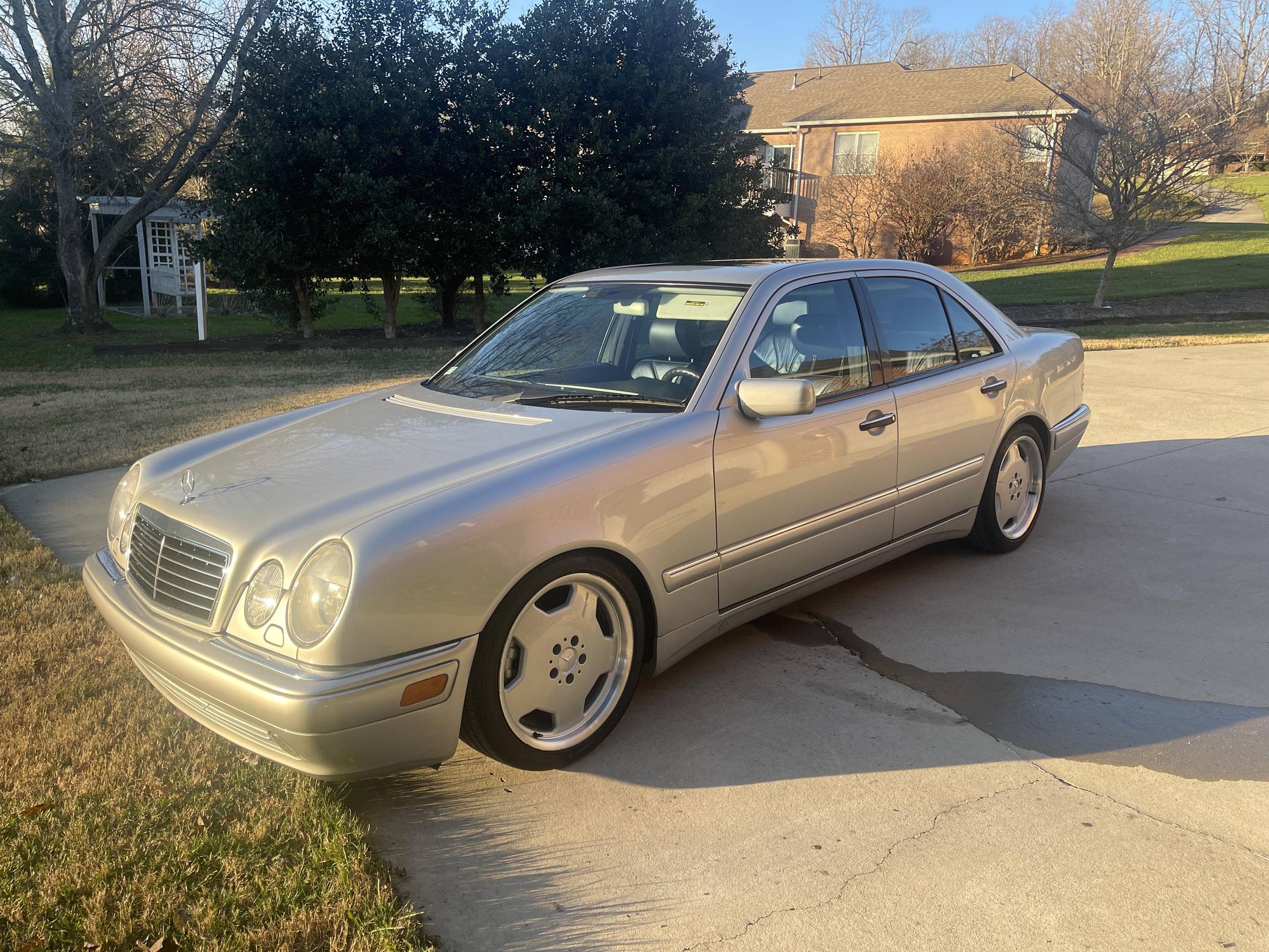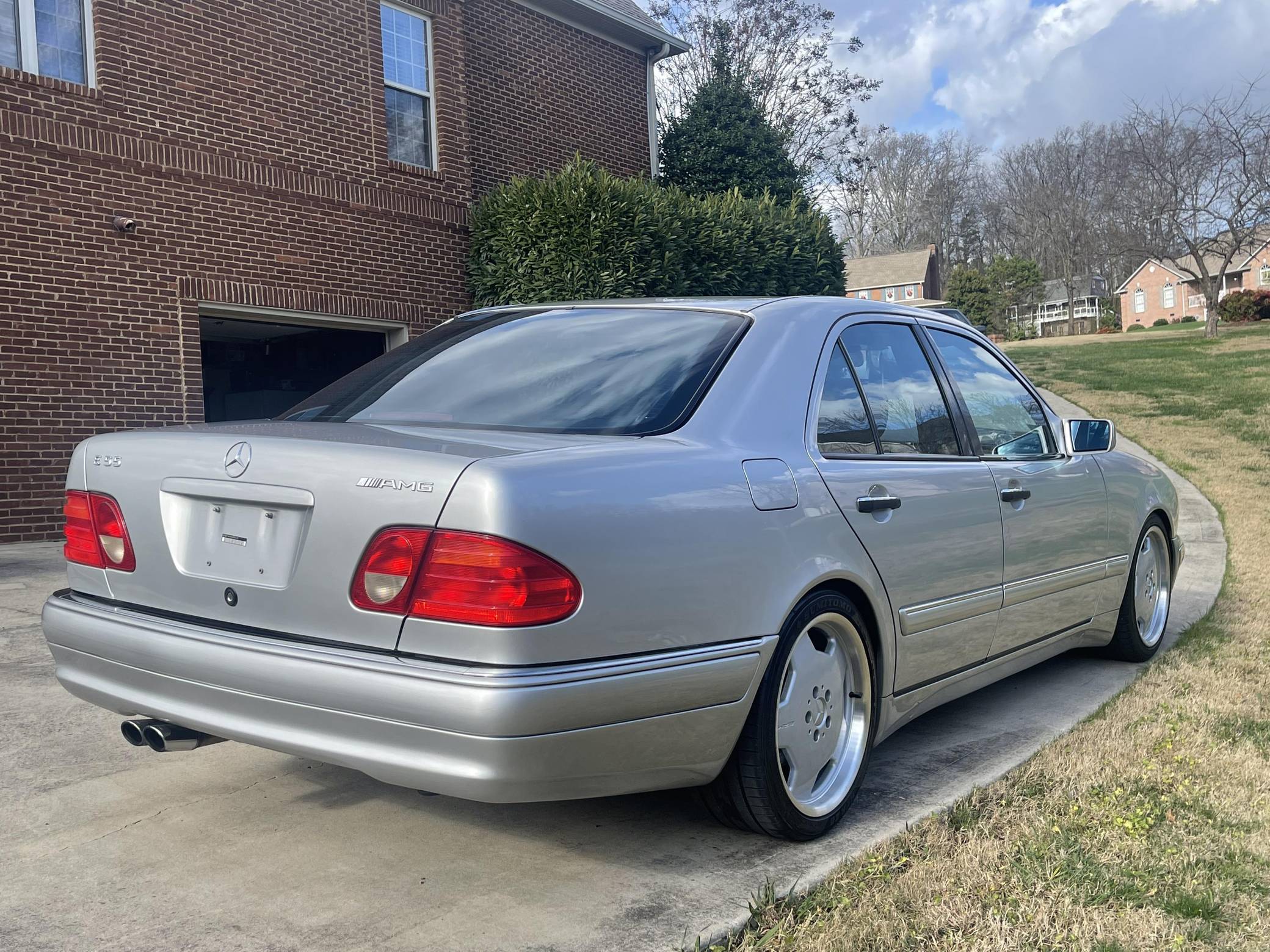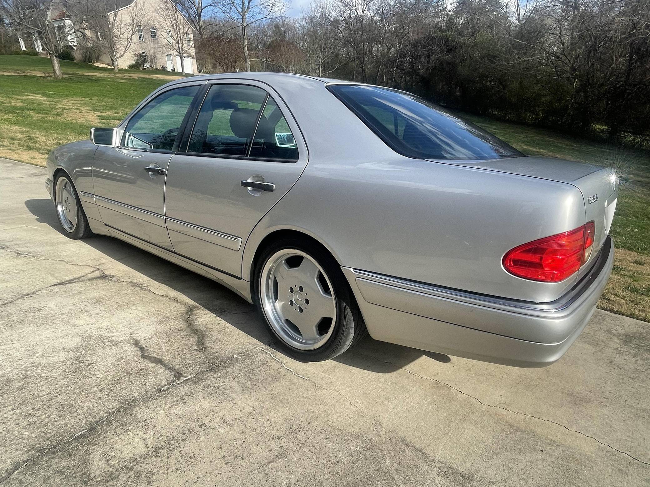 1999 Mercedes-Benz E55 AMG, finished in Brilliant Silver Metallic with a Blueberry interior. The odometer on this E55 currently indicates approximately 52,200 miles. Factory equipment includes 18-inch AMG monoblock wheels, xenon headlights, blue-tinted glass, Exclusive leather upholstery, a power sunroof, a Bose sound system, and more. The seller reports no modifications. The “W210” generation E-Class was introduced for the 1996 model year and was a major stylistic departure from the decade-old “W124”-generation E-Class that preceded it. Instead of the boxy lines and rectangular headlights of its predecessor, the W210 gained a curvier front end with four elliptical headlamps. The high-performance E55 AMG was available for the 1999 to 2002 model years and featured an AMG body kit, sportier suspension, and increased performance over its non-AMG counterparts. Power comes from an AMG-tuned "M113" 5. 4-liter V8, rated at 349 horsepower and 391 lb-ft of torque. Output is sent to the rear wheels via a 5-speed automatic transmission.