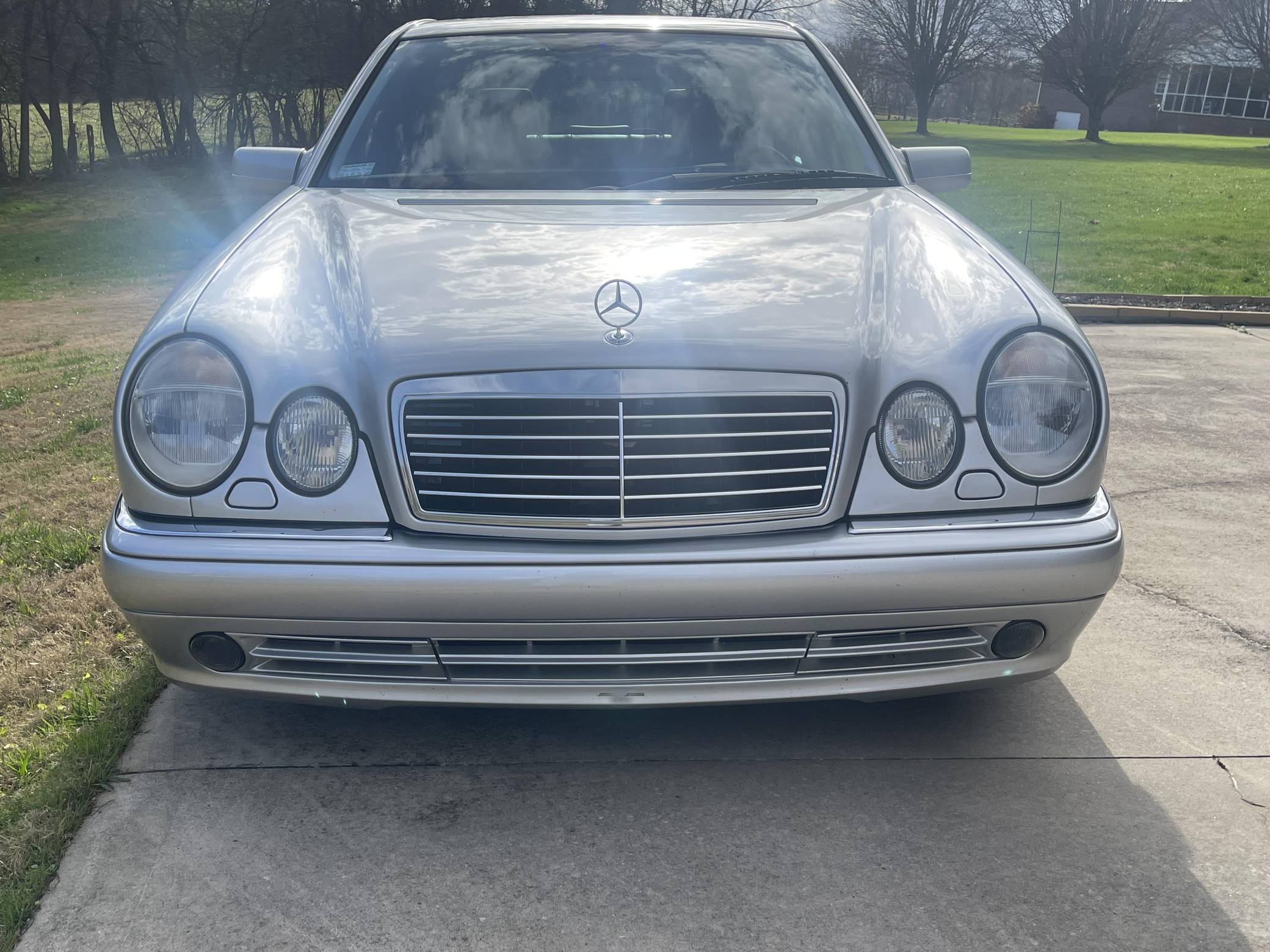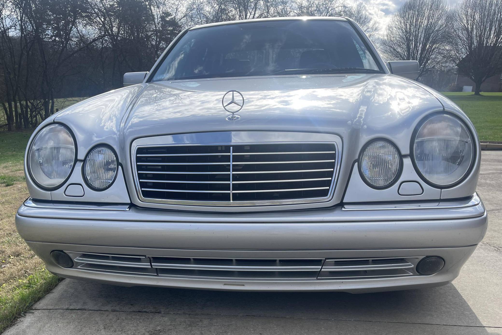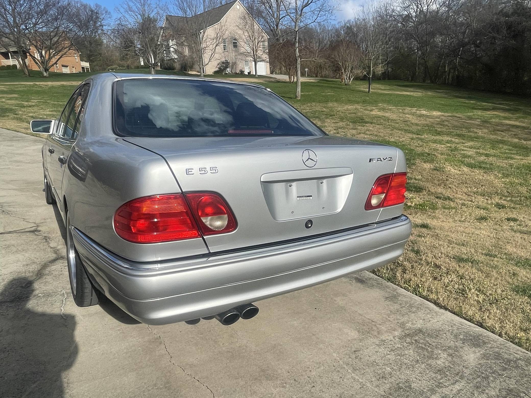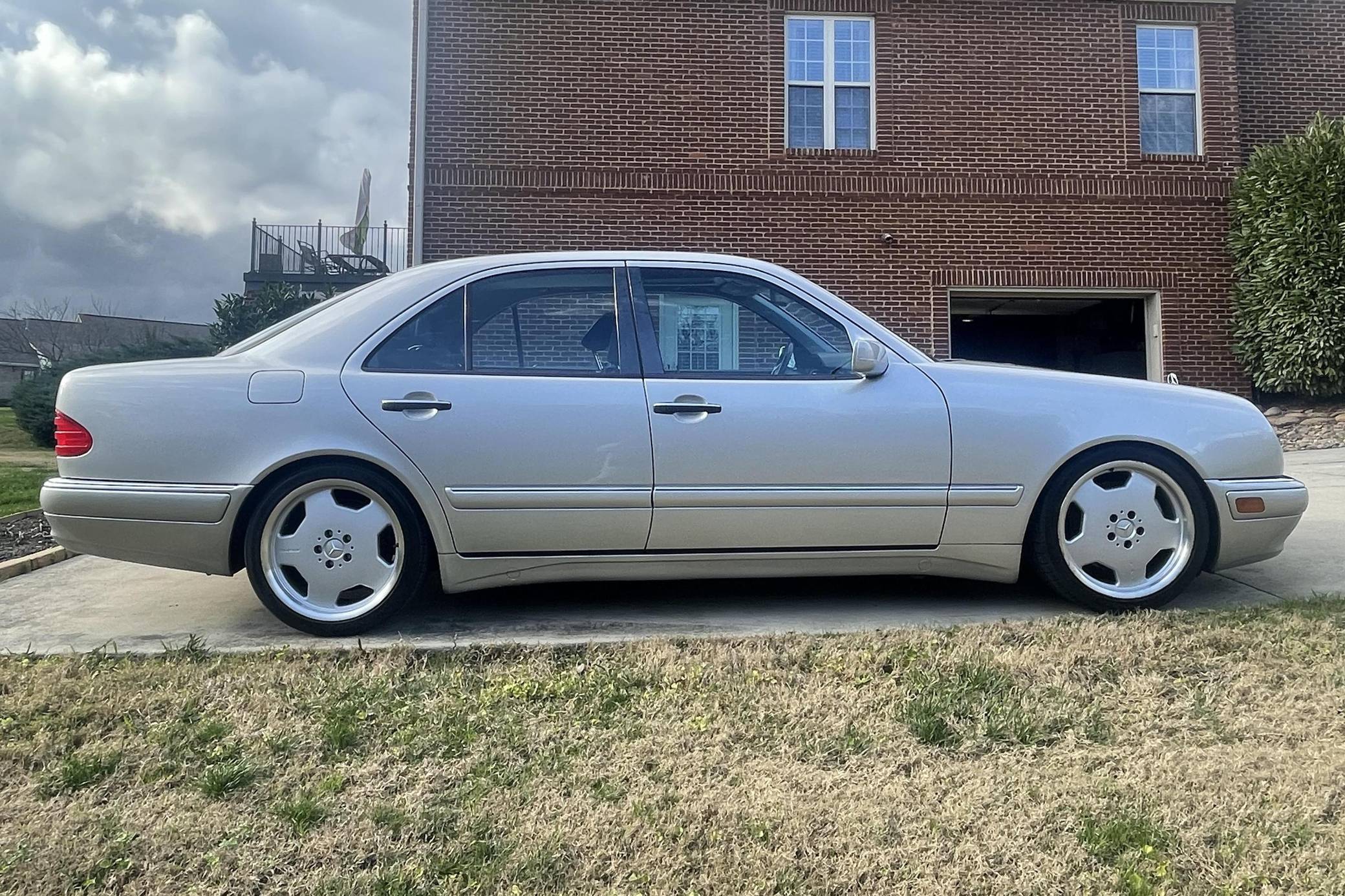 1999 Mercedes-Benz E55 AMG, finished in Brilliant Silver Metallic with a Blueberry interior. The odometer on this E55 currently indicates approximately 52,200 miles. Factory equipment includes 18-inch AMG monoblock wheels, xenon headlights, blue-tinted glass, Exclusive leather upholstery, a power sunroof, a Bose sound system, and more. The seller reports no modifications. The “W210” generation E-Class was introduced for the 1996 model year and was a major stylistic departure from the decade-old “W124”-generation E-Class that preceded it. Instead of the boxy lines and rectangular headlights of its predecessor, the W210 gained a curvier front end with four elliptical headlamps. The high-performance E55 AMG was available for the 1999 to 2002 model years and featured an AMG body kit, sportier suspension, and increased performance over its non-AMG counterparts. Power comes from an AMG-tuned "M113" 5. 4-liter V8, rated at 349 horsepower and 391 lb-ft of torque. Output is sent to the rear wheels via a 5-speed automatic transmission.