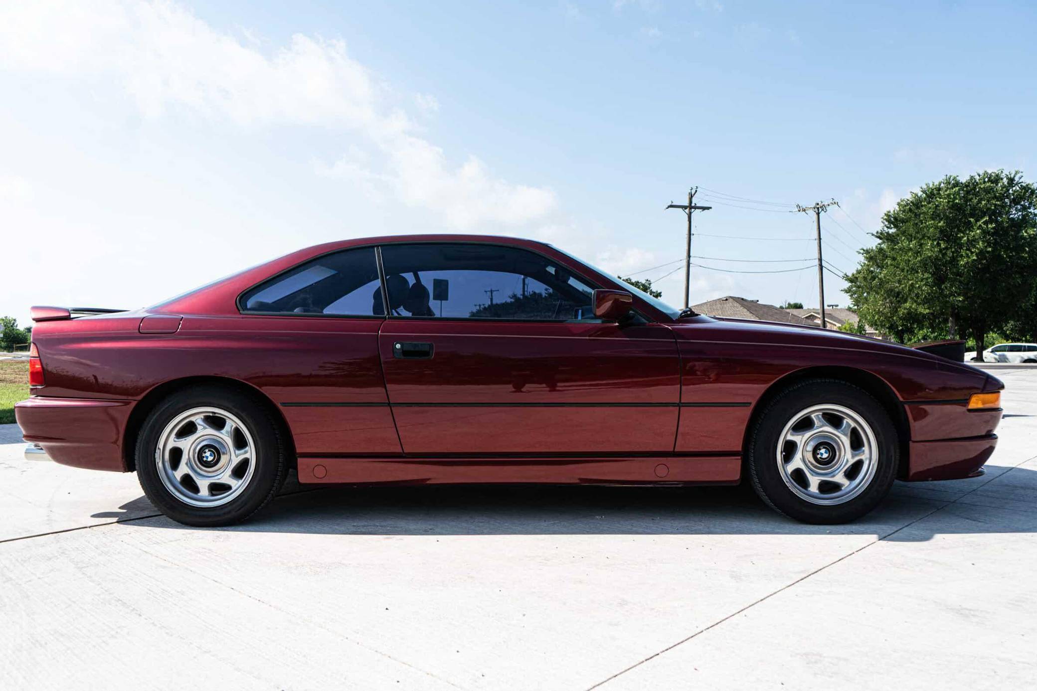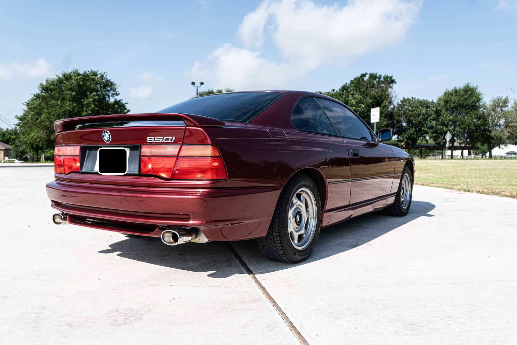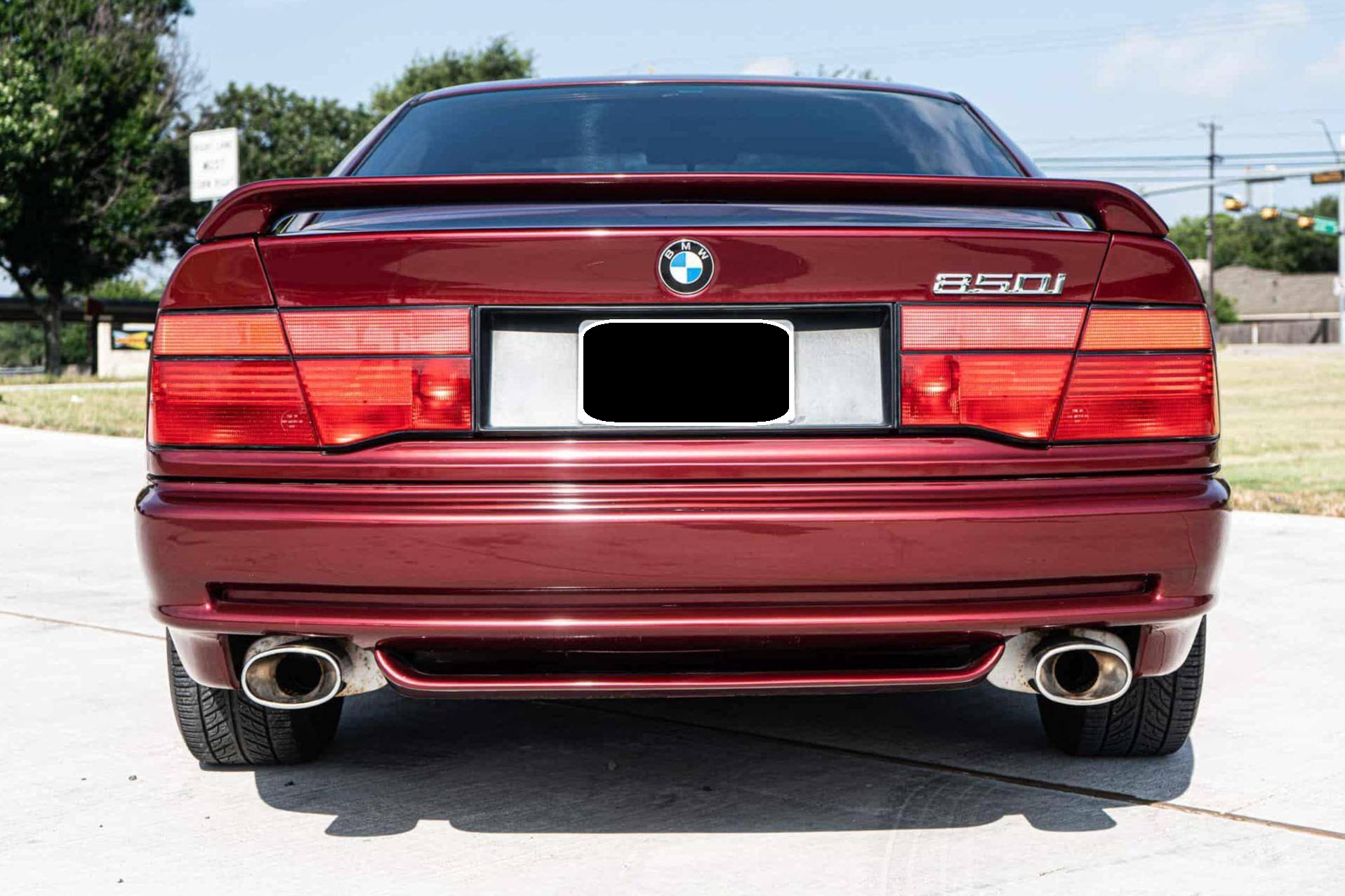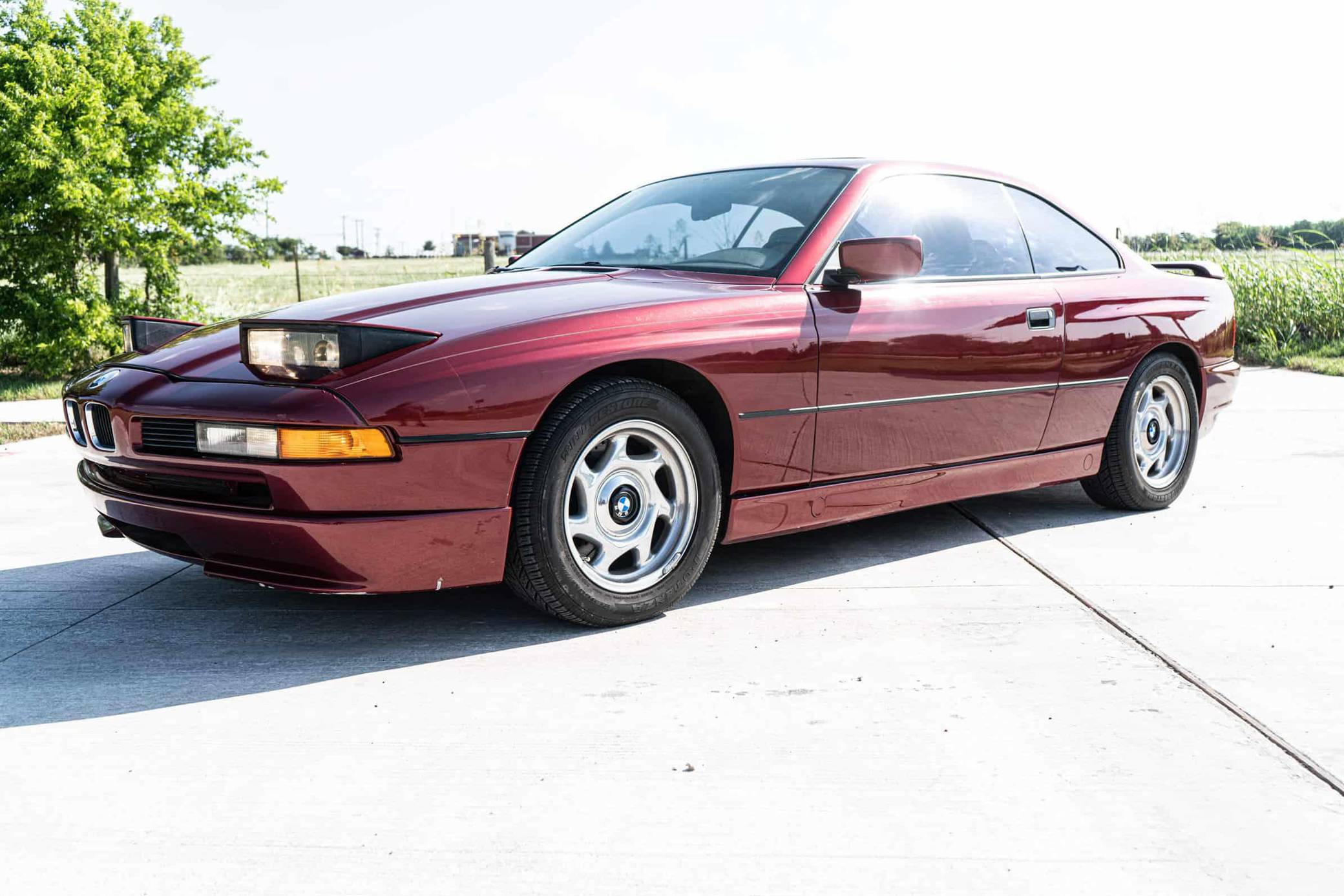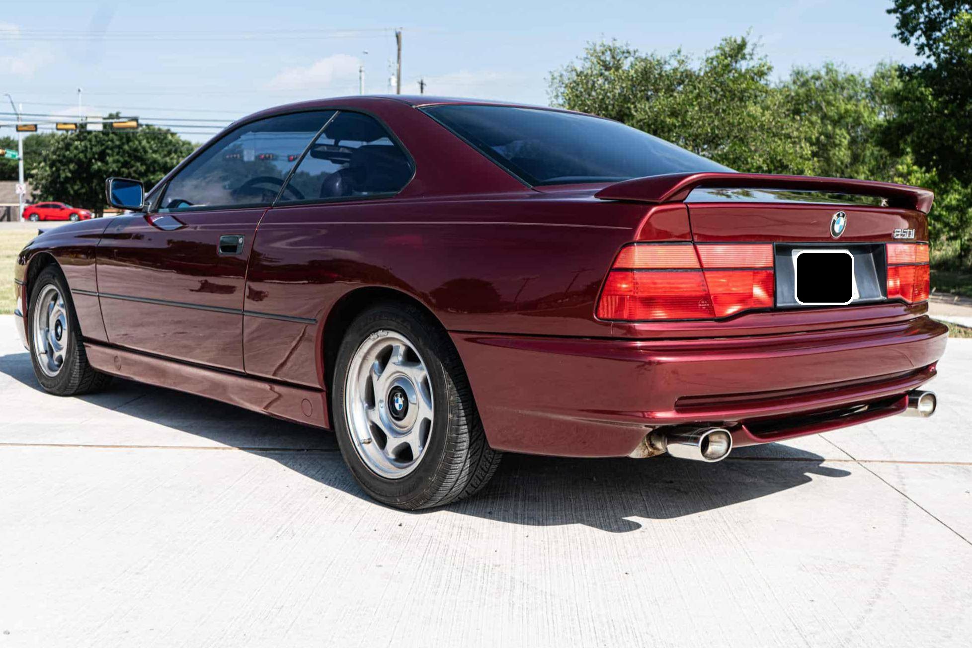 1991 BMW 850i, finished in Calypso Red Metallic with a gray interior. This 850i is equipped with the desirable 6-speed manual transmission. Factory equipment includes 16-inch wheels, pop-up headlights, fog lights, a sunroof, leather upholstery, power-adjustable front seats, automatic climate control, and an on-board computer. Modifications reported by the seller include aftermarket mufflers, drilled and slotted brake rotors, an aftermarket front lip spoiler, window tint, an aftermarket rear spoiler, and an aftermarket rear diffuser. The BMW "E31" is the original 8 Series, and it served as the brand's flagship grand touring coupe. Available with a V8 or V12 engine, it was BMW's attempt to move into a higher-end market than its usual focus, with stronger performance and a higher price point than other BMW models at the time. Power comes from an "M70B50" 5. 0-liter V12 engine, rated at 296 horsepower and 332 lb-ft of torque. The engine spins the rear wheels via a 6-speed manual transmission.