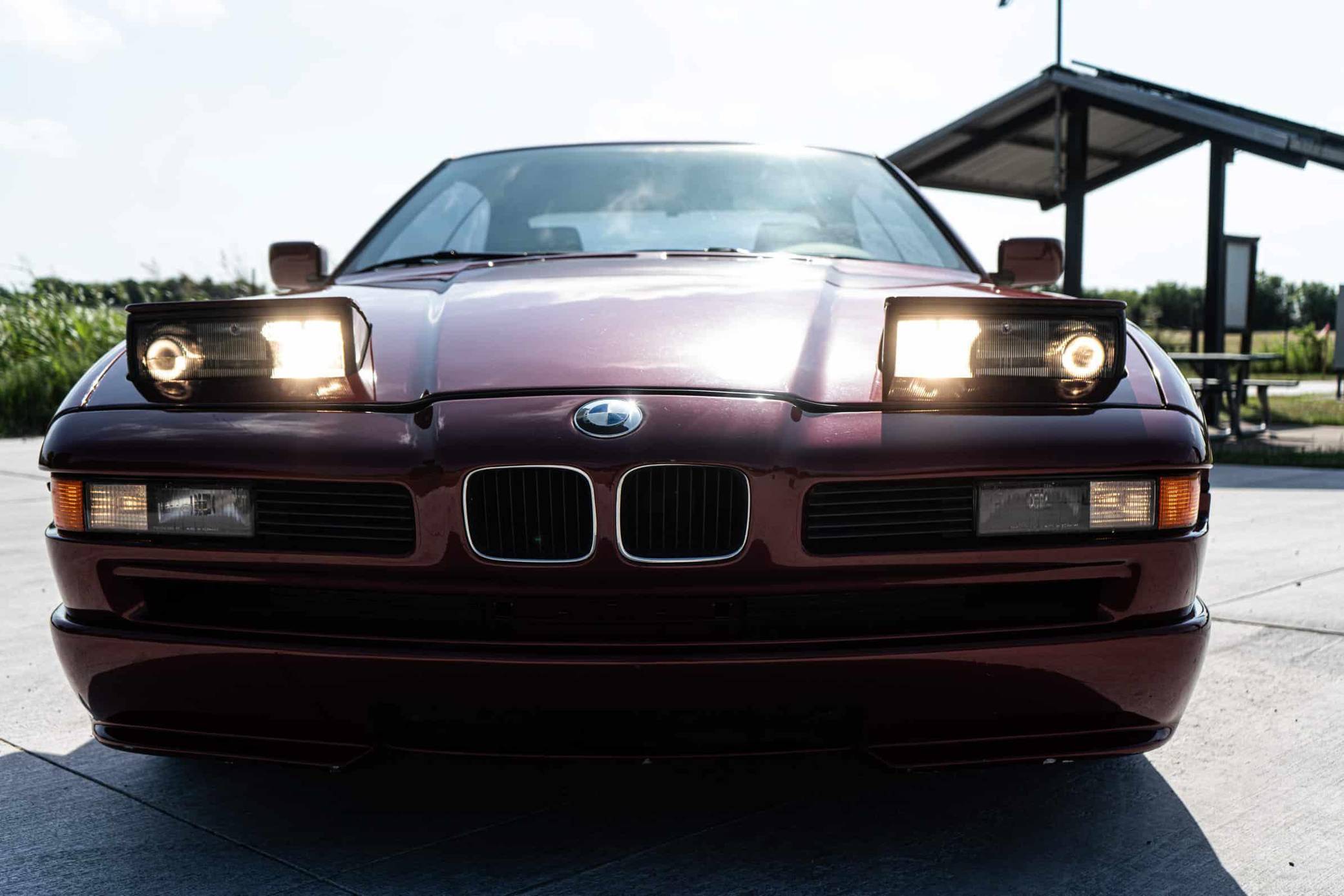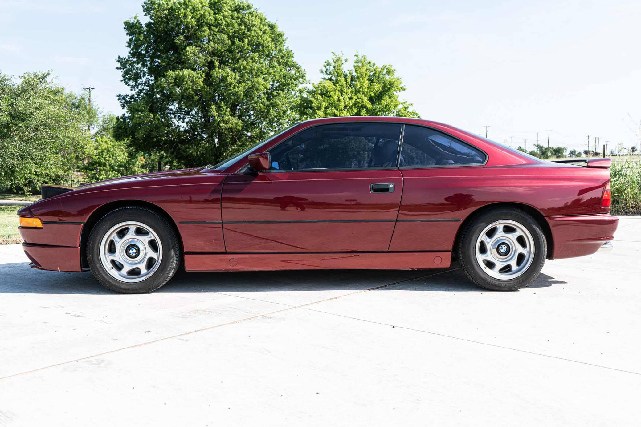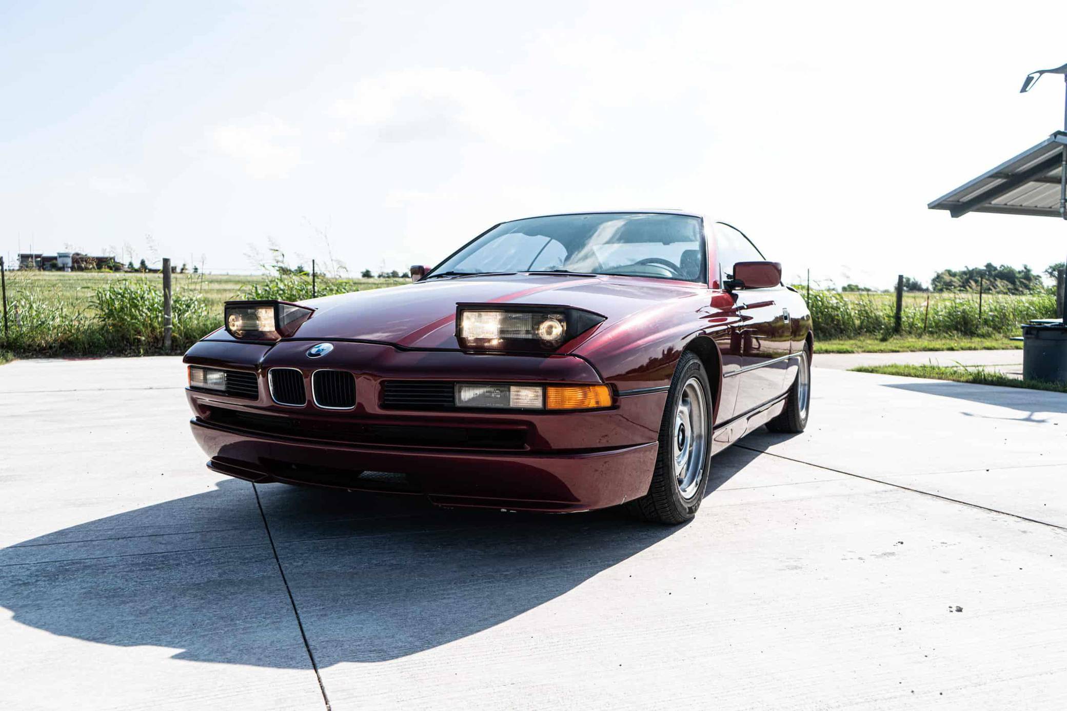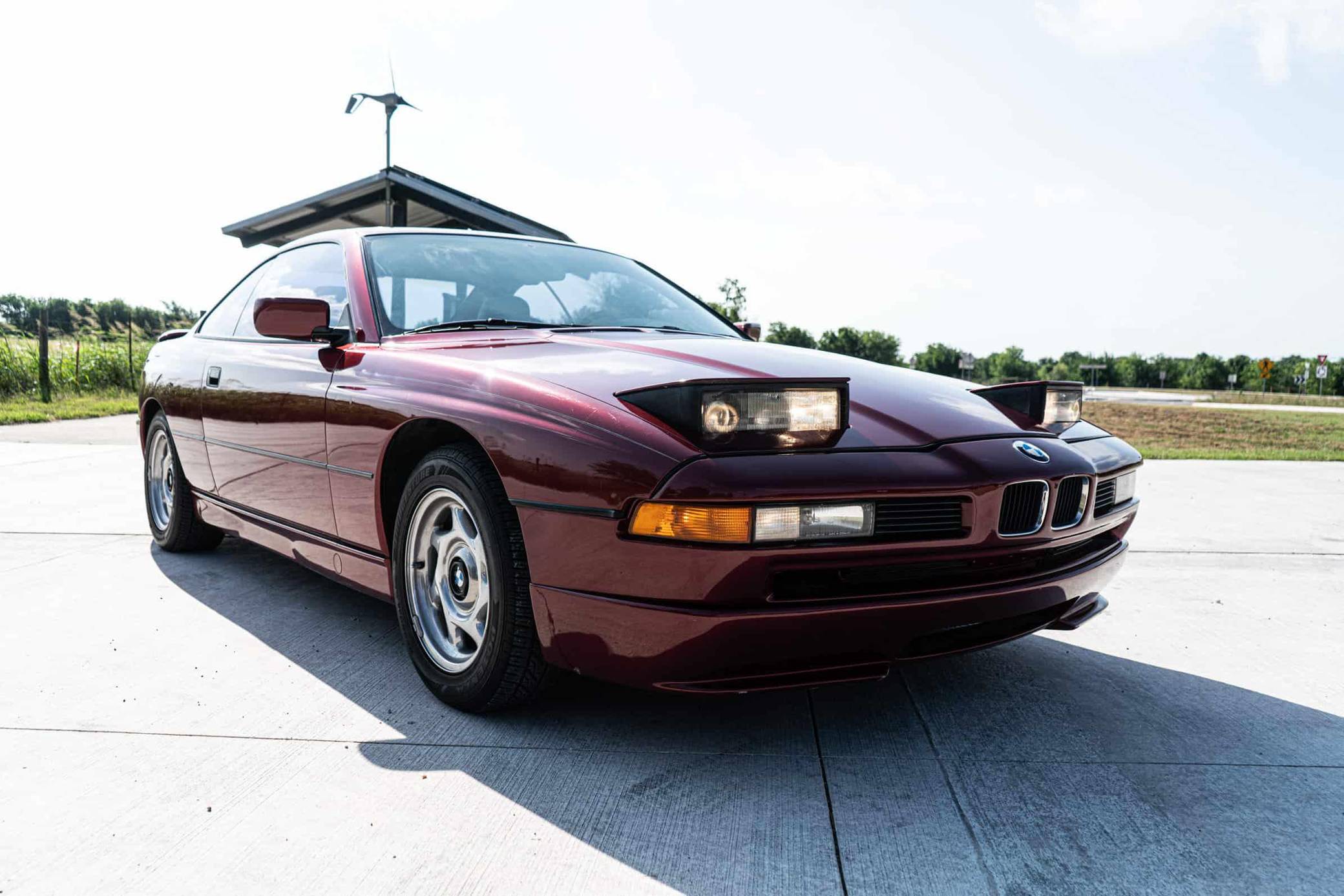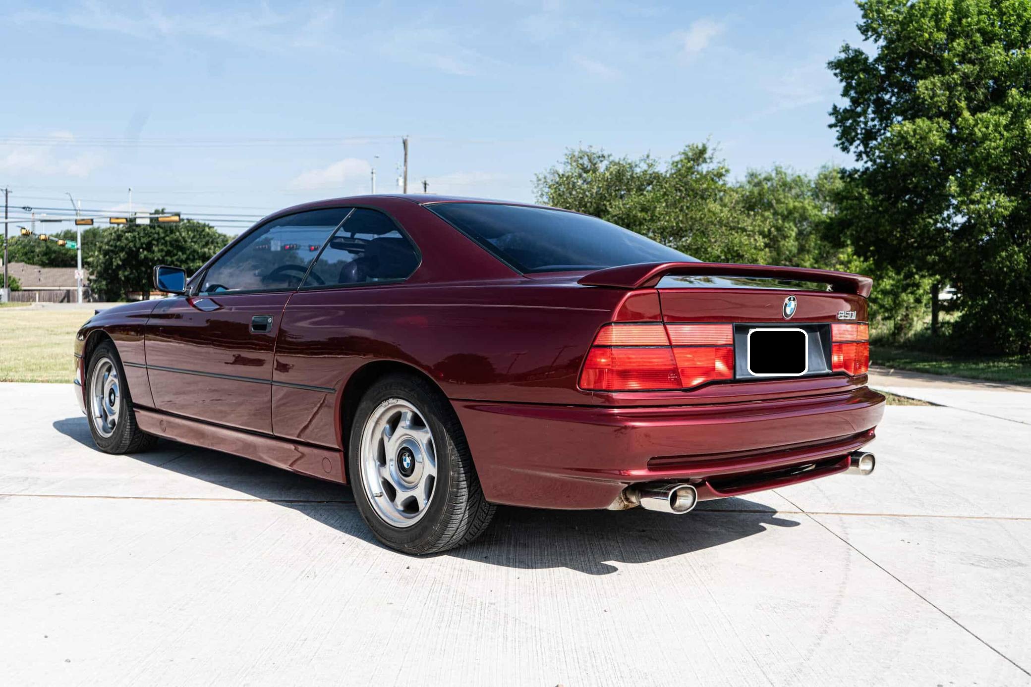 1991 BMW 850i, finished in Calypso Red Metallic with a gray interior. This 850i is equipped with the desirable 6-speed manual transmission. Factory equipment includes 16-inch wheels, pop-up headlights, fog lights, a sunroof, leather upholstery, power-adjustable front seats, automatic climate control, and an on-board computer. Modifications reported by the seller include aftermarket mufflers, drilled and slotted brake rotors, an aftermarket front lip spoiler, window tint, an aftermarket rear spoiler, and an aftermarket rear diffuser. The BMW "E31" is the original 8 Series, and it served as the brand's flagship grand touring coupe. Available with a V8 or V12 engine, it was BMW's attempt to move into a higher-end market than its usual focus, with stronger performance and a higher price point than other BMW models at the time. Power comes from an "M70B50" 5. 0-liter V12 engine, rated at 296 horsepower and 332 lb-ft of torque. The engine spins the rear wheels via a 6-speed manual transmission.