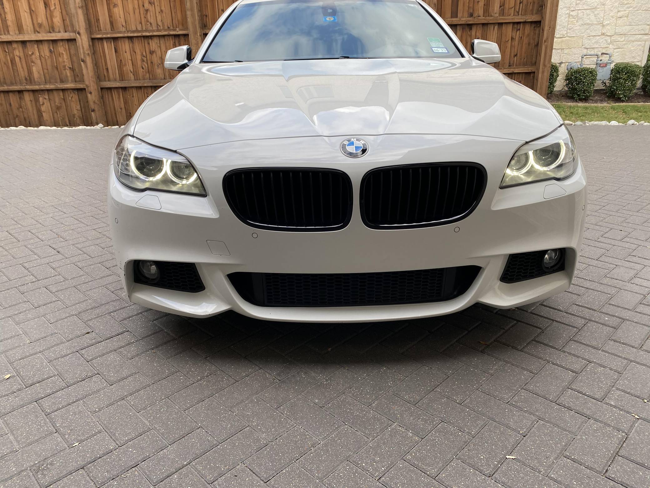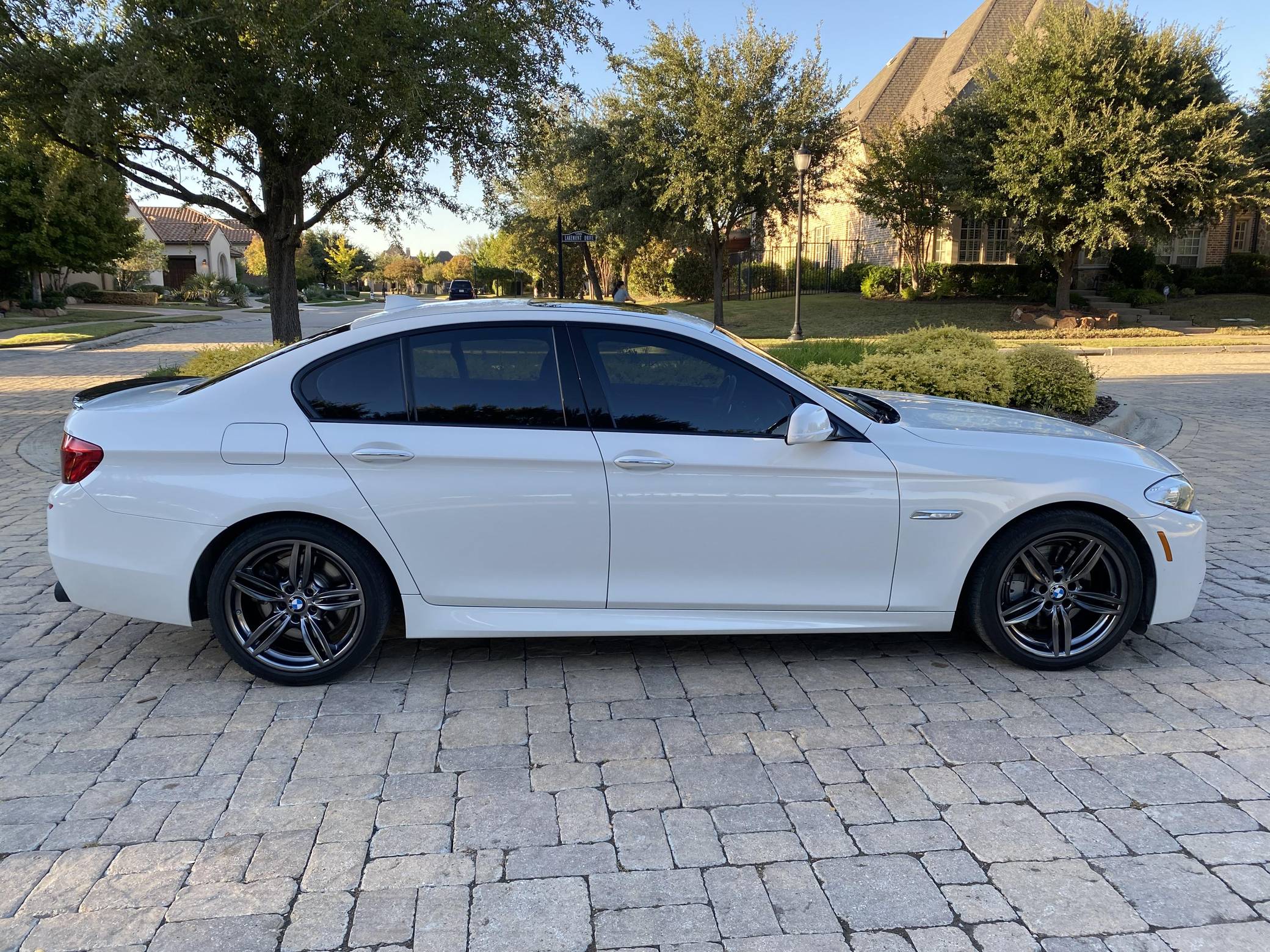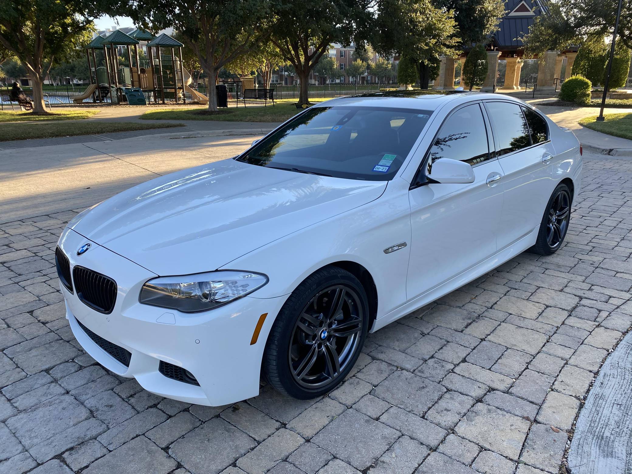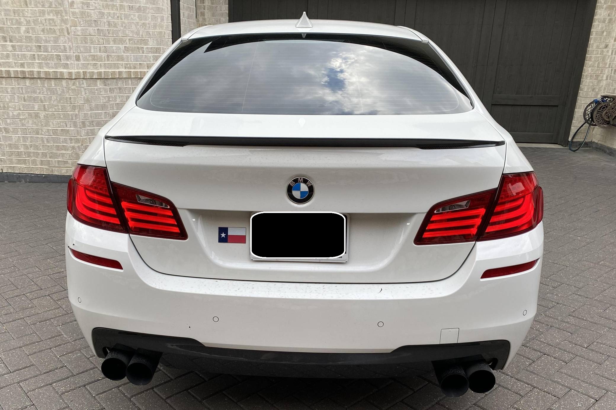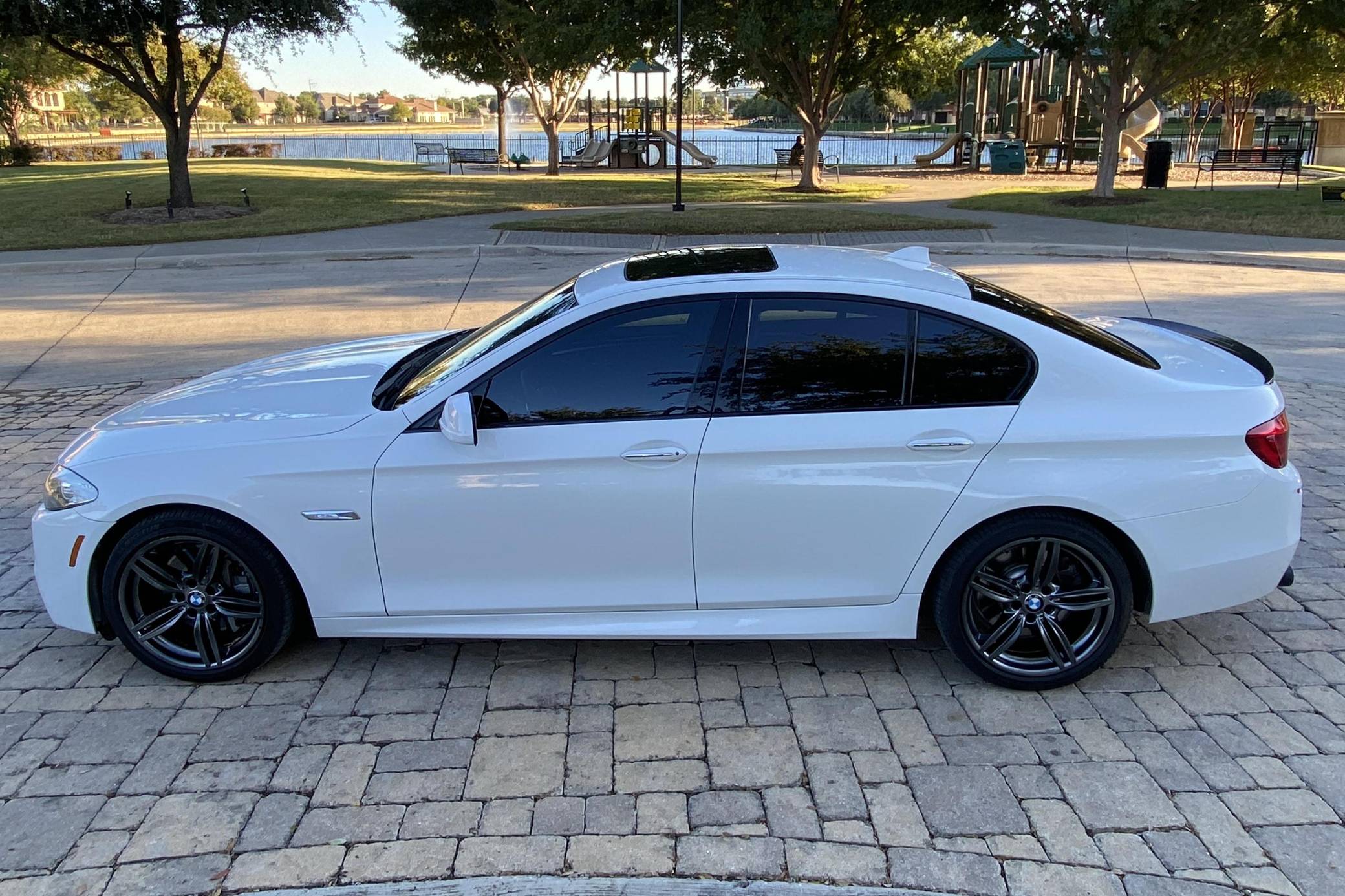THIS… is a 2012 BMW 550i, finished in Alpine White with a black interior. Factory equipment includes M Sport, Premium Sound, and Convenience packages, adaptive xenon headlights, a sunroof, Dakota leather upholstery, heated front seats, Anthracite wood trim, ceramic controls, rear sunshades, and a navigation system, among others listed below. Modifications reported by the seller include 19-inch factory wheels finished in black chrome, Dinan Stage 3 engine software, a Dinan free flow exhaust, black kidney grilles, ceramic window tint, a rear badge delete, and a carbon fiber rear spoiler. BMW released the F10-generation 5 Series for the 2011 model year. It wore a less extroverted design than its predecessor, and engineers overhauled nearly every part of the chassis to ensure it remained the driver's choice in the segment in the face of growing competition. Available at launch, the 550i landed at the top of the non-M-tuned range. Power for this 550i comes from a twin-turbocharged 4. 4-liter V8 engine, rated at 400 horsepower and 450 lb-ft of torque when left stock. According to the dealership Classic BMW, this 550i is now rated at 511 horsepower and 580 lb-ft of torque. Output is sent to the rear wheels via an 8-speed automatic transmission.