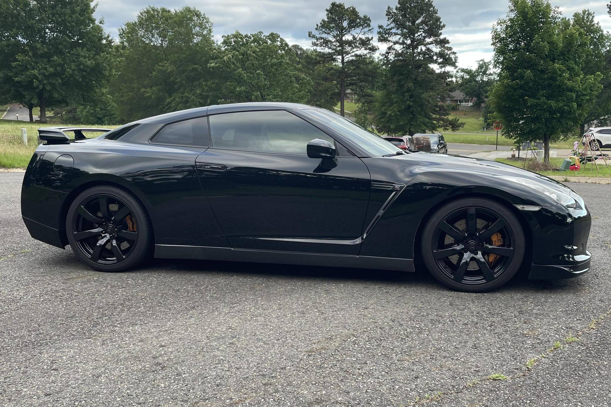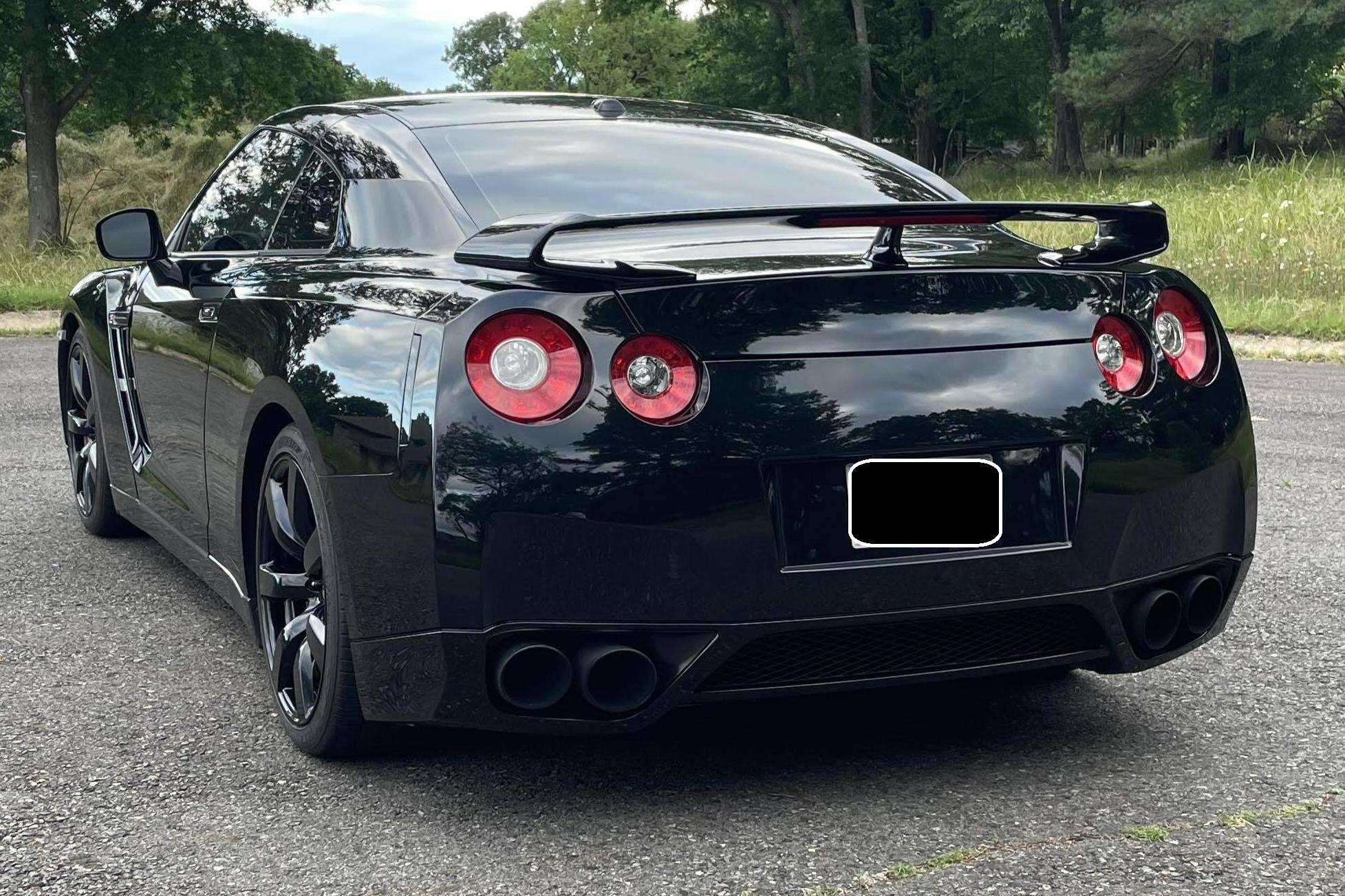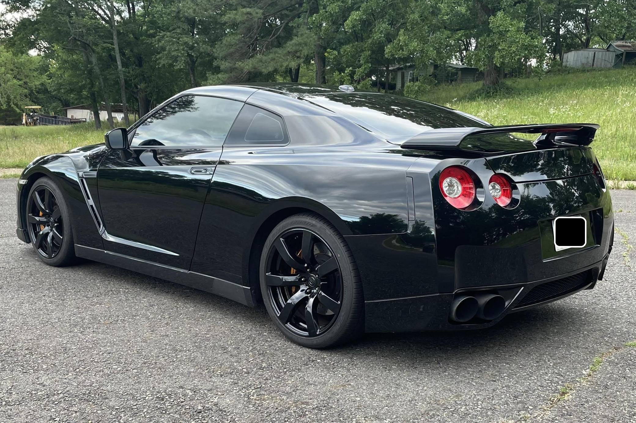2009 Nissan GT-R, finished in Black Obsidian with a black interior. The odometer indicates approximately 62,200 miles. Factory equipment includes 20-inch wheels, Vehicle Dynamic Control, a Bilstein DampTronic suspension system, a Brembo braking system, a limited-slip differential, leather upholstery, and heated front sport seats. Modifications reported by the seller include a VR Speed Factory catless downpipe, an aftermarket mid pipe, a Cobb Tuning intake, a Cobb Tuning Accessport ECU tuner, a Jacks Transmissions kit, powder-coated wheels, tinted windows, a Phoenix Automotive touchscreen infotainment system, and Infinity Reference door speakers. Called "R35" internally, and Godzilla by its legions of fans, the GT-R arrived for 2009 as the performance bargain of its decade. Power comes from a 3. 8-liter twin-turbocharged V6, rated at 480 horsepower and 430 lb-ft of torque in stock form. The modifications likely increase those figures, but a dyno sheet was not provided to confirm. Output is sent to all four wheels via a 6-speed automatic transmission.