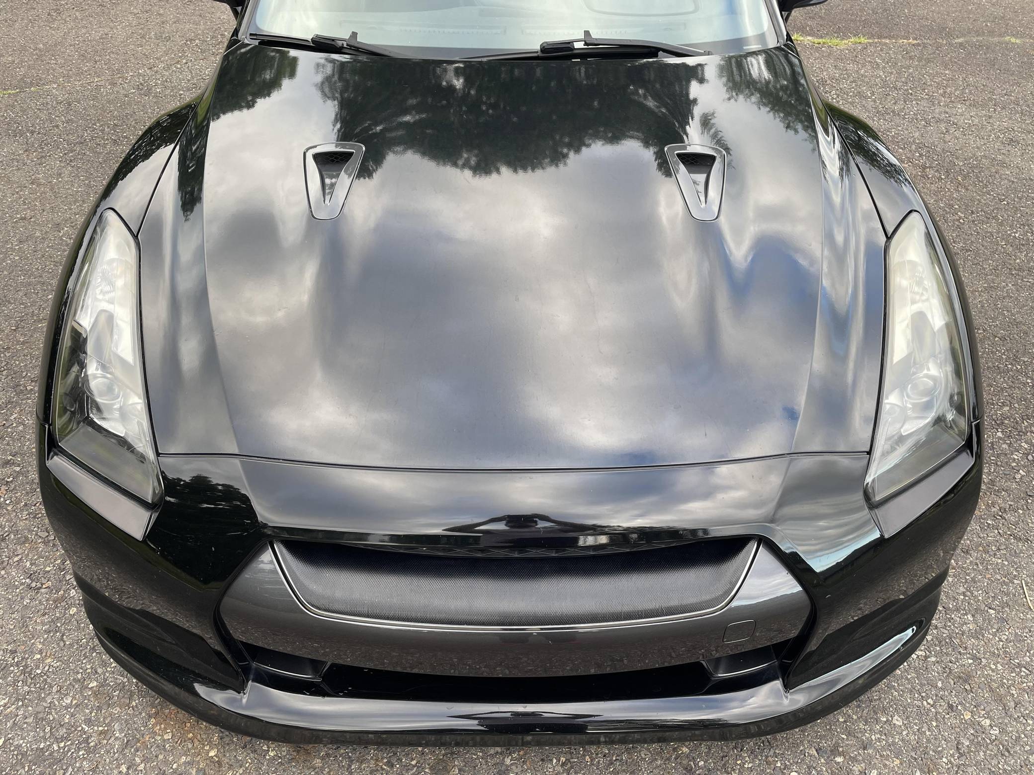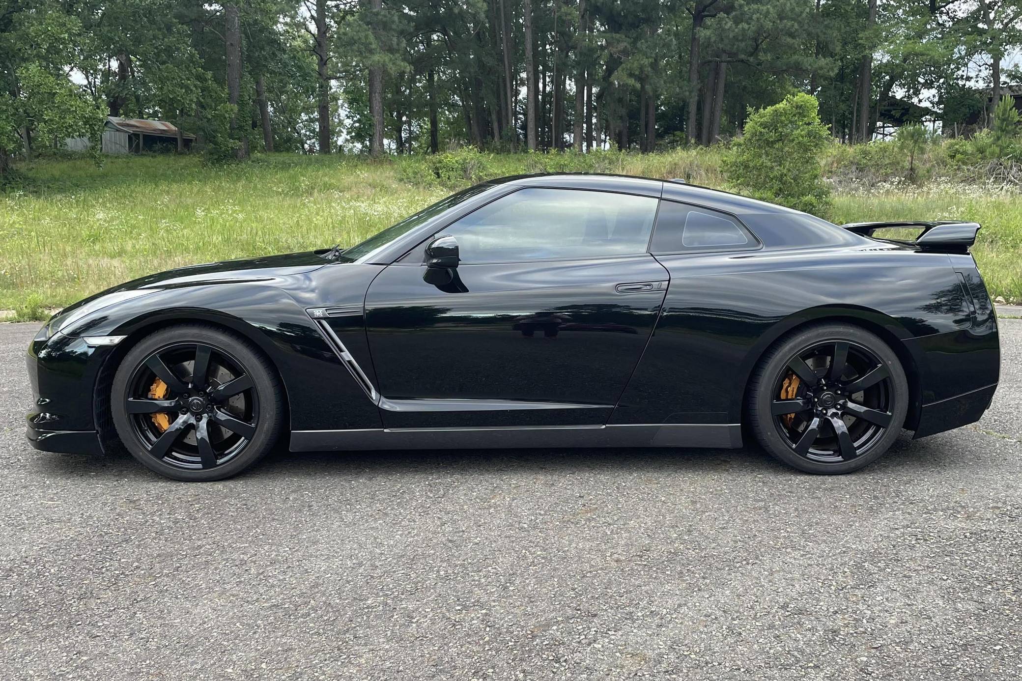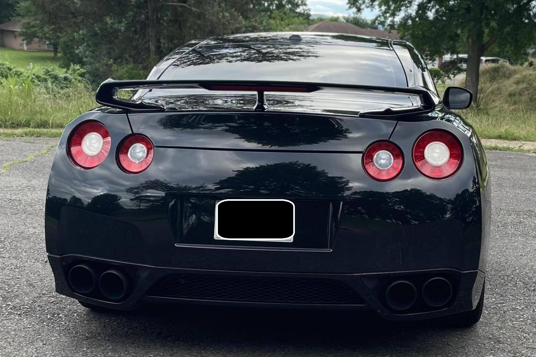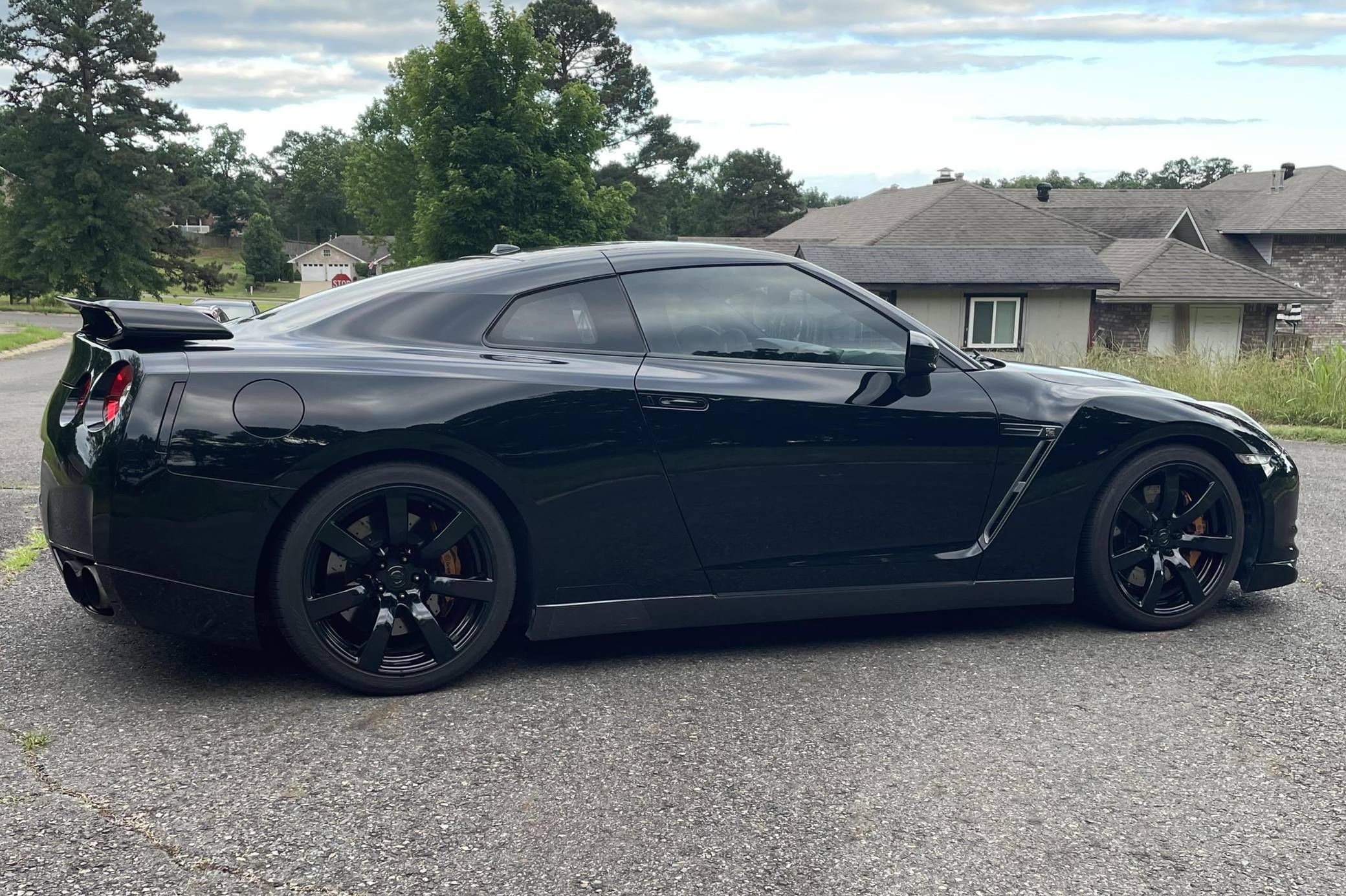 2009 Nissan GT-R, finished in Black Obsidian with a black interior. The odometer indicates approximately 62,200 miles. Factory equipment includes 20-inch wheels, Vehicle Dynamic Control, a Bilstein DampTronic suspension system, a Brembo braking system, a limited-slip differential, leather upholstery, and heated front sport seats. Modifications reported by the seller include a VR Speed Factory catless downpipe, an aftermarket mid pipe, a Cobb Tuning intake, a Cobb Tuning Accessport ECU tuner, a Jacks Transmissions kit, powder-coated wheels, tinted windows, a Phoenix Automotive touchscreen infotainment system, and Infinity Reference door speakers. Called "R35" internally, and Godzilla by its legions of fans, the GT-R arrived for 2009 as the performance bargain of its decade. Power comes from a 3. 8-liter twin-turbocharged V6, rated at 480 horsepower and 430 lb-ft of torque in stock form. The modifications likely increase those figures, but a dyno sheet was not provided to confirm. Output is sent to all four wheels via a 6-speed automatic transmission.