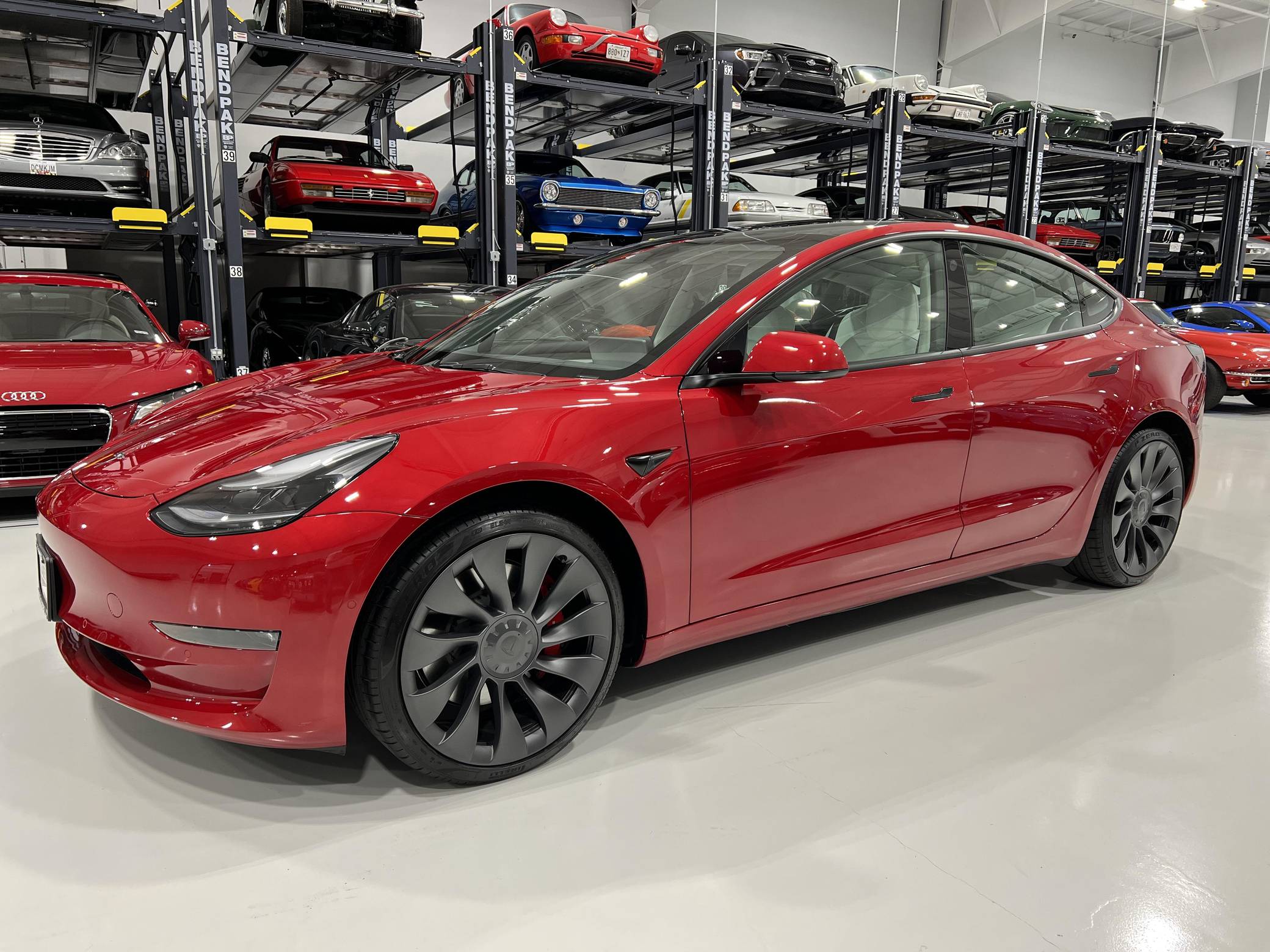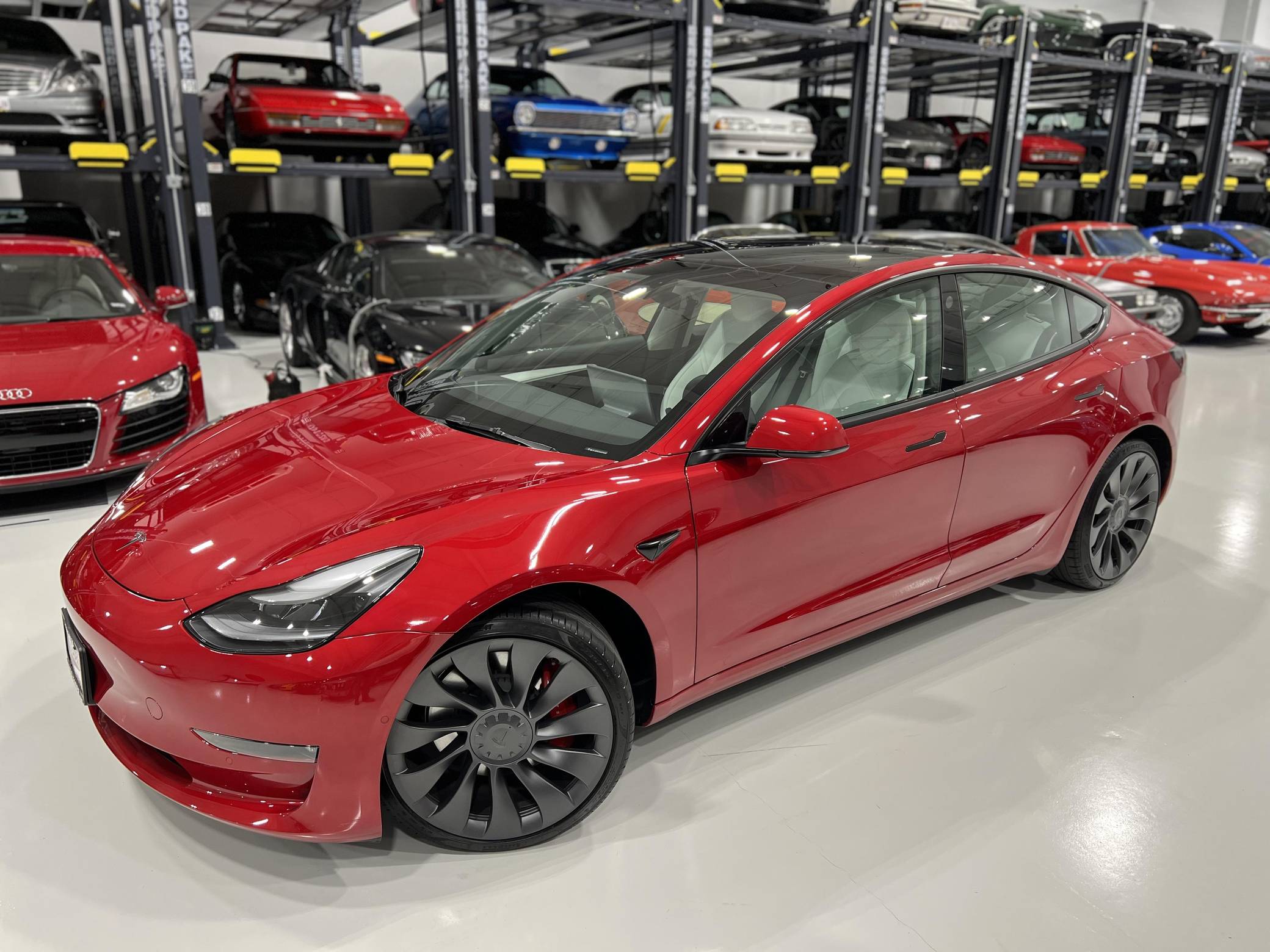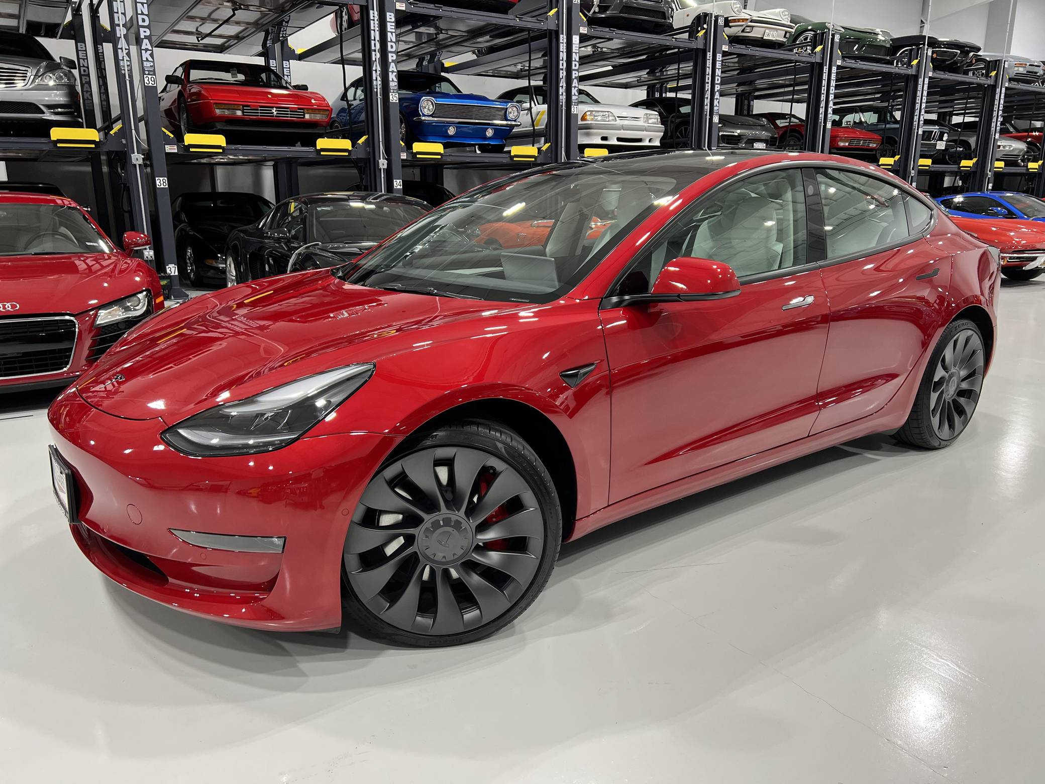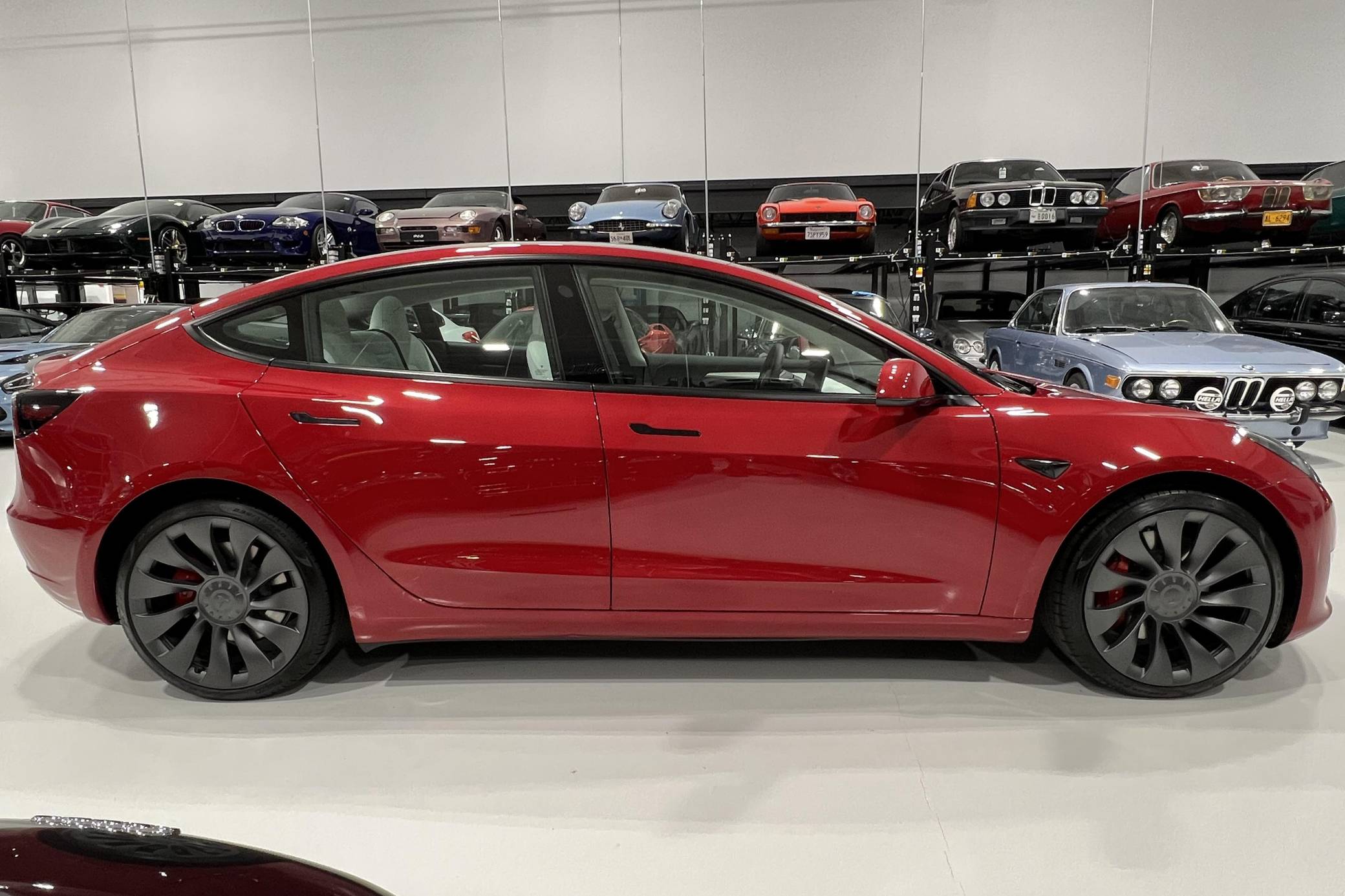 THIS. . . is a 2022 Tesla Model 3 Performance, finished in red with a black and white interior. Factory equipment includes 20-inch "Überturbine" wheels, a Performance-specific braking system, a carbon fiber rear spoiler, the Premium interior, heated front and rear seats, a heated steering wheel, a premium sound system, and the "Full Self-Driving" computer. The seller reports no modifications. Positioned as Tesla's entry-level car, the Model 3 was welcomed as a premium EV with a usable range and respectable performance, all at a reasonably attainable price. It's still available today, and it has gone through several evolutions (including many software updates) since its introduction. Power comes from a pair of electric motors that draw electricity from an 82-kilowatt-hour lithium-ion battery pack to zap the four wheels with approximately 470 horsepower, according to third-party estimates. This Model 3's maximum driving range was rated at 315 miles in 2022 by the EPA.