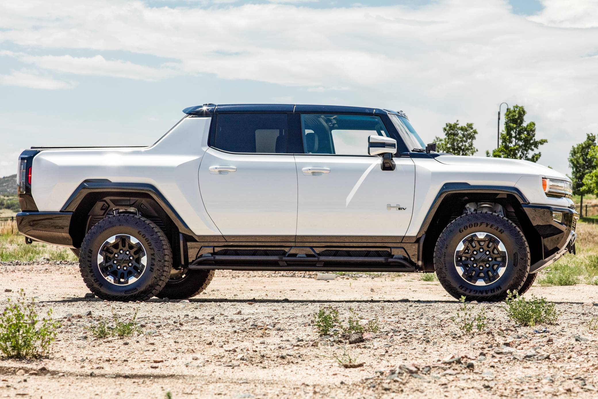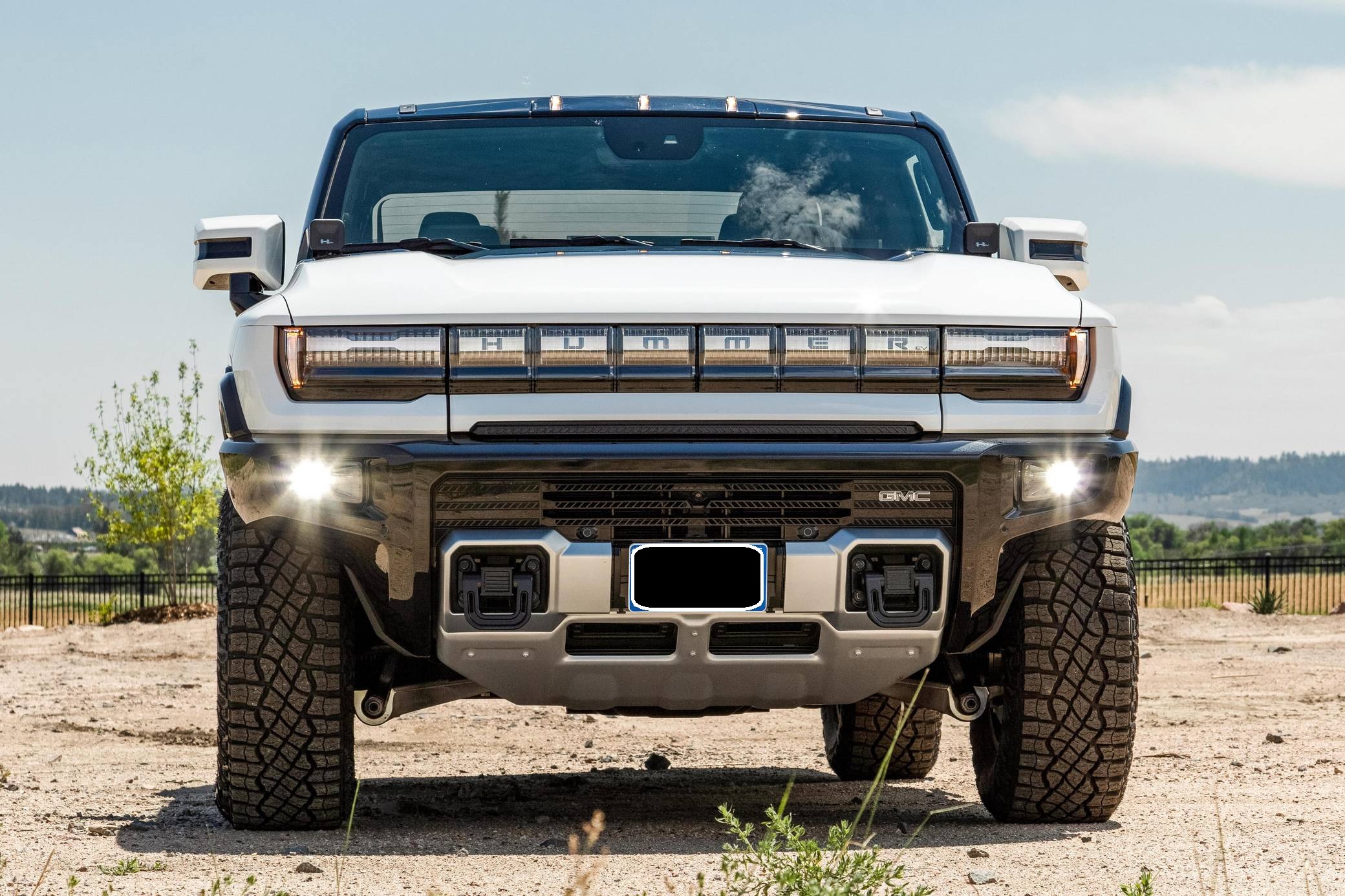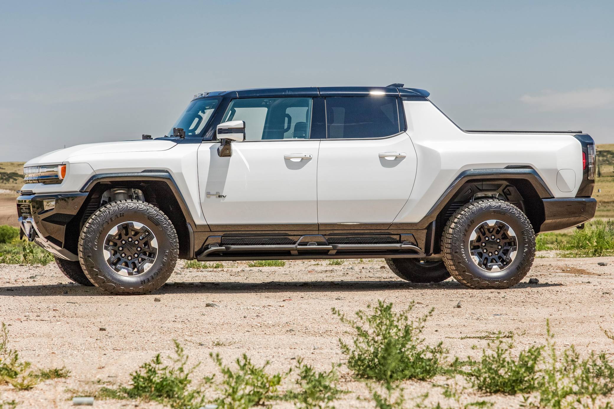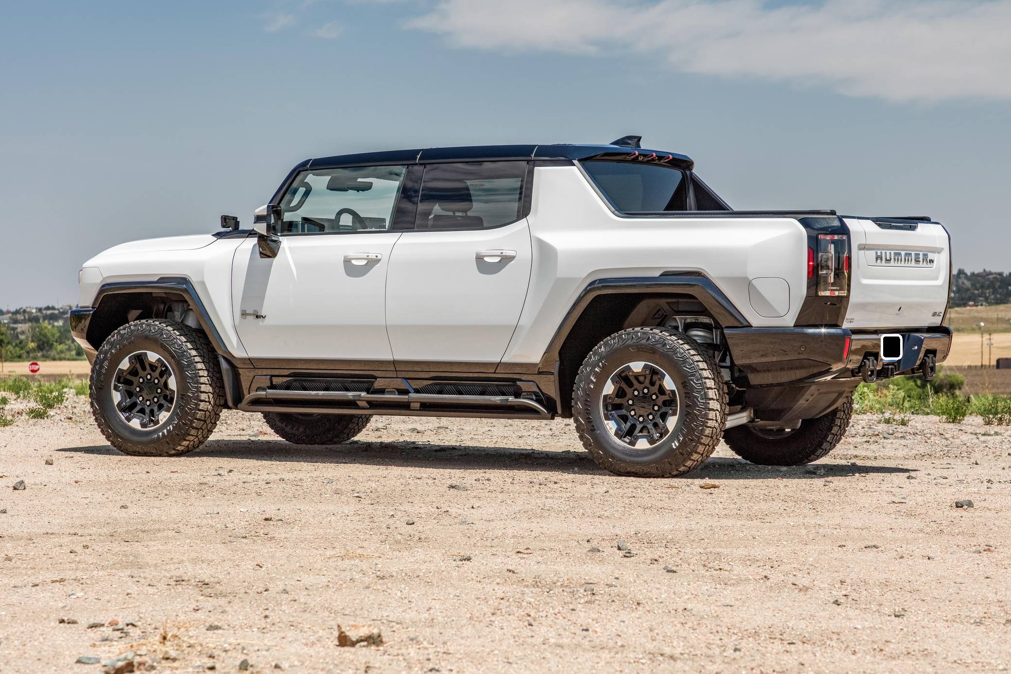2022 GMC Hummer EV Pickup Edition 1, finished in Interstellar White with a Jet Black and Light Grey interior. It's equipped with the Illumination Package, 18-inch black aluminum wheels with machined accents, an Air Ride adaptive suspension system, a four-wheel steering system with a CrabWalk mode, a Multipro tailgate, a power-retractable tonneau cover, an Infinity Roof with transparent Sky Panels, power-adjustable, heated, and ventilated front seats, heated rear seats, a 13. 4-inch touchscreen for the infotainment system, a 14-speaker Bose surround sound system, and more as detailed below. General Motors unexpectedly resurrected the Hummer name on a massive electric truck assigned to the GMC brand. Built around the firm's Ultium technology, the Hummer EV stands out with a powerful electric drivetrain and several off-road-focused features, like a four-wheel-steering system with a CrabWalk mode capable of turning the four wheels in the same direction. Hummer EV production began in late 2021. Power comes from three electric motors, which draw electricity from a 212-kilowatt-hour lithium-ion battery pack to zap the four wheels with about 1,000 horsepower, according to GMC. The Hummer EV Pickup Edition 1 offers an EPA-estimated driving range of 329 miles.