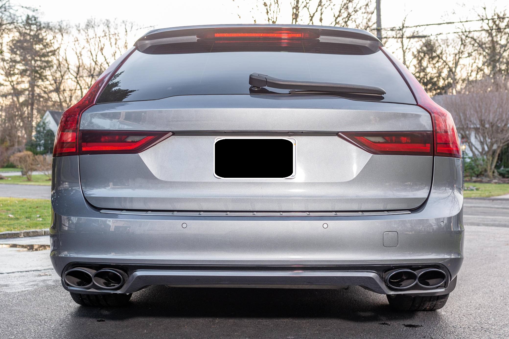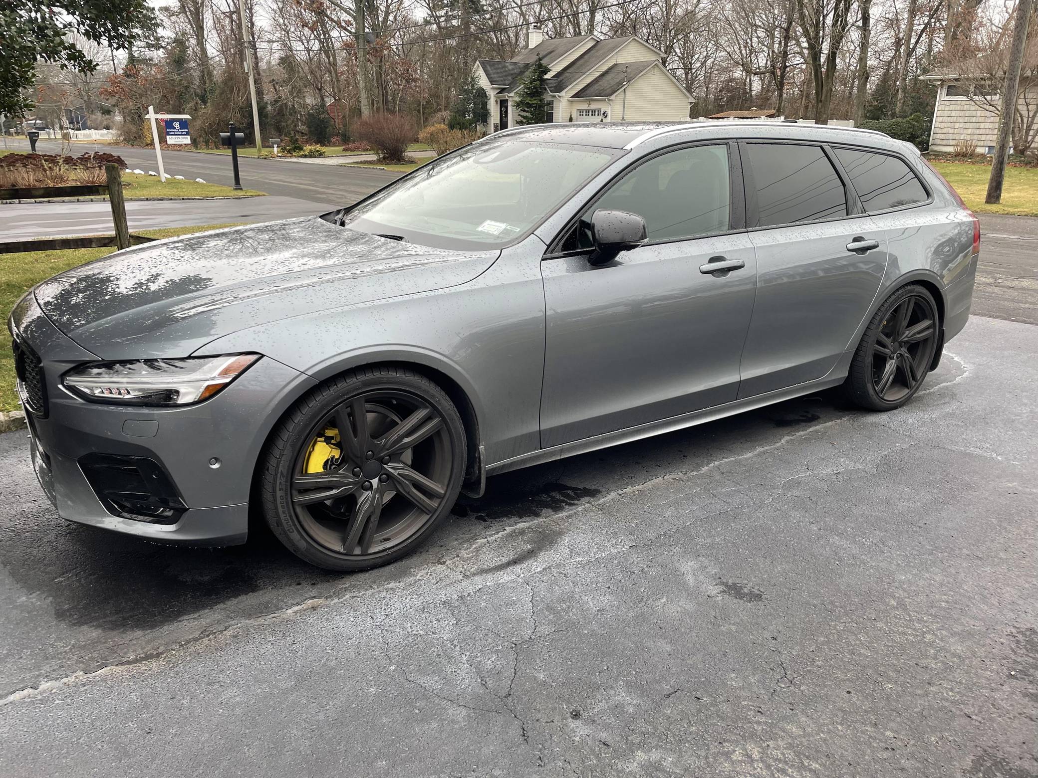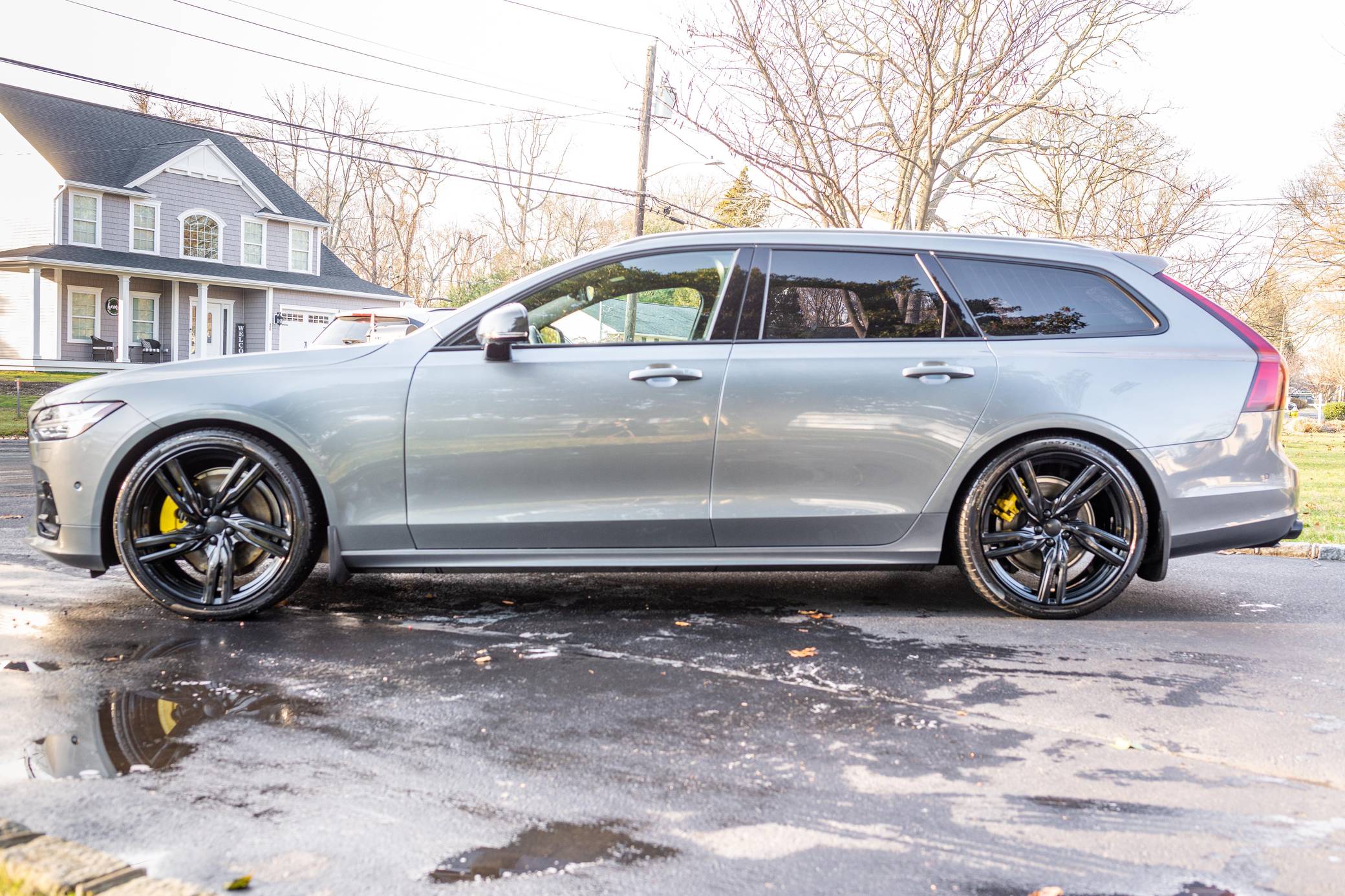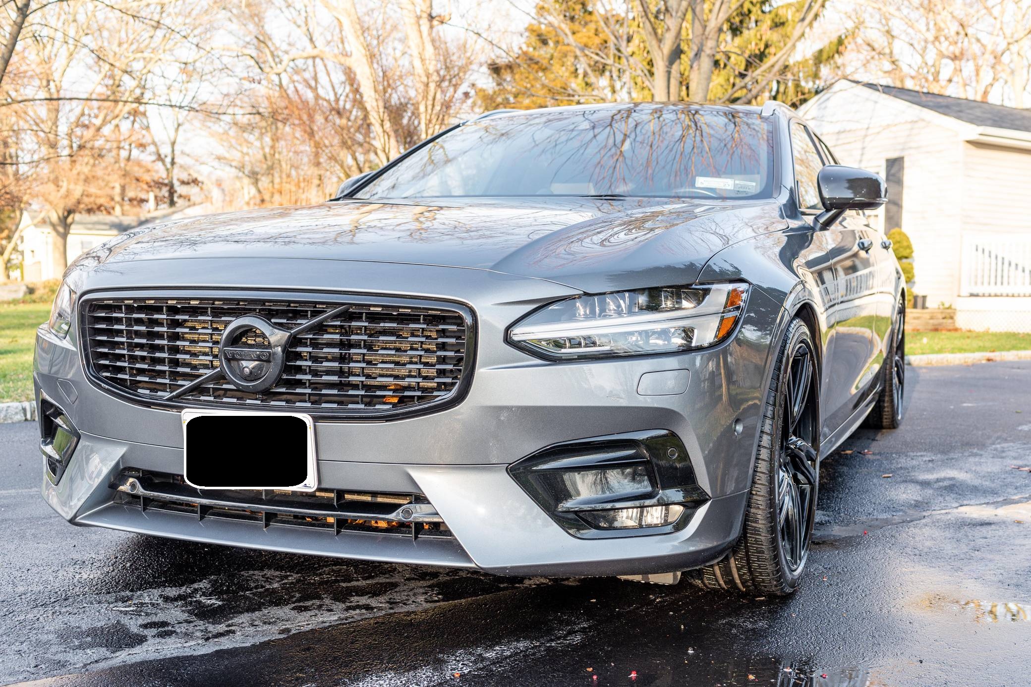 2019 Volvo V90 T-6 R-Design AWD, finished in Osmium Grey Metallic with a Charcoal interior. Equipped with the Advanced Package (head-up display, 360-degree camera, LED headlights with washers, park assist), the Protection Package Premier, 20-inch R-Design wheels, Polestar engine optimization, heated front and rear seats, a heated steering wheel, a Bowers and Wilkins audio system, and more as detailed below. Modifications reported by the seller are limited to black-painted wheels, front grille, and side view mirrors, yellow-painted brake calipers, and the removal of the rear badges. The V90 is Volvo's full-size wagon, and it was introduced for the 2017 model year in standard and high-riding Cross Country forms. T6 versions use a turbo- and supercharged inline-4, while the R-Design package adds unique styling inside and out. Power comes from a 2. 0-liter turbocharged and supercharged inline-4, rated at approximately 330 horsepower and 325 lb-ft of torque with the Polestar engine optimization fitted here. Output is sent to all four wheels through an 8-speed automatic transmission.