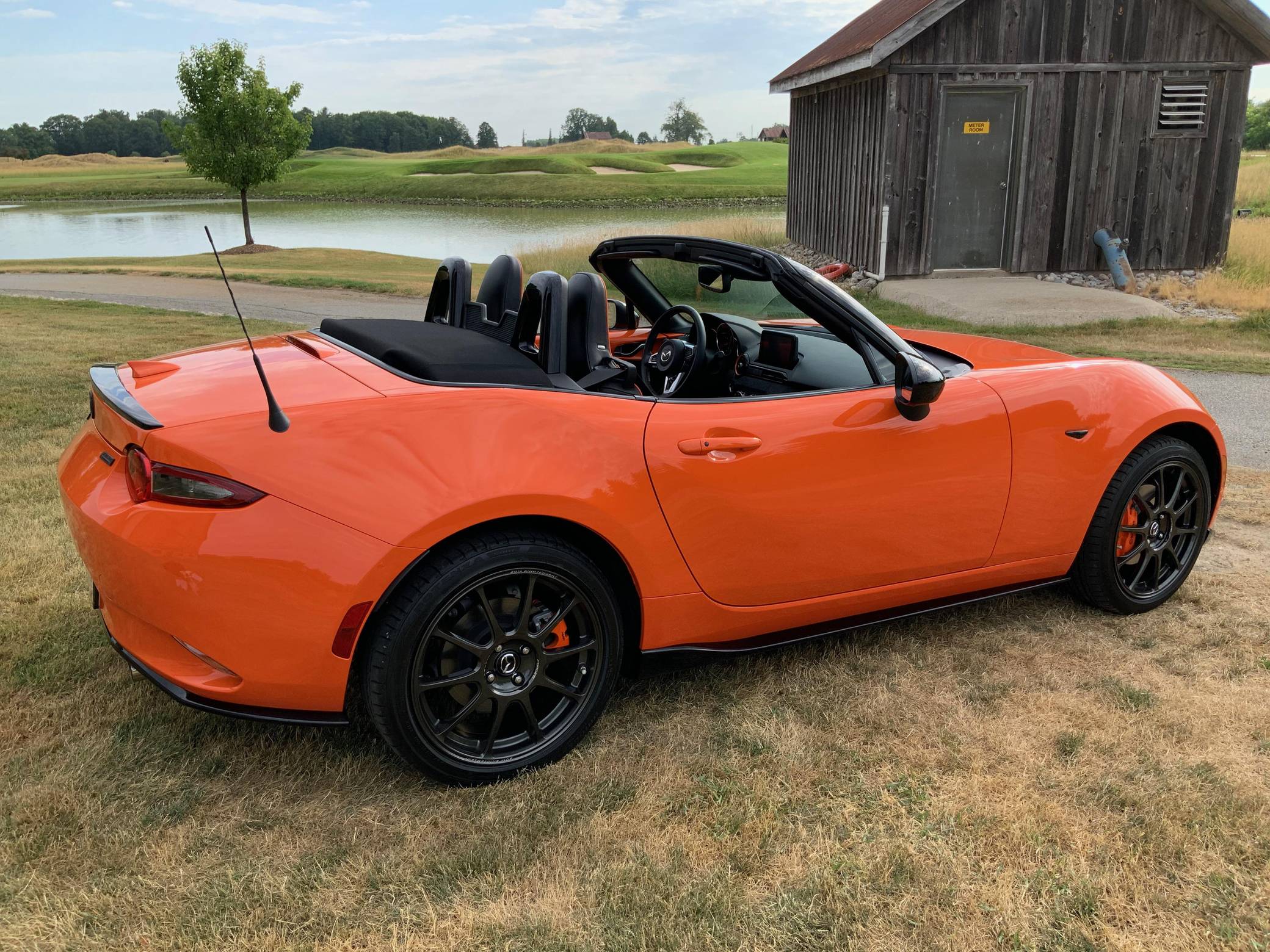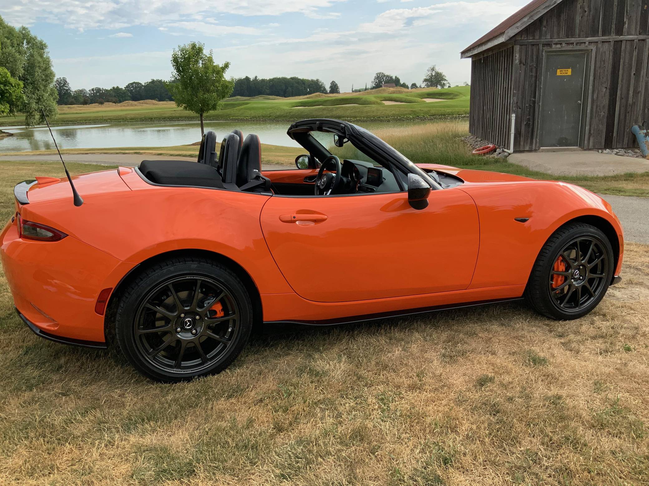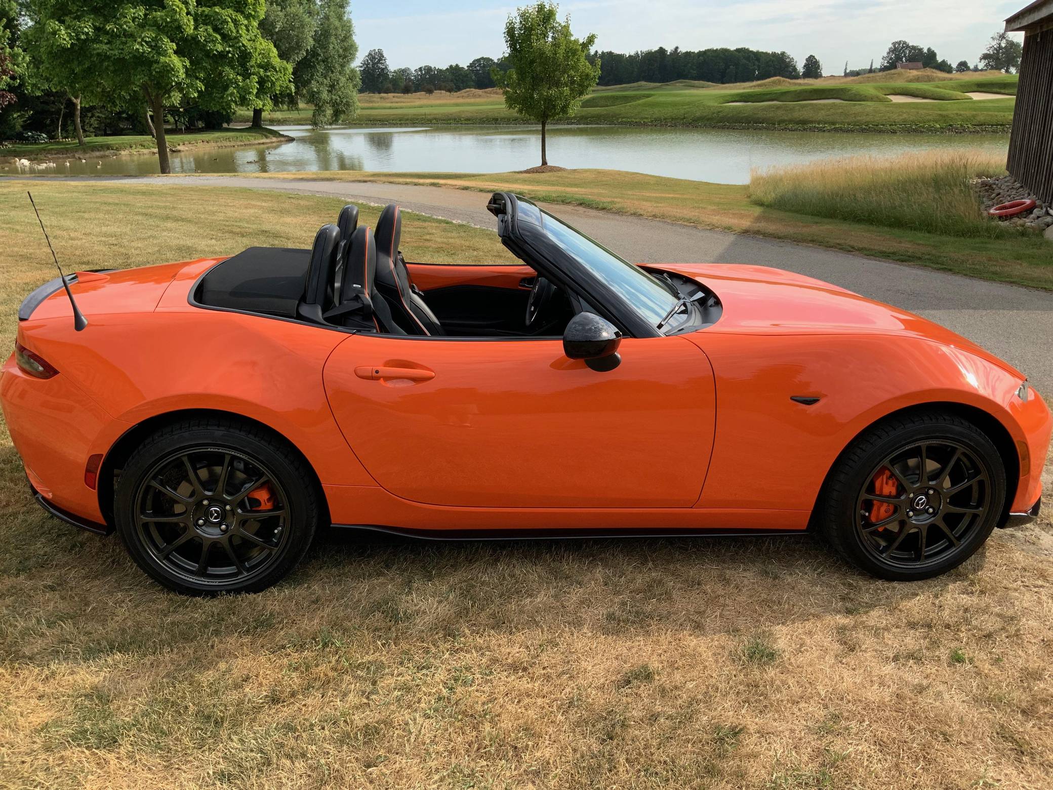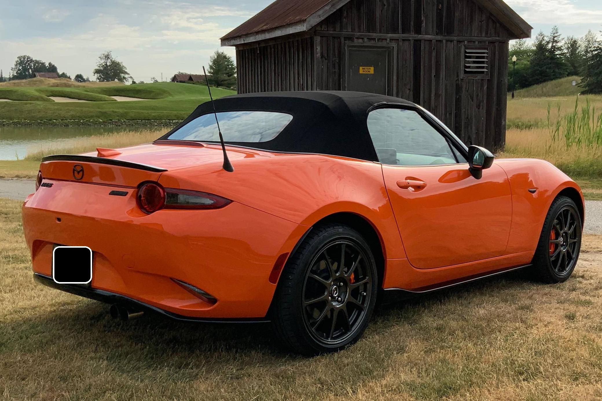 2019 Mazda MX-5 Miata 30th Anniversary Edition, finished in Racing Orange with a black soft top and a black interior. The instrument cluster is in metric units and the odometer currently displays approximately 5,100 kilometers or about 3,200 miles. This MX-5 is equipped with the desirable 6-speed manual transmission. Factory equipment includes 17-inch Rays forged wheels, a dealer-installed aero kit, Bilstein dampers, Brembo front brake calipers, aluminum hood and trunk lid, heated Recaro seats, a 9-speaker Bose sound system, and more detailed below. Modifications reported by the seller include LED tail lights and tinted LED side markers, chrome badges plasti-dipped black, and a corrosion control module. The "ND" Miata made its debut for the 2016 model year, and it strikes a balance as a modern, nicely-appointed roadster that still maintains the intended nature of a Miata as a fun, uncomplicated, and lightweight sports car at an accessible price. The "ND2" model arrived for the 2019 model year with revisions to the engine (including more power and a higher redline), a telescoping steering column, revised seat controls, and a new cupholder, among other improvements. It's still sold new in 2022. The 30th Anniversary Edition differentiates itself from other trim levels with a distinct - Racing Orange paint, Rays forged wheels, orange-painted brake calipers, and orange accents throughout the interior, as well as a few other unique features. 3,000 units were built, and this car is number 1920. Power comes from a 2. 0-liter 4-cylinder engine, rated at 181 horsepower and 151 lb-ft of torque. Output is sent to the rear wheels via a 6-speed manual transmission.